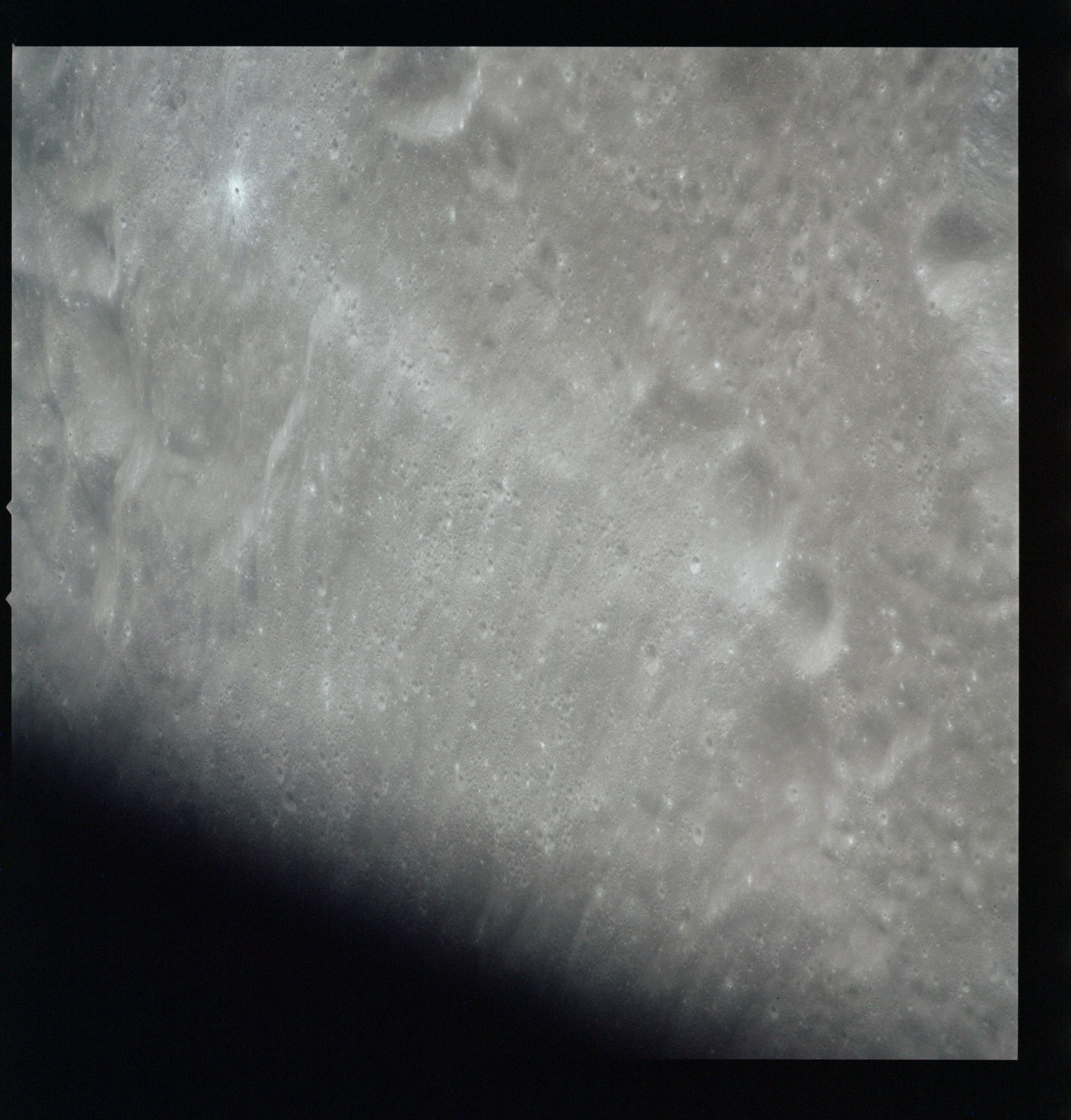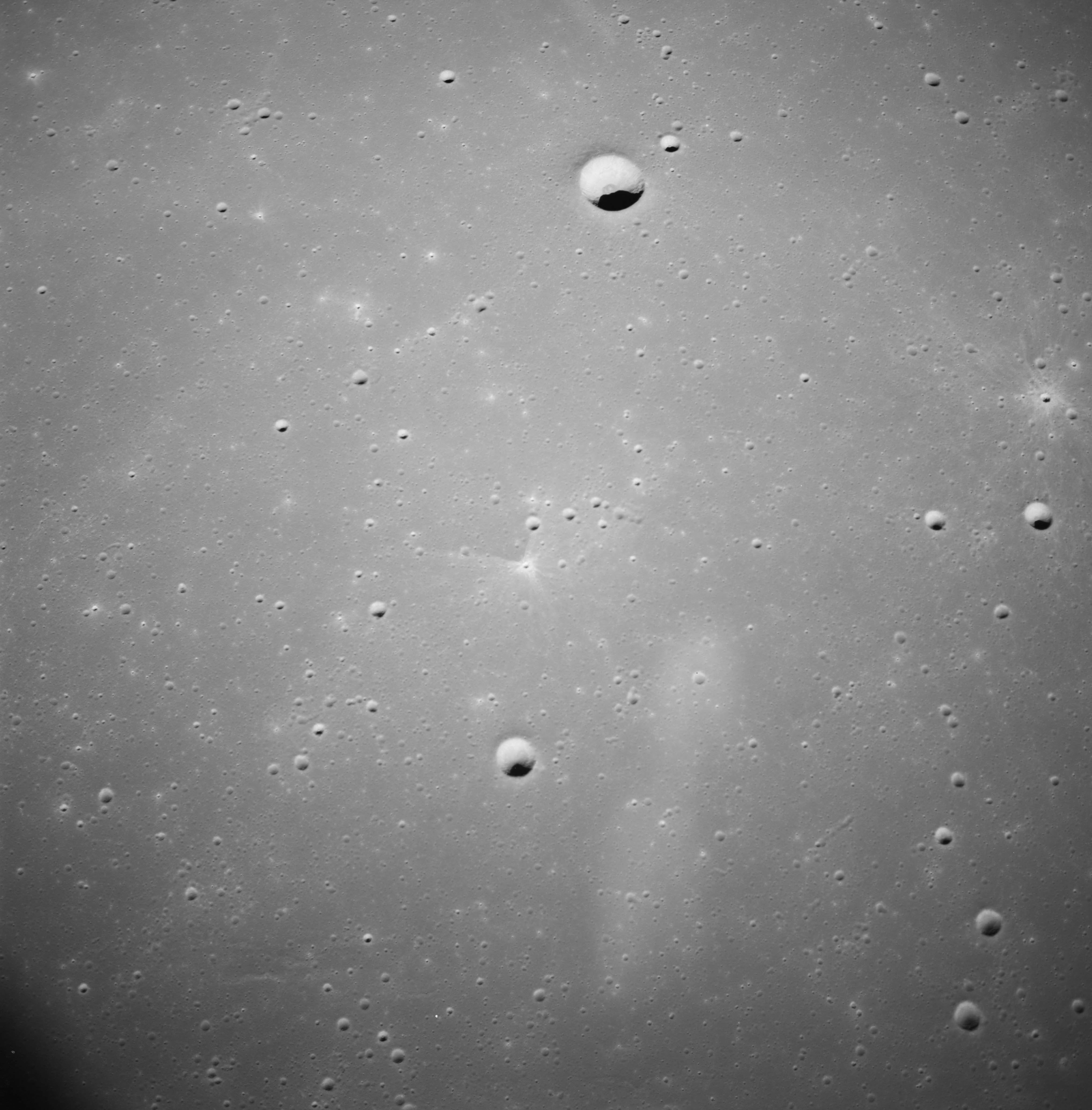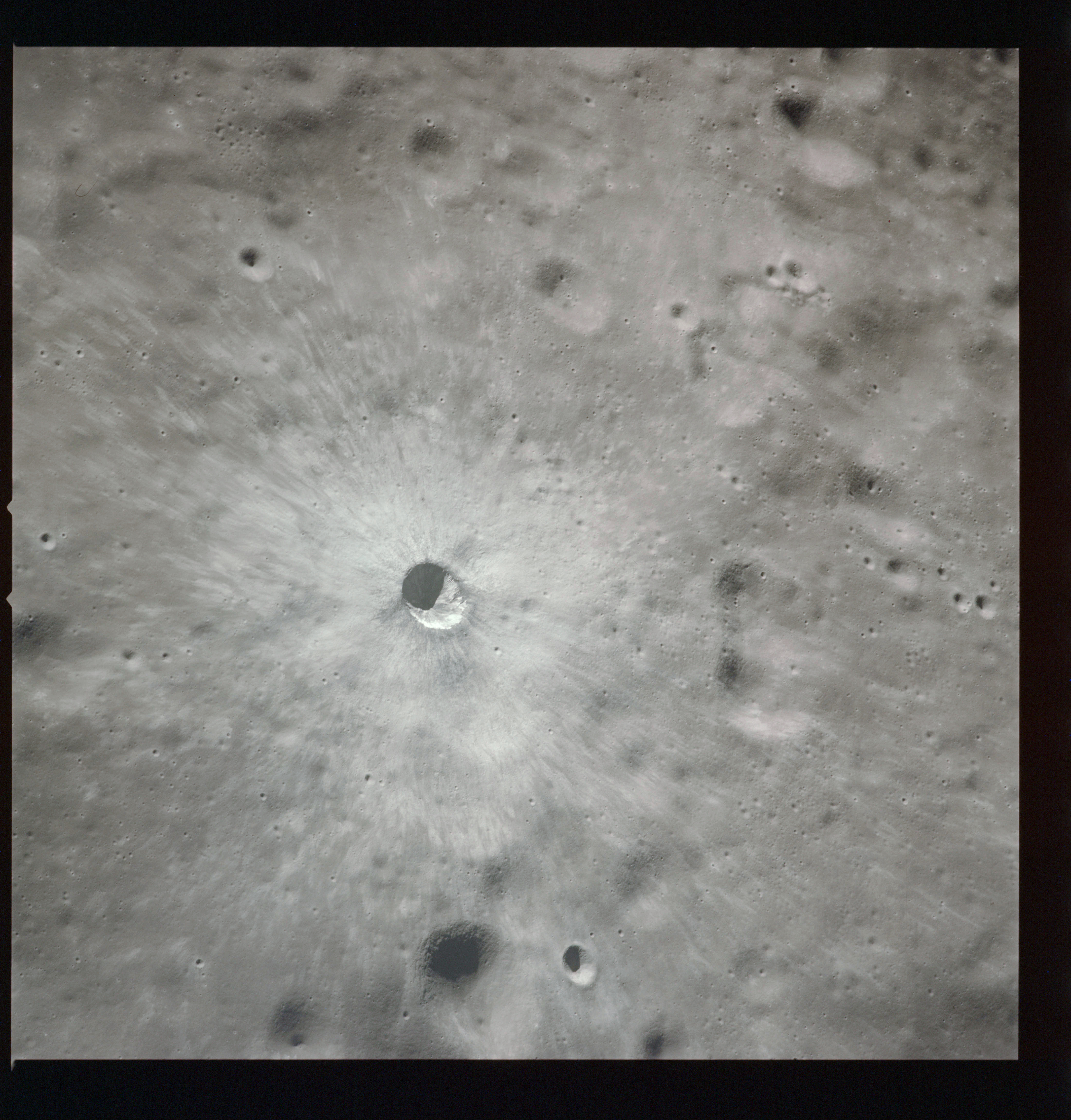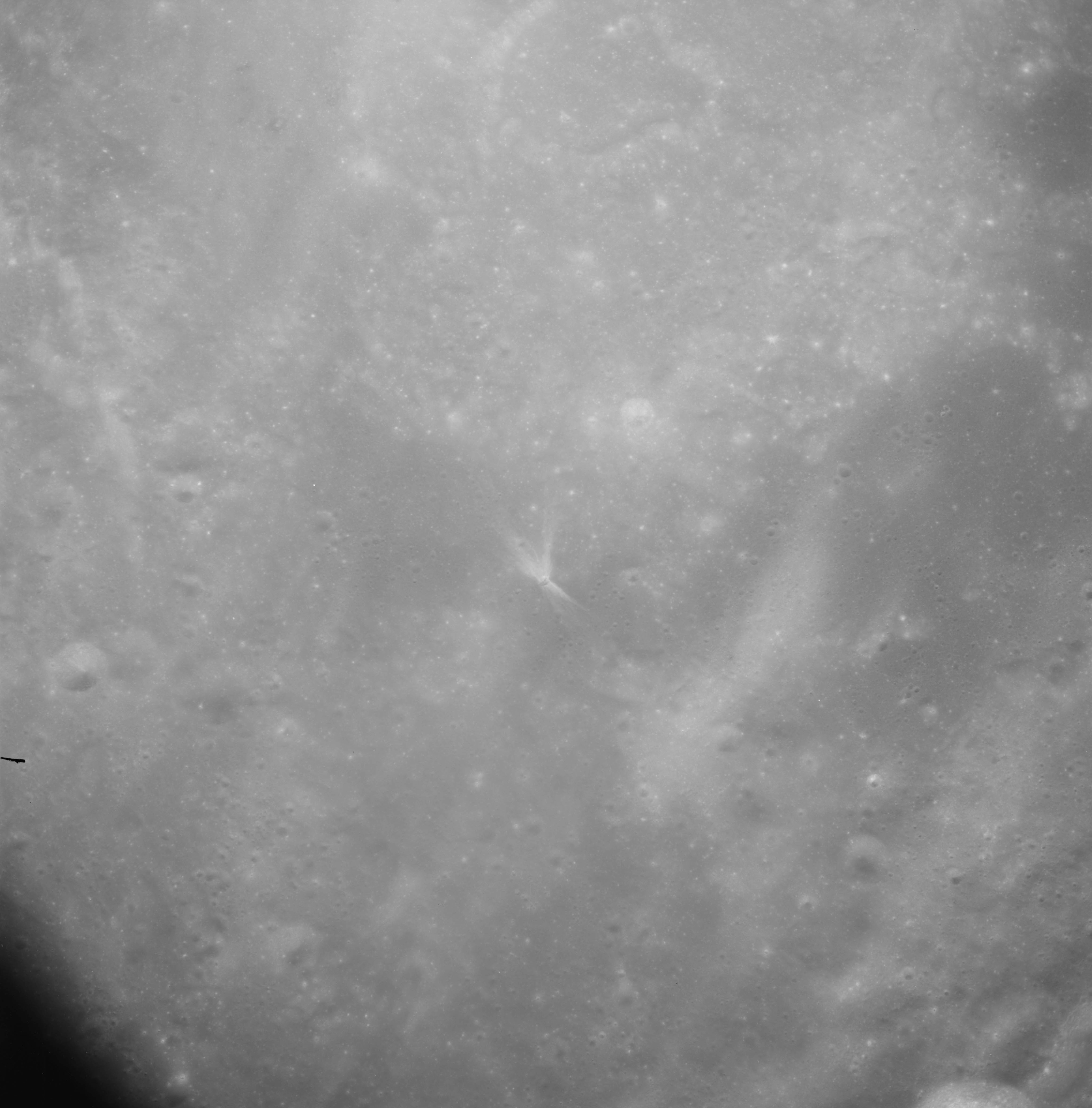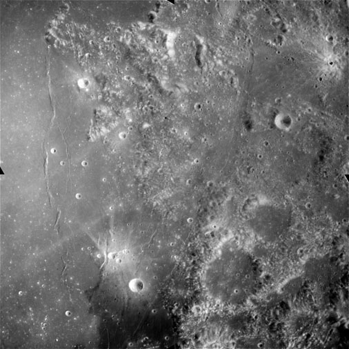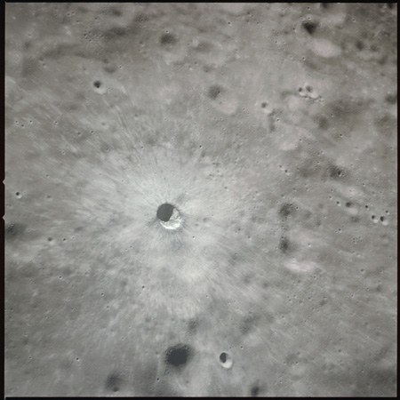 This spectacular photo of a rayed crater manages to display virtually the entire ray system. The result of a relatively recent impact, this feature illustrates the transition from the continuous to the discontinuous ejecta blanket. This transition is roughly two crater diameters out but is irregular and lobate in shape. The light colour of the ray material is due to the highly shocked and fractured nature of the ejected rock. Time, and the irradiated environment of the Moon will eventually darken this material to match its surroundings. Consider that every other crater in this photograph, from the truly ancient and barely visible depressions to the more recent, neat bowls peppering the landscape, once was graced with a similar stunning ray system.