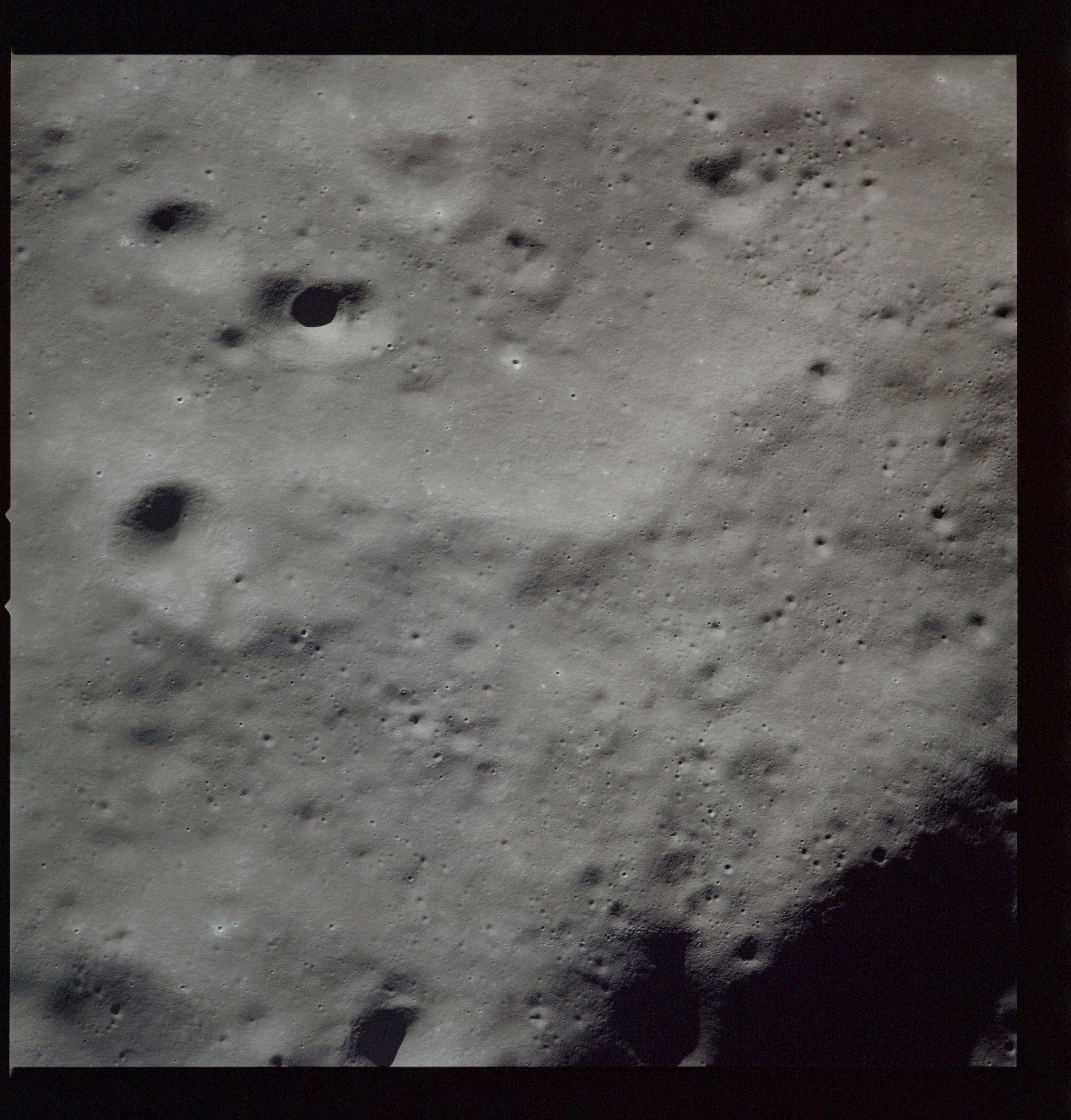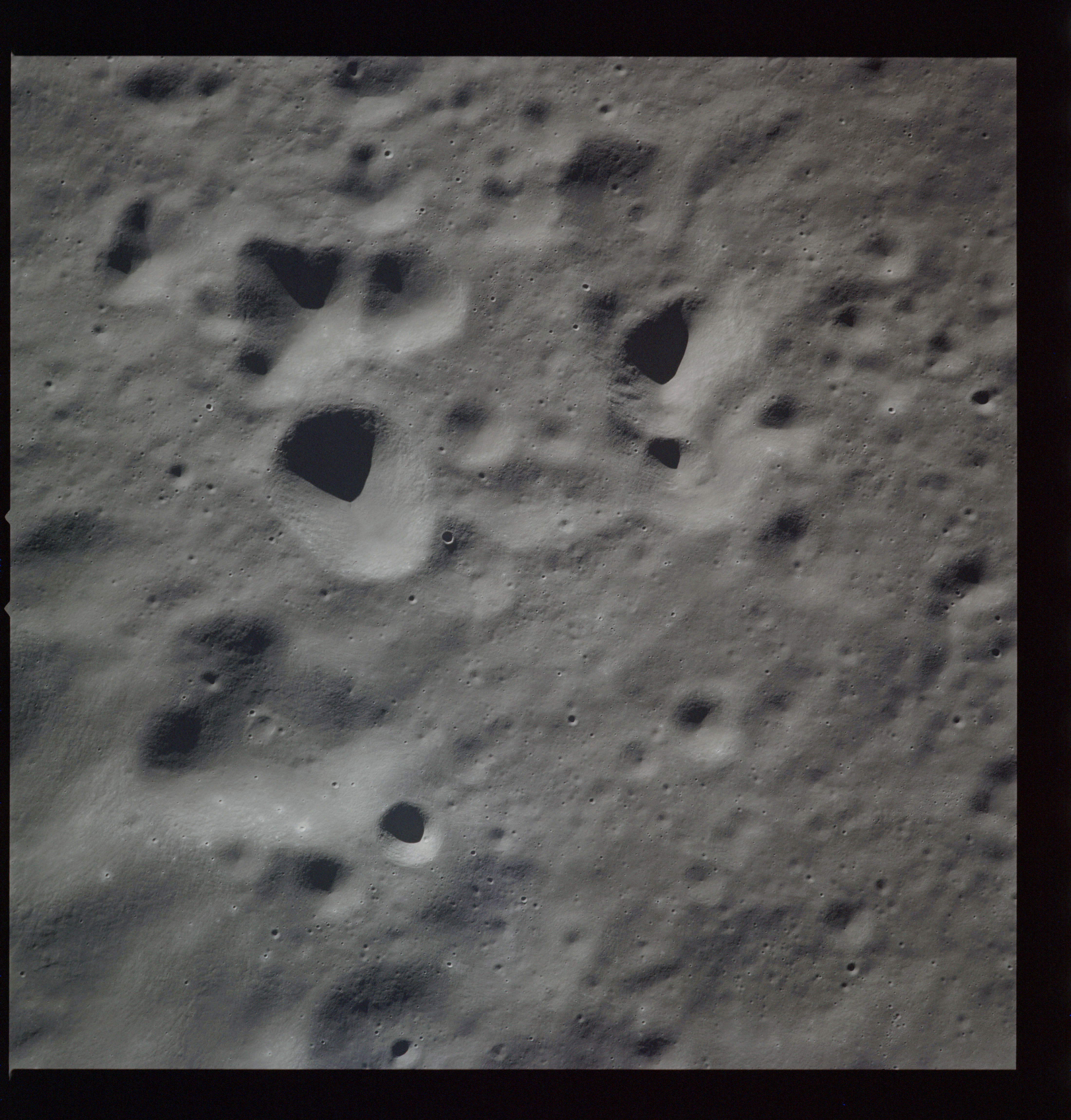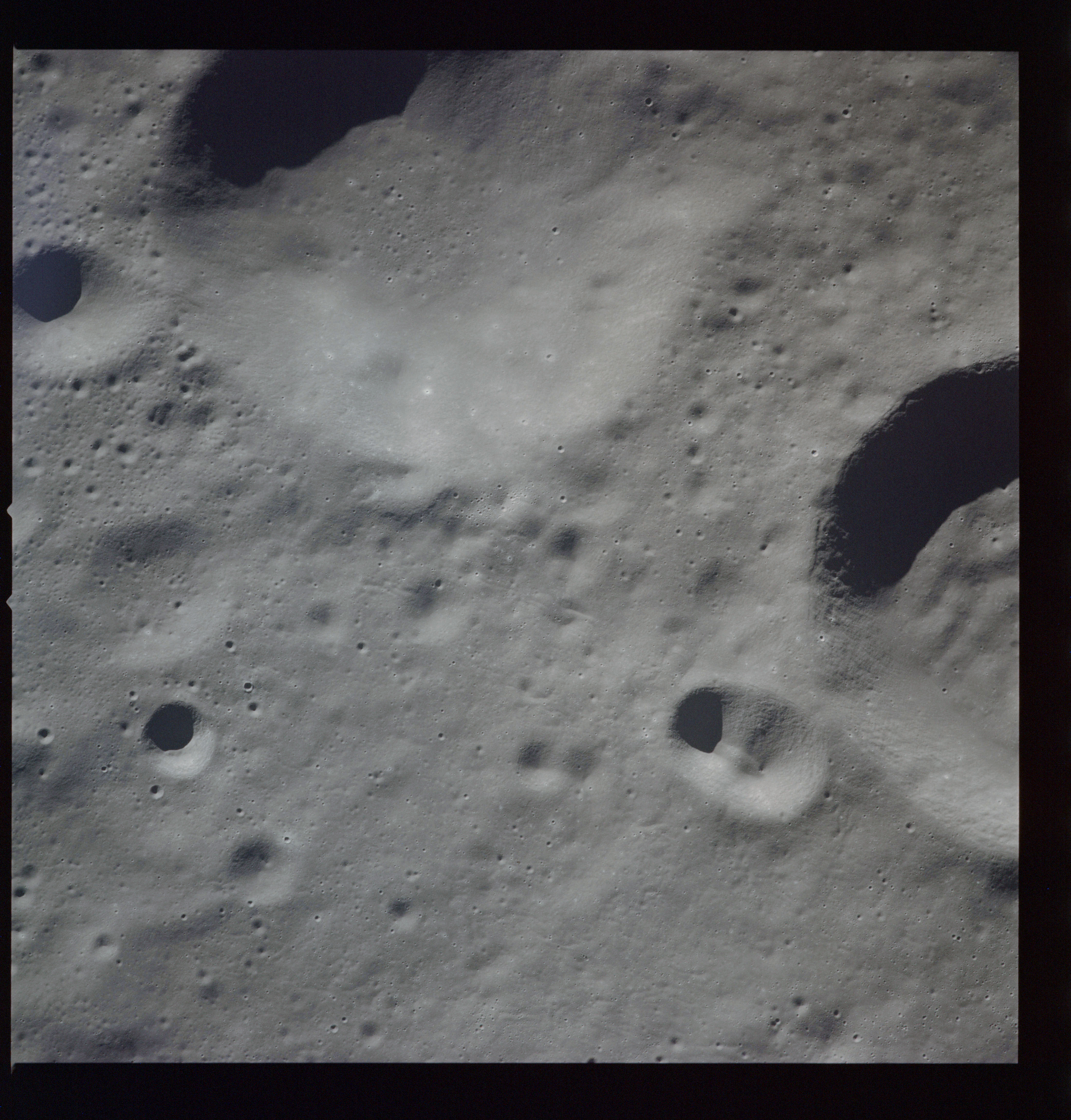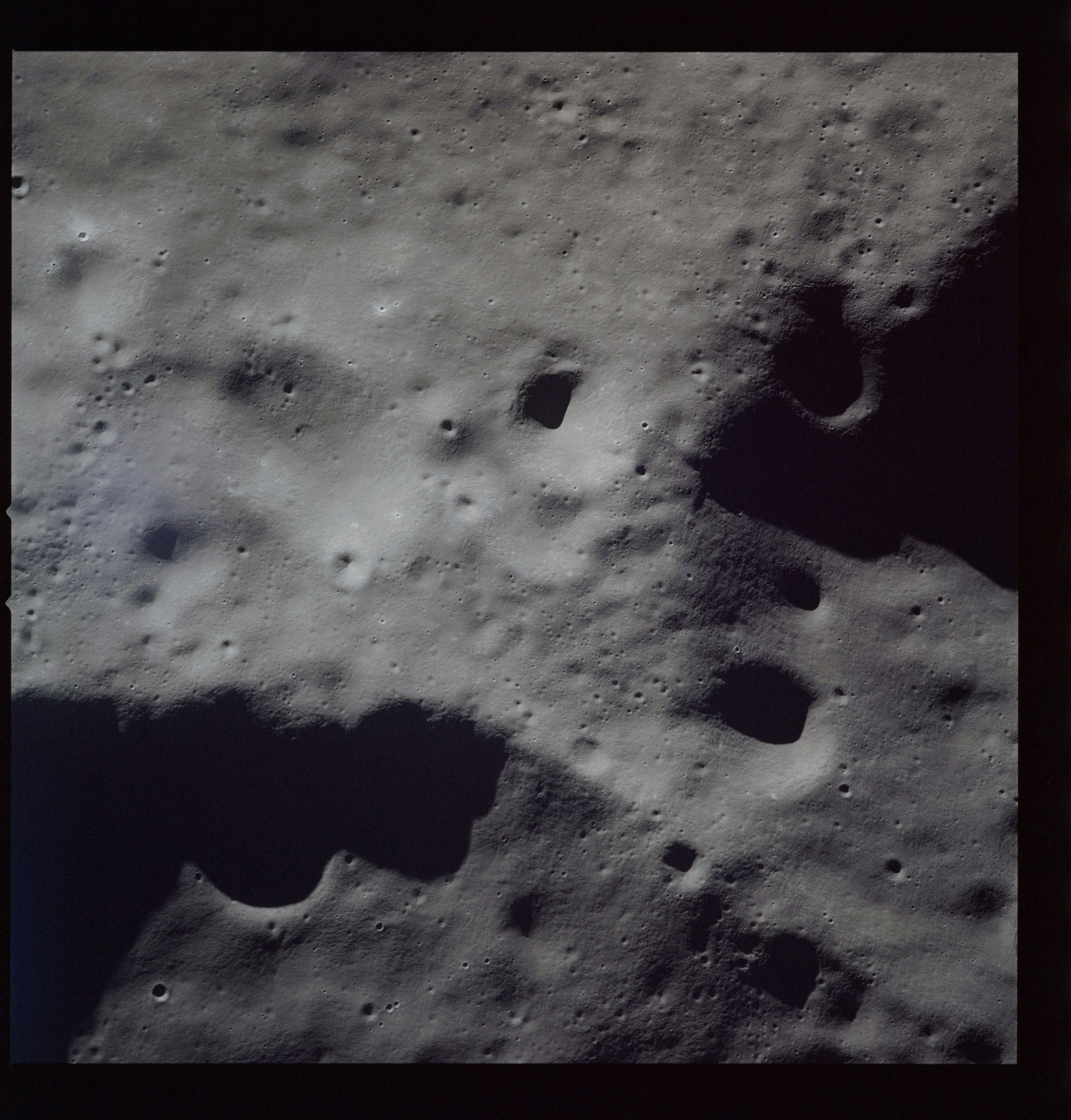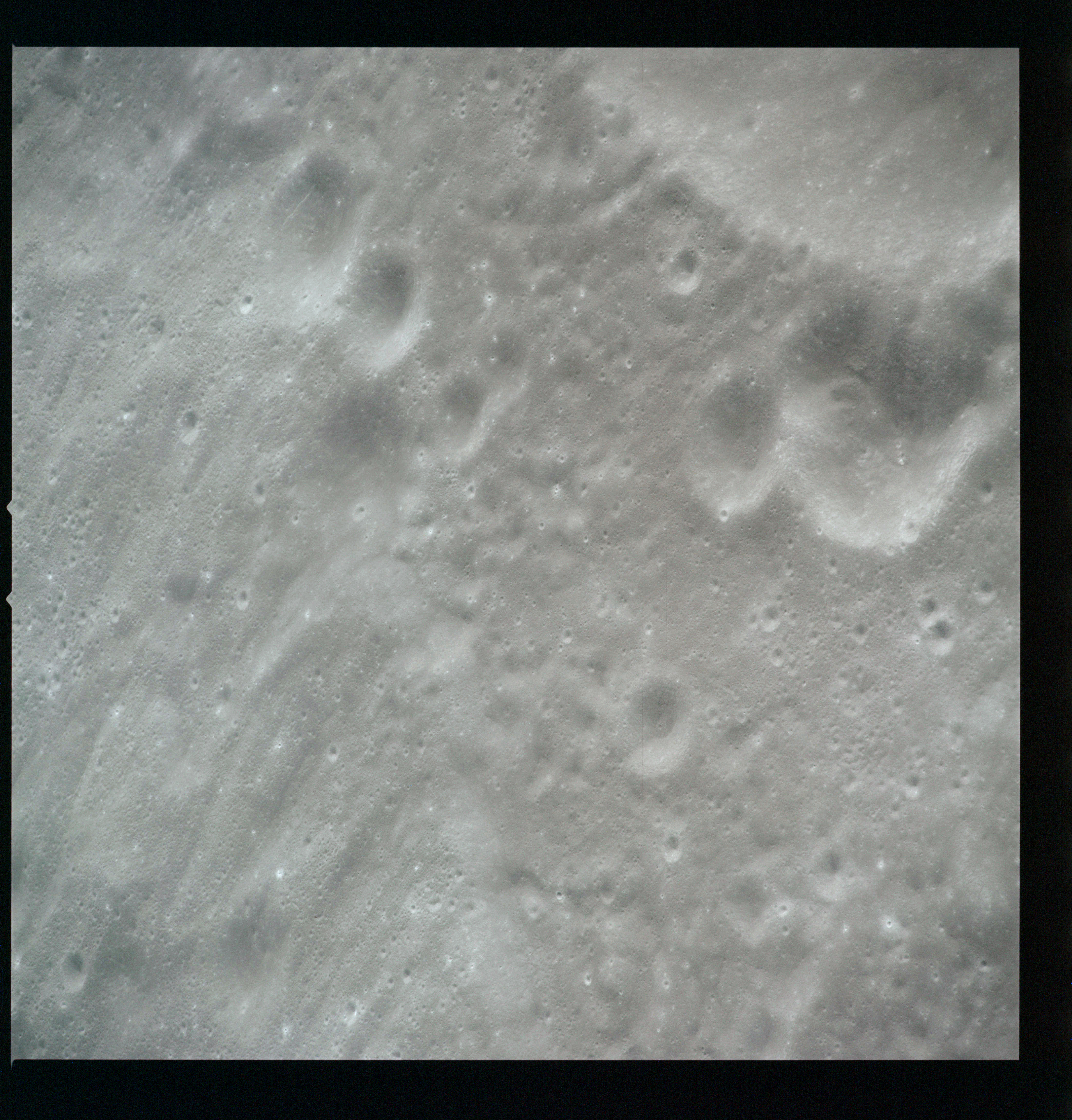 Al's next target for the Hasselblad is Tsiolkovsky; first pointed out by the crew soon after they settled into lunar orbit at 083:16:41 GET. First, he gets the Mapping and Panoramic Cameras going, then takes AS15-97-13157 to 13168, 12 frames taken, out of the planned 28, showing the crater and its northwest hinterland. The first three in this series AS15-97-13157 to 13159, combined here into a composite image, show the steep slopes of the crater's eastern rim with the slumped terrain below.