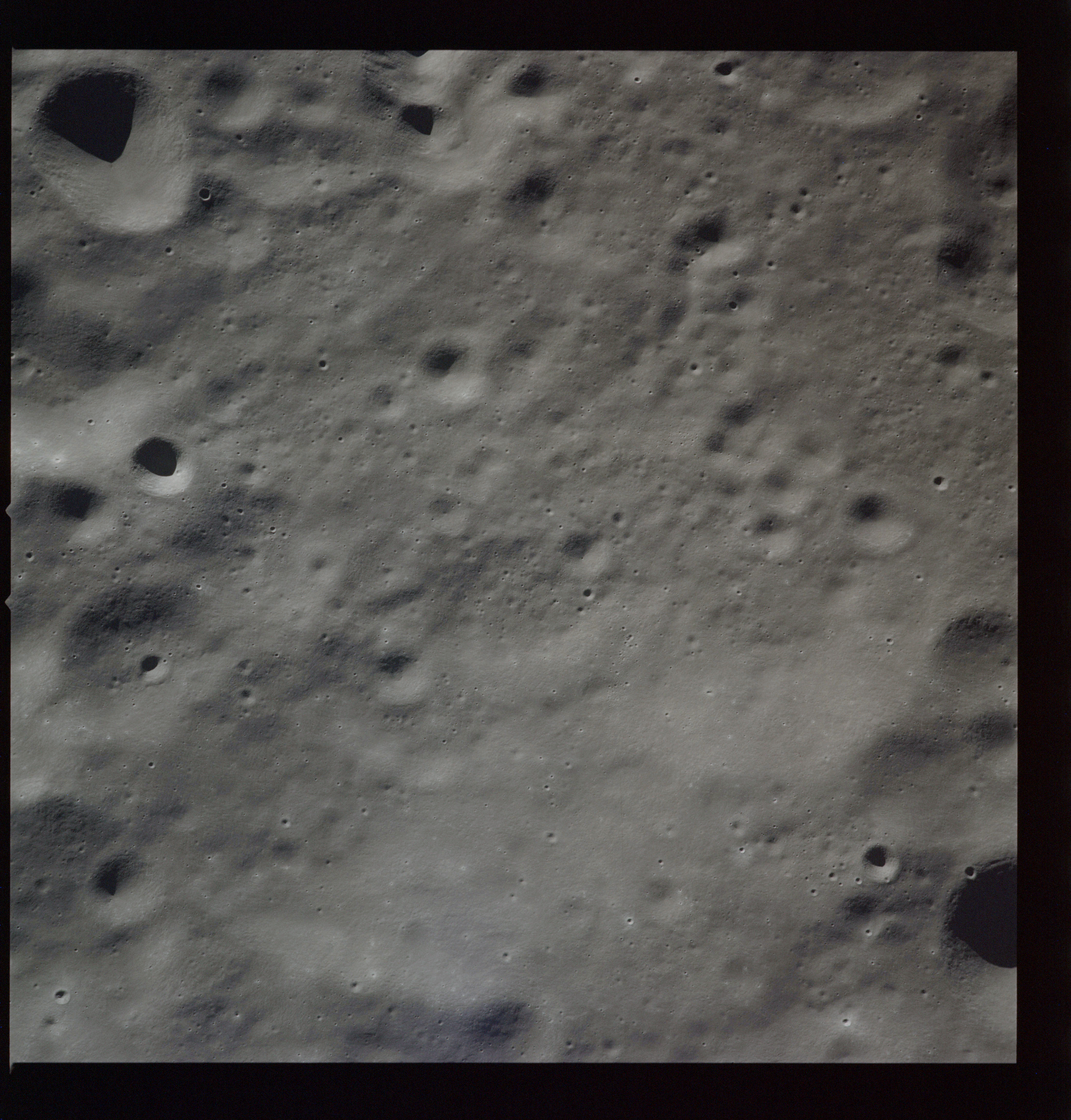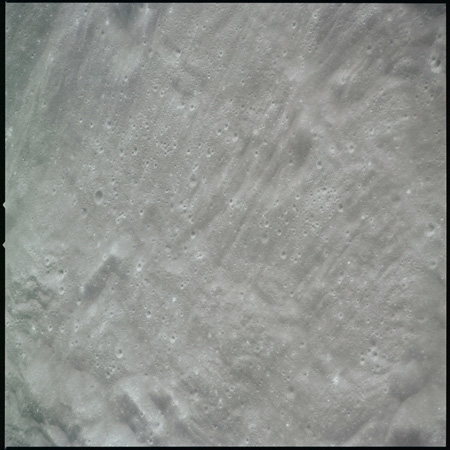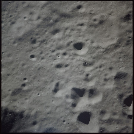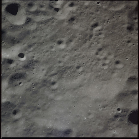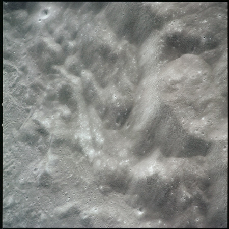 Al continues his photography as Endeavour crosses the floor of Gagarin. This composite of AS15-97-13140 to 13152 shows the rough floor of Gagarin where the debris blankets flung in from distant craters are pockmarked by smaller craters, old and new.