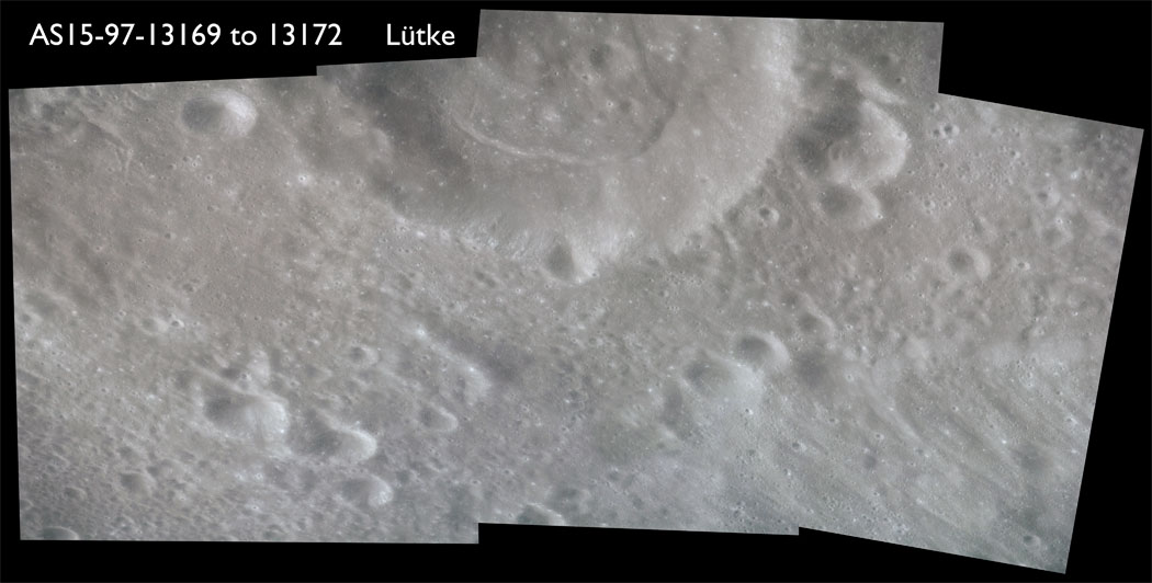 AS15-97-13169 to 13172 - A composite of four images showing the southern half of Crater Lütke - Source images by NASA/Johnson Space Center.