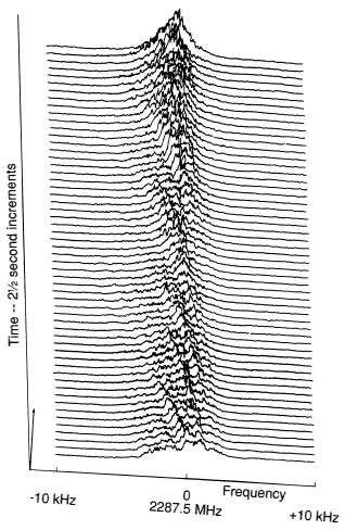 The Apollo 15 Preliminary Science Report includes the above diagram showing some of the preliminary results from the Bistatic Radar Experiment. Each line across the graph represents the spectrum of the reflected signal, as received on Earth, at 2½ second intervals. The features on the surface which tend to reflect the spacecraft's radio wave also modify its frequency due to their motion relative to the spacecraft. This is the Doppler effect and it varies between objects as they approach then pass beneath Endeavour. From one time-slice to the next, you can see the shifting frequency of each dominant reflection moving as the spacecraft moves.