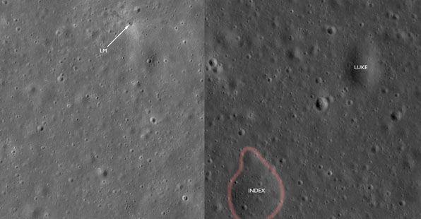The first two images, AS15-97-13137 and 13138, composited here, along with 13139, show a small region of the crater's eastern rim.