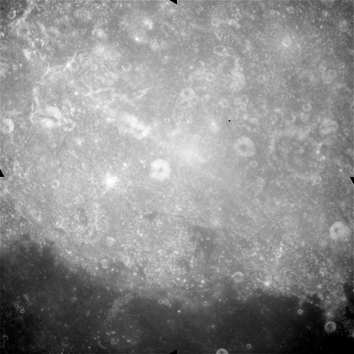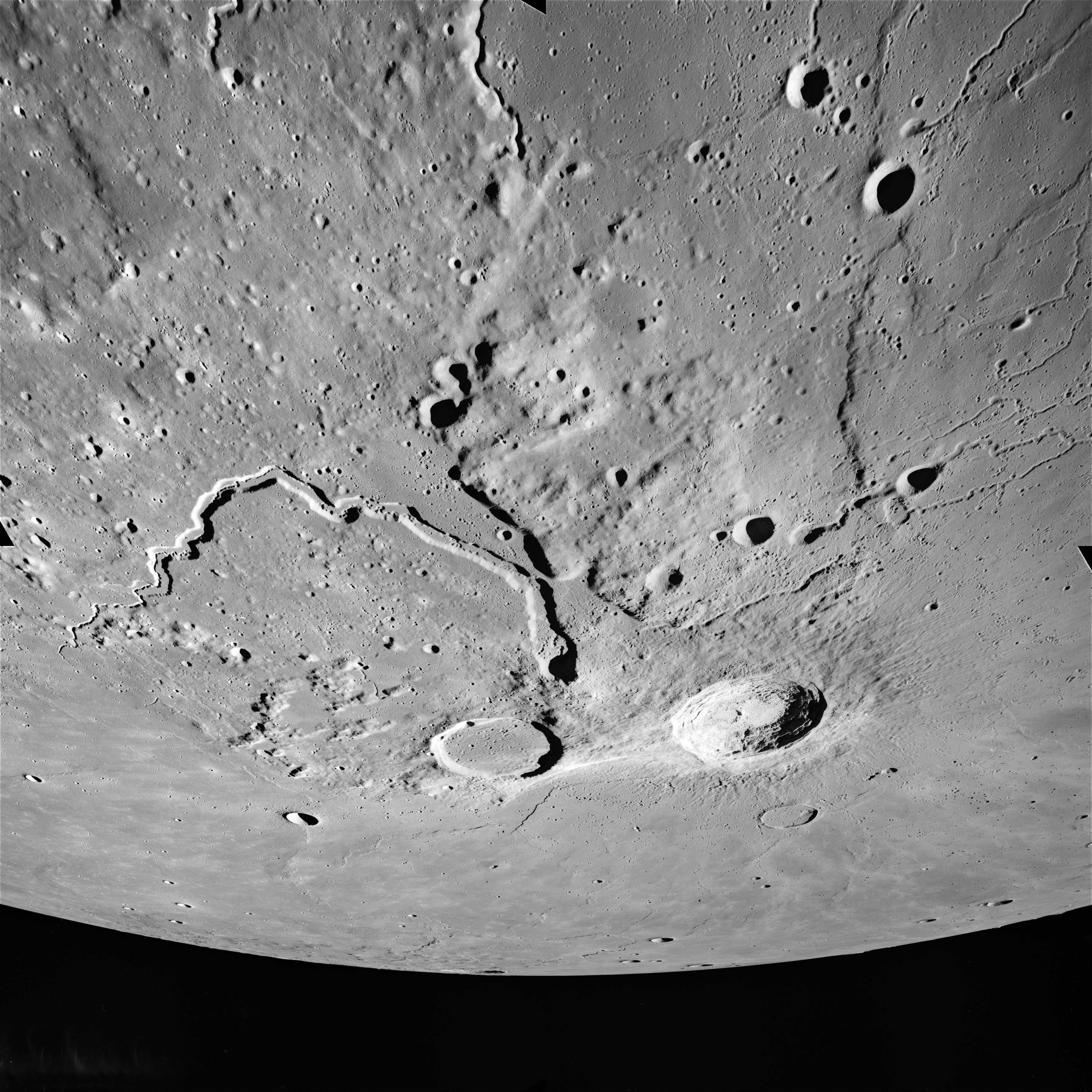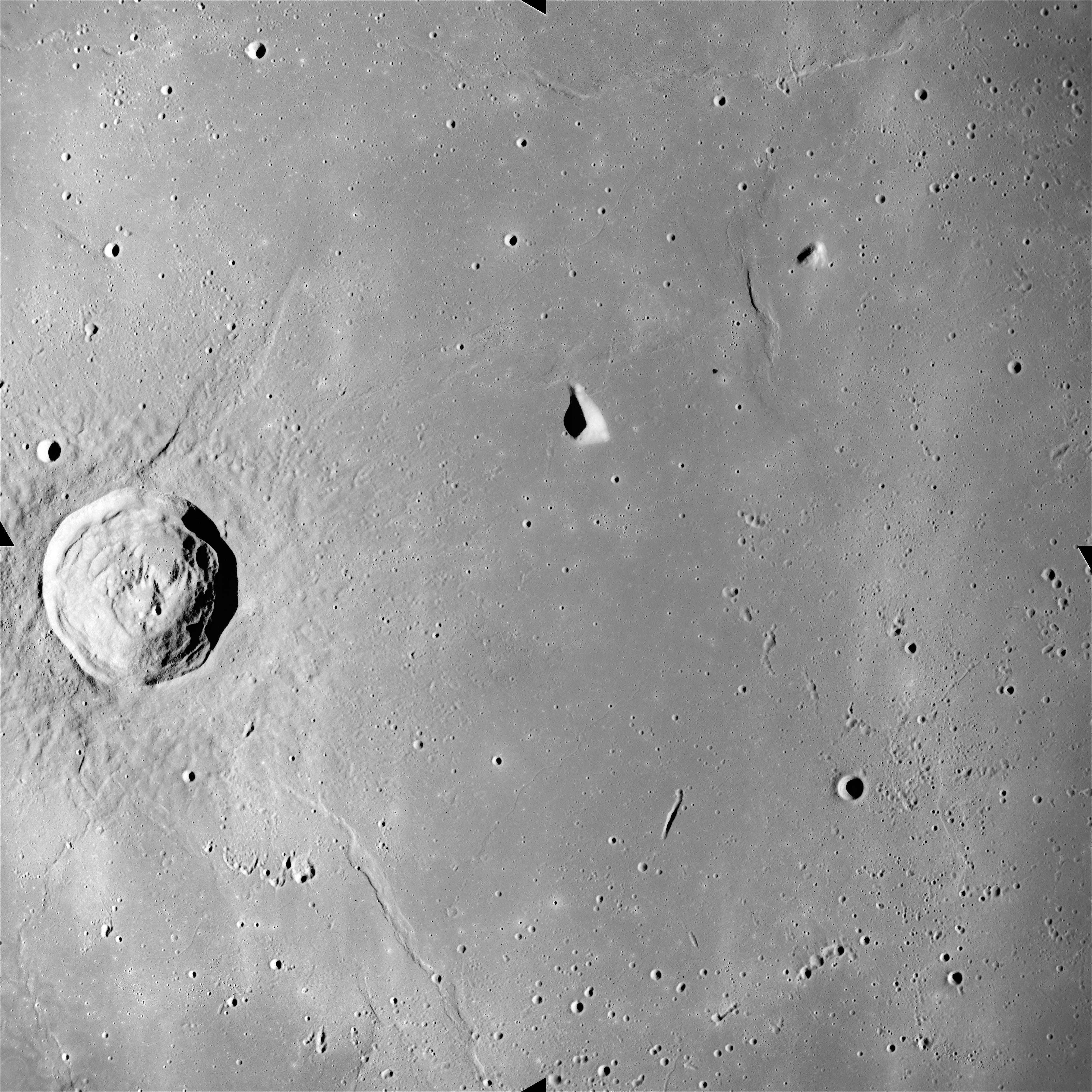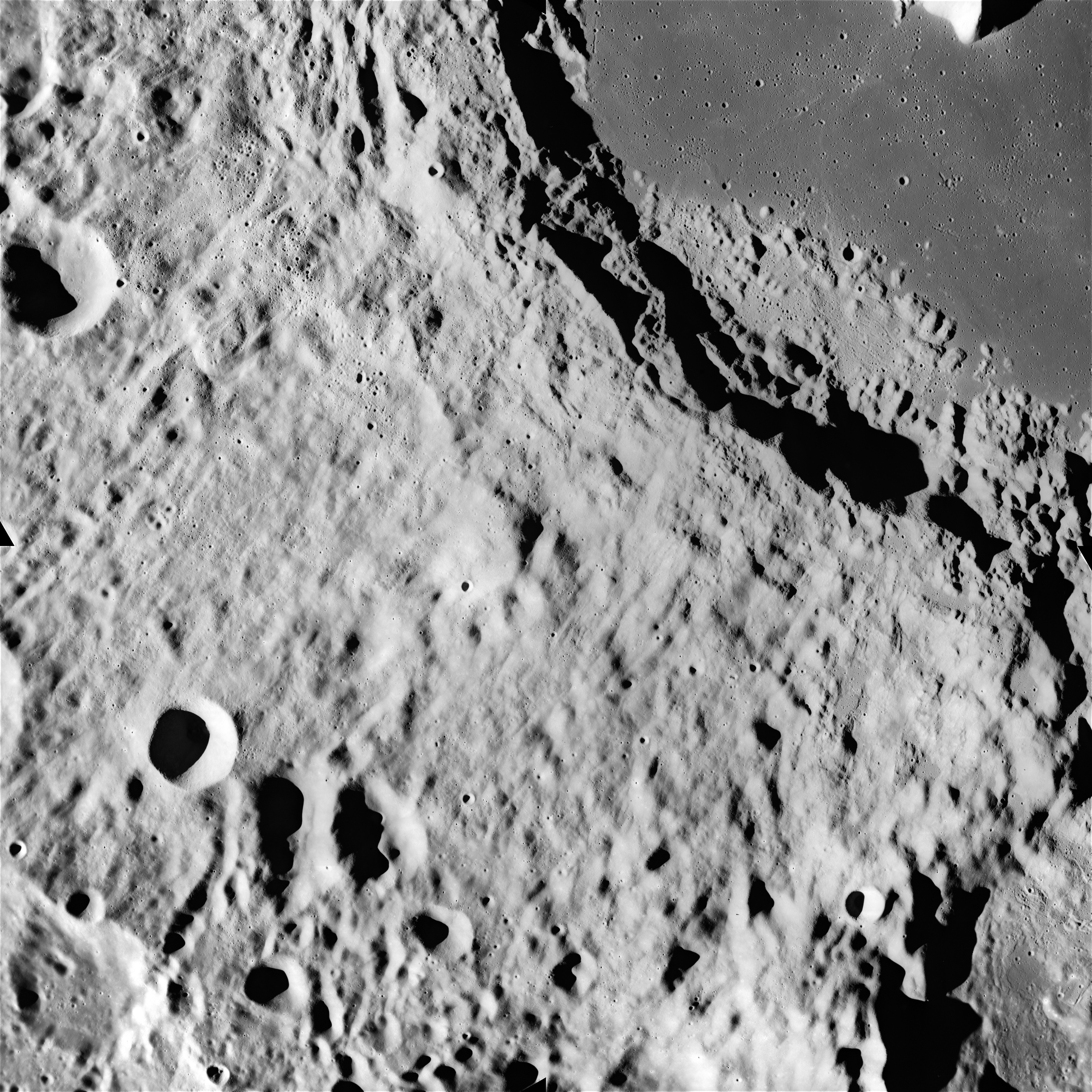Al's first task is to flip the CSM around from flying with the SPS engine facing forward, to flying with the apex of the Command Module facing forward. As always with these turnaround maneuvers in lunar orbit, he has to roll the CSM clockwise by 40° first. This avoids the computer taking the spacecraft's attitude through one which would cause gimbal lock. With the SIM bay restored to looking down, he can begin his breakfast. Then, as Endeavour approaches the sunset terminator, an hour-long period of photography by the Mapping Camera begins, which will last until it reaches the sunrise terminator over the western side of Mare Imbrium. During that pass, the Metric section of the camera will take 148 images, AS15-M-1704 to 1851. The start time of the photography was read up at 162:04:41 as being 162:59:30.