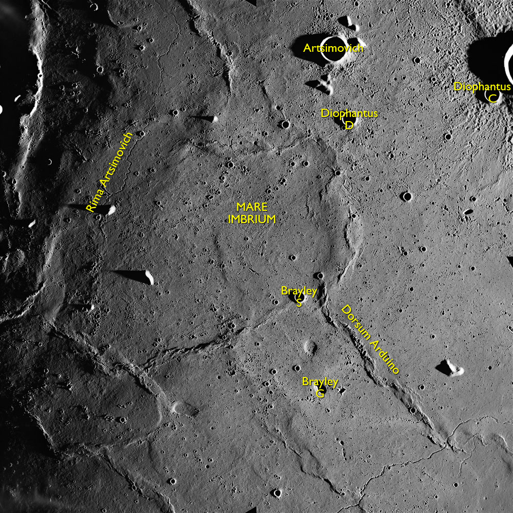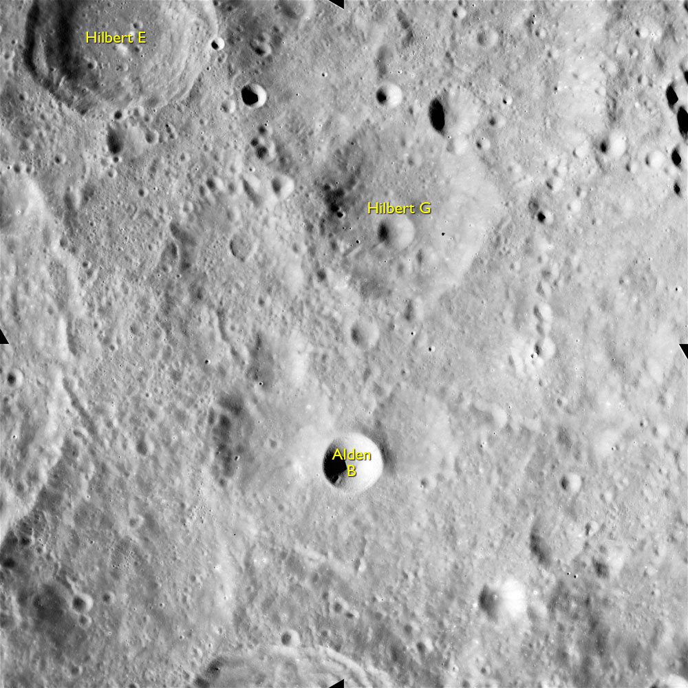 Alden is about 600 km west of Tsiolkovsky and just beyond the Moon's limb.
