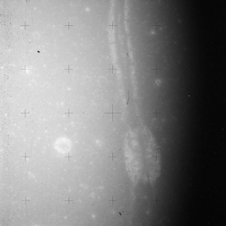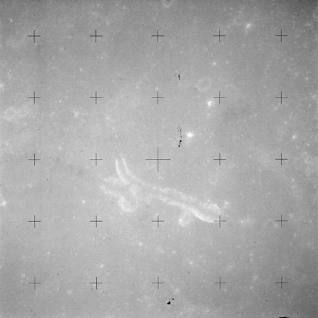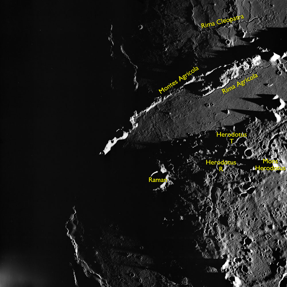 Northwest of Aristarchus, the mighty Vallis Schröteri meanders towards Oceanus Procellarum. The lighting is still too oblique to show much detail although its entire length is photographed in AS15-96-13051 to 13062. The first of this sequence, 13051, shows the source of the rille, the "Cobra's Head".