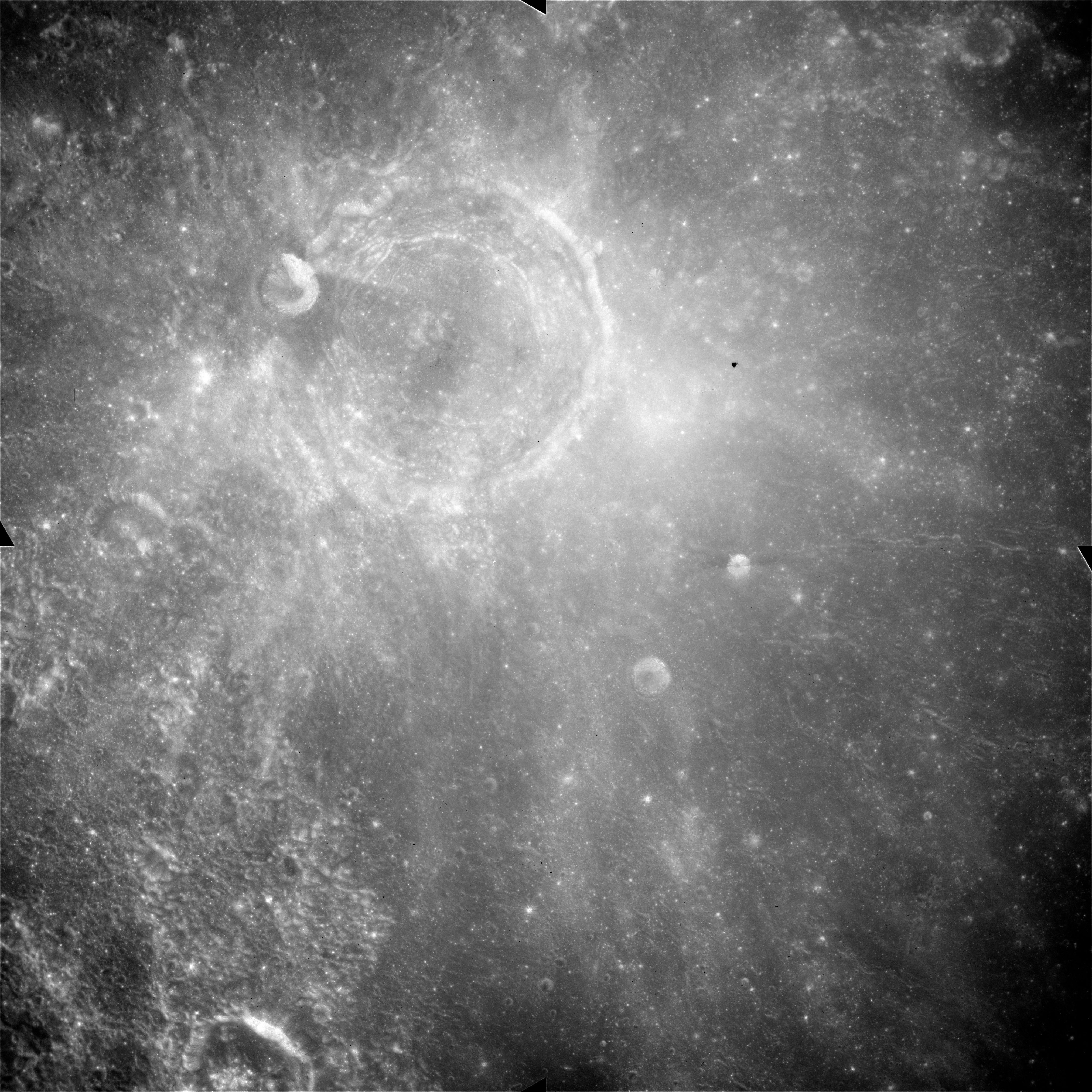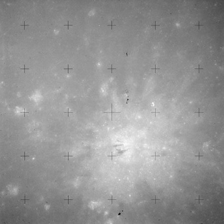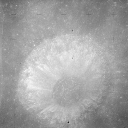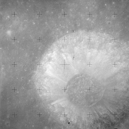 AS15-96-13050 is an oblique image of Aristarchus looking roughly north. Note the texture of the surrounding ejecta blanket and how it covers the southern basalt plain in the foreground indicating that the crater is younger than the mare. The terracing or slumping of the wall of this spectacular 40-km diameter, 3-km-deep feature is also well shown. The crater's name comes from the Greek astronomer, Aristarchus of Samos, c. 310-230 B.C.E., who is notable for professing that Earth rotates on its axis and that it revolves around the Sun.