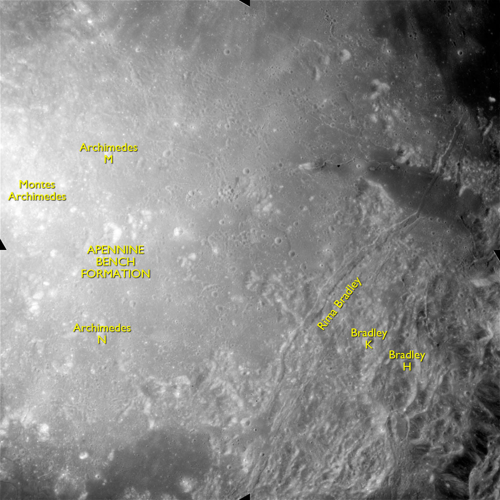 AS15-P-9933 - Panoramic Camera image of the Apennine Bench Formation. Crater Archimedes L is in the centre. A 385 megapixel PNG format version can be had from the ASU Apollo Image Archive - Image by NASA/ASU.