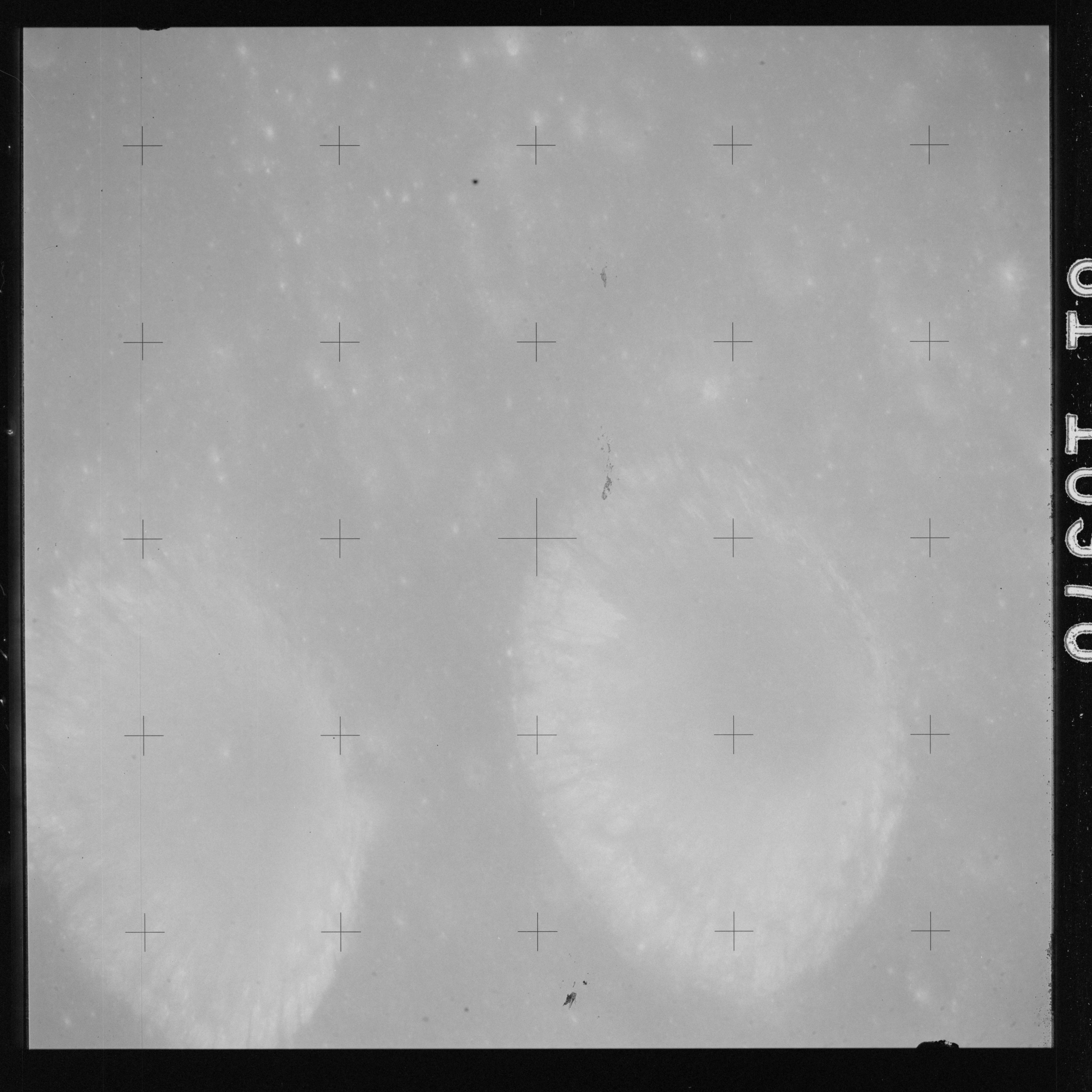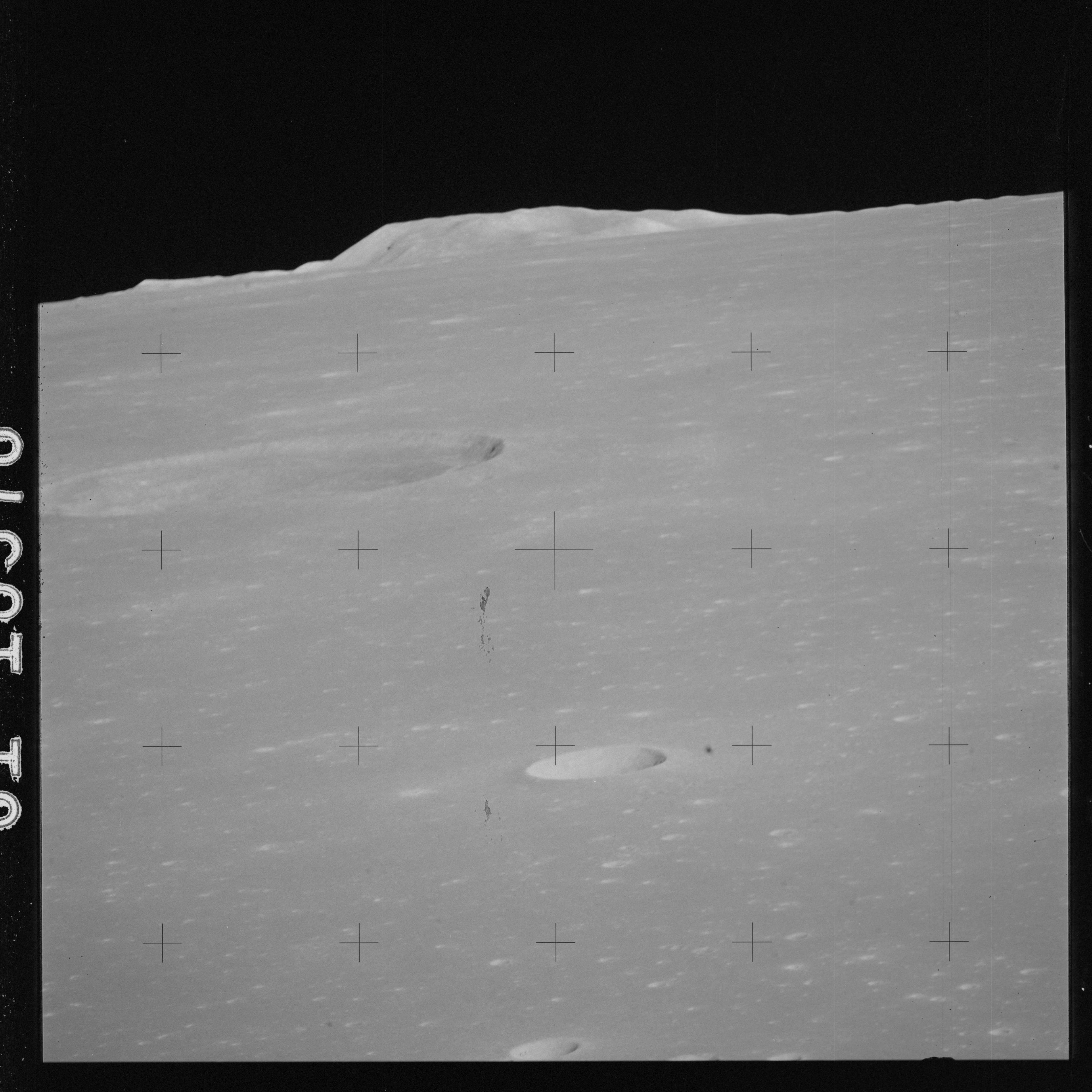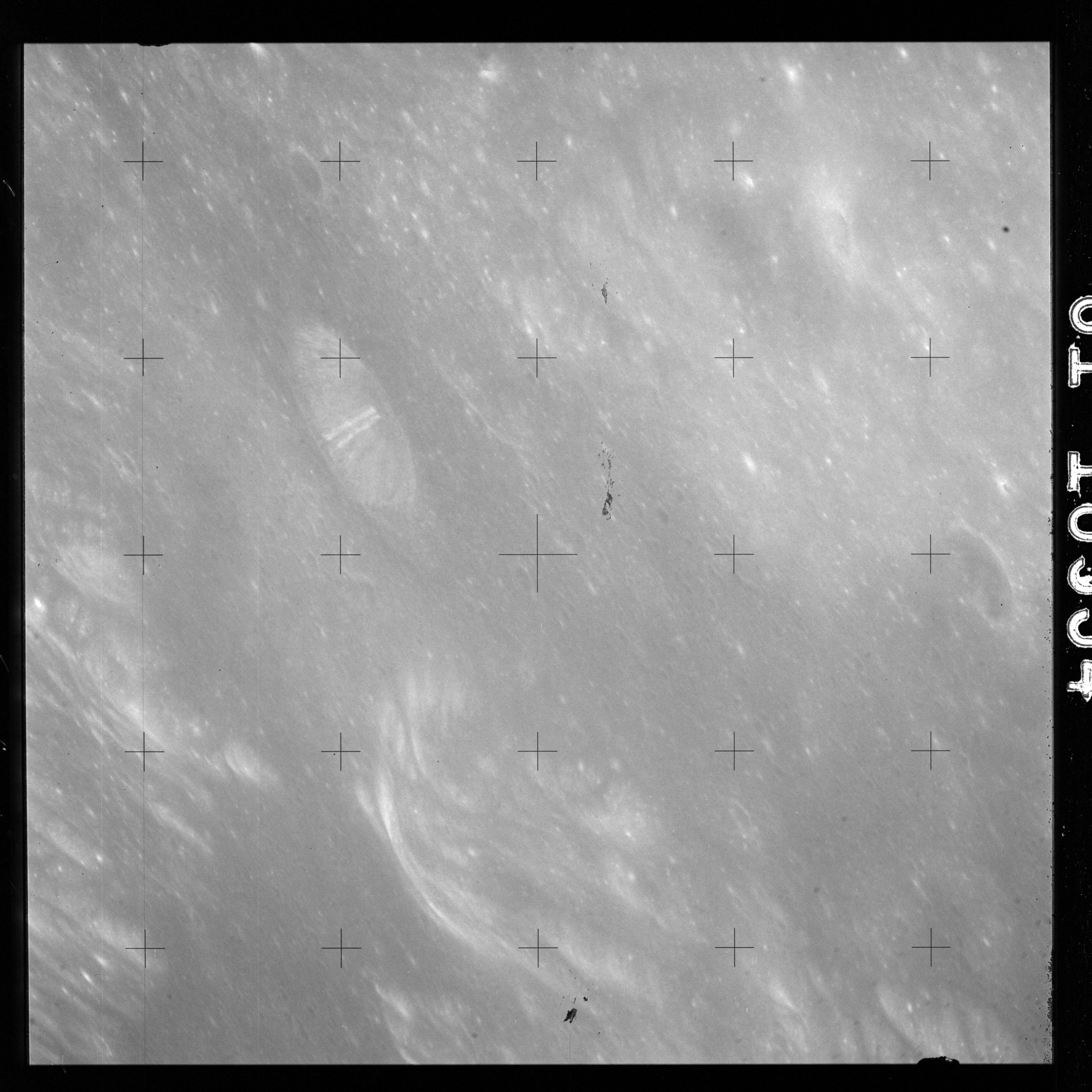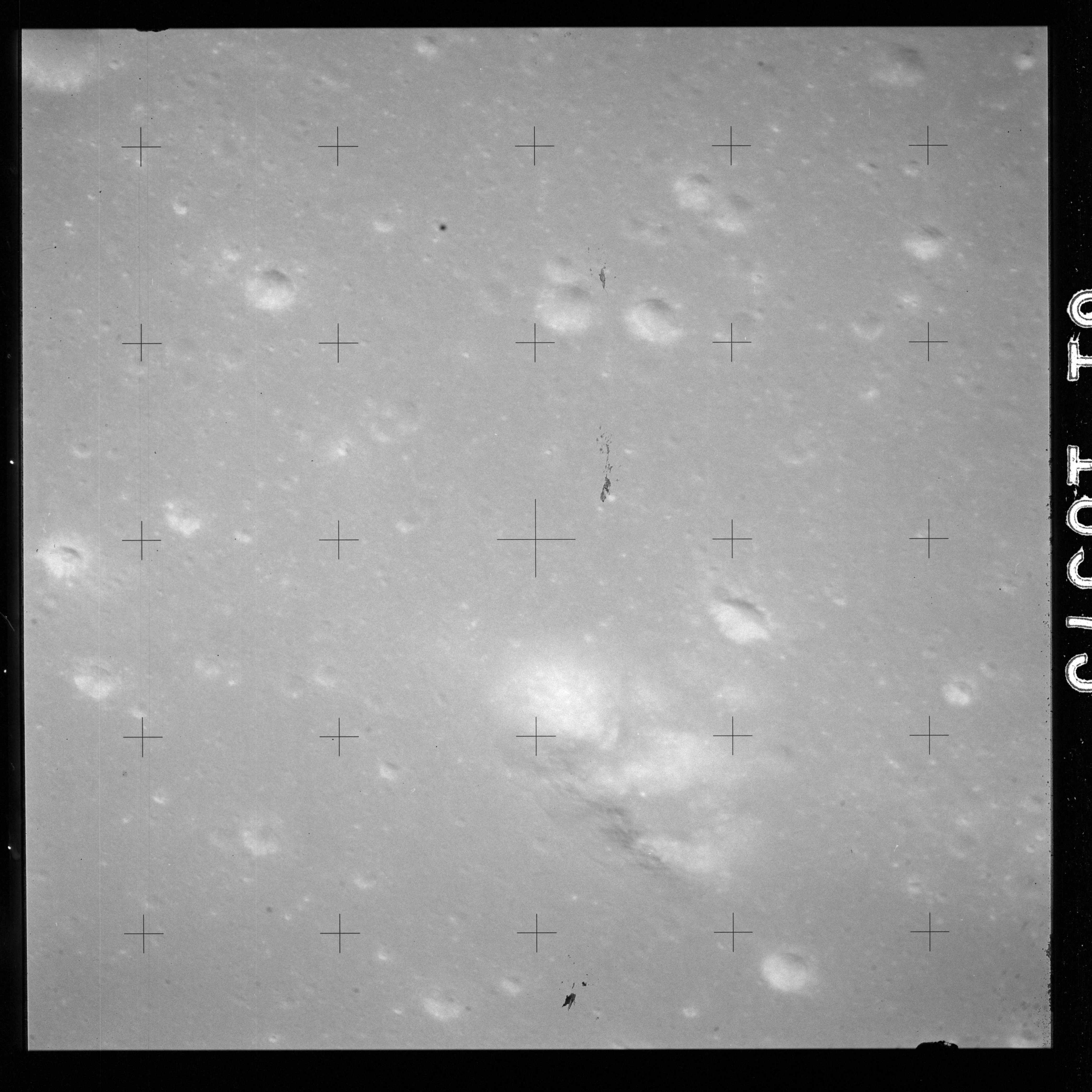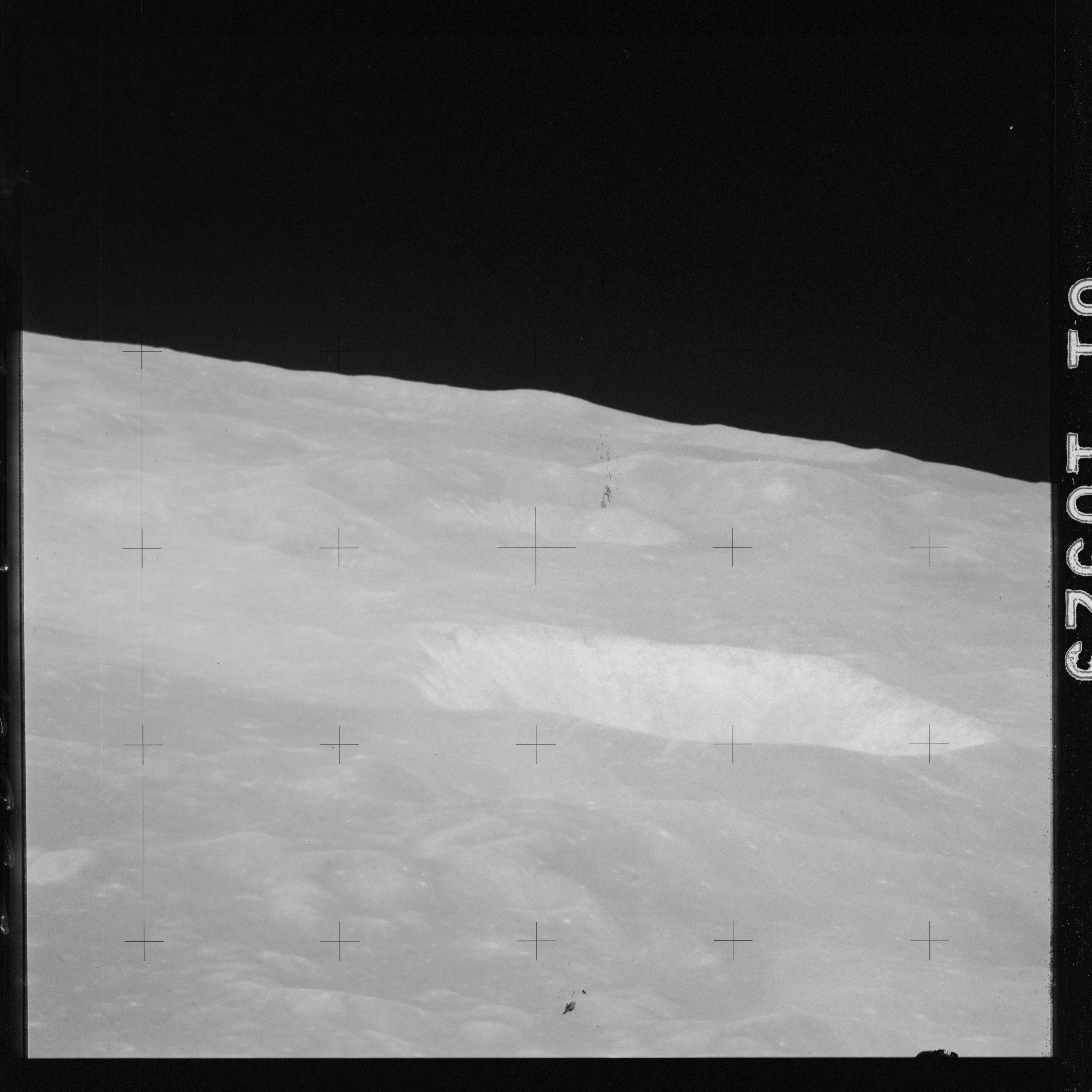 They have two Hasselblad cameras in use. One has a Réseau glass plate fitted which imprints crosses on the photographs for photogrammetry purposes. It has magazine QQ attached loaded with black and white film adn its current lens is a 500-mm telephoto. The other camera has magazine O with colour film (Ektachrome) and a 250-mm medium telephoto lens. It has no Réseau plate fitted. During a sequence of 19 images taken with the latter combination just before AOS, AS15-97-13175 to 13193, they will photograph target number 10 as given in the Flight Plan, the ancient 130-km crater Sklodowska.