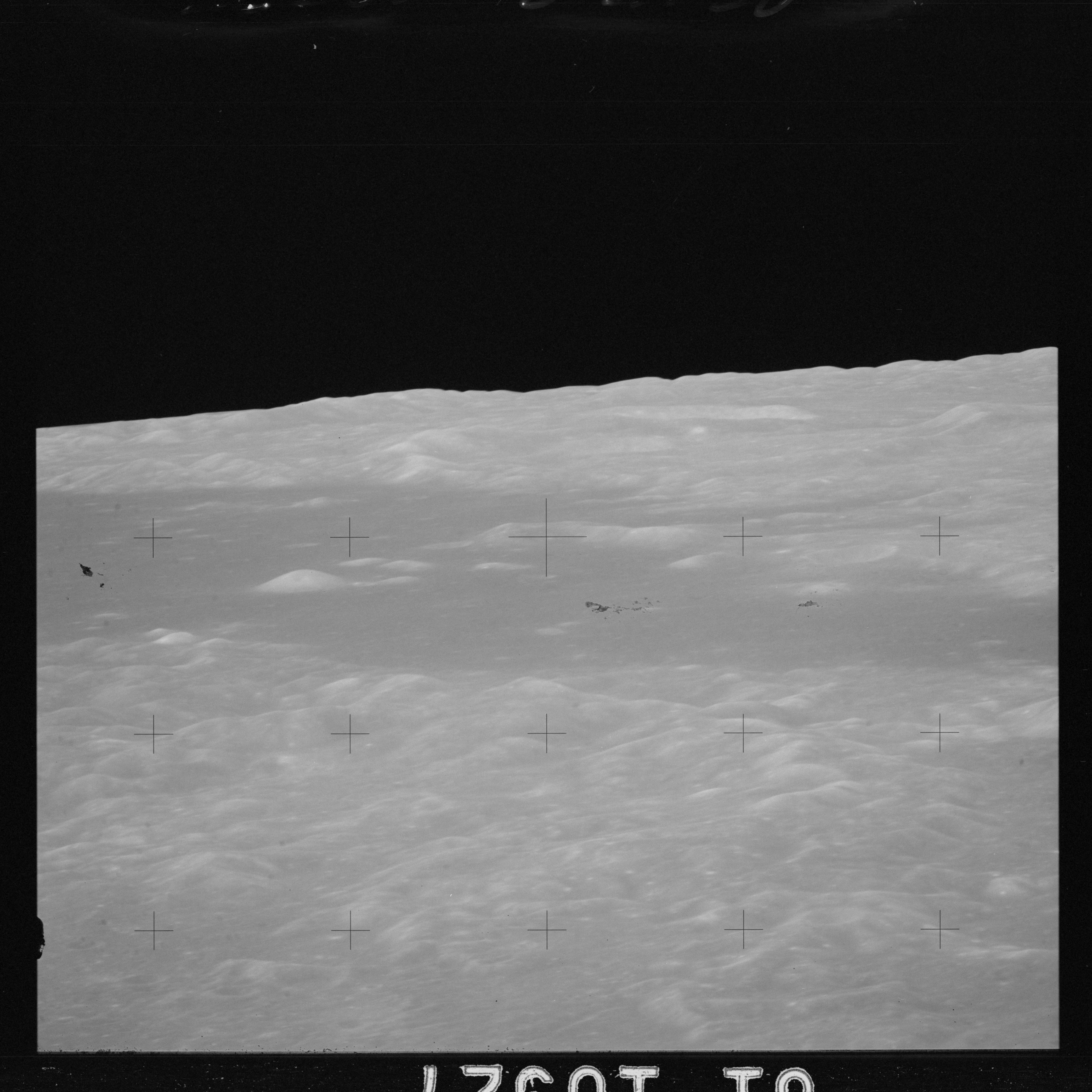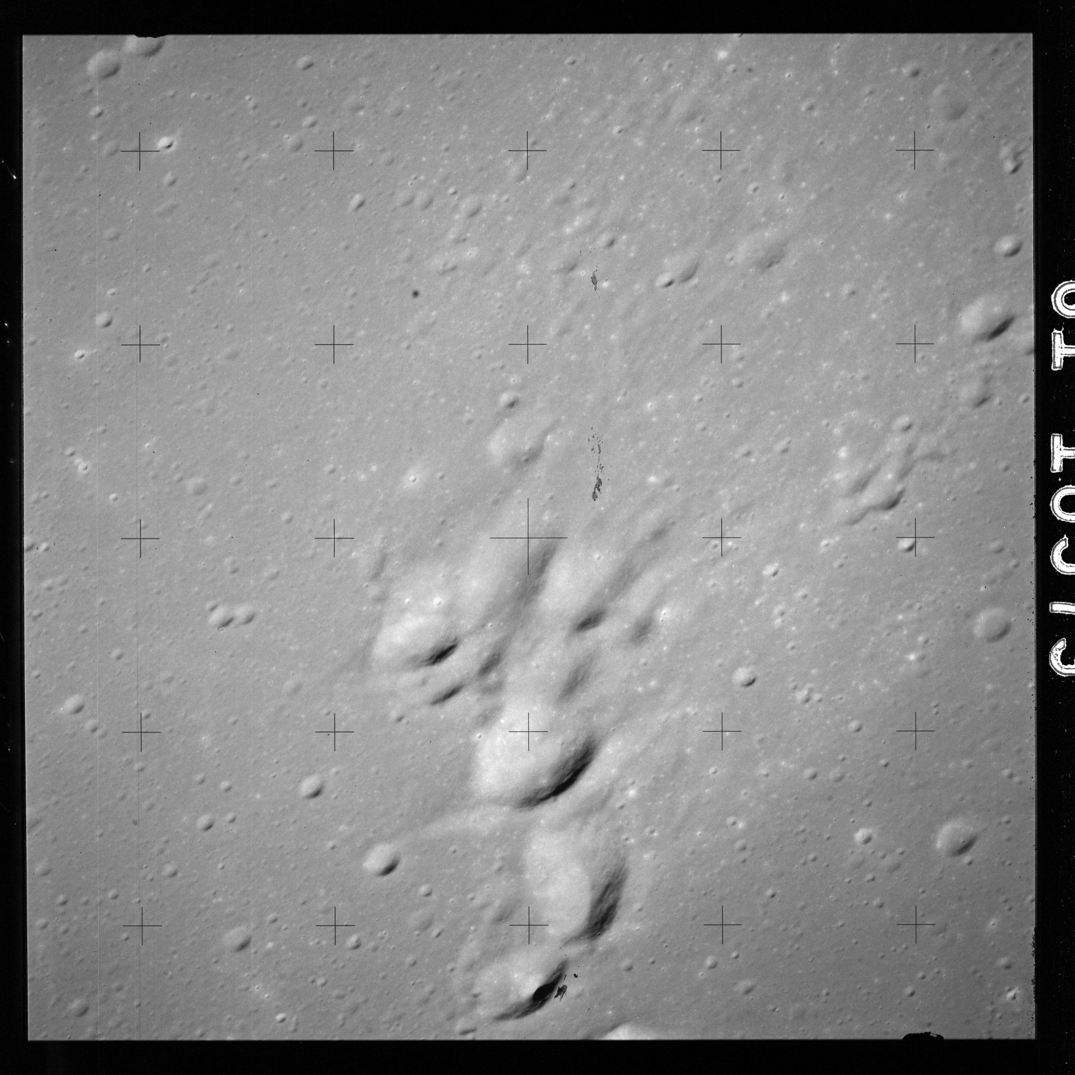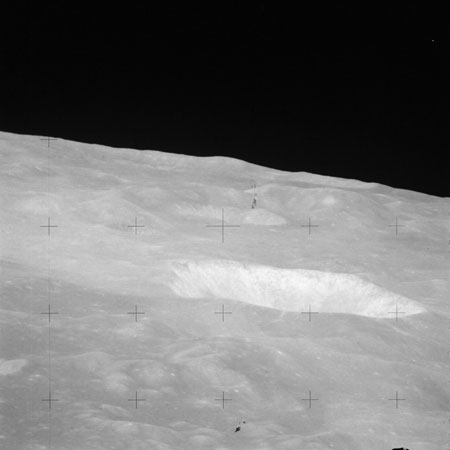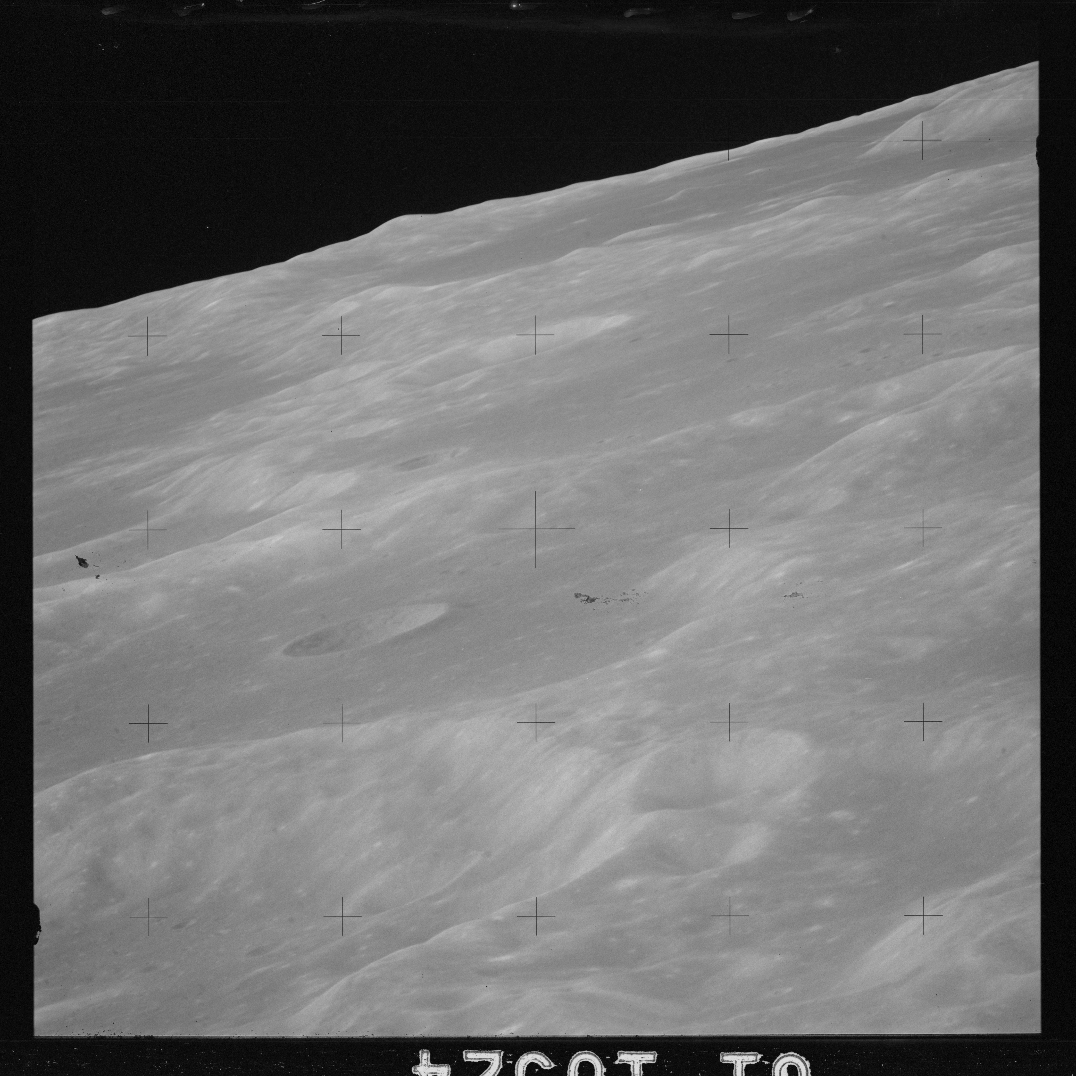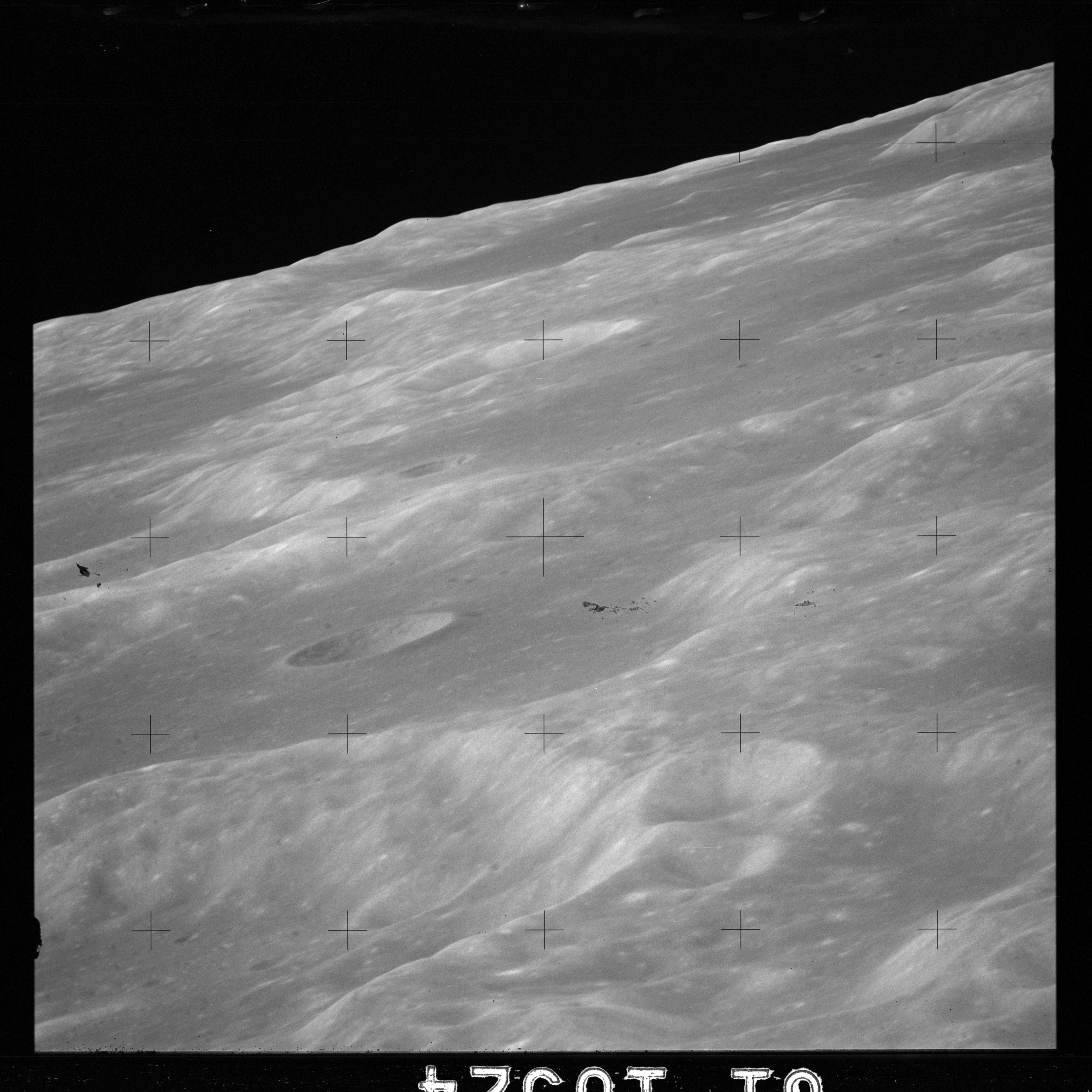 They have two Hasselblad cameras in use. One has a Réseau glass plate fitted which imprints crosses on the photographs for photogrammetry purposes. It has magazine QQ attached loaded with black and white film adn its current lens is a 500-mm telephoto. The other camera has magazine O with colour film (Ektachrome) and a 250-mm medium telephoto lens. It has no Réseau plate fitted. During a sequence of 19 images taken with the latter combination just before AOS, AS15-97-13175 to 13193, they will photograph target number 10 as given in the Flight Plan, the ancient 130-km crater Sklodowska.
