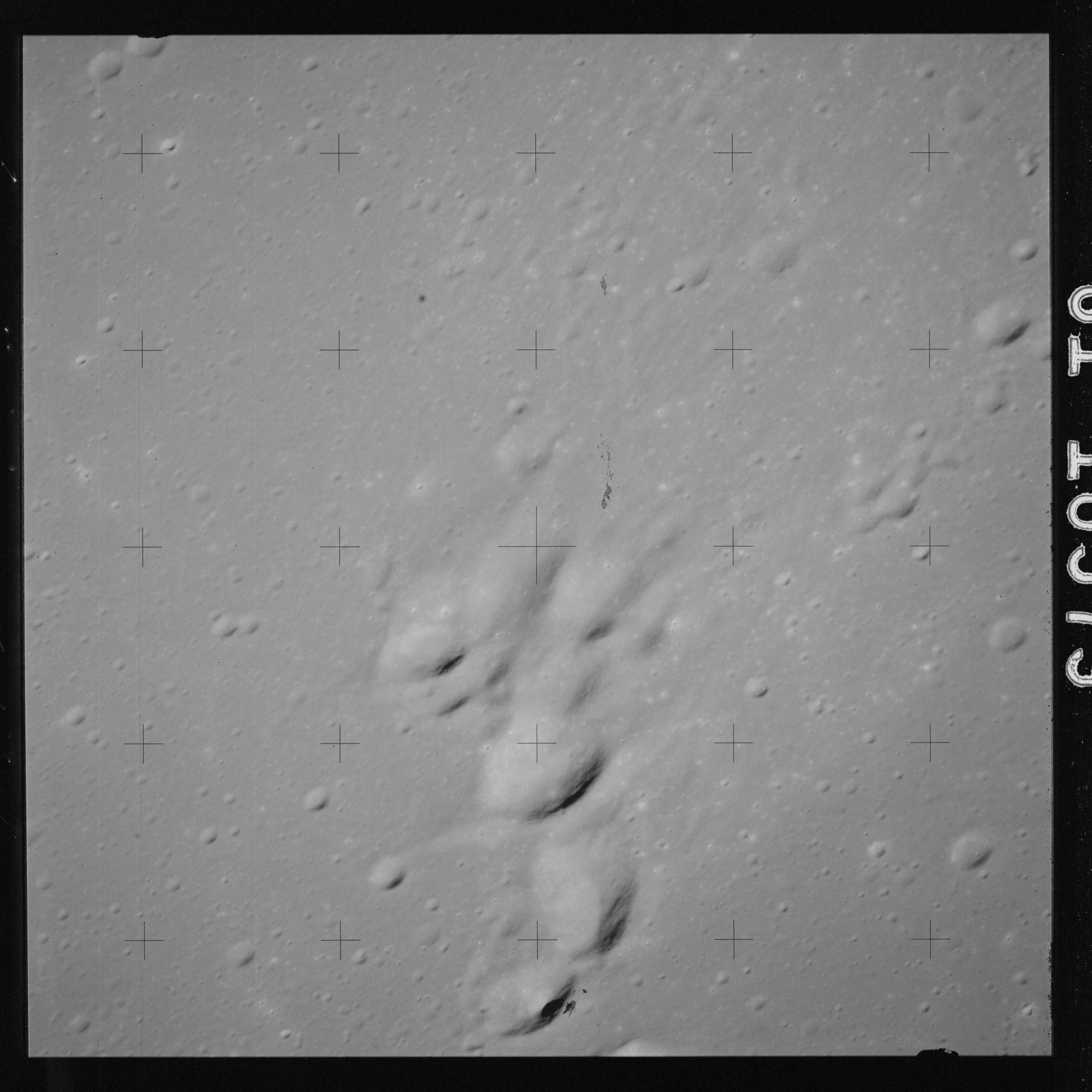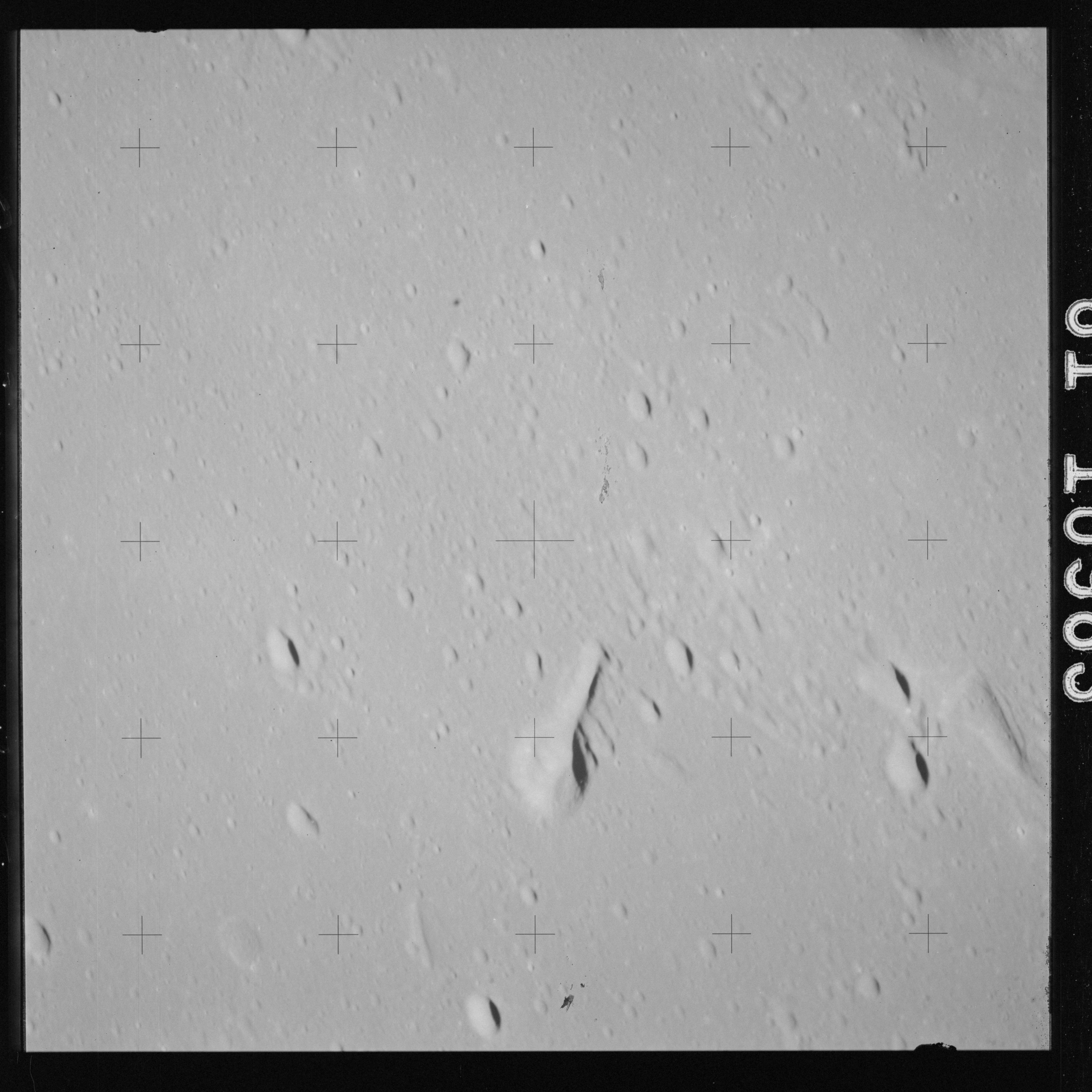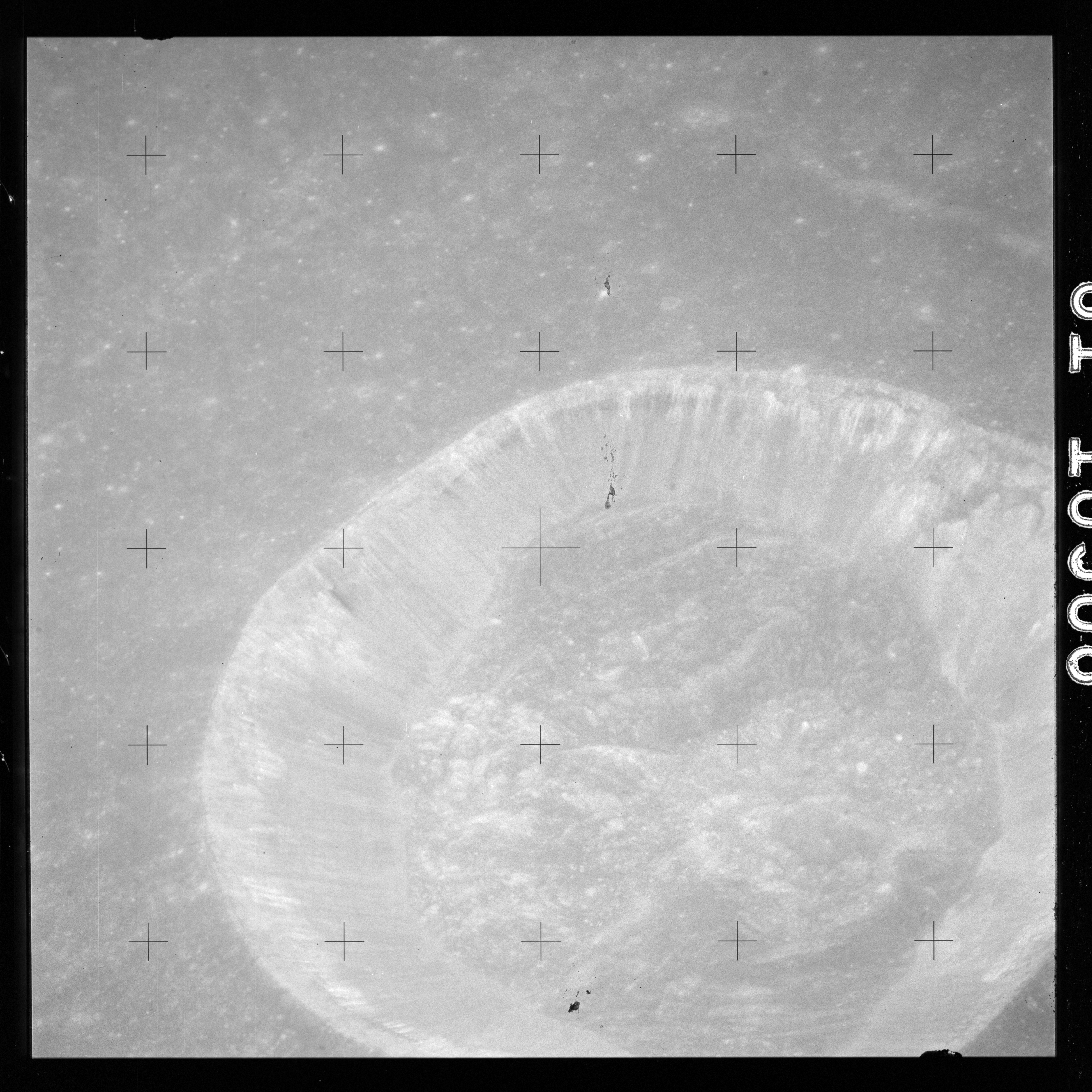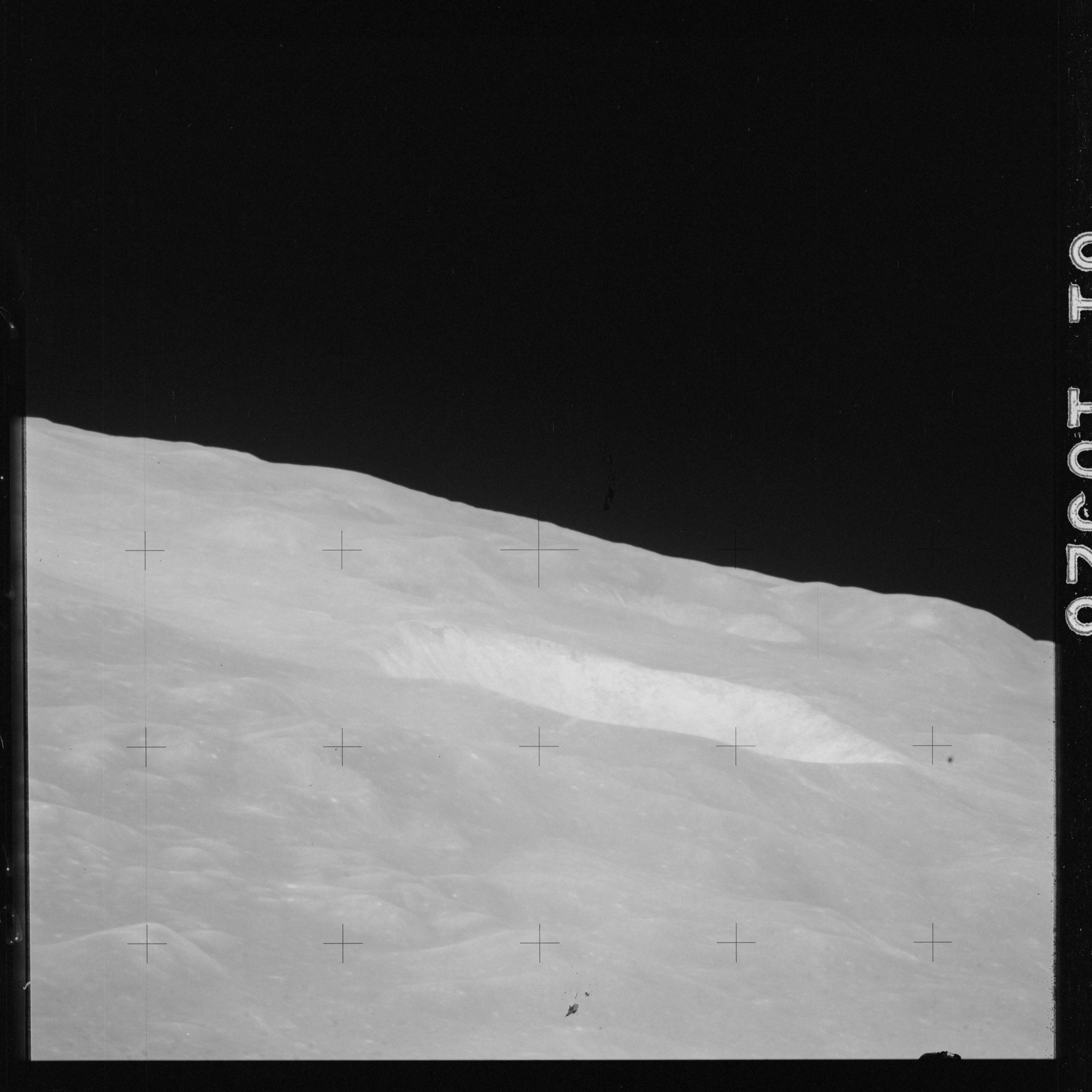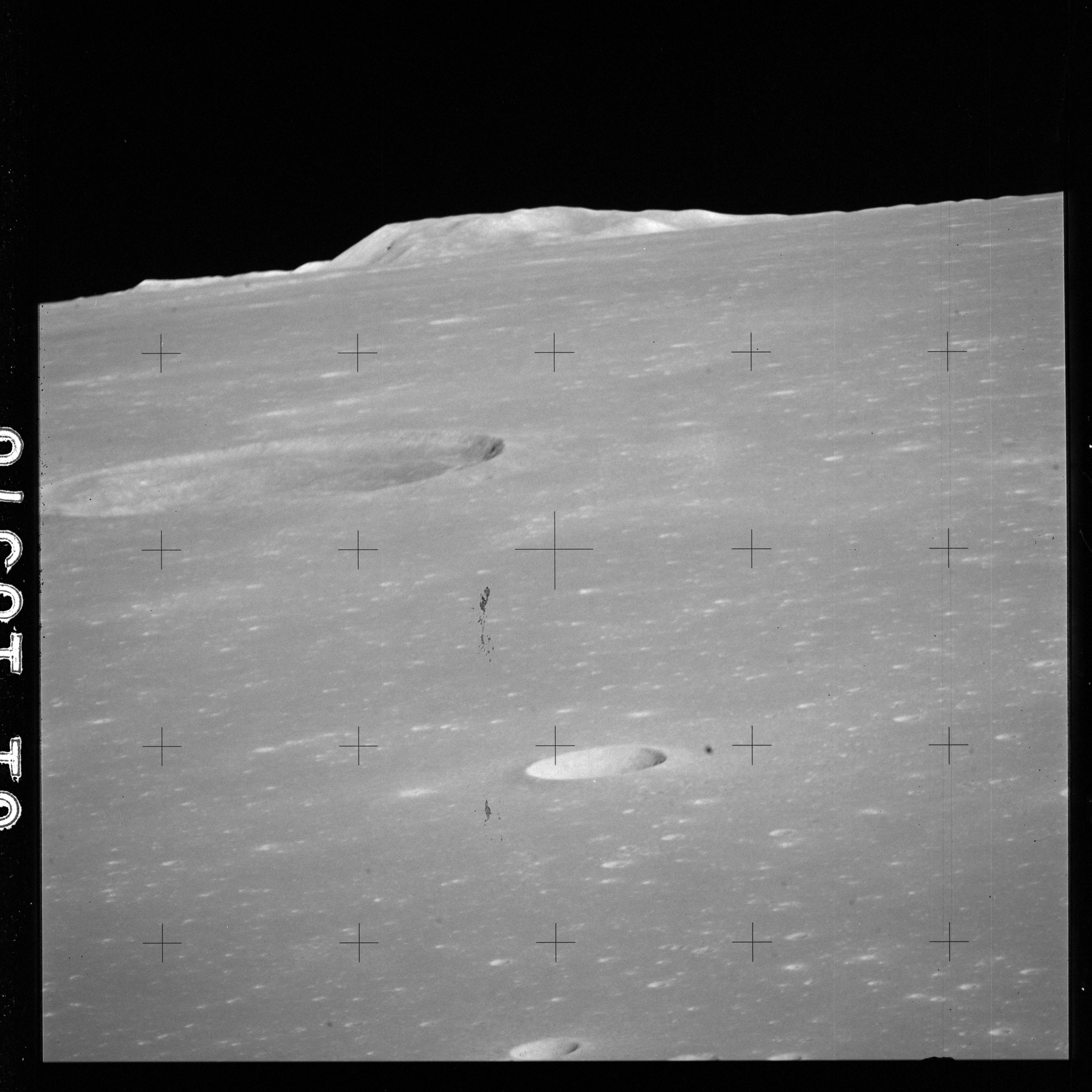 They have two Hasselblad cameras in use. One has a Réseau glass plate fitted which imprints crosses on the photographs for photogrammetry purposes. It has magazine QQ attached loaded with black and white film adn its current lens is a 500-mm telephoto. The other camera has magazine O with colour film (Ektachrome) and a 250-mm medium telephoto lens. It has no Réseau plate fitted. During a sequence of 19 images taken with the latter combination just before AOS, AS15-97-13175 to 13193, they will photograph target number 10 as given in the Flight Plan, the ancient 130-km crater Sklodowska.