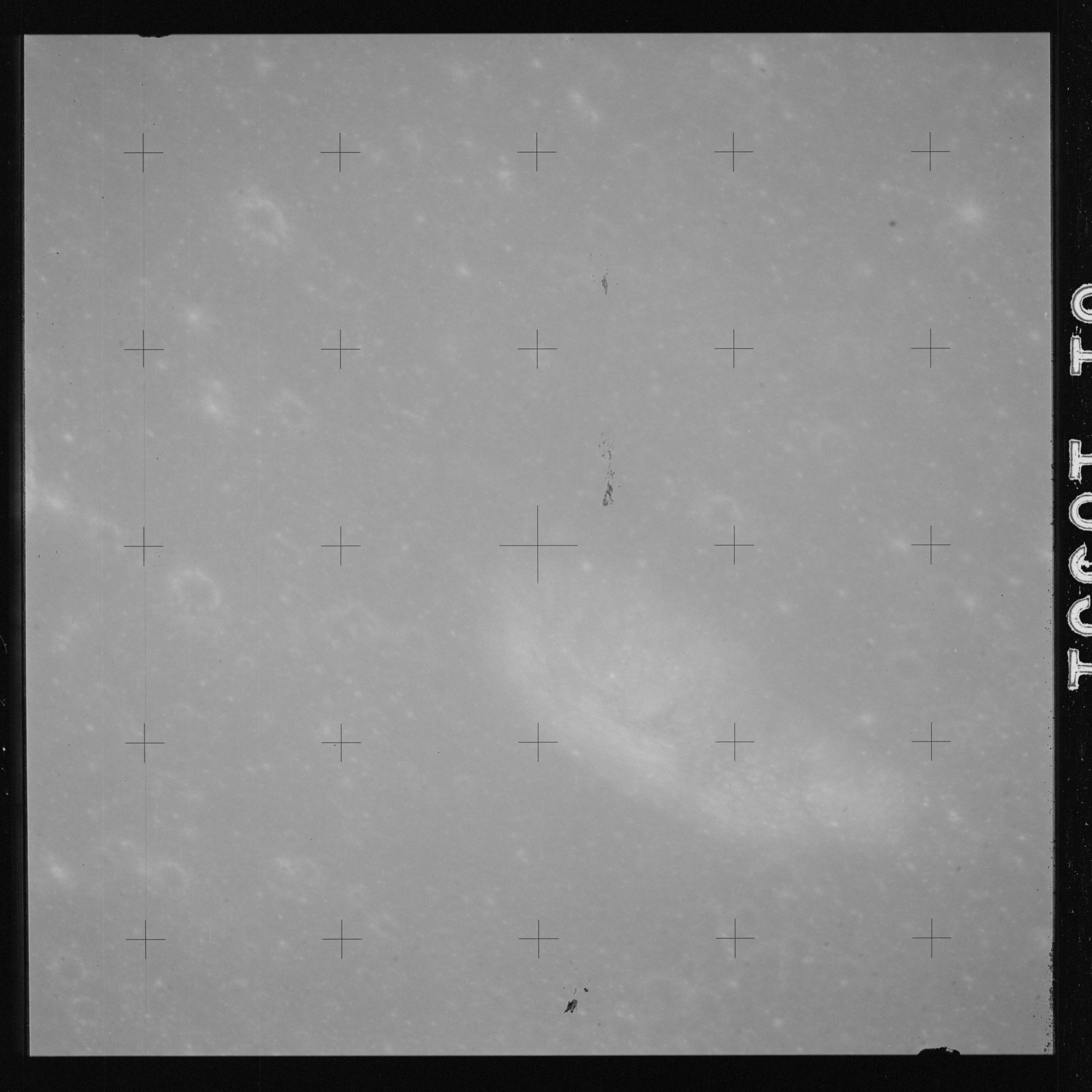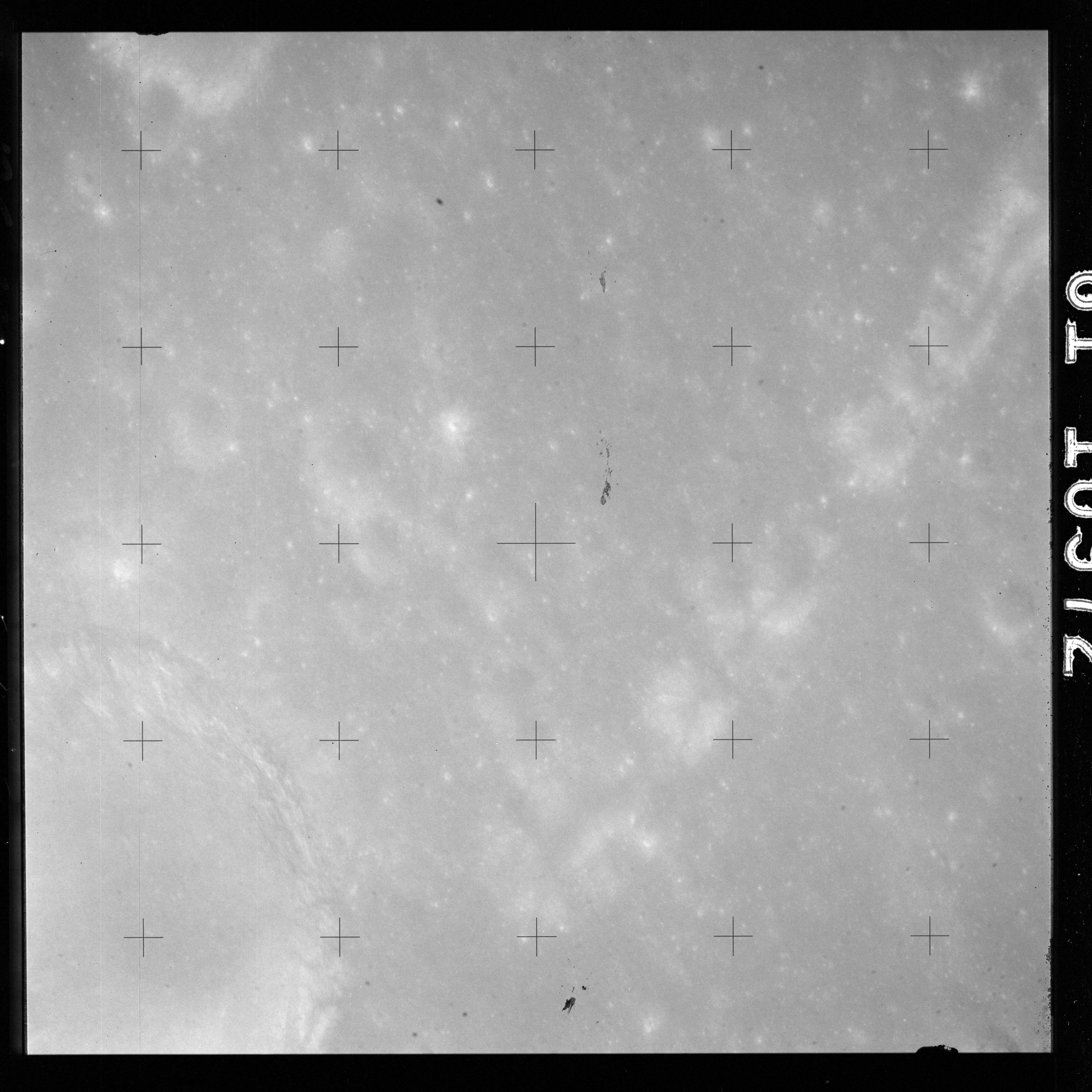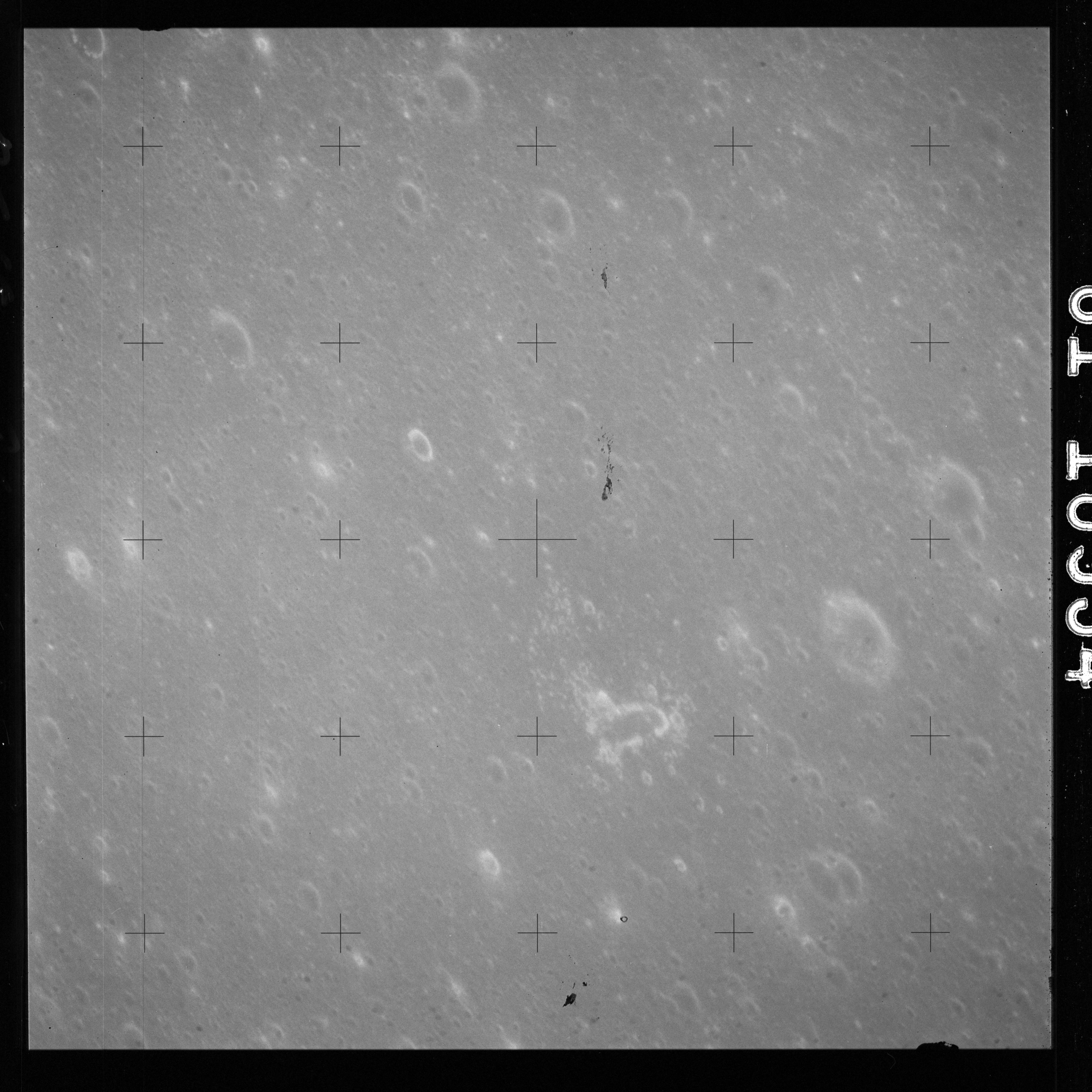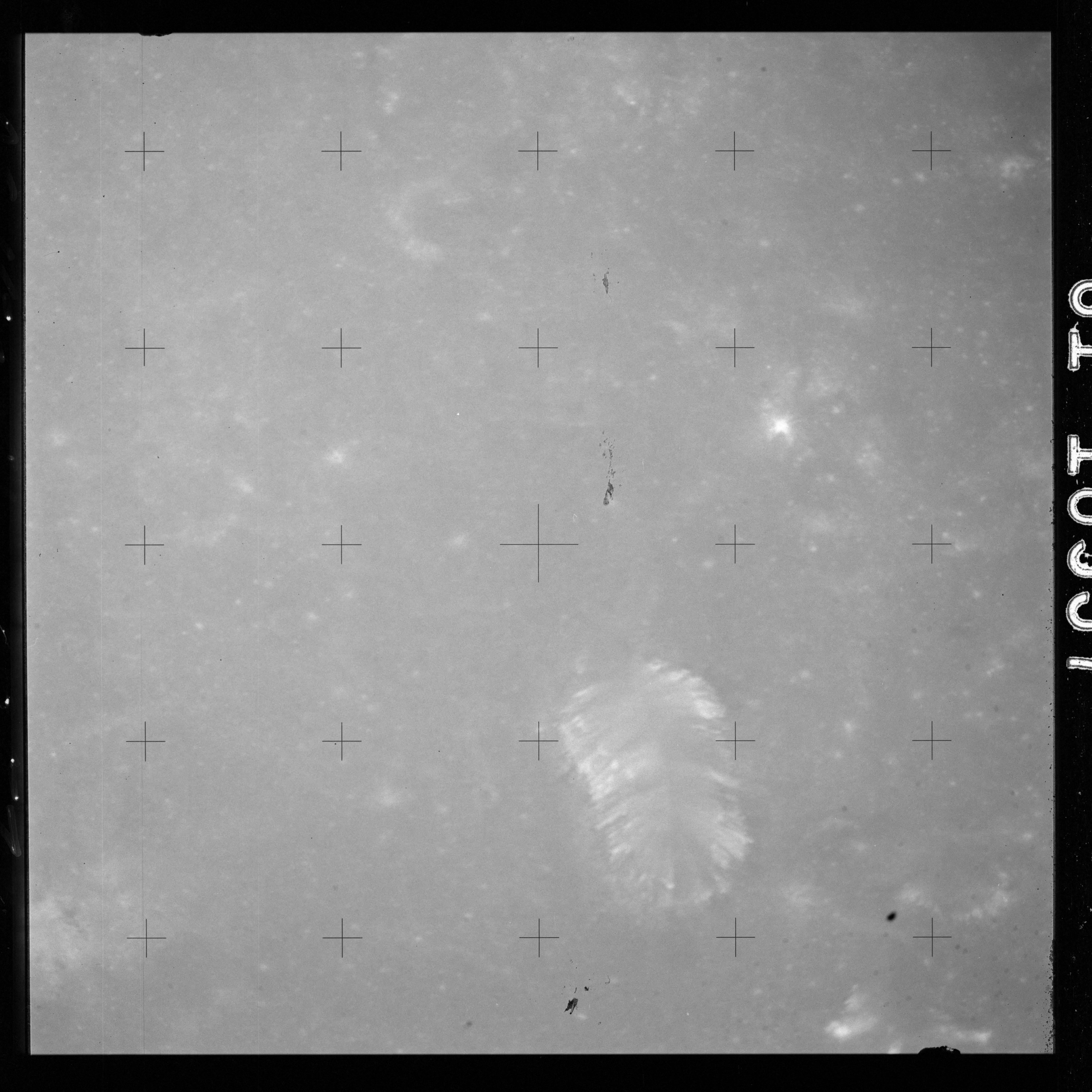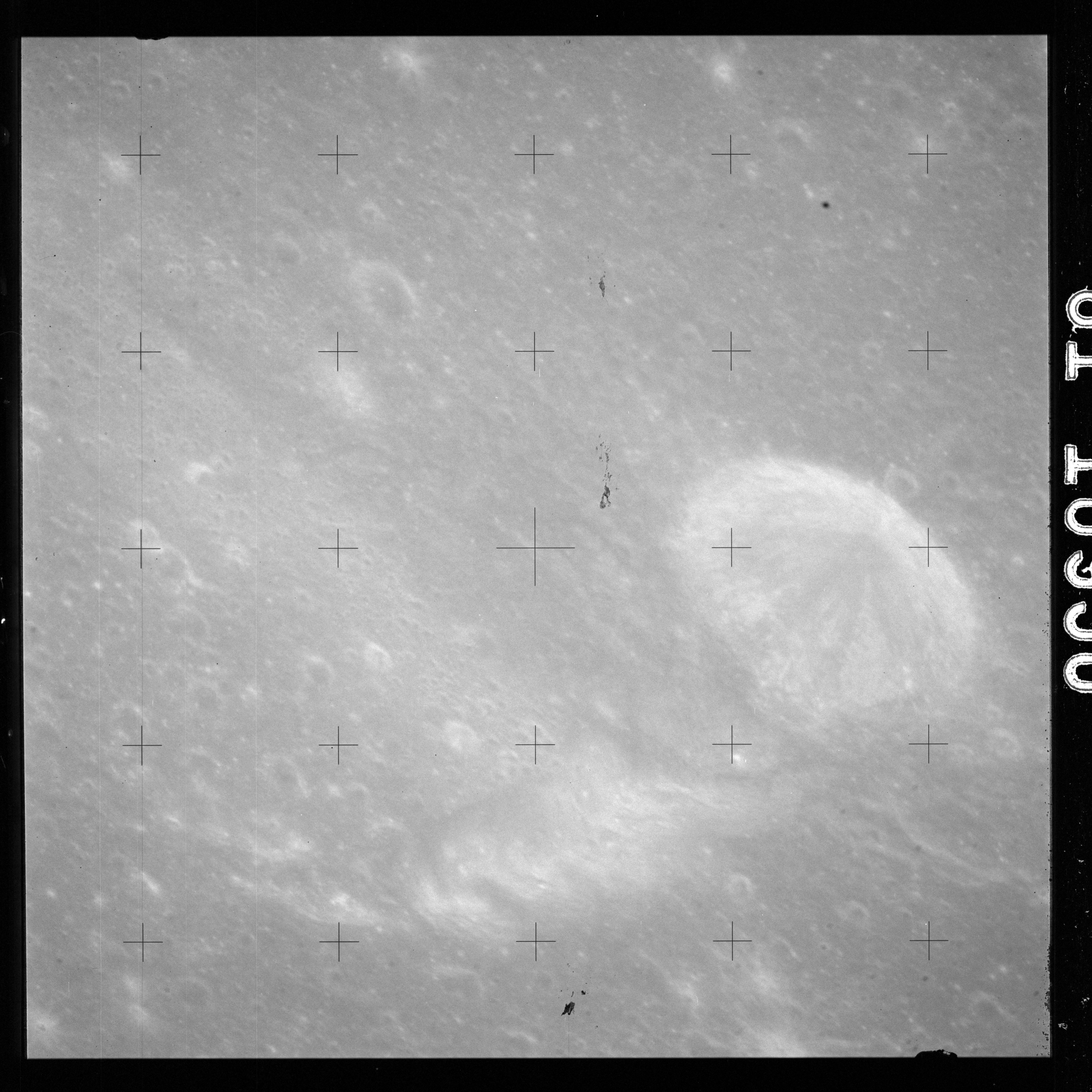 They have two Hasselblad cameras in use. One has a Réseau glass plate fitted which imprints crosses on the photographs for photogrammetry purposes. It has magazine QQ attached loaded with black and white film adn its current lens is a 500-mm telephoto. The other camera has magazine O with colour film (Ektachrome) and a 250-mm medium telephoto lens. It has no Réseau plate fitted. During a sequence of 19 images taken with the latter combination just before AOS, AS15-97-13175 to 13193, they will photograph target number 10 as given in the Flight Plan, the ancient 130-km crater Sklodowska.