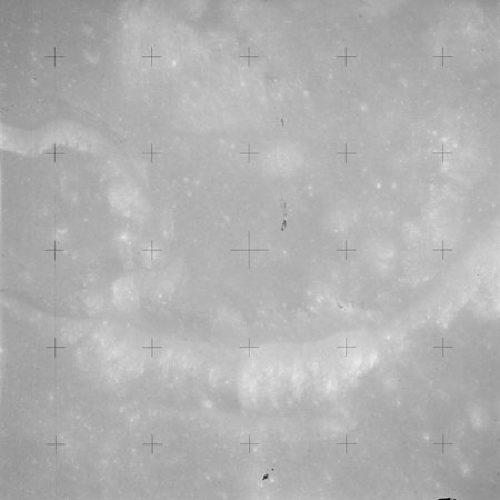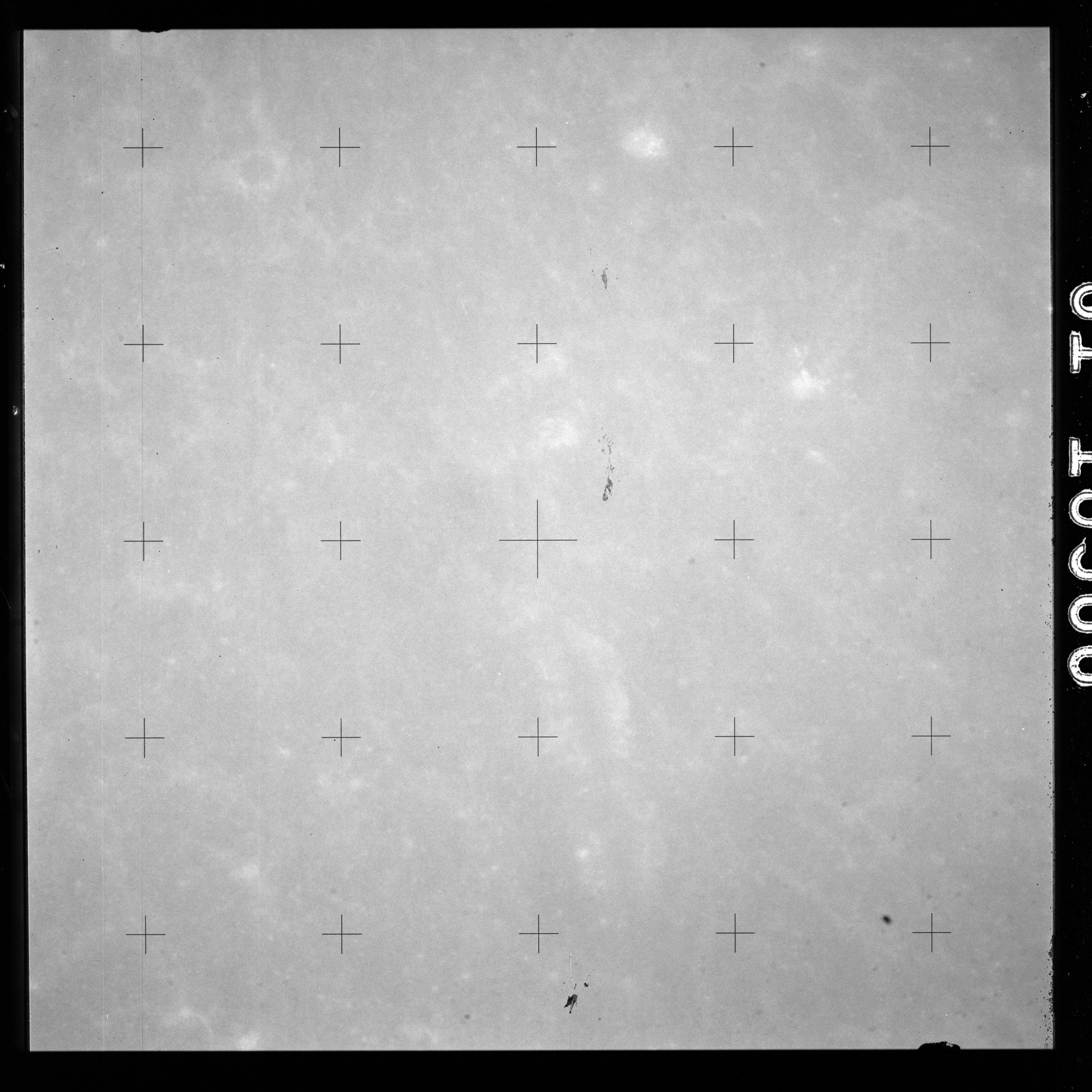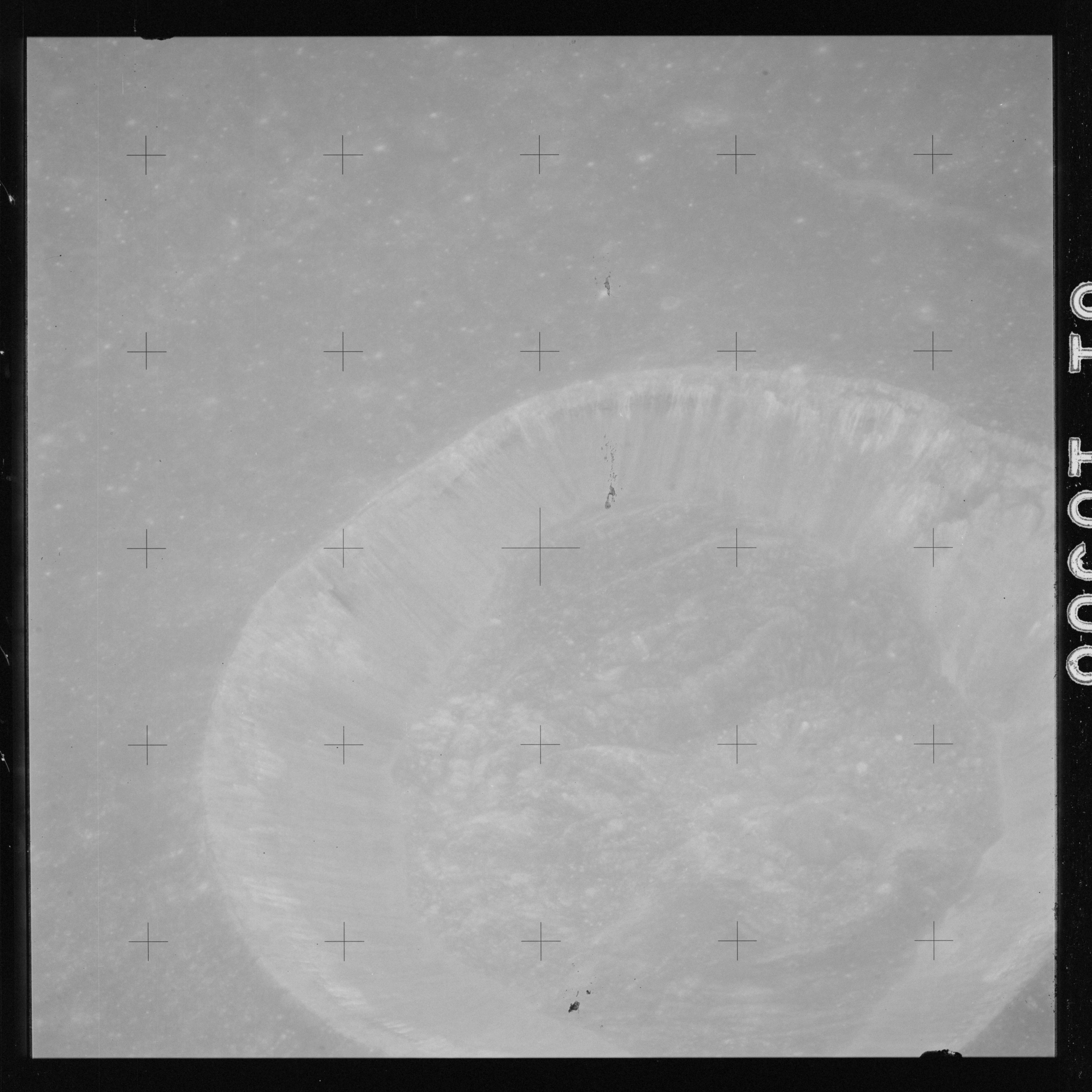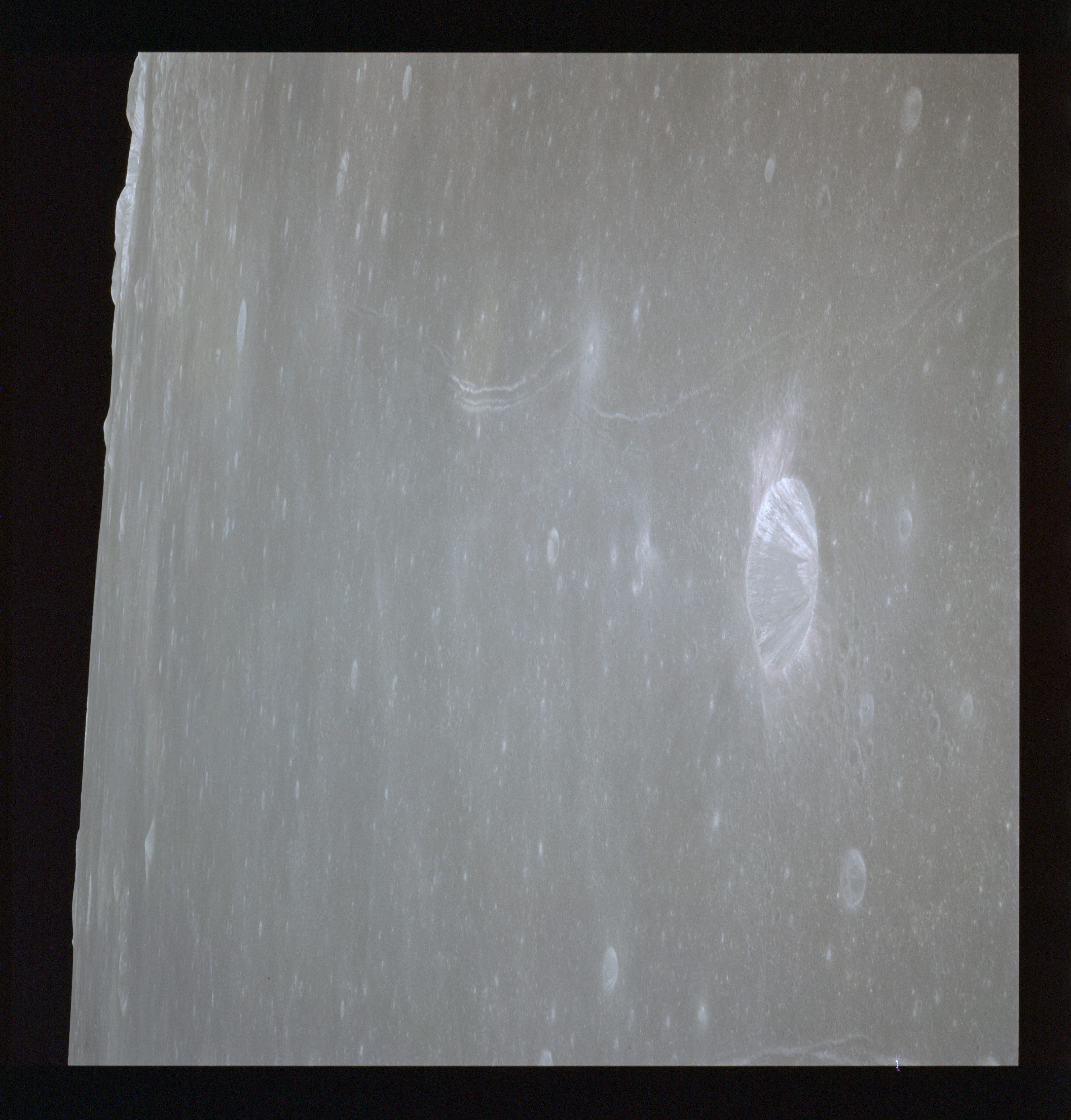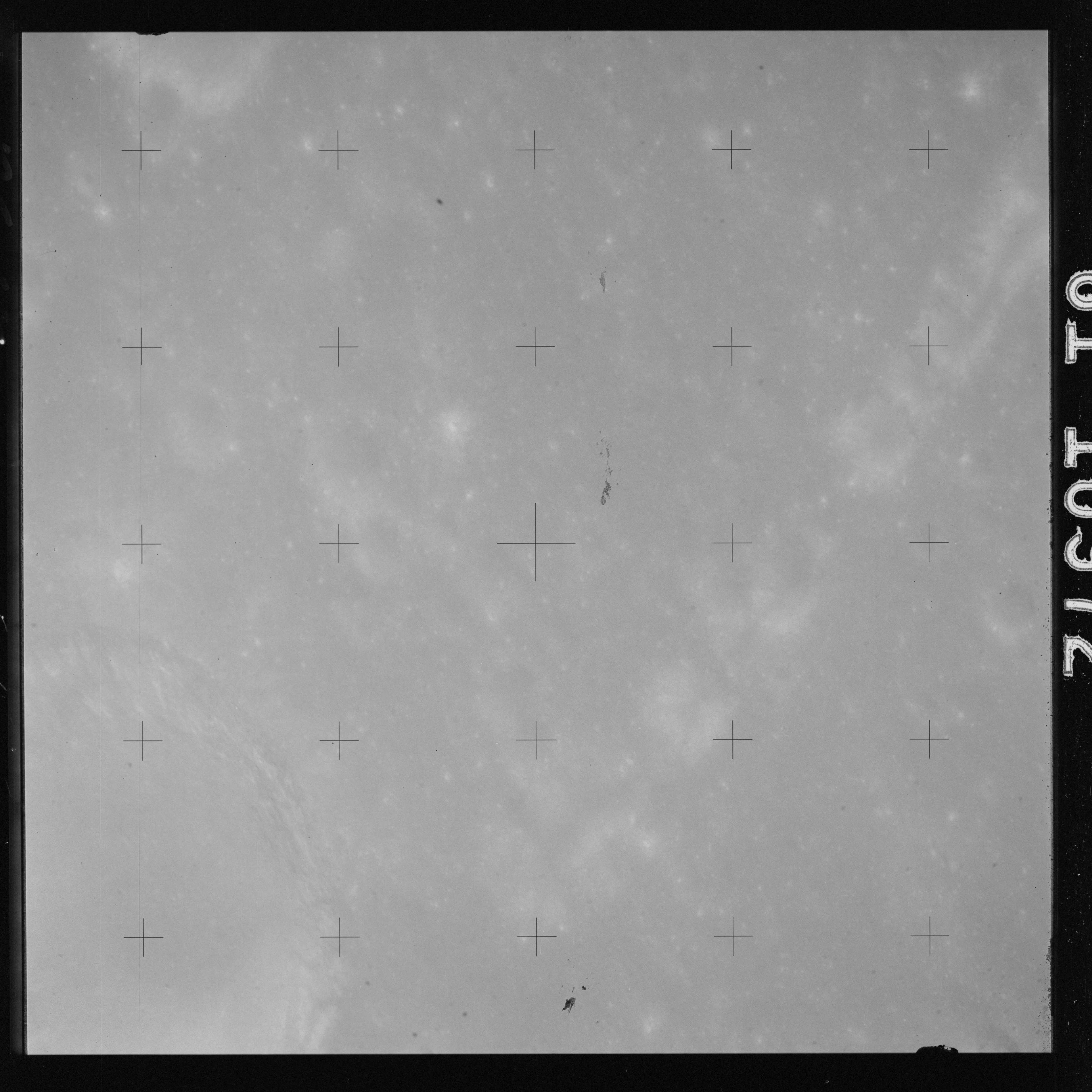 They have two Hasselblad cameras in use. One has a Réseau glass plate fitted which imprints crosses on the photographs for photogrammetry purposes. It has magazine QQ attached loaded with black and white film adn its current lens is a 500-mm telephoto. The other camera has magazine O with colour film (Ektachrome) and a 250-mm medium telephoto lens. It has no Réseau plate fitted. During a sequence of 19 images taken with the latter combination just before AOS, AS15-97-13175 to 13193, they will photograph target number 10 as given in the Flight Plan, the ancient 130-km crater Sklodowska.