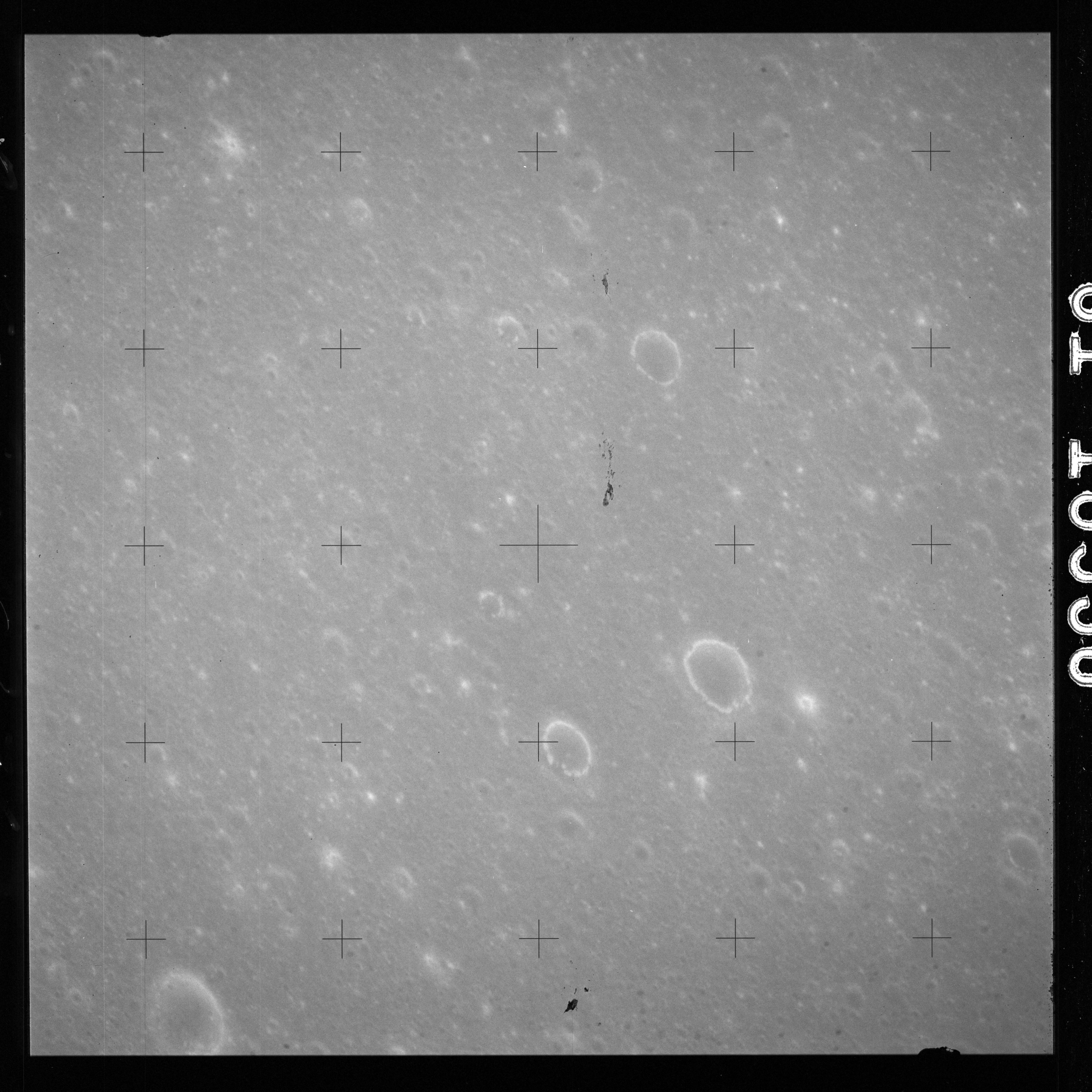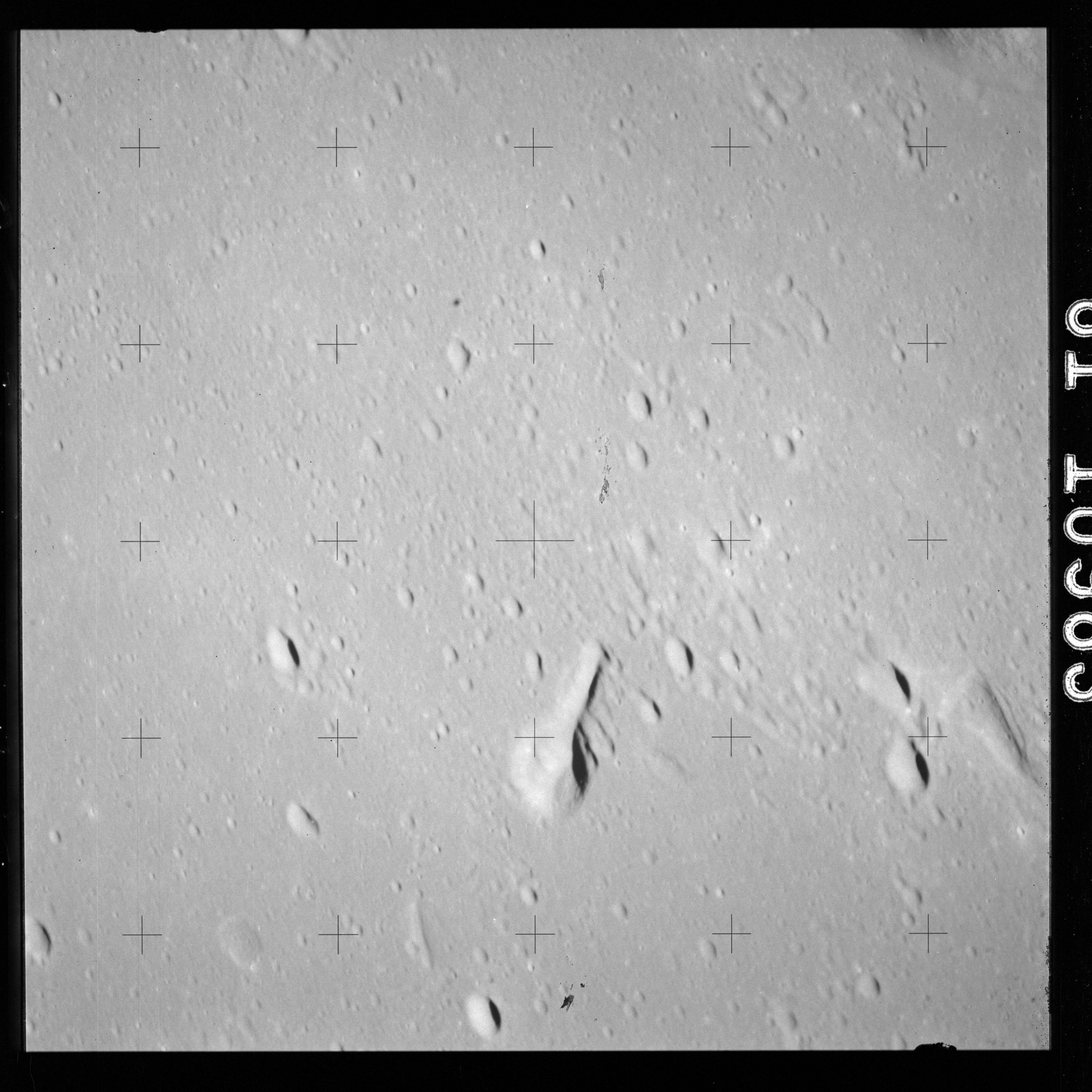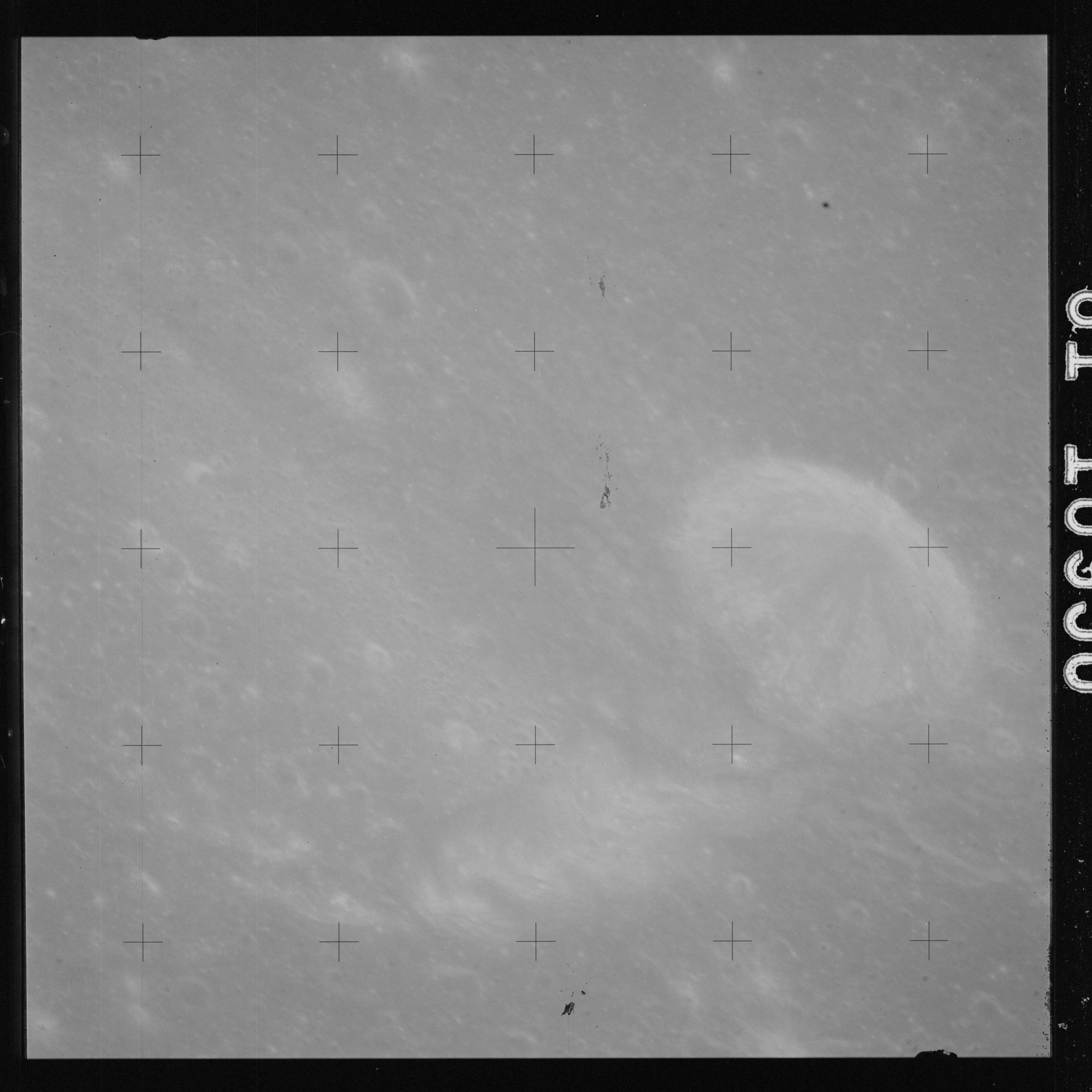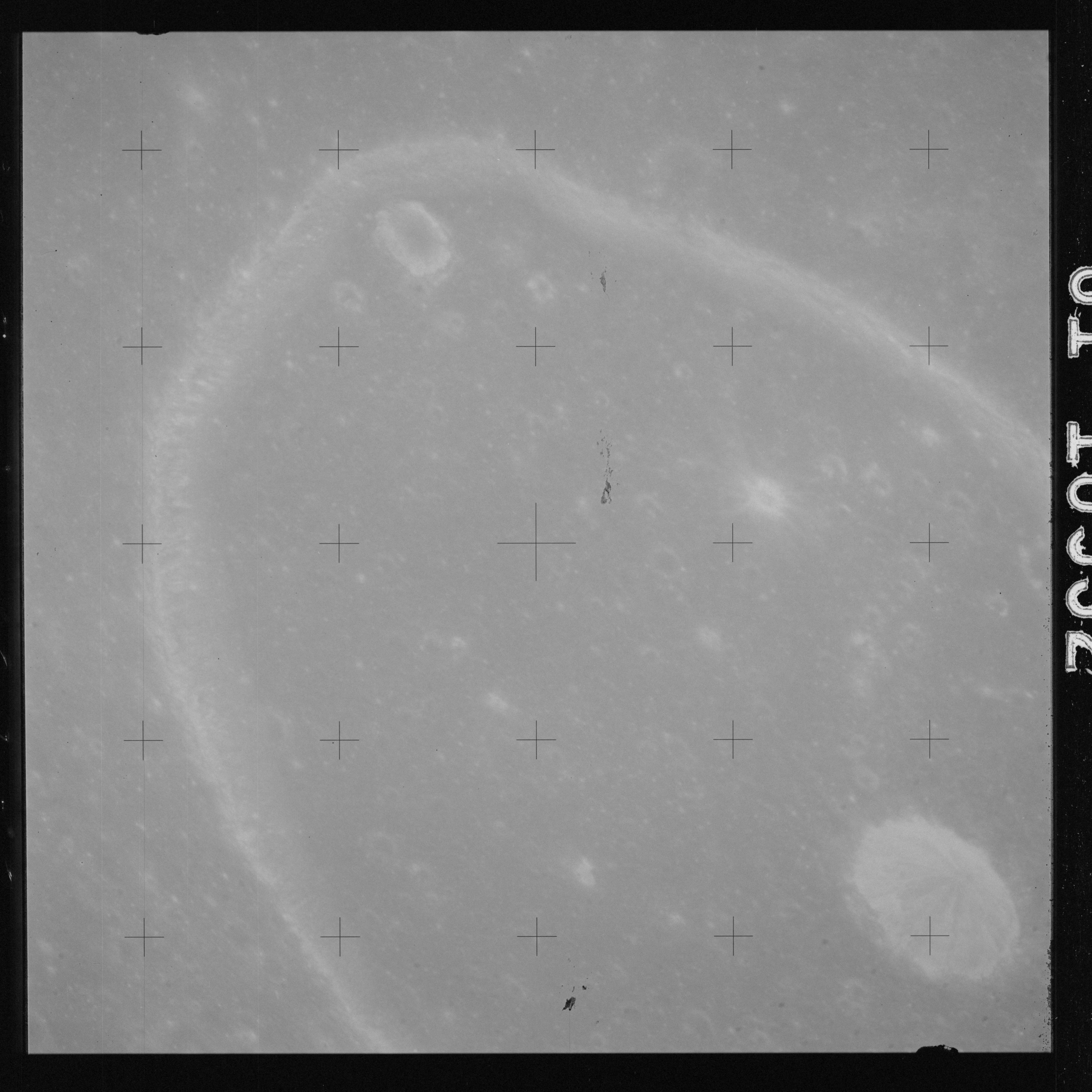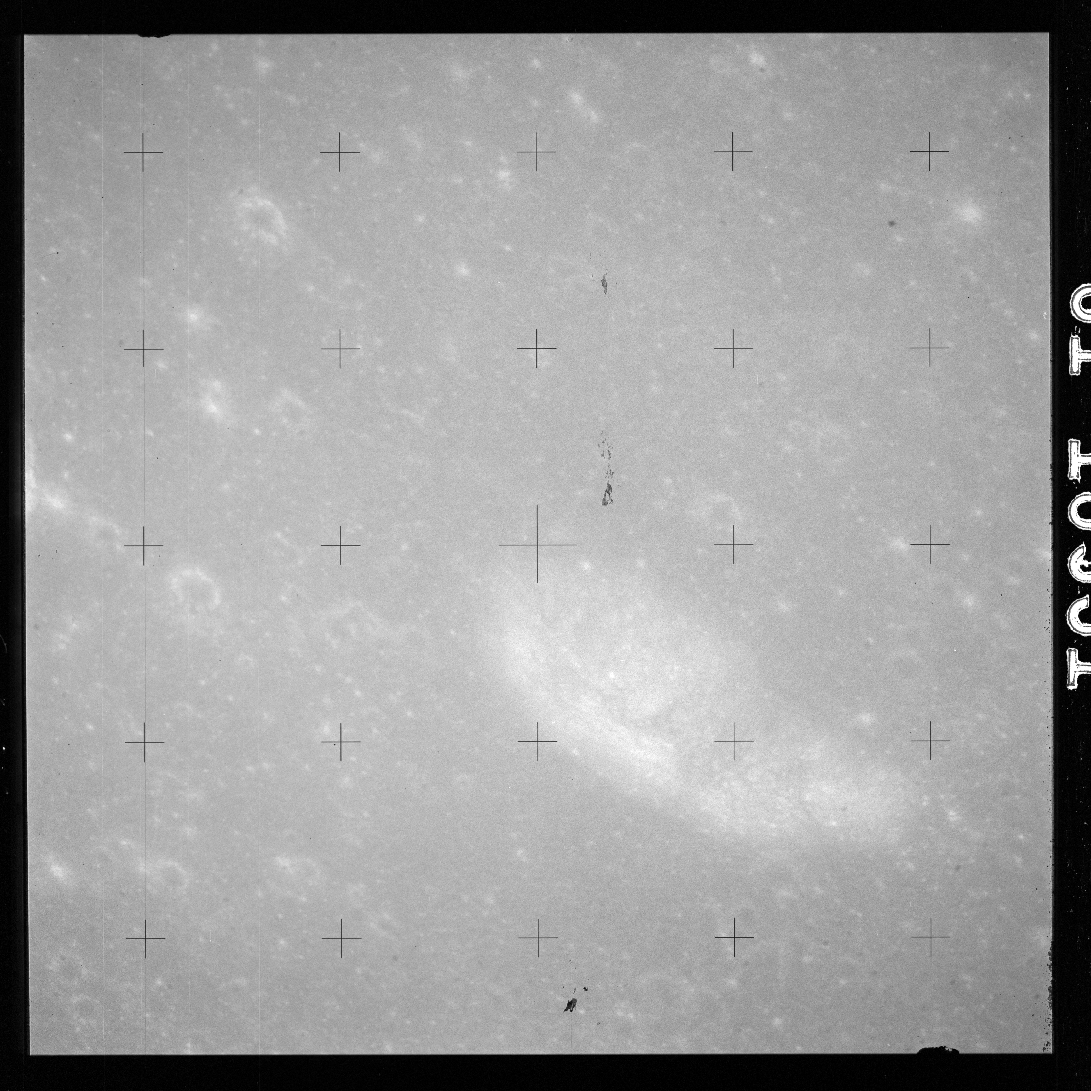 They have two Hasselblad cameras in use. One has a Réseau glass plate fitted which imprints crosses on the photographs for photogrammetry purposes. It has magazine QQ attached loaded with black and white film adn its current lens is a 500-mm telephoto. The other camera has magazine O with colour film (Ektachrome) and a 250-mm medium telephoto lens. It has no Réseau plate fitted. During a sequence of 19 images taken with the latter combination just before AOS, AS15-97-13175 to 13193, they will photograph target number 10 as given in the Flight Plan, the ancient 130-km crater Sklodowska.