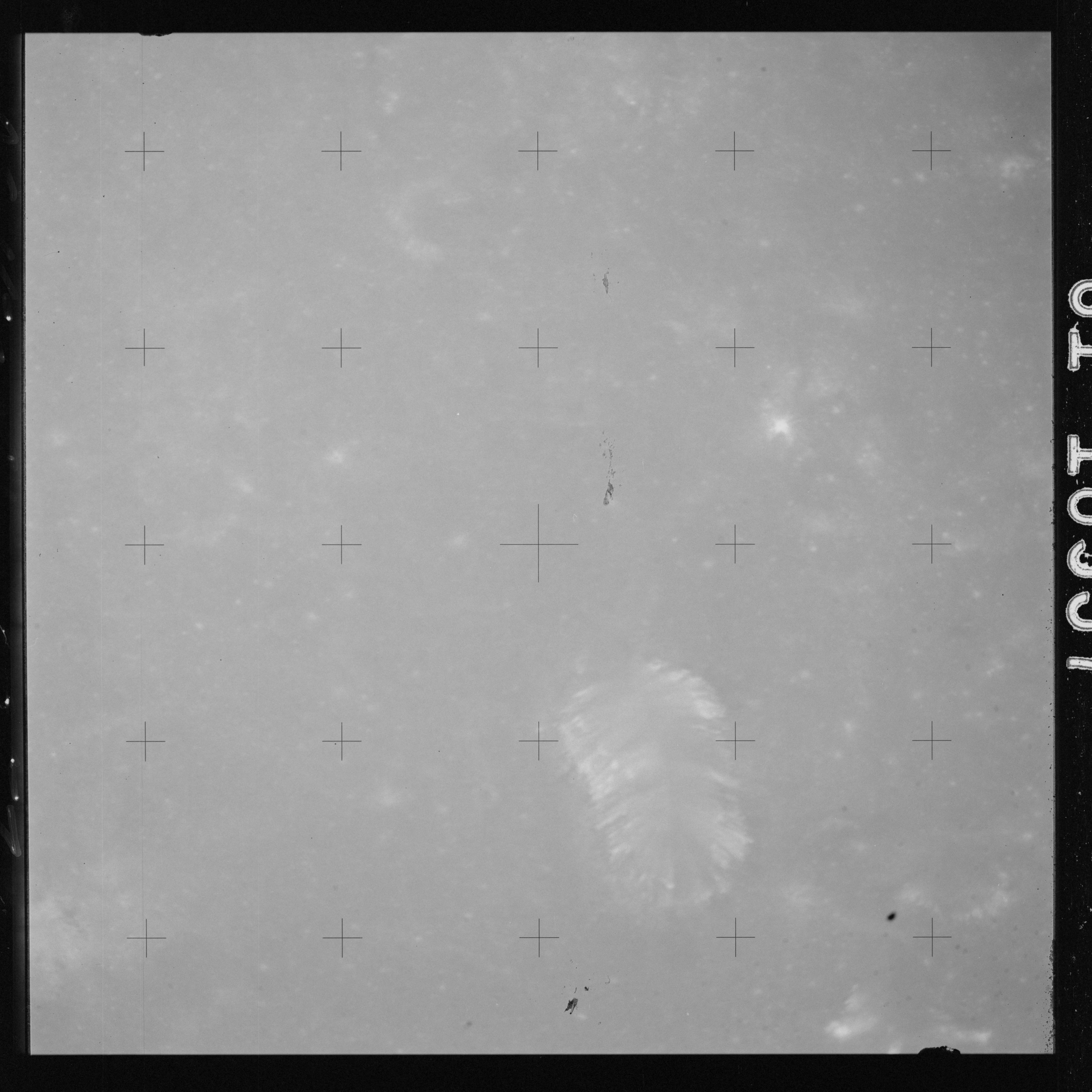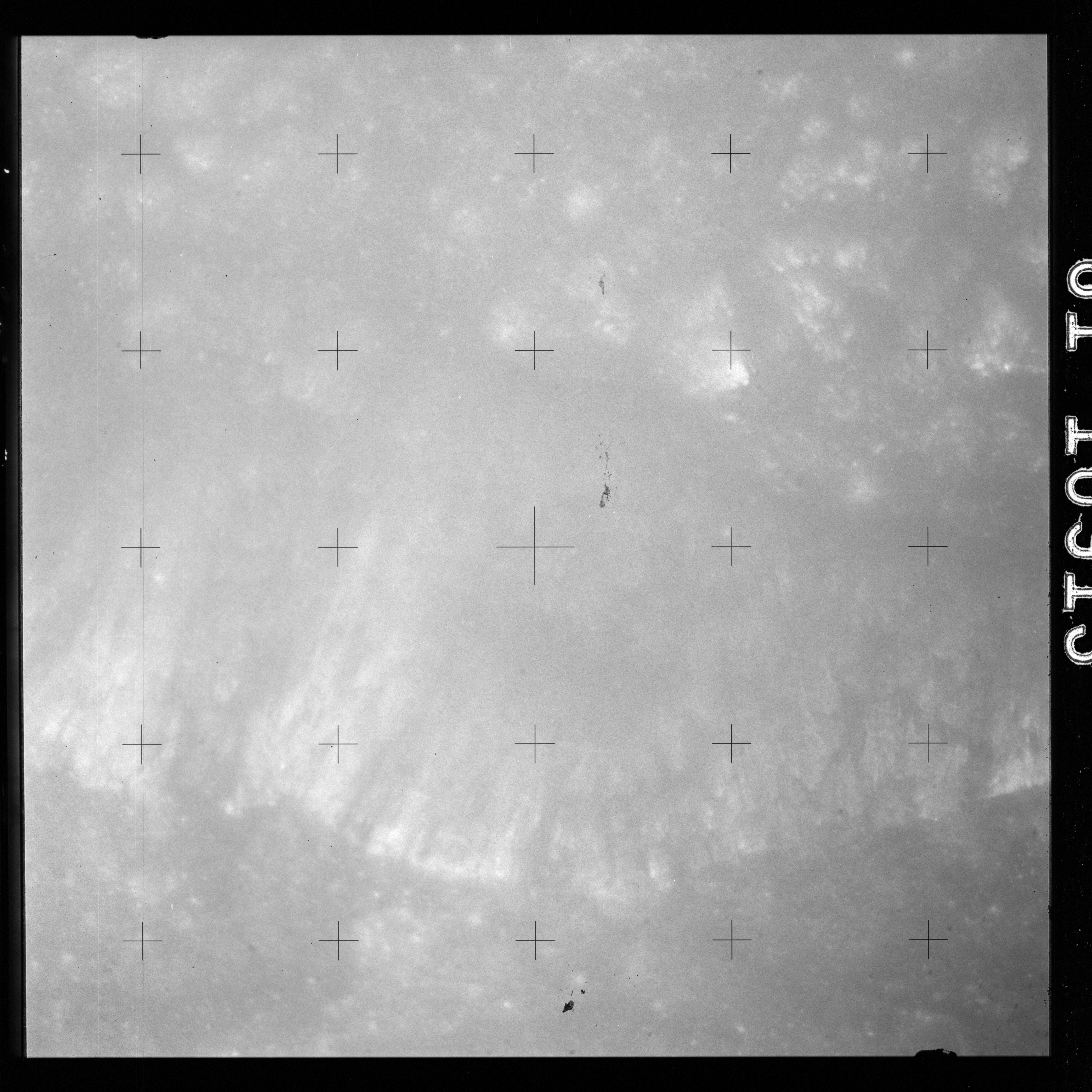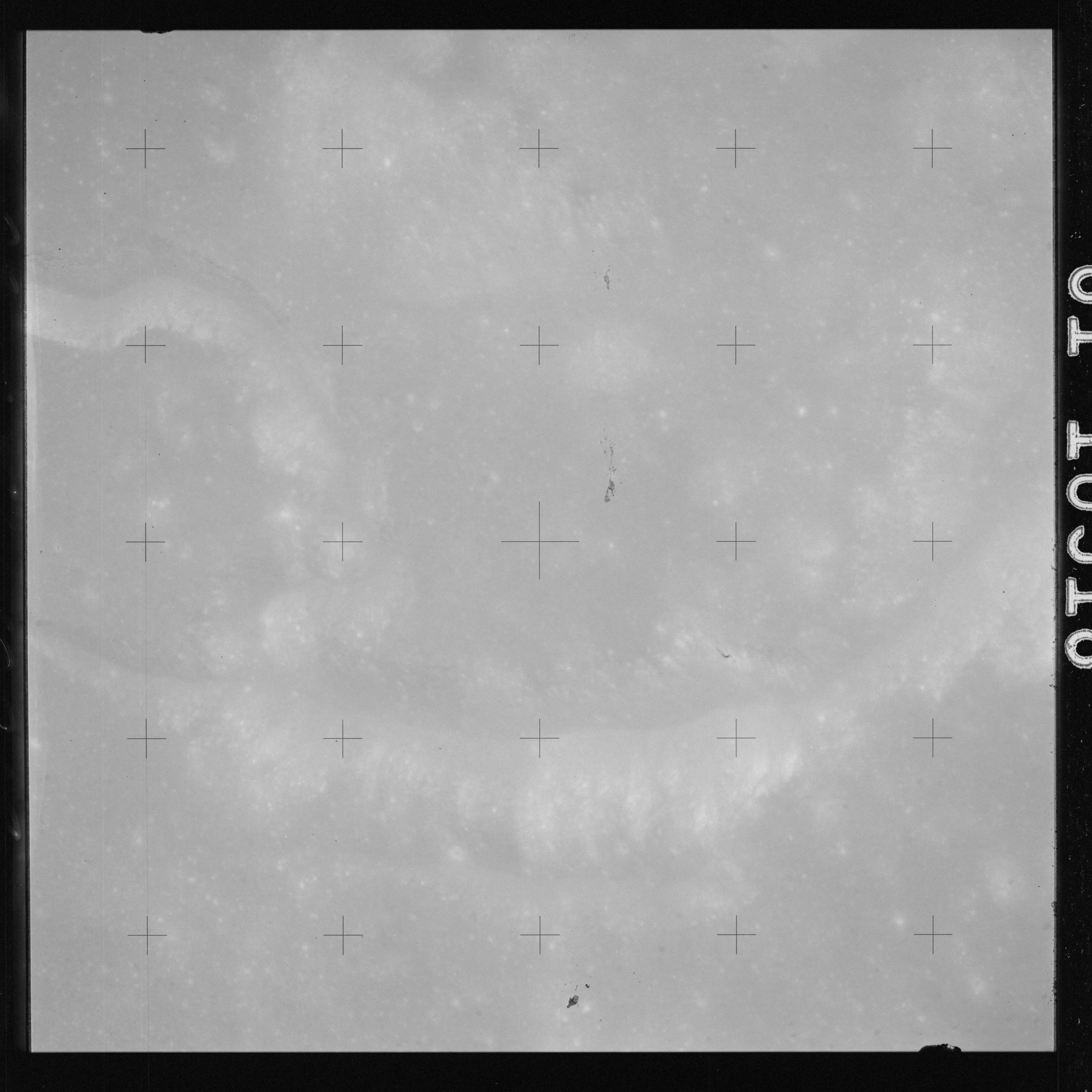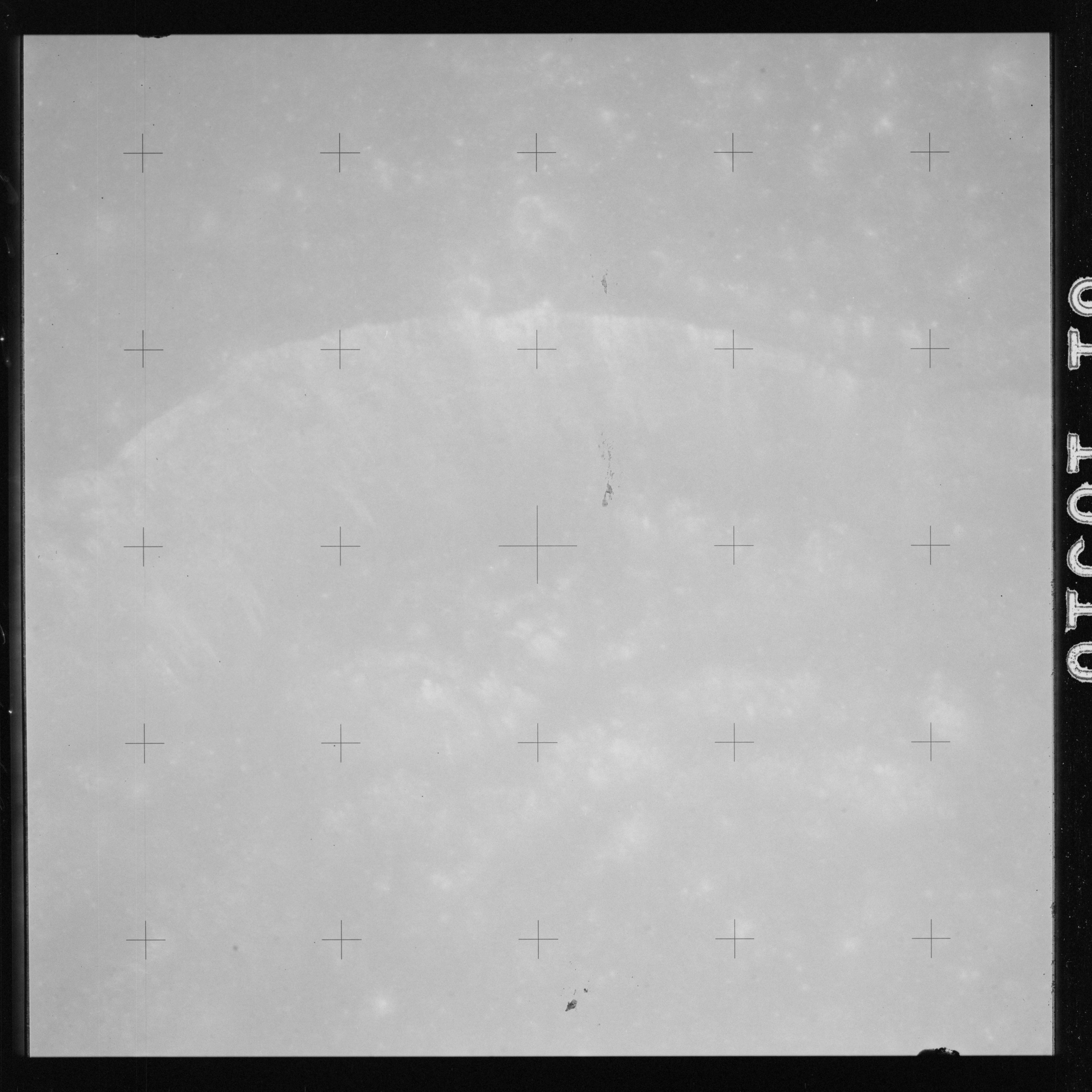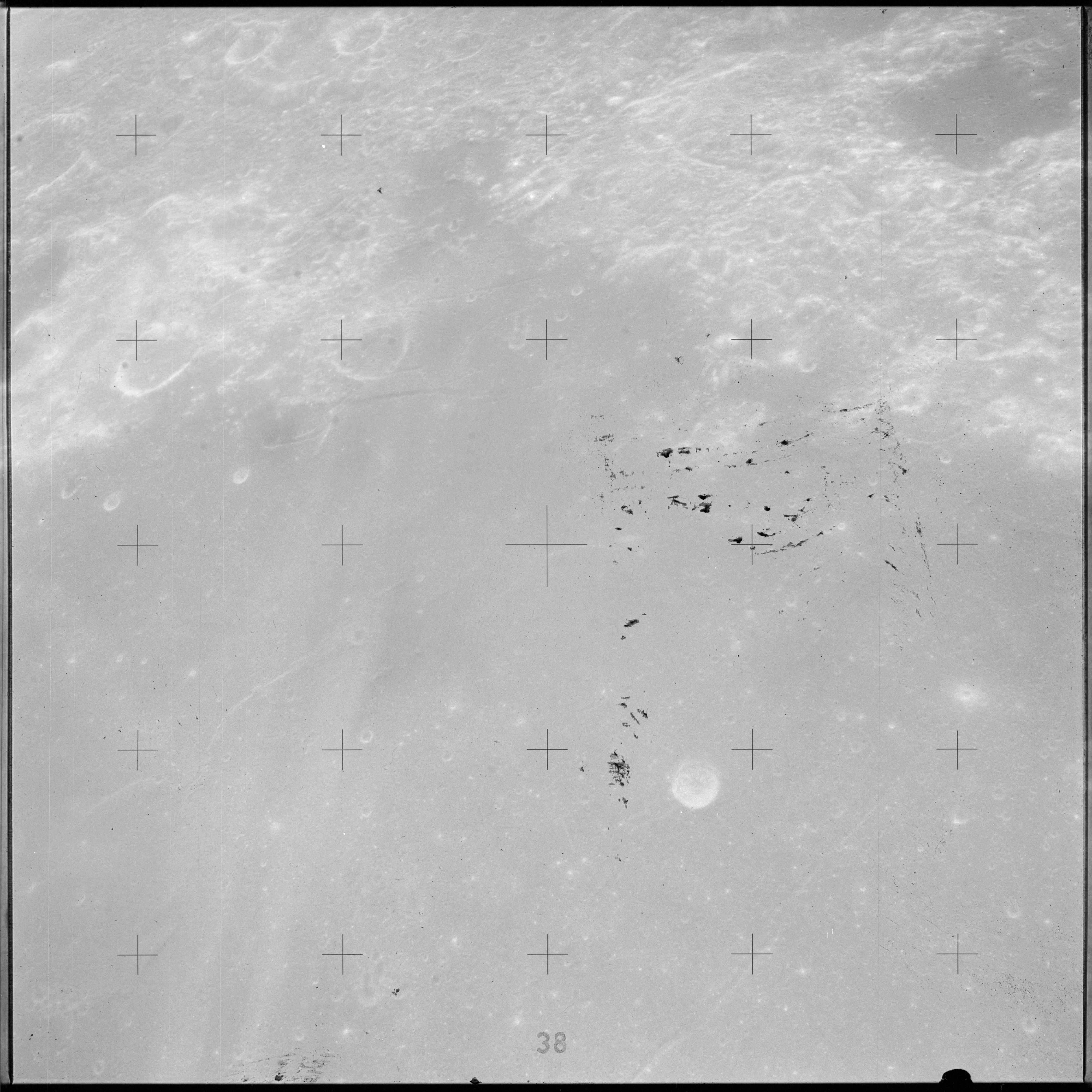 They have two Hasselblad cameras in use. One has a Réseau glass plate fitted which imprints crosses on the photographs for photogrammetry purposes. It has magazine QQ attached loaded with black and white film adn its current lens is a 500-mm telephoto. The other camera has magazine O with colour film (Ektachrome) and a 250-mm medium telephoto lens. It has no Réseau plate fitted. During a sequence of 19 images taken with the latter combination just before AOS, AS15-97-13175 to 13193, they will photograph target number 10 as given in the Flight Plan, the ancient 130-km crater Sklodowska.