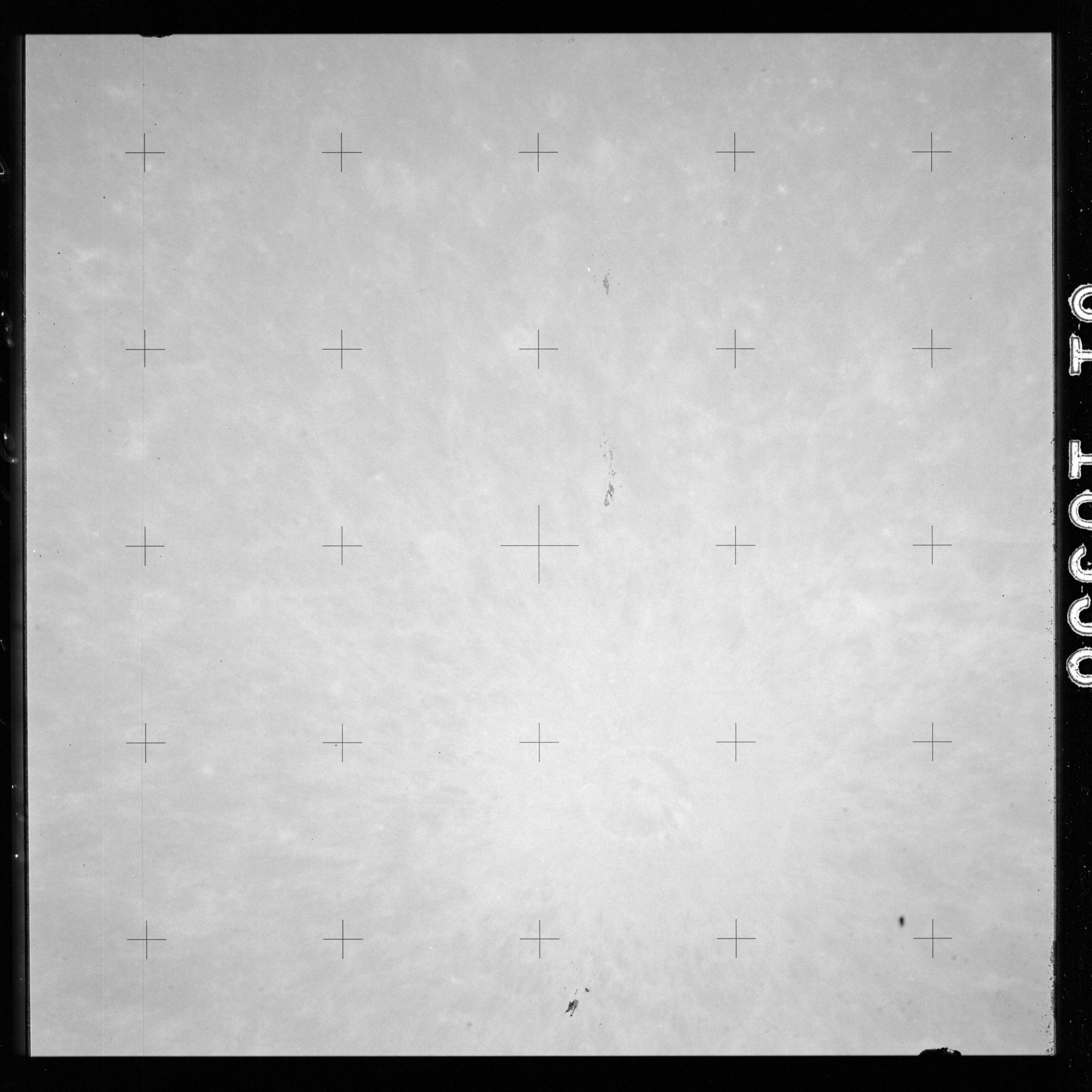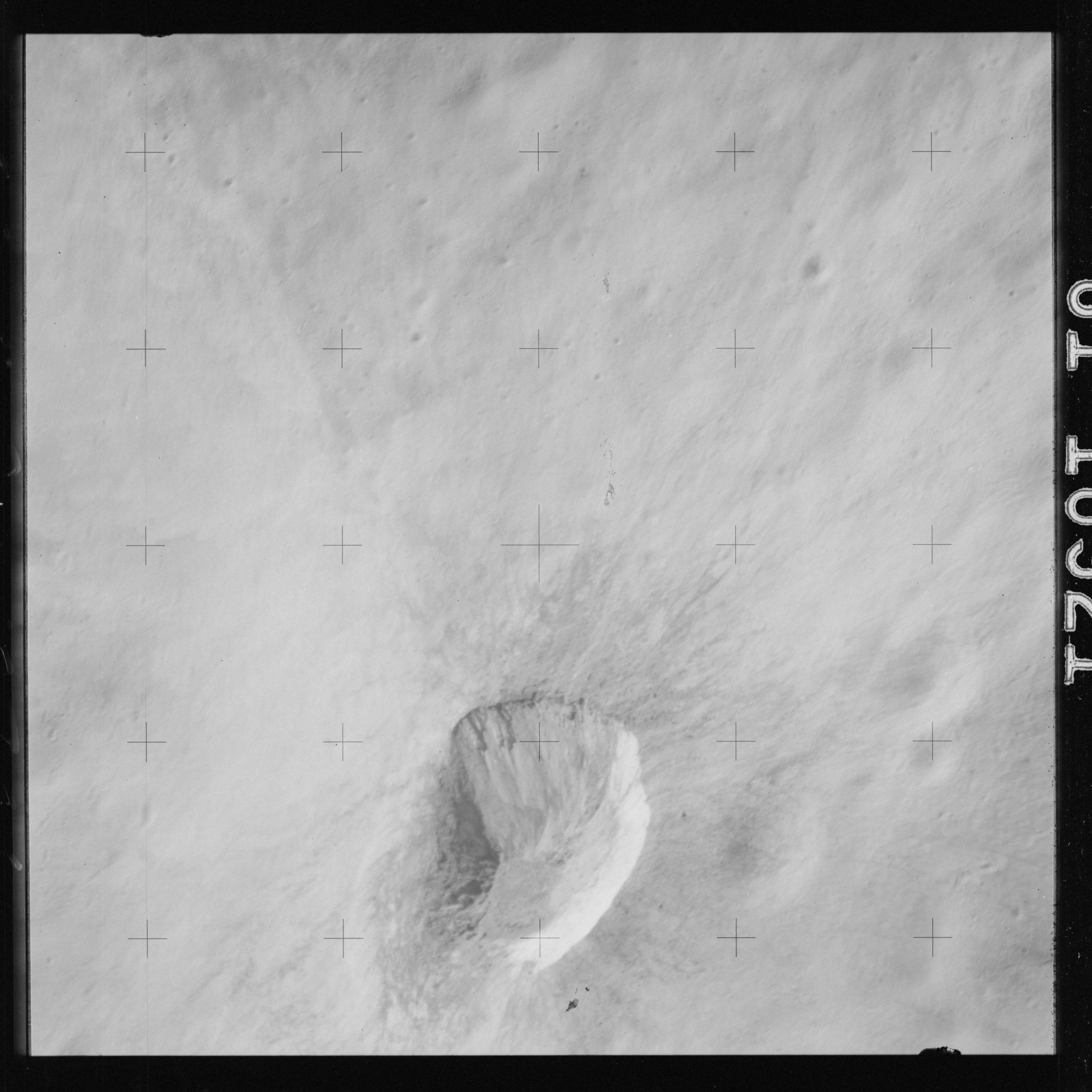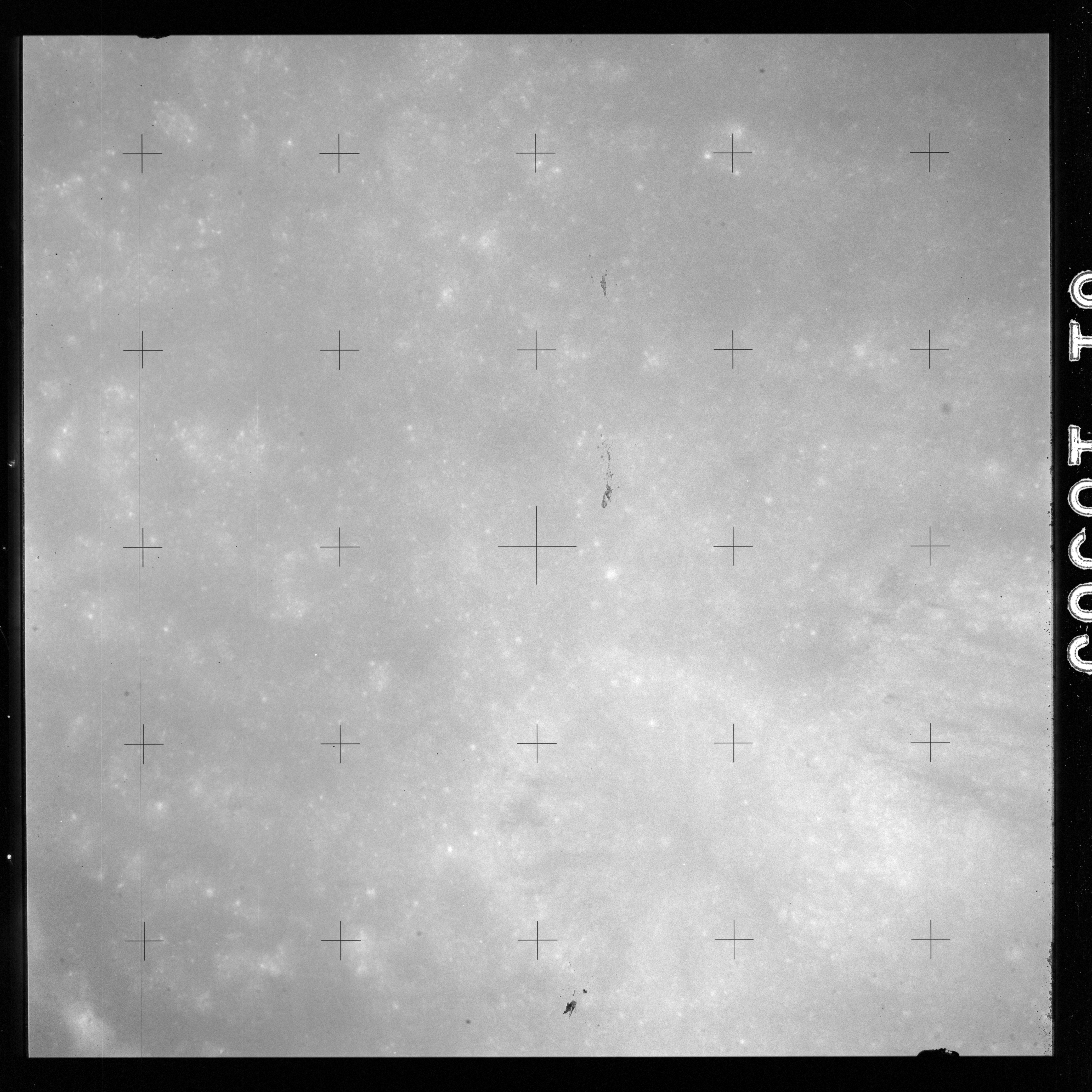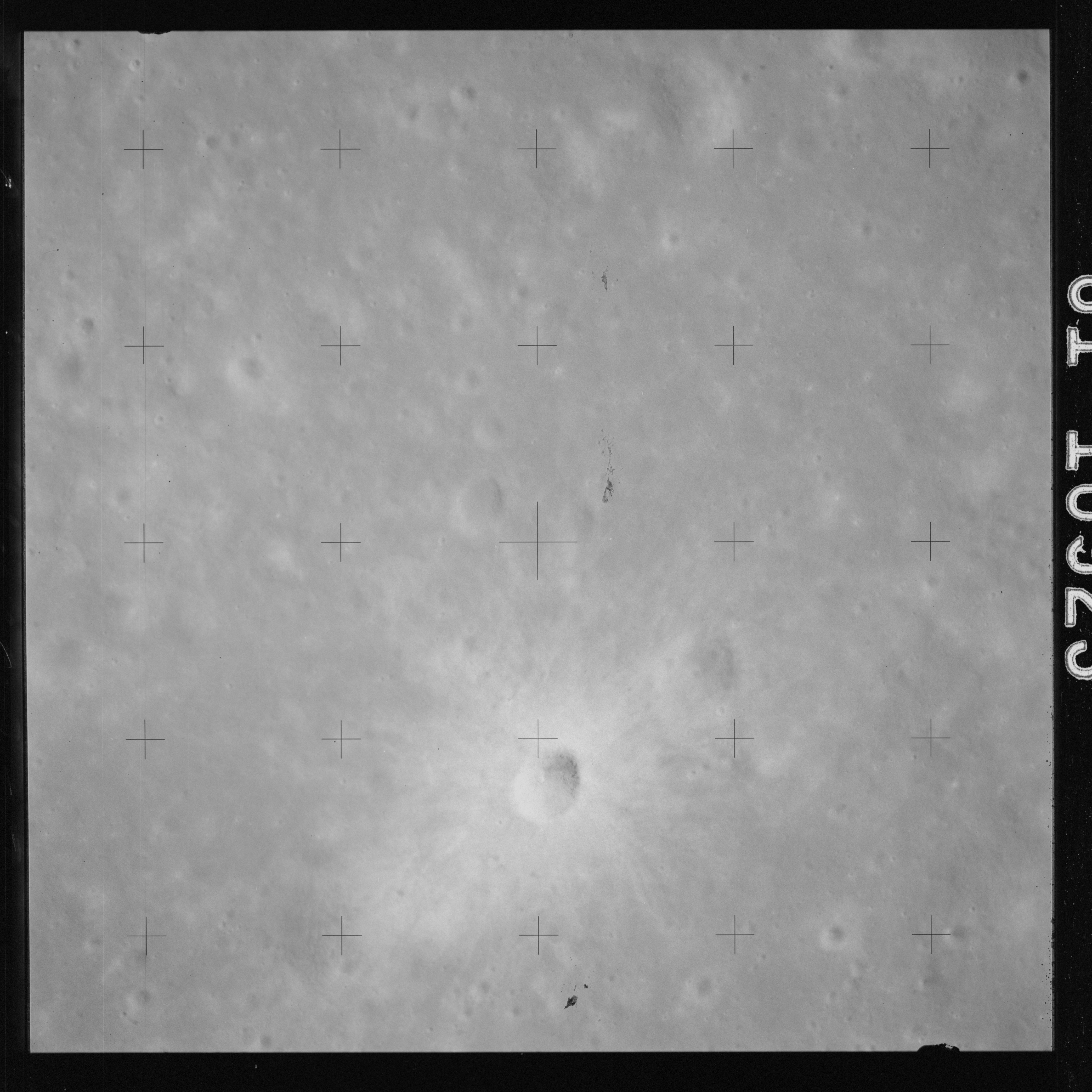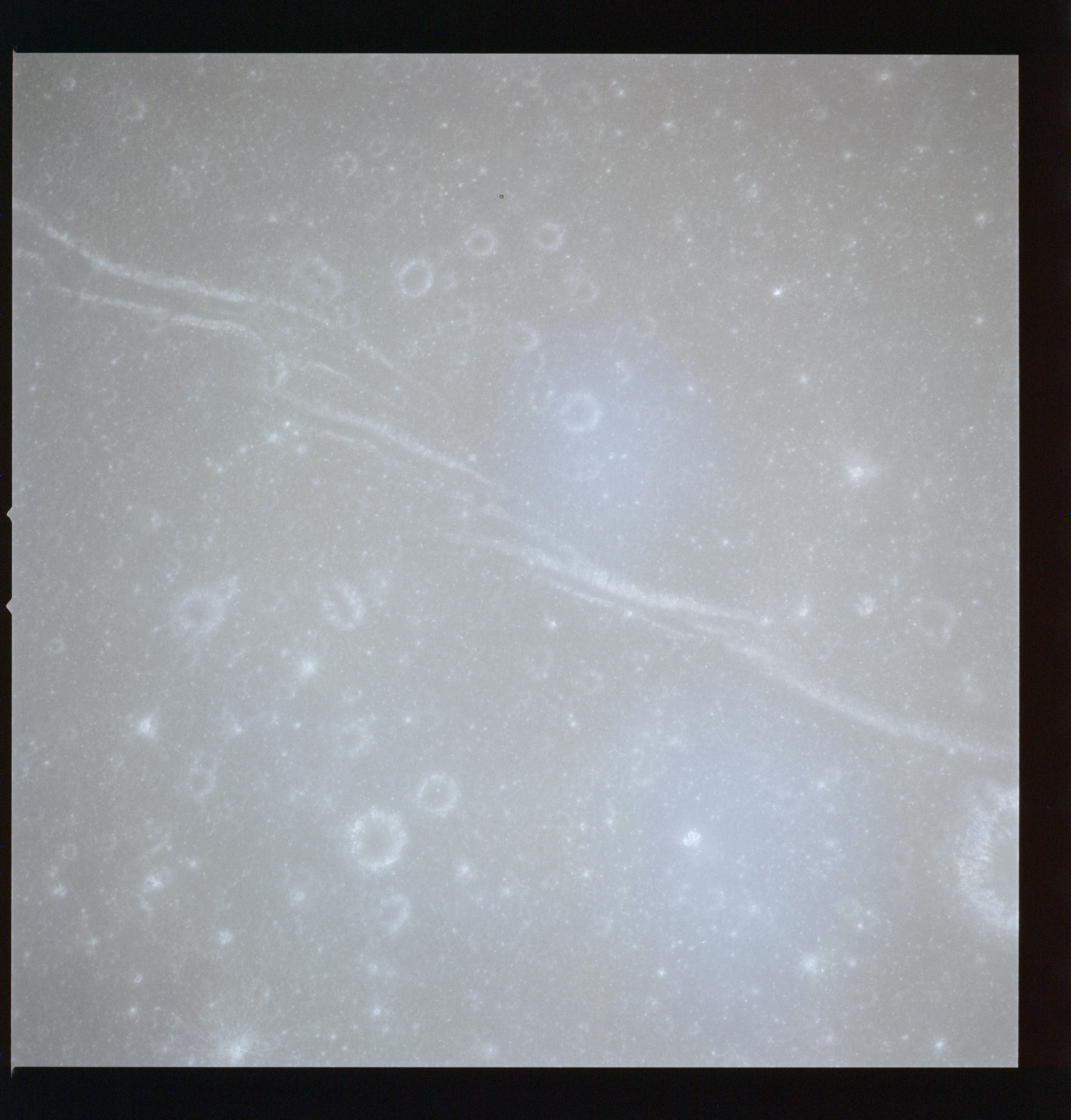 They have two Hasselblad cameras in use. One has a Réseau glass plate fitted which imprints crosses on the photographs for photogrammetry purposes. It has magazine QQ attached loaded with black and white film adn its current lens is a 500-mm telephoto. The other camera has magazine O with colour film (Ektachrome) and a 250-mm medium telephoto lens. It has no Réseau plate fitted. During a sequence of 19 images taken with the latter combination just before AOS, AS15-97-13175 to 13193, they will photograph target number 10 as given in the Flight Plan, the ancient 130-km crater Sklodowska.