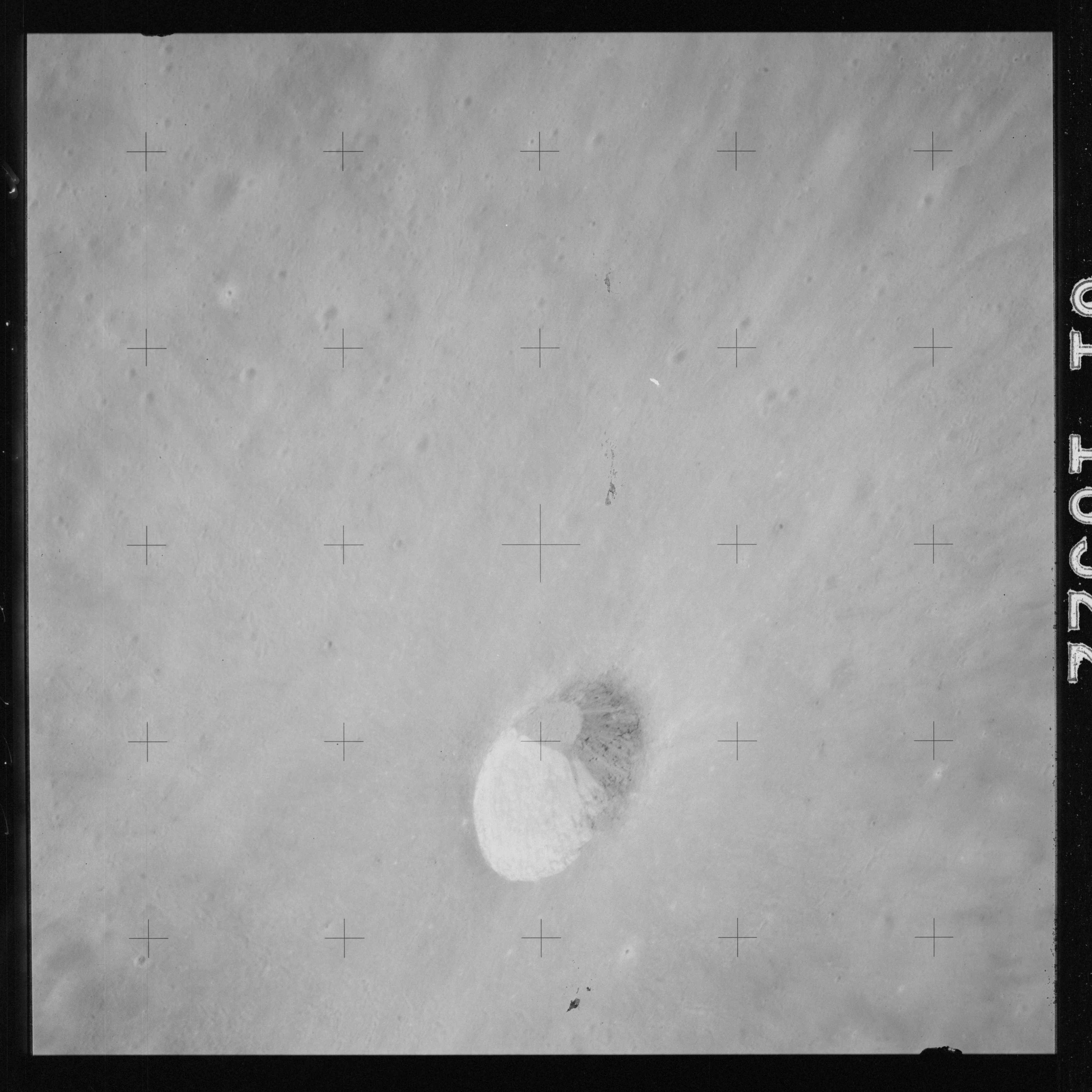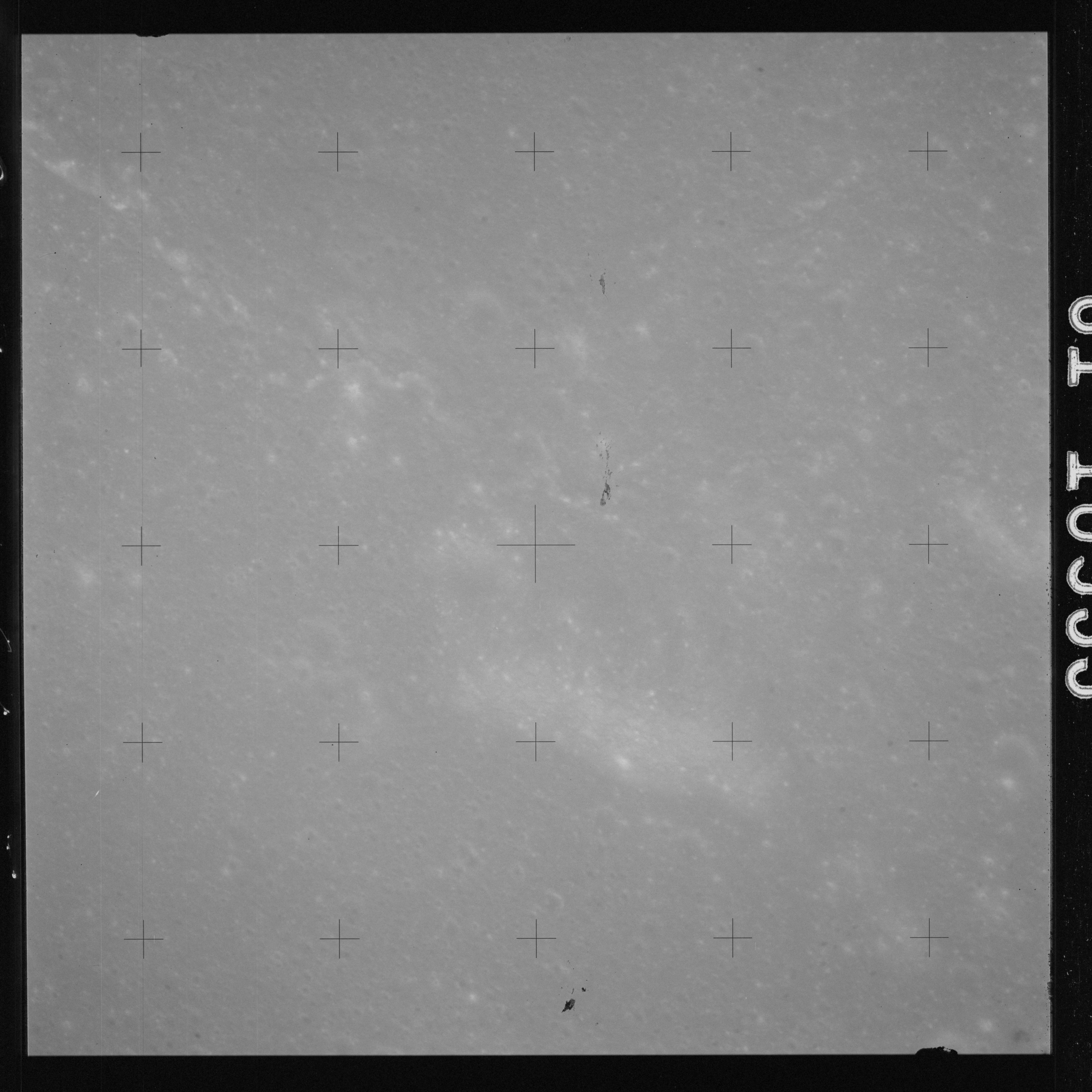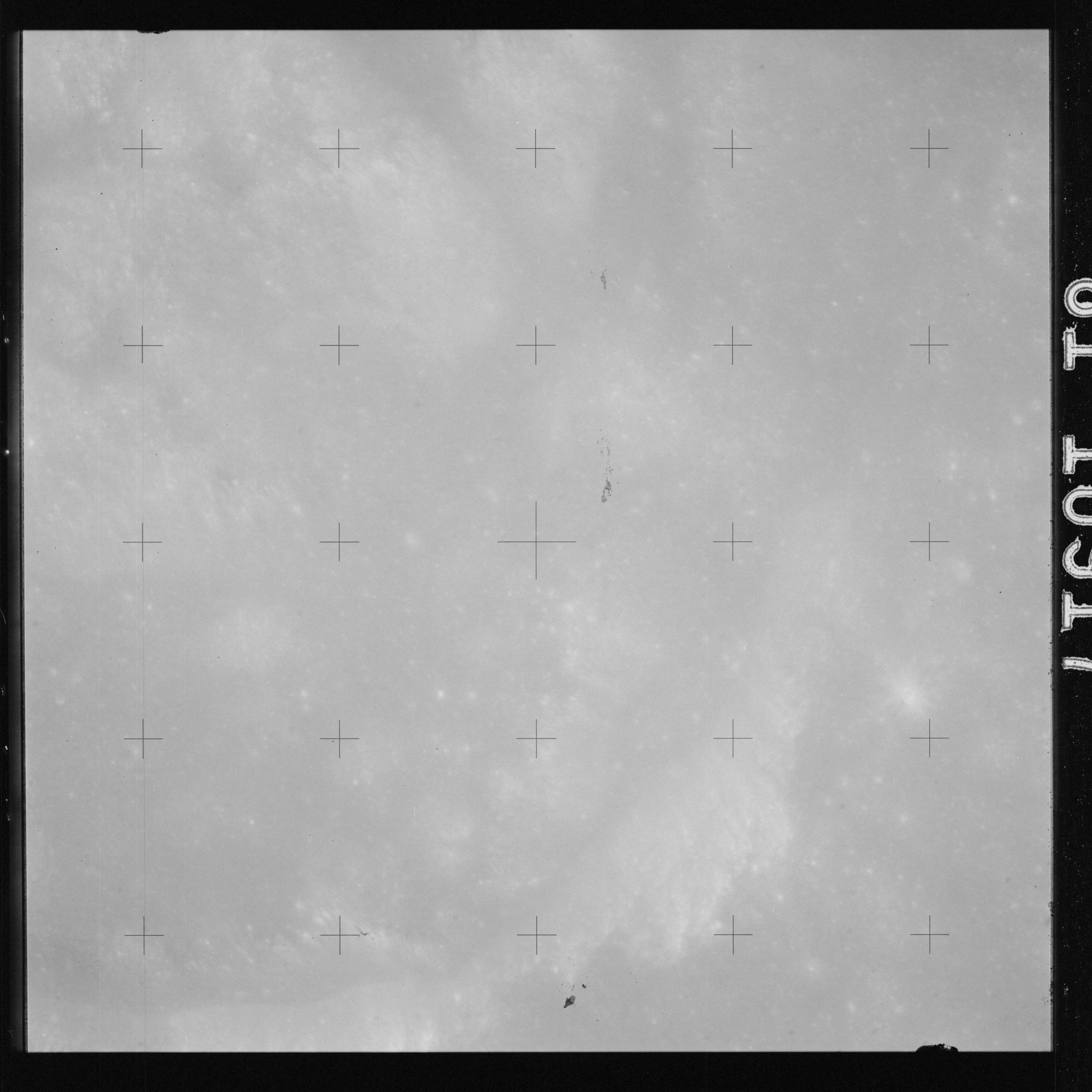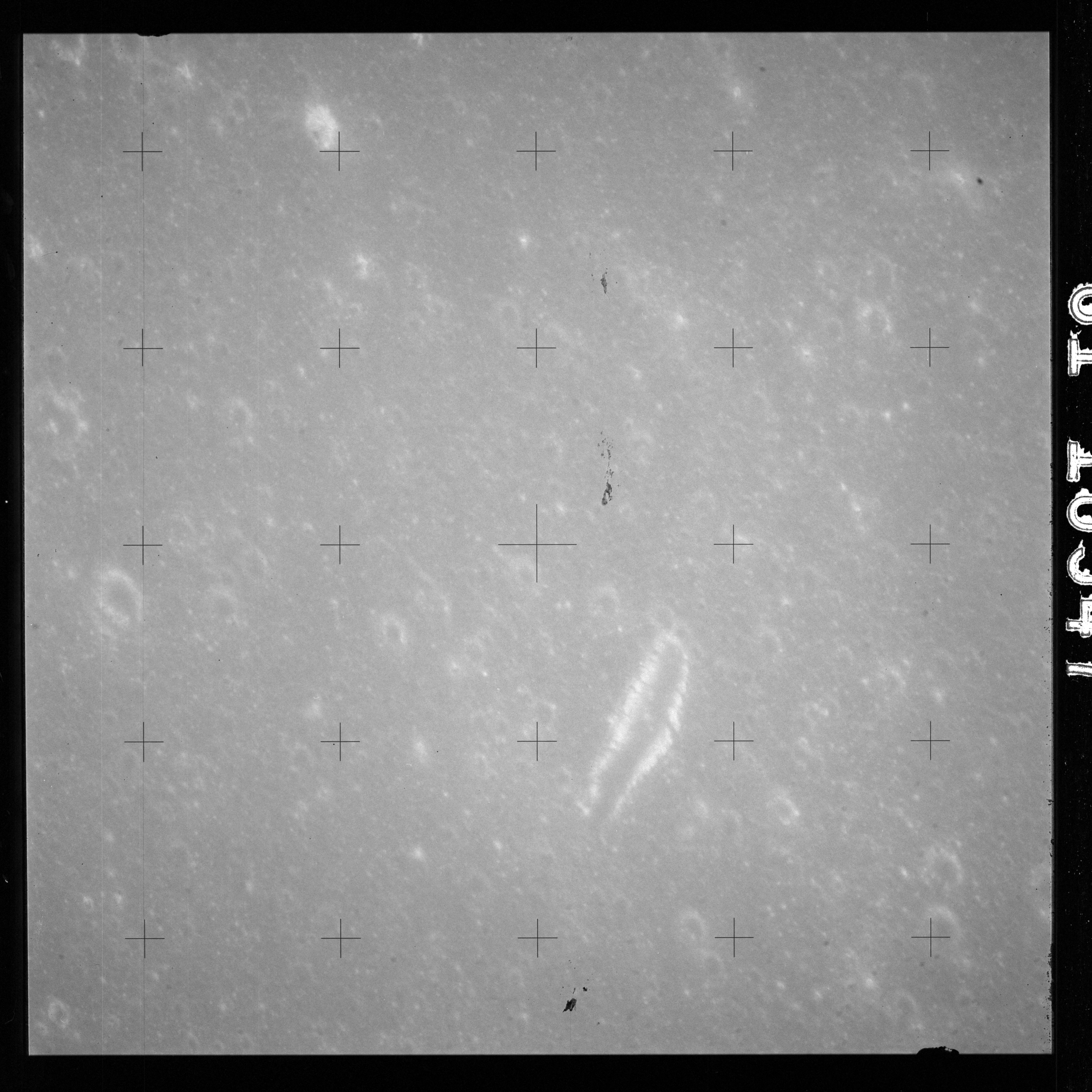 They have two Hasselblad cameras in use. One has a Réseau glass plate fitted which imprints crosses on the photographs for photogrammetry purposes. It has magazine QQ attached loaded with black and white film adn its current lens is a 500-mm telephoto. The other camera has magazine O with colour film (Ektachrome) and a 250-mm medium telephoto lens. It has no Réseau plate fitted. During a sequence of 19 images taken with the latter combination just before AOS, AS15-97-13175 to 13193, they will photograph target number 10 as given in the Flight Plan, the ancient 130-km crater Sklodowska.