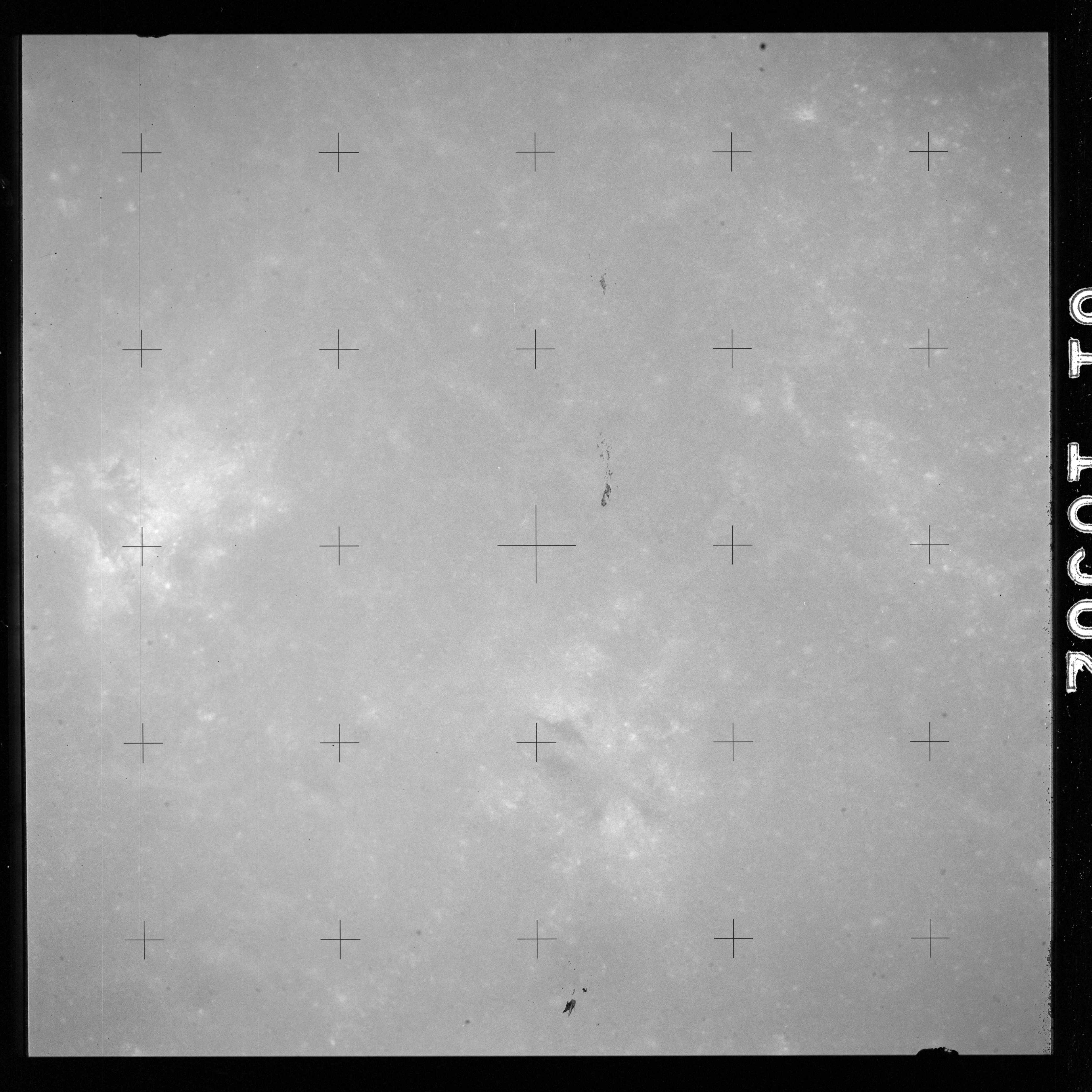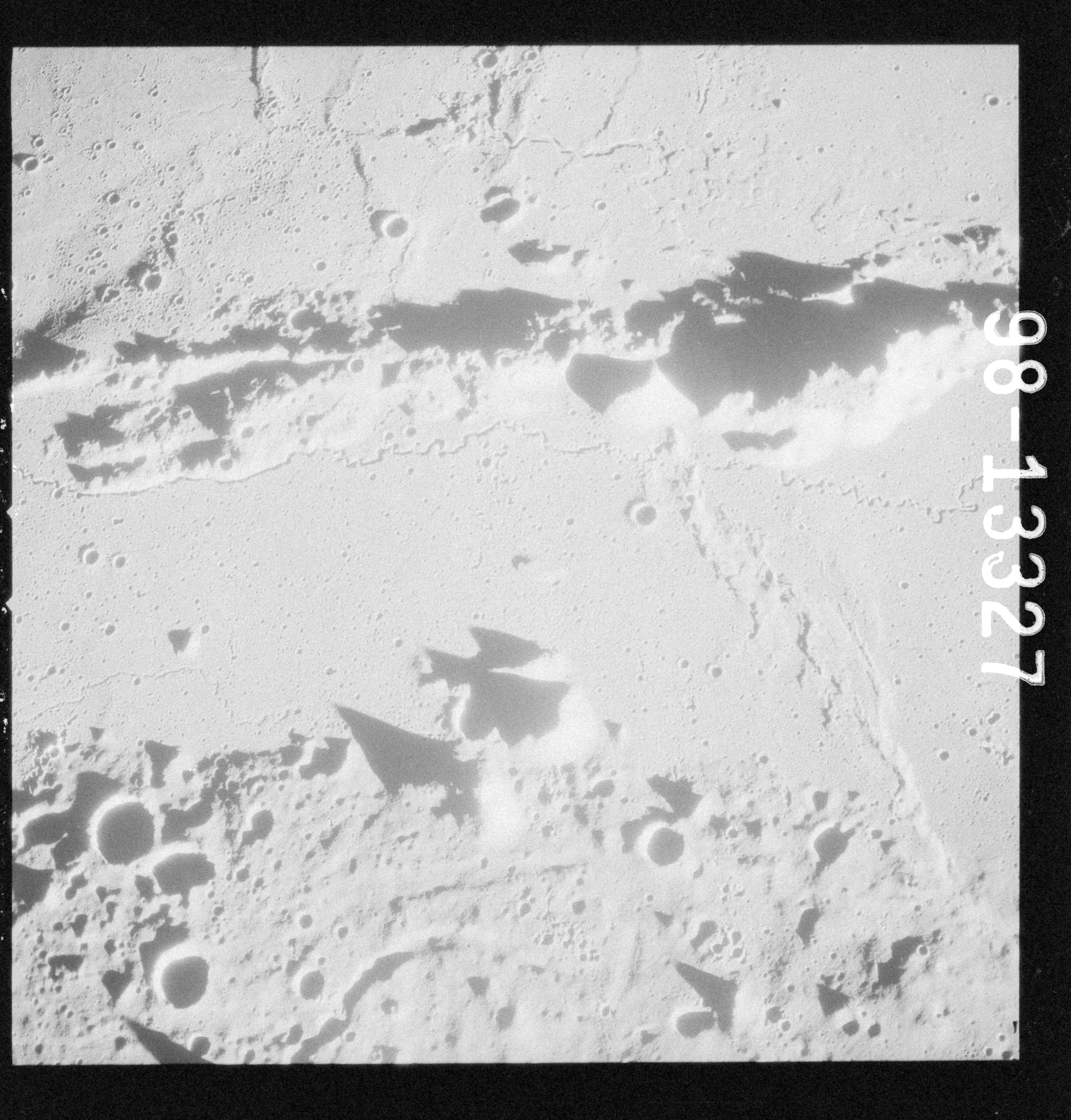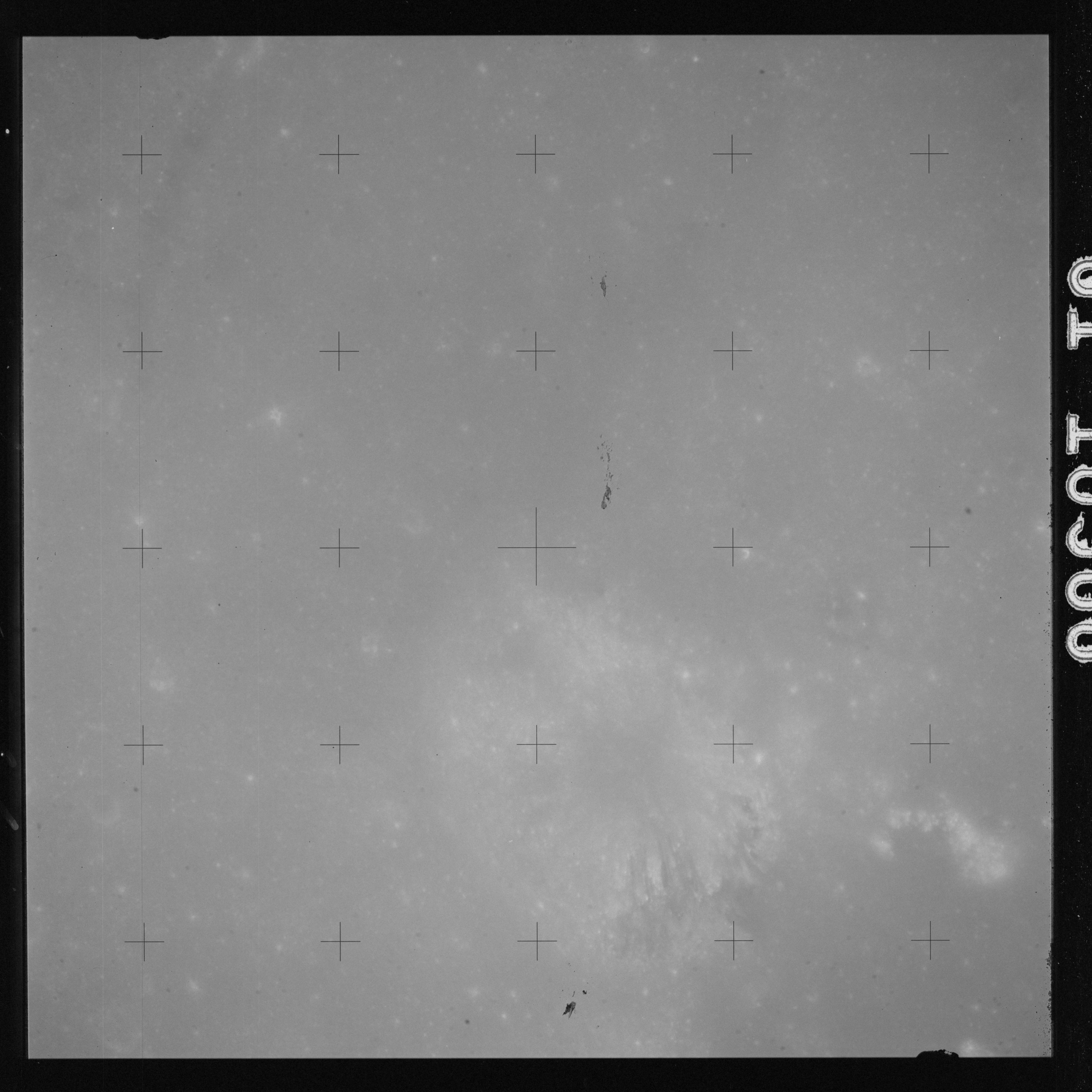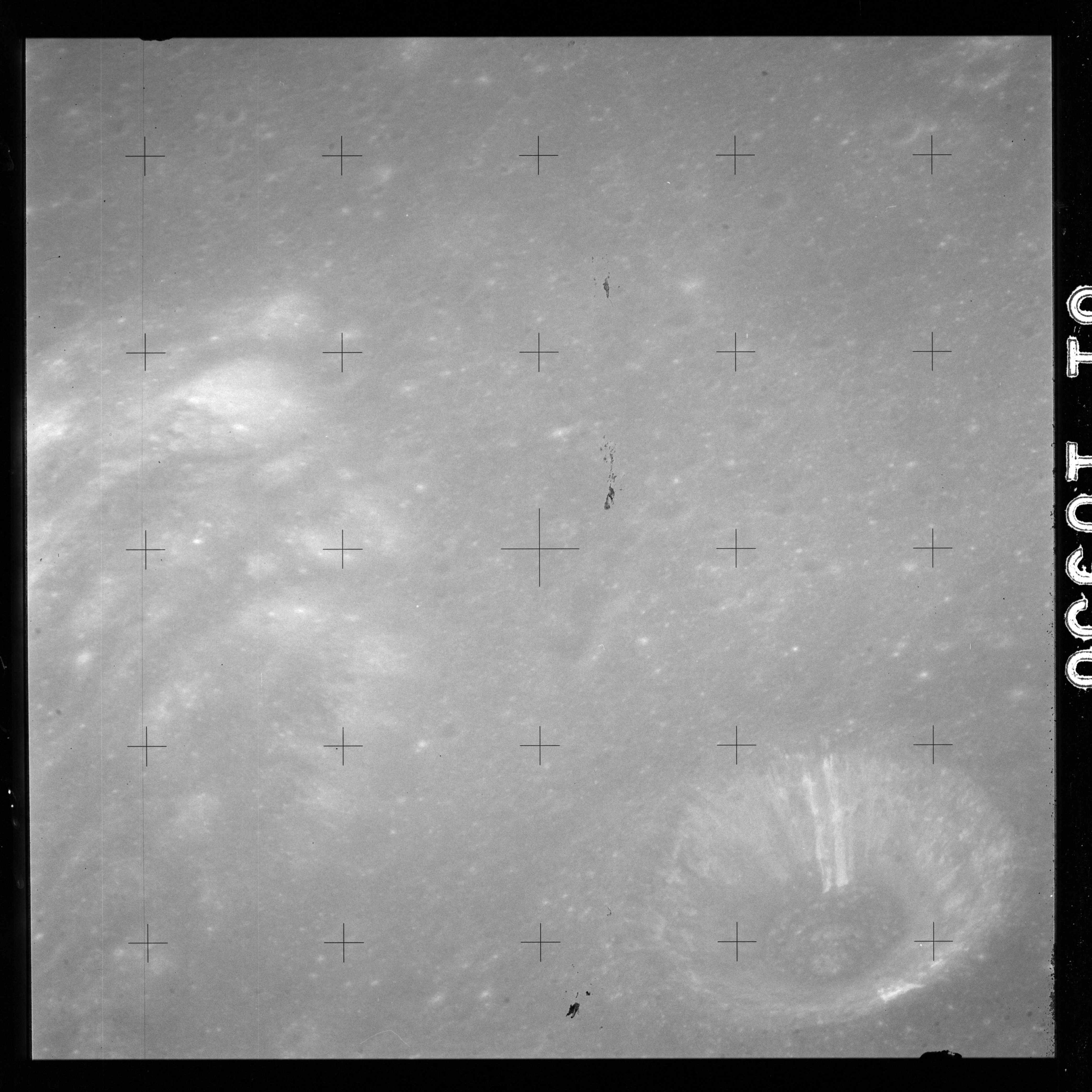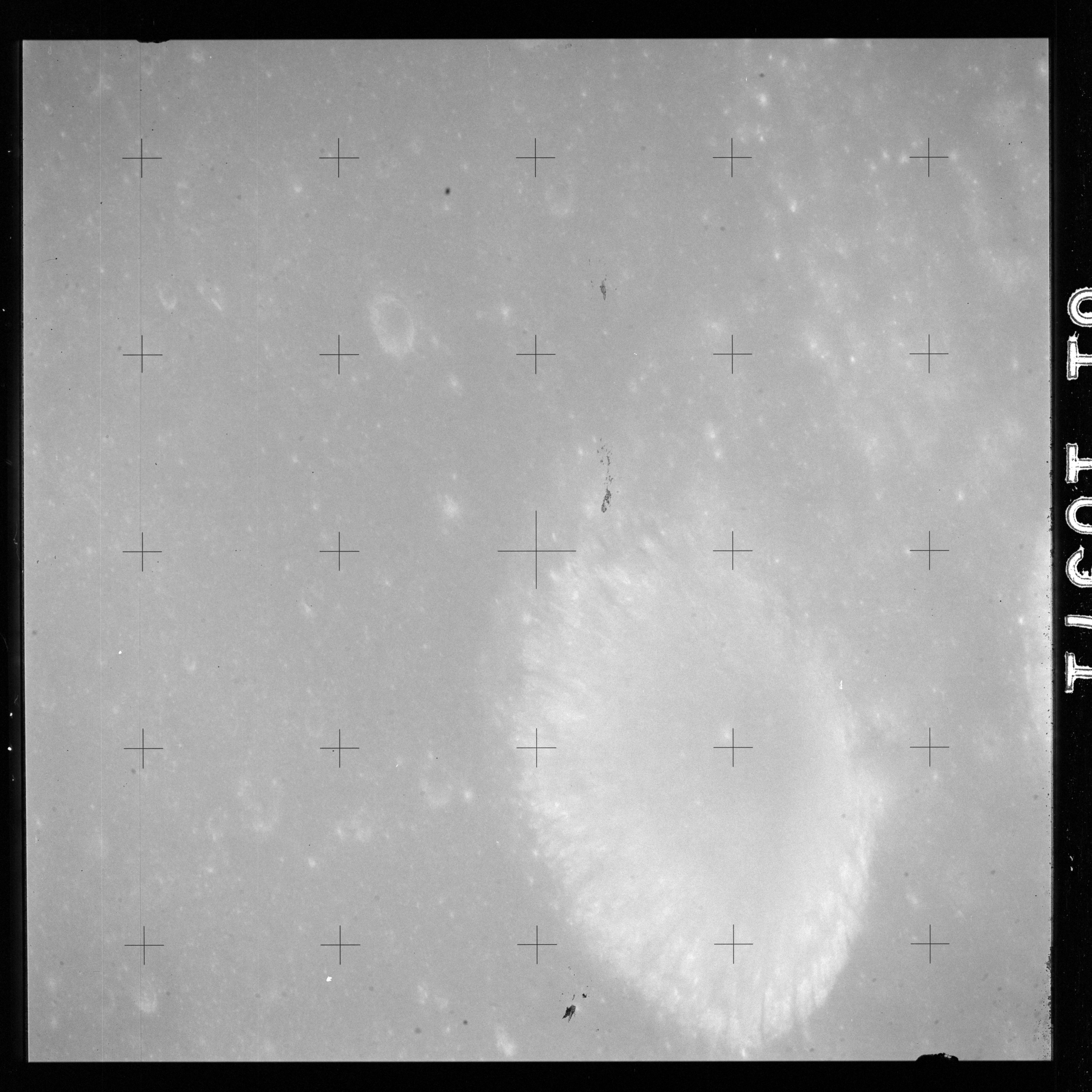 They have two Hasselblad cameras in use. One has a Réseau glass plate fitted which imprints crosses on the photographs for photogrammetry purposes. It has magazine QQ attached loaded with black and white film adn its current lens is a 500-mm telephoto. The other camera has magazine O with colour film (Ektachrome) and a 250-mm medium telephoto lens. It has no Réseau plate fitted. During a sequence of 19 images taken with the latter combination just before AOS, AS15-97-13175 to 13193, they will photograph target number 10 as given in the Flight Plan, the ancient 130-km crater Sklodowska.