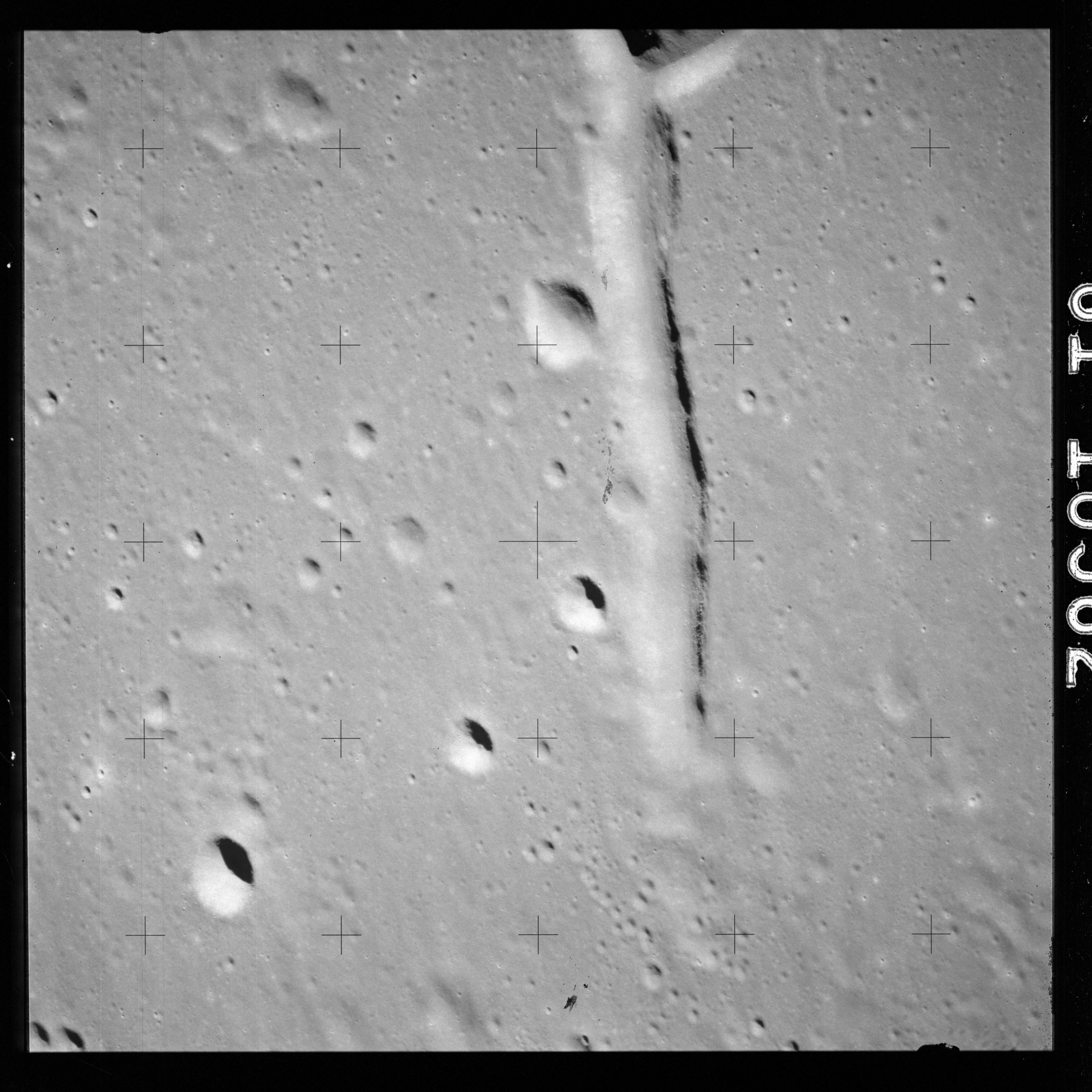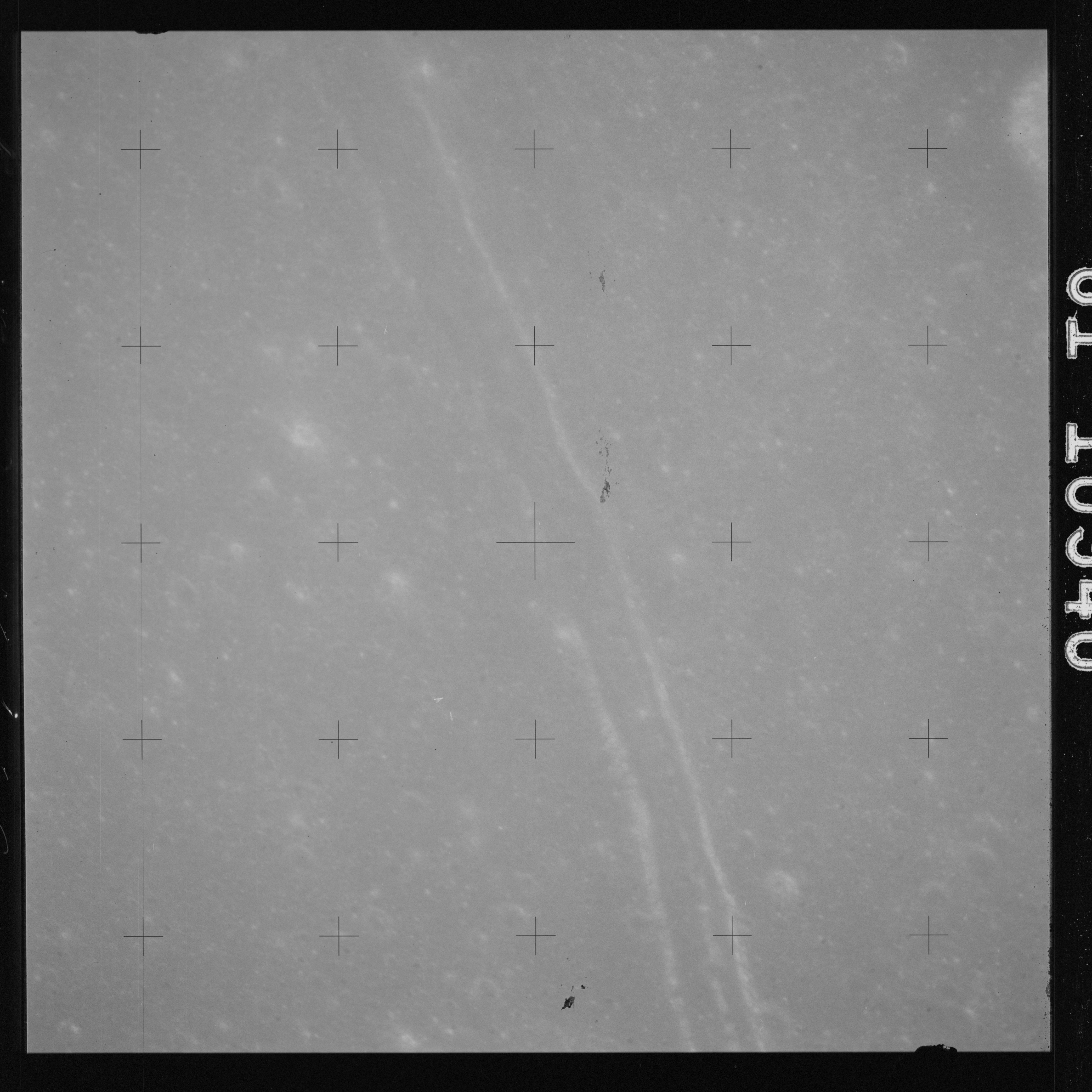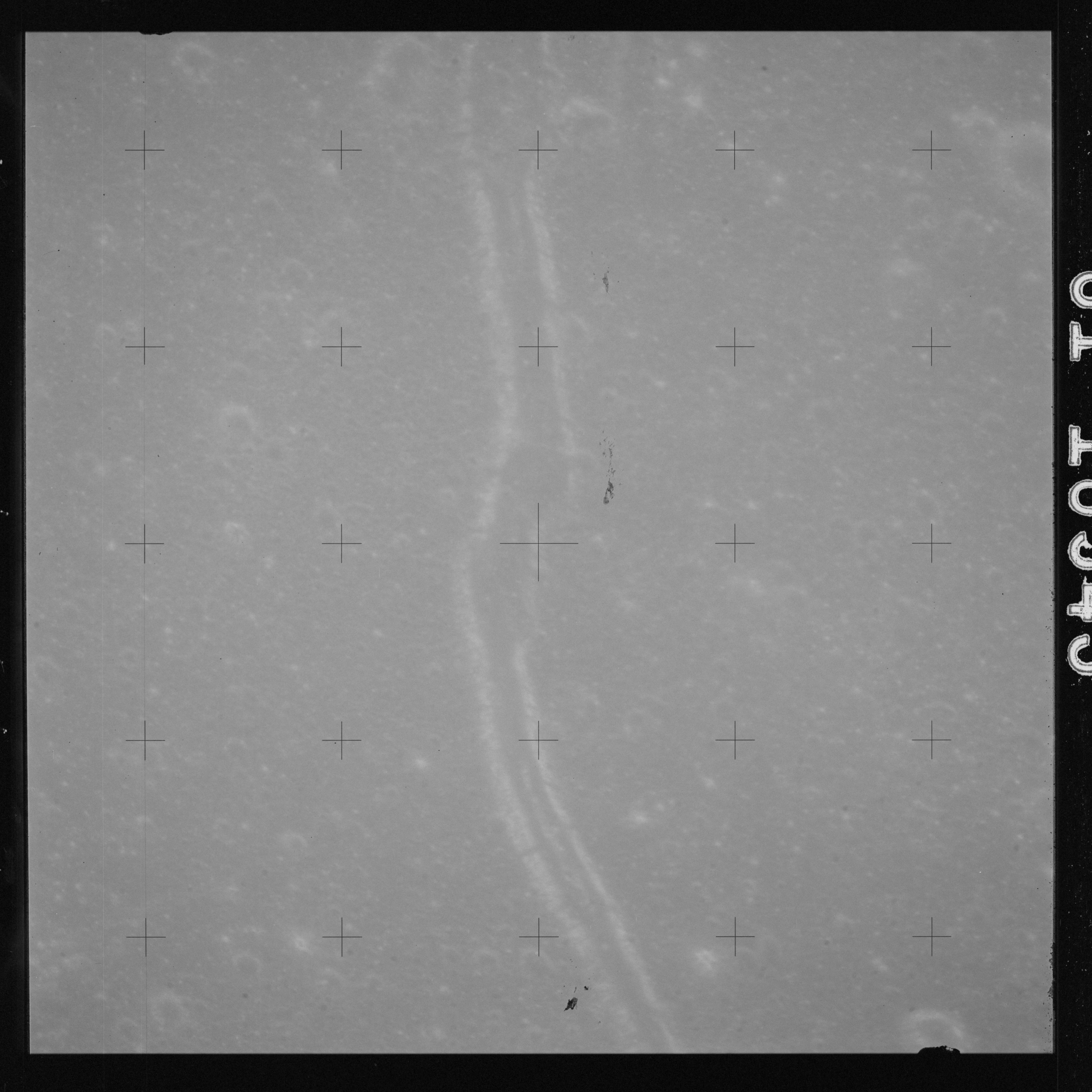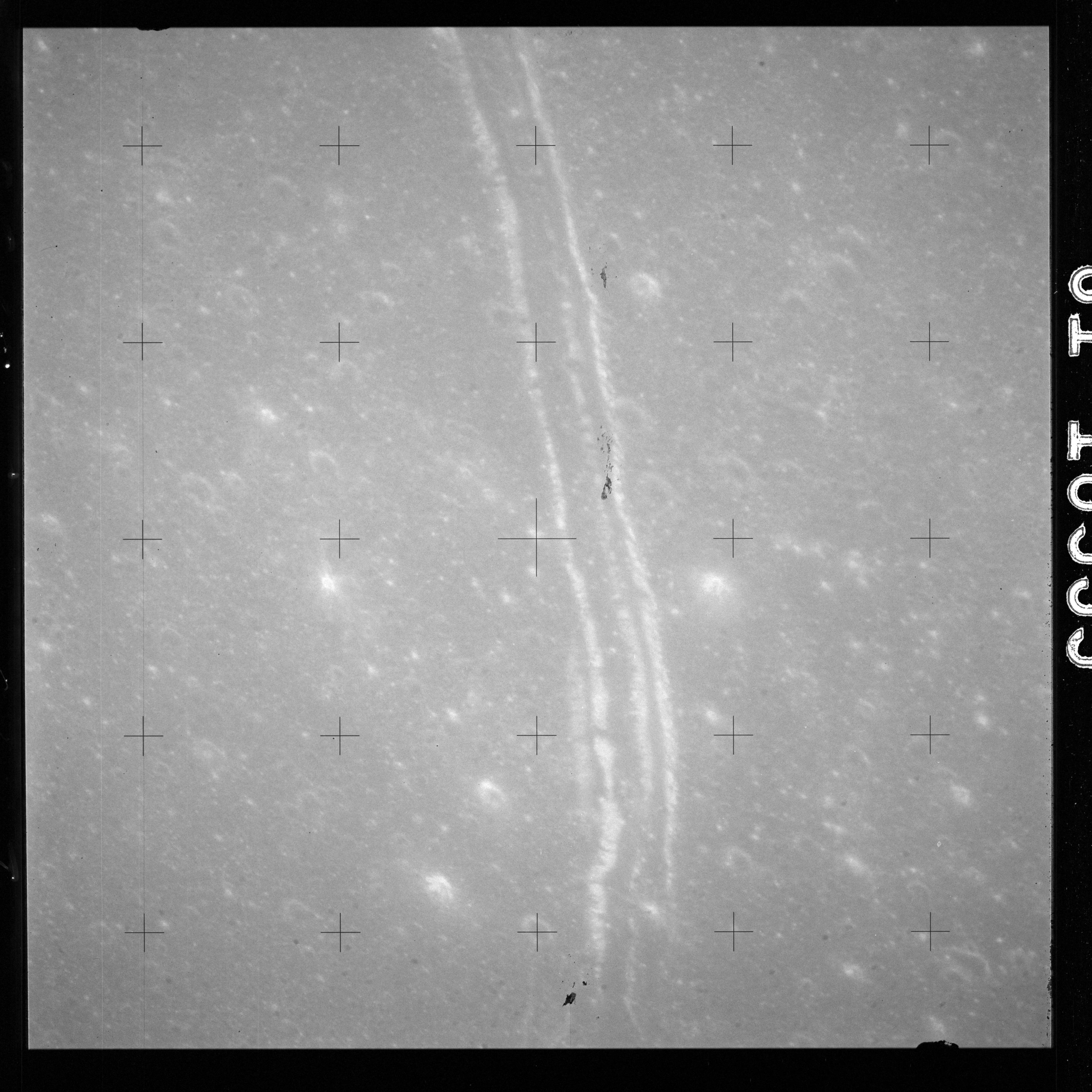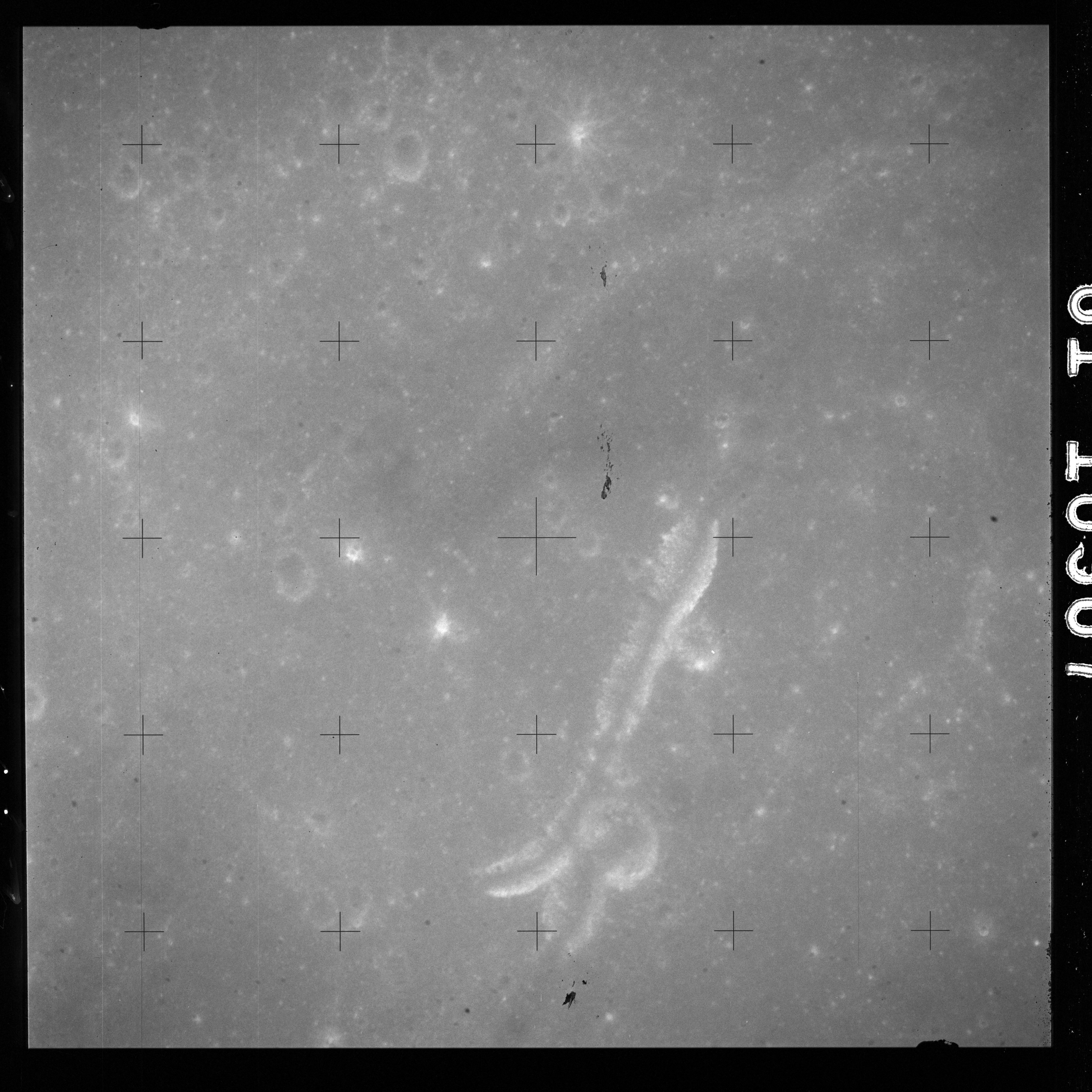 They have two Hasselblad cameras in use. One has a Réseau glass plate fitted which imprints crosses on the photographs for photogrammetry purposes. It has magazine QQ attached loaded with black and white film adn its current lens is a 500-mm telephoto. The other camera has magazine O with colour film (Ektachrome) and a 250-mm medium telephoto lens. It has no Réseau plate fitted. During a sequence of 19 images taken with the latter combination just before AOS, AS15-97-13175 to 13193, they will photograph target number 10 as given in the Flight Plan, the ancient 130-km crater Sklodowska.