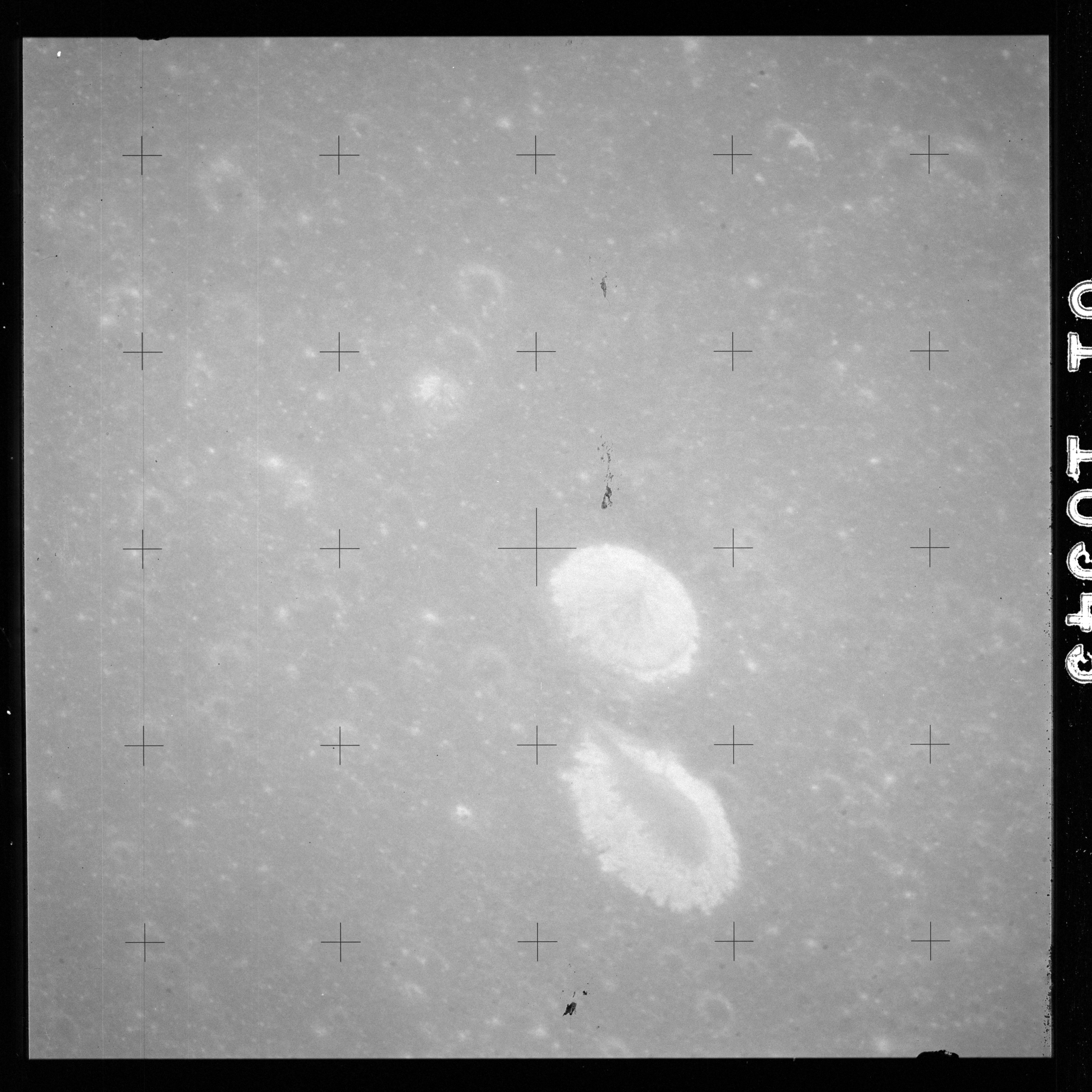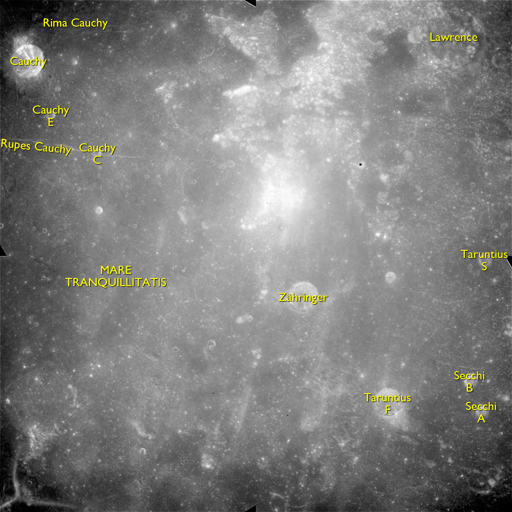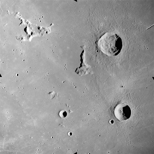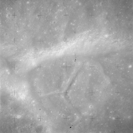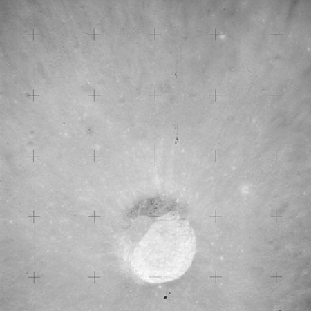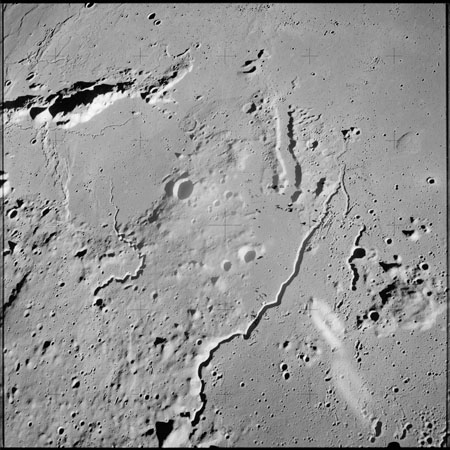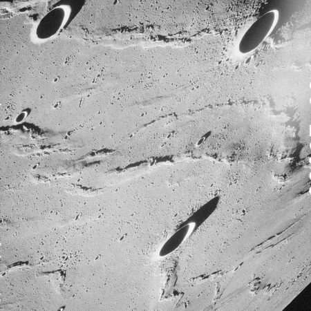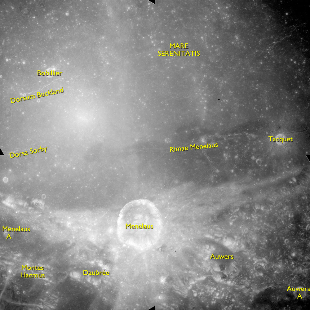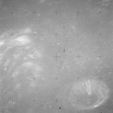 The double rays sprayed across the mare surface radiate from a well-known pair of craters, the Messier Twins, named after the French astronomer, Charles Messier, 1730-1817, whose catalogue of fuzzy objects in the night sky has made his name synonymous with galaxies, nebulae and the amateur astronomer's desire to view as many of them as possible. The crater pair, actually known as Messier and Messier A, are very unusual in that both are quite oval in shape with their long axes aligned with each other and with the striking double ray seen in this photograph. It is almost certain that they originated in a most unusual, highly oblique impact, probably of a small double asteroid. It is known that a substantial number of asteroids are to be found in loose formation with one another, gently orbiting around their common centre-of-gravity. Left of centre and outlined in a light colour is Lubbock, a 14.5-km crater named after John Lubbock, 1803-1865, an English mathematician.