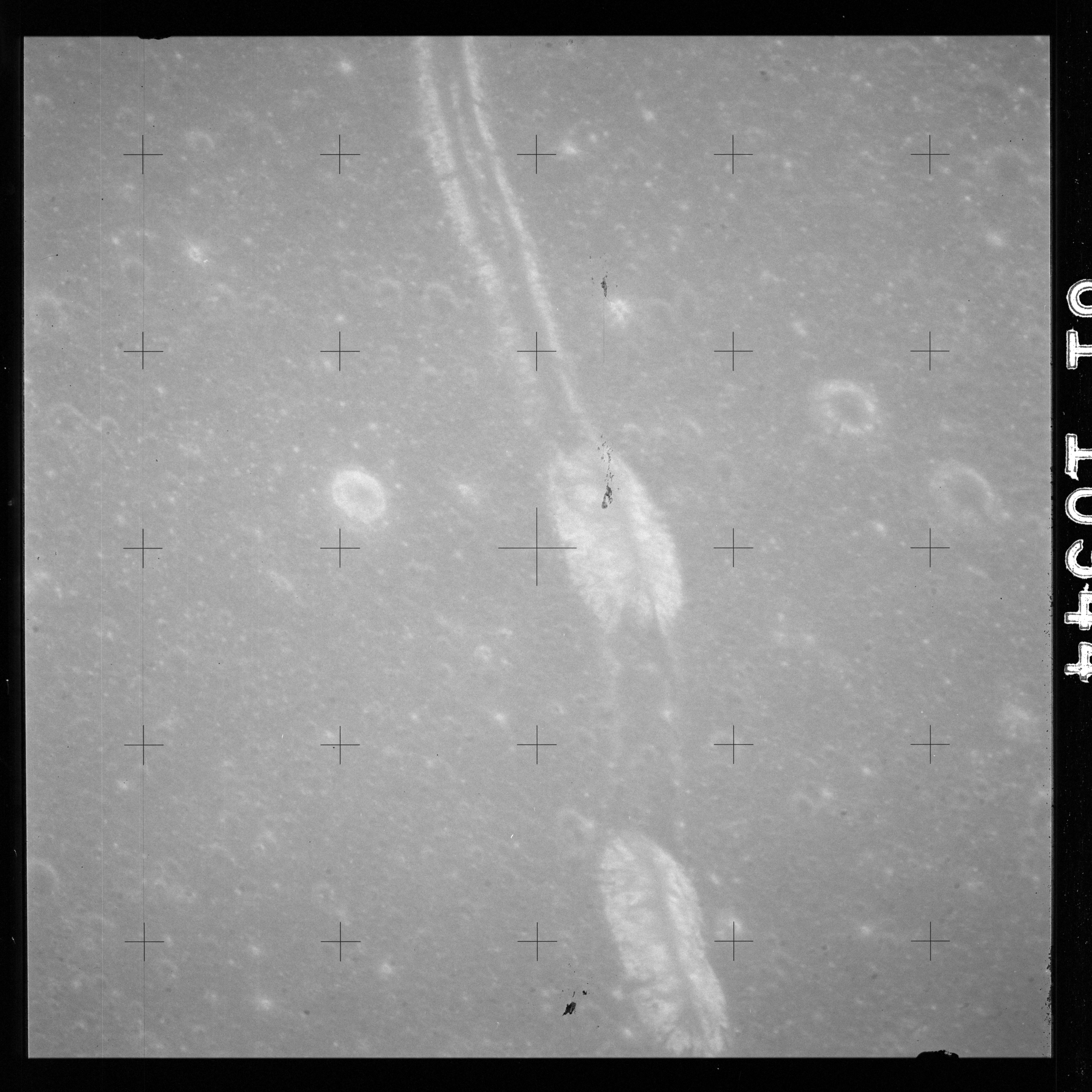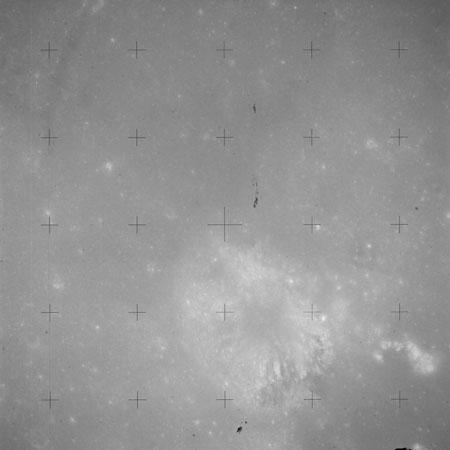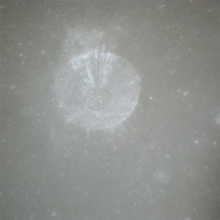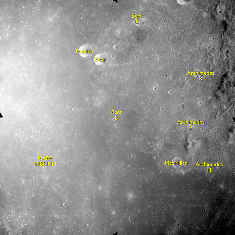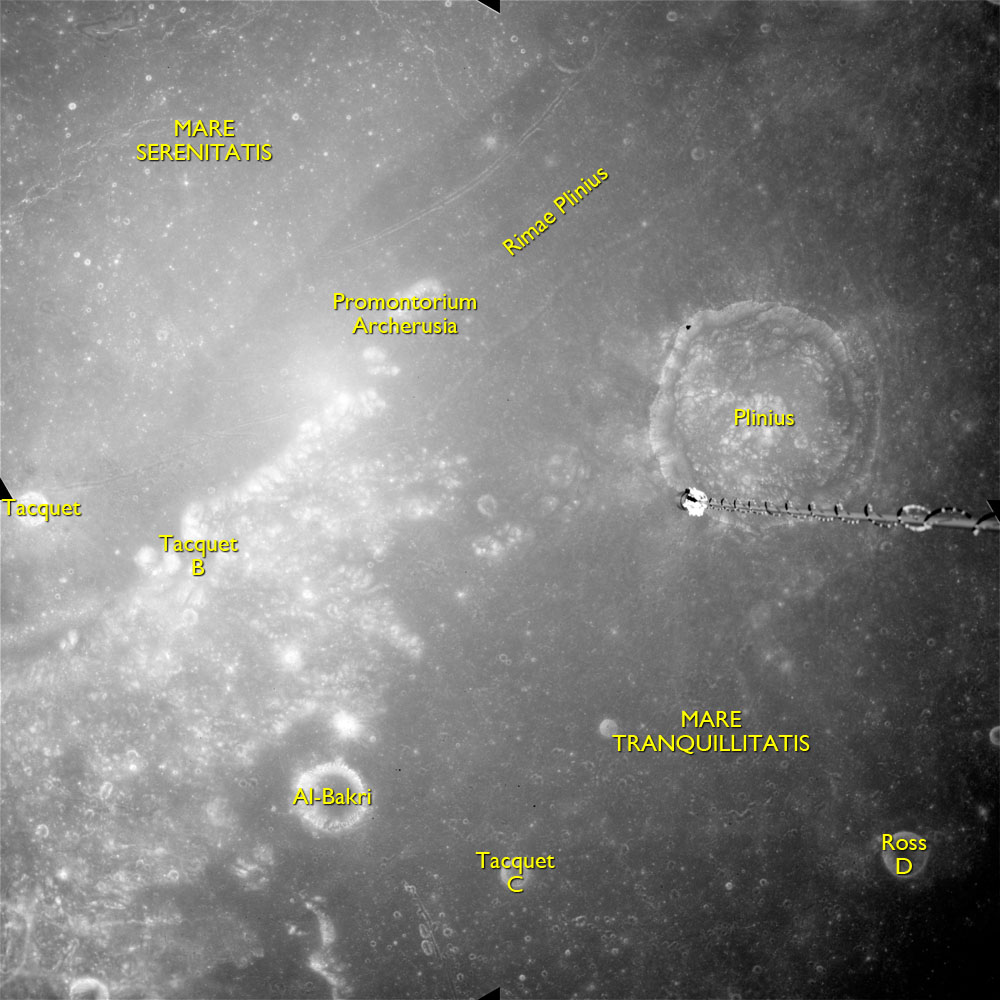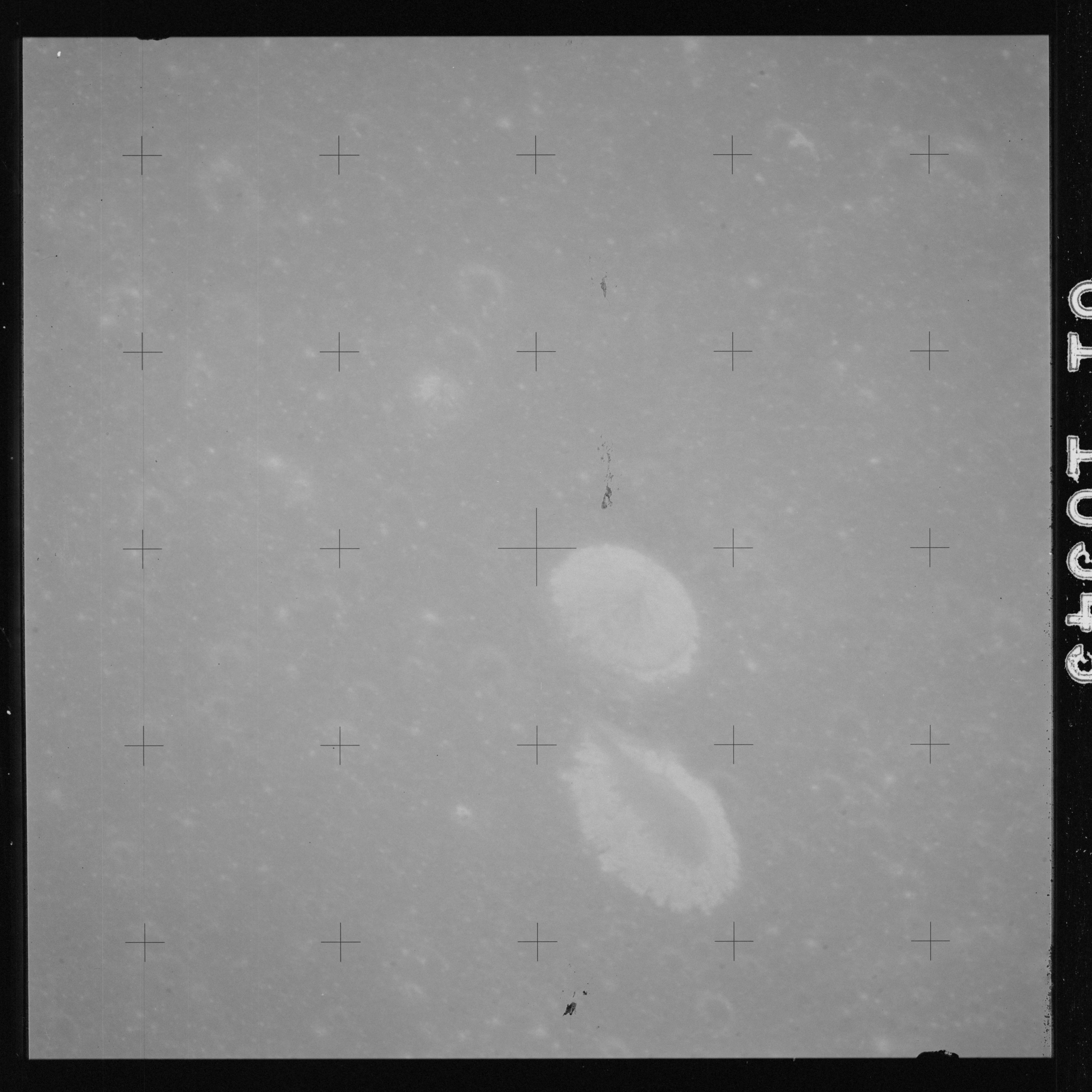 The double rays sprayed across the mare surface radiate from a well-known pair of craters, the Messier Twins, named after the French astronomer, Charles Messier, 1730-1817, whose catalogue of fuzzy objects in the night sky has made his name synonymous with galaxies, nebulae and the amateur astronomer's desire to view as many of them as possible. The crater pair, actually known as Messier and Messier A, are very unusual in that both are quite oval in shape with their long axes aligned with each other and with the striking double ray seen in this photograph. It is almost certain that they originated in a most unusual, highly oblique impact, probably of a small double asteroid. It is known that a substantial number of asteroids are to be found in loose formation with one another, gently orbiting around their common centre-of-gravity. Left of centre and outlined in a light colour is Lubbock, a 14.5-km crater named after John Lubbock, 1803-1865, an English mathematician.
