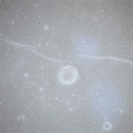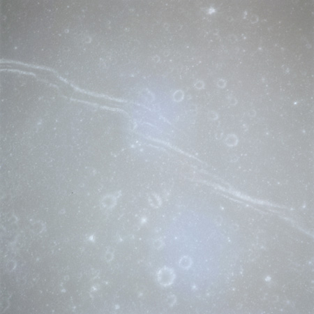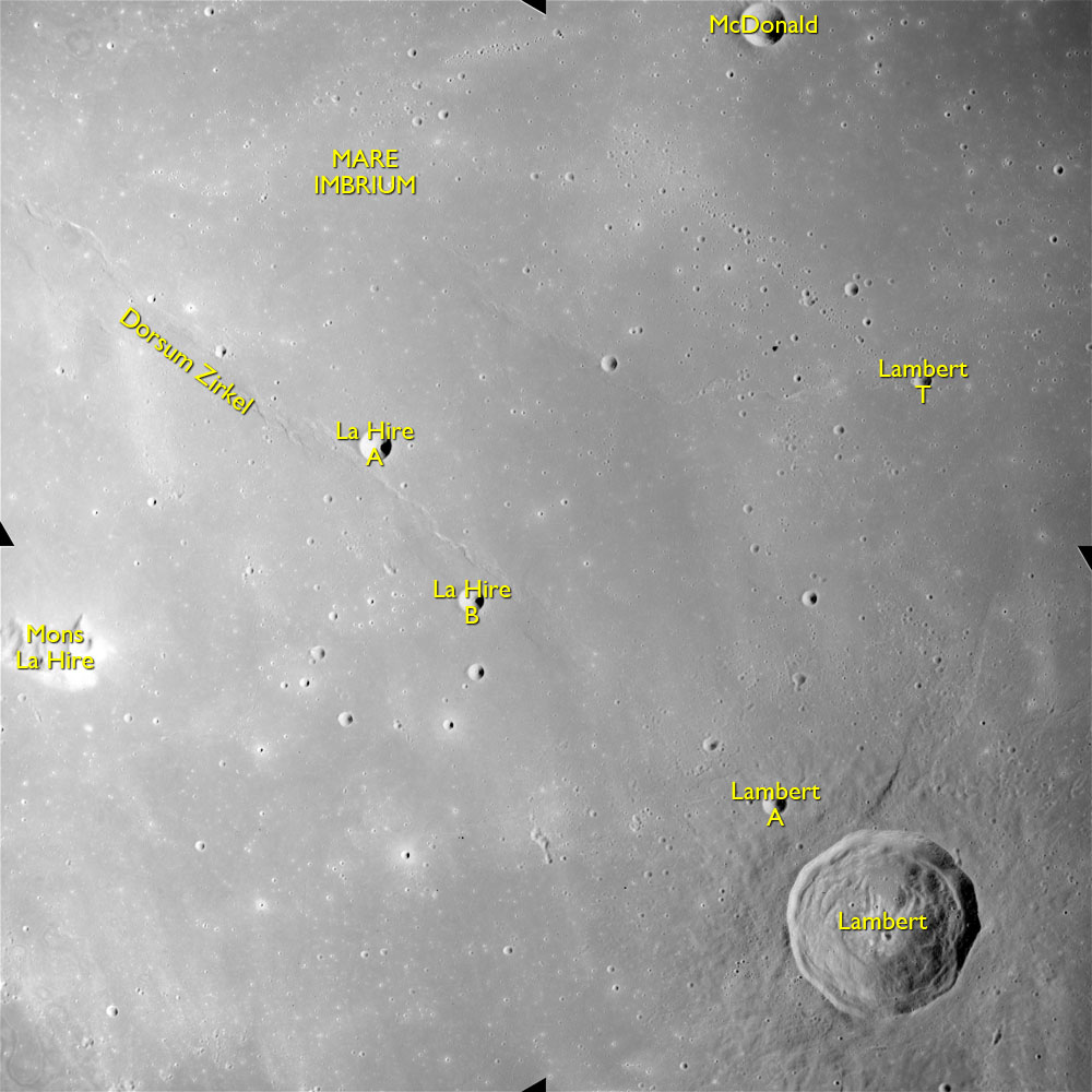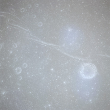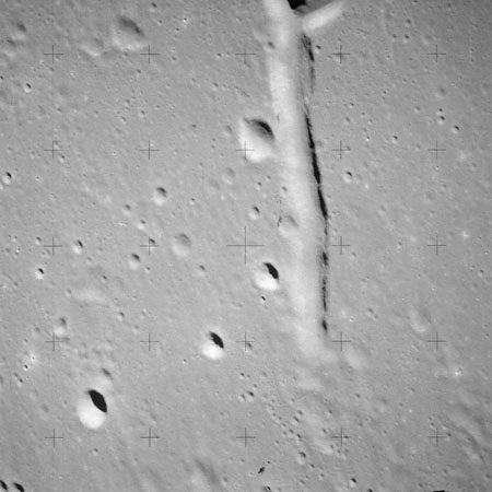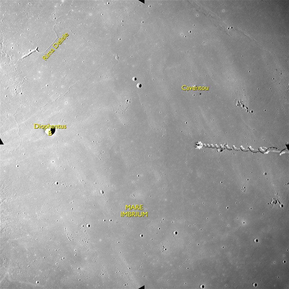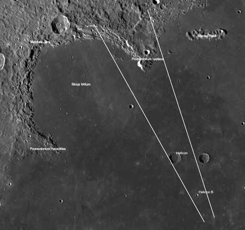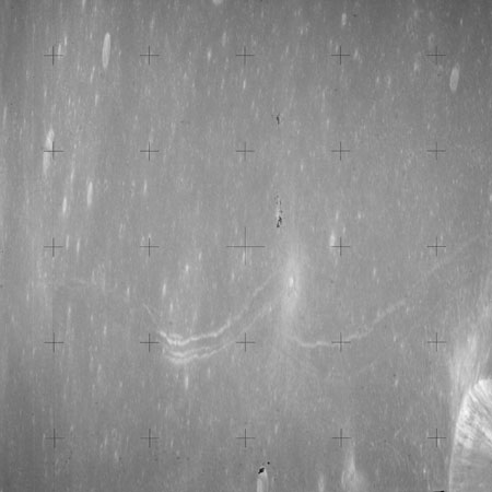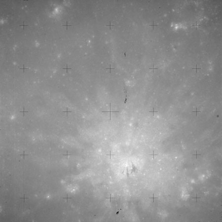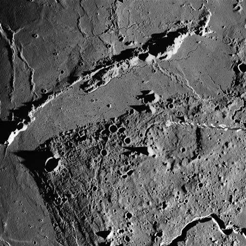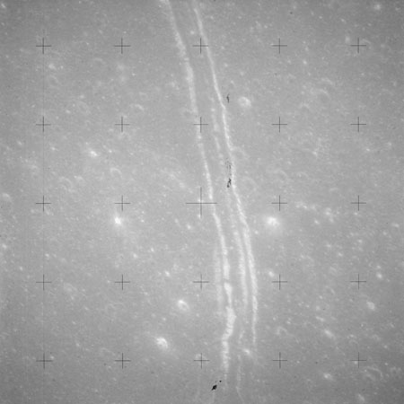 The double rays sprayed across the mare surface radiate from a well-known pair of craters, the Messier Twins, named after the French astronomer, Charles Messier, 1730-1817, whose catalogue of fuzzy objects in the night sky has made his name synonymous with galaxies, nebulae and the amateur astronomer's desire to view as many of them as possible. The crater pair, actually known as Messier and Messier A, are very unusual in that both are quite oval in shape with their long axes aligned with each other and with the striking double ray seen in this photograph. It is almost certain that they originated in a most unusual, highly oblique impact, probably of a small double asteroid. It is known that a substantial number of asteroids are to be found in loose formation with one another, gently orbiting around their common centre-of-gravity. Left of centre and outlined in a light colour is Lubbock, a 14.5-km crater named after John Lubbock, 1803-1865, an English mathematician.