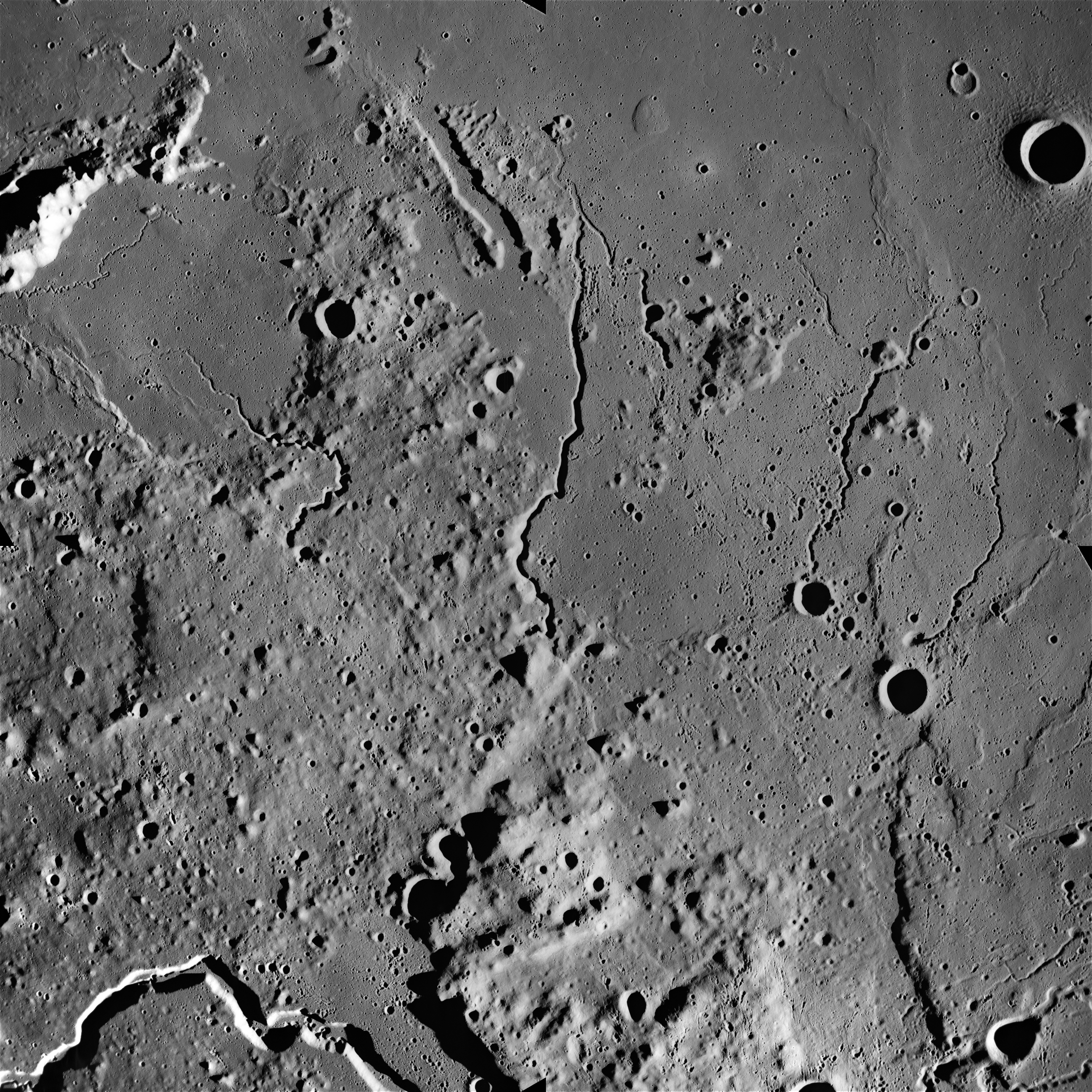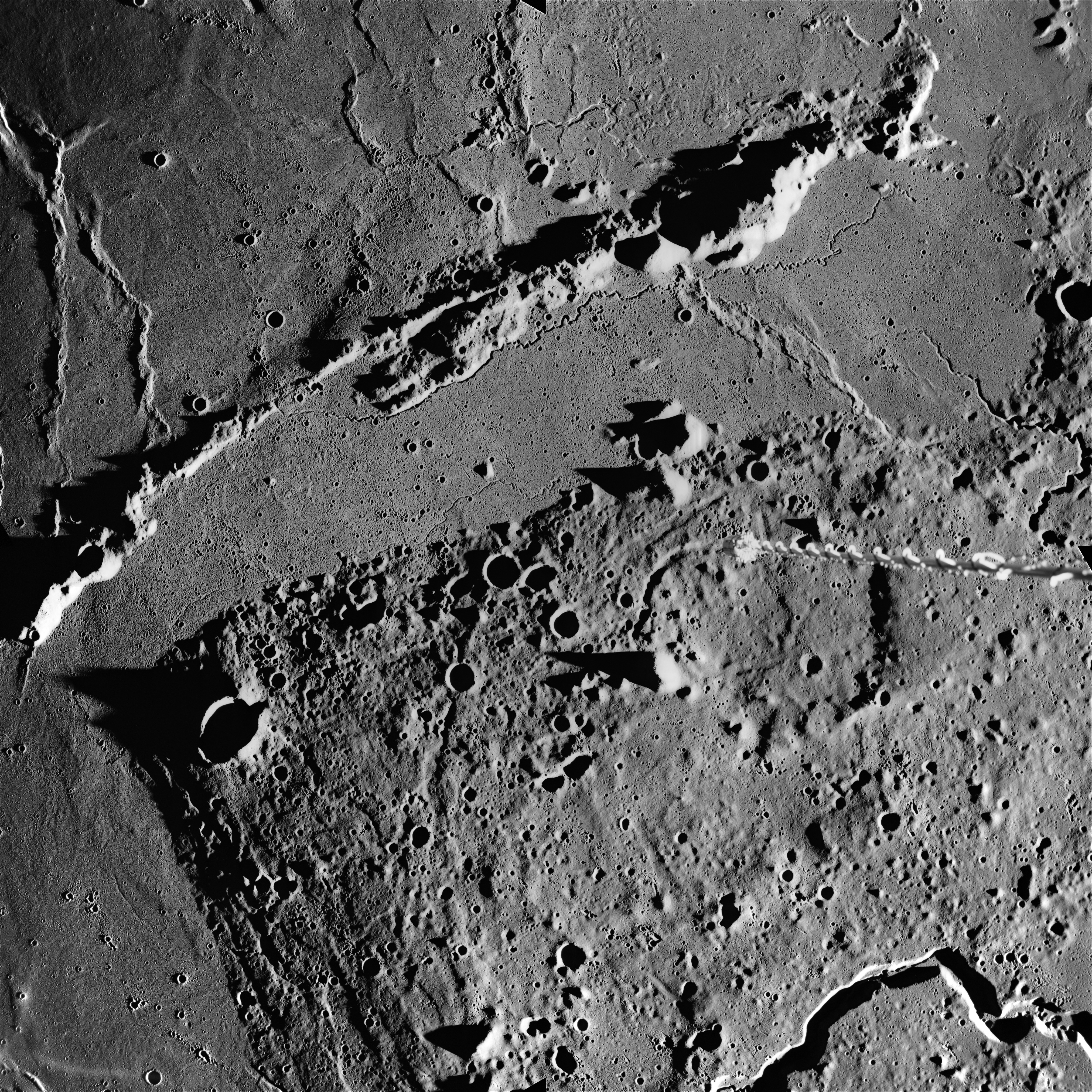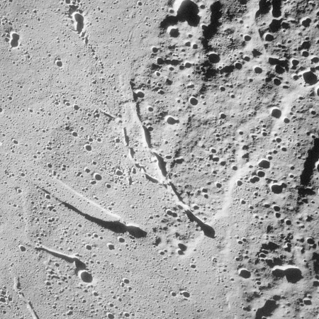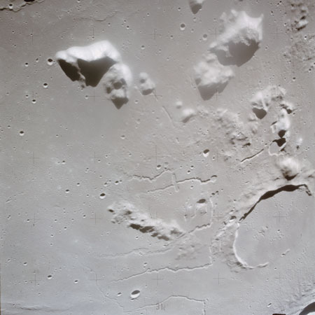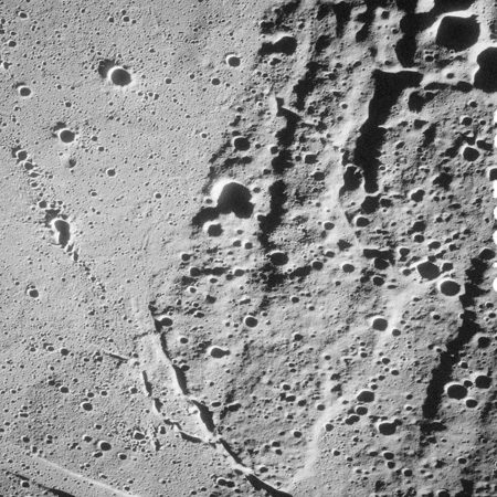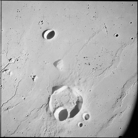 Lubbock is more to the foreground of AS15-90-12280, while beyond it and to the left is Gutenberg. Named after the pioneer of movable type and the printing press, Johann Gutenberg, 1398-1468, this 74-km crater's walls have been heavily intertwined with other large craters. The flooded Gutenberg E breaks up the foreground wall and the bright Gutenberg A punctures the far wall. Rather than having a central peak, Gutenberg's floor displays the beginnings of a central ring.