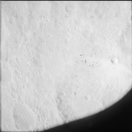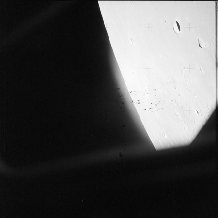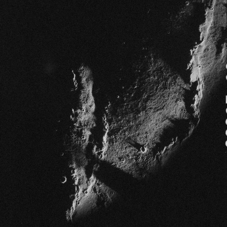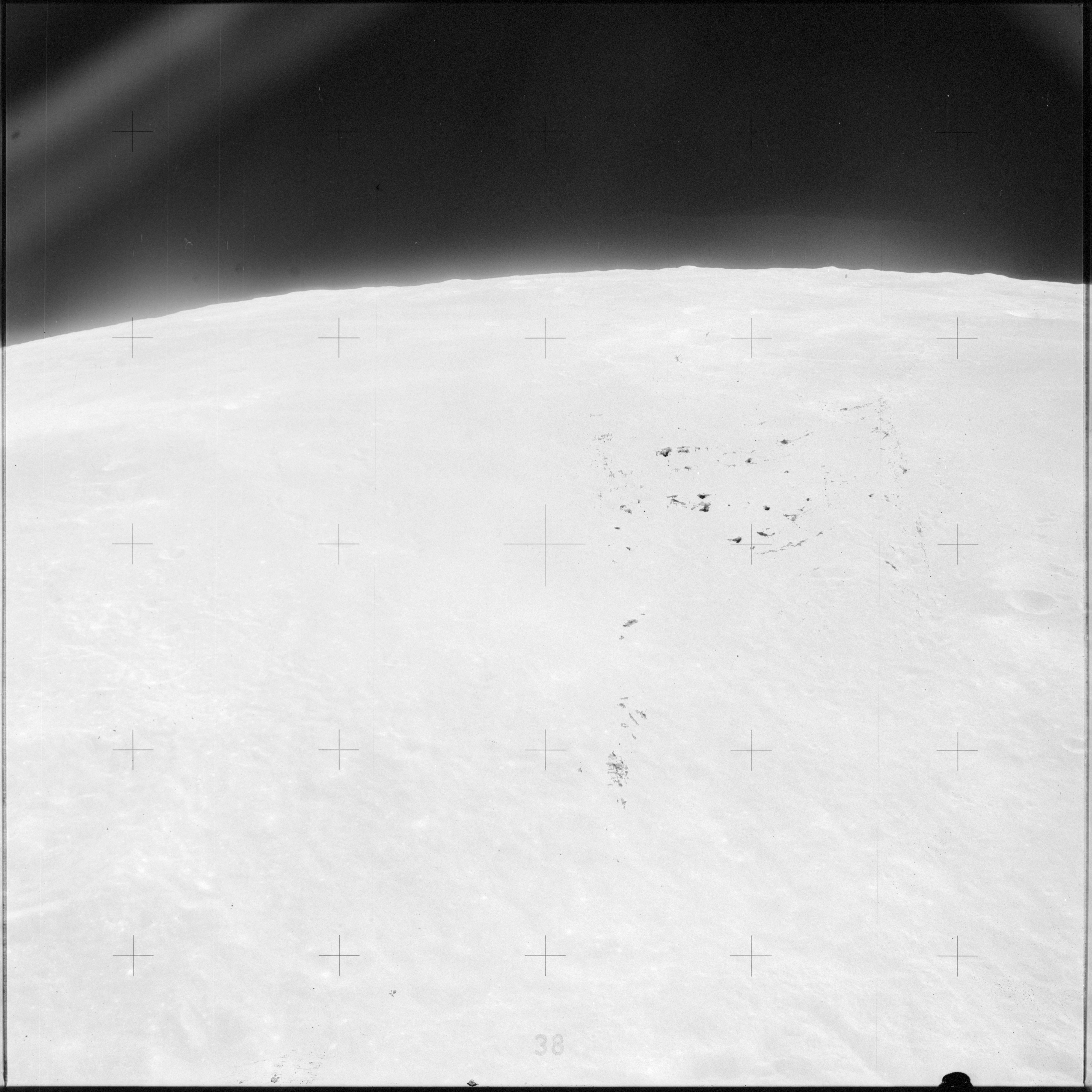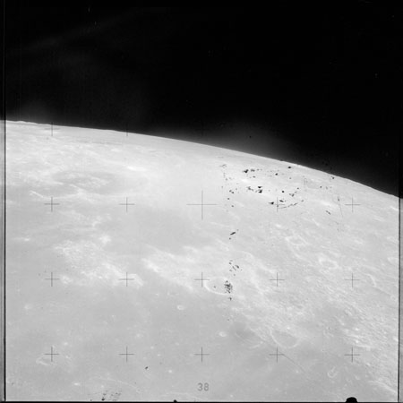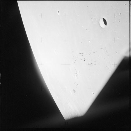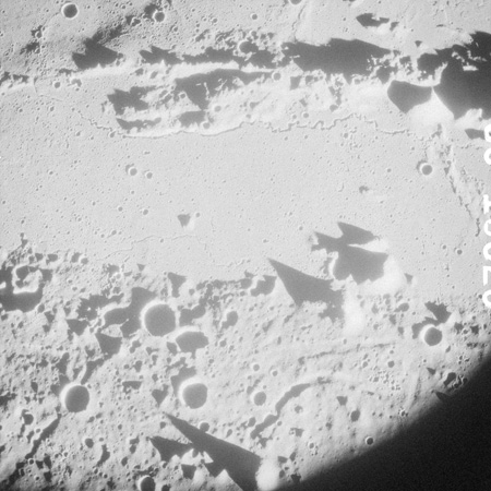 Endeavour should reach the sunrise terminator at about 203:27. As they approach and shadows lengthen, and starting at about 203:21, nine photos are taken on magazine PP of the vast expanse of Oceanus Procellarum.
