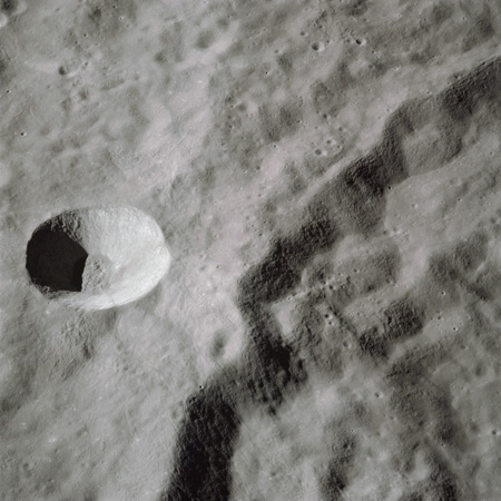 Note the heavily slumped wall where the small crater formed just beyond the rim. It is easy to imagine that the slump could have been caused by the shock of the small crater's impact.