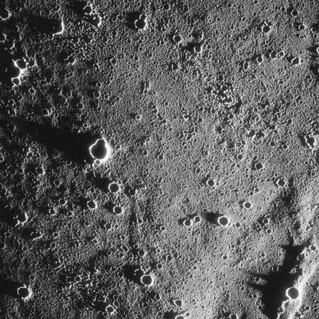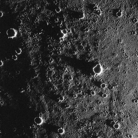 AS15-90-12278 - View south west across southeastern Mare Fecunditatis. Crater Lohse is at lower left edge, crater Al-Marrakushi is at right edge. Image is contrast stretched. Image without contrast stretching - Image by NASA/Johnson Space Center.