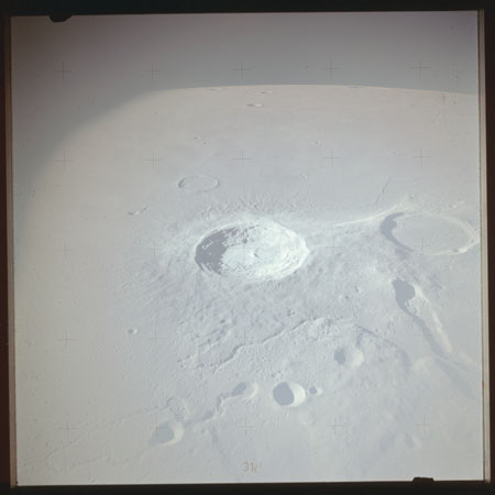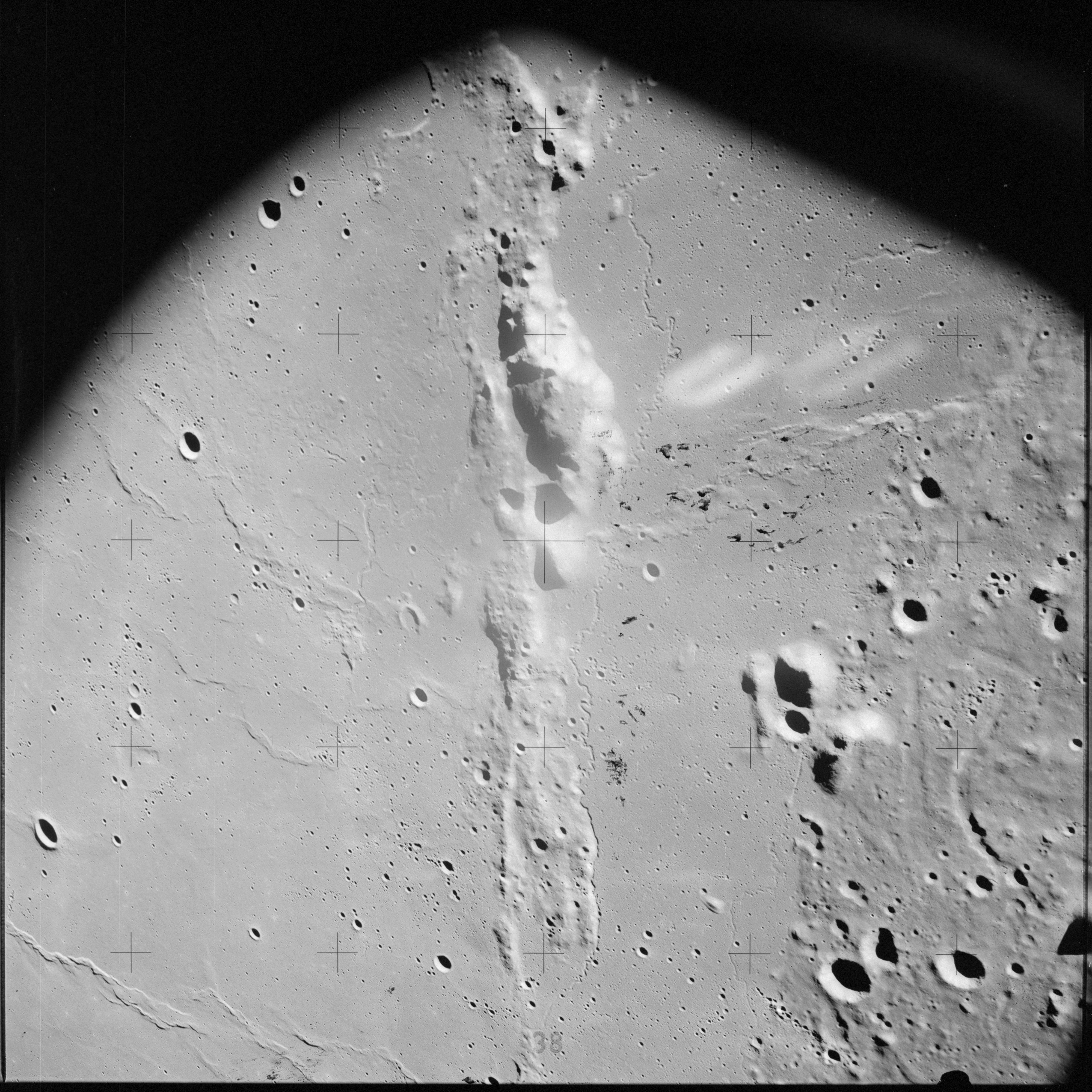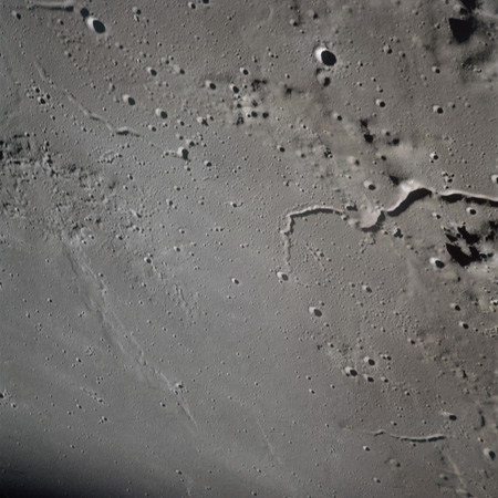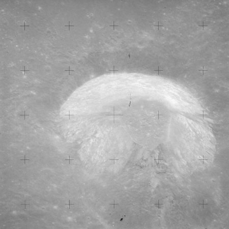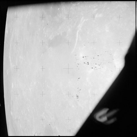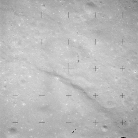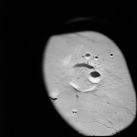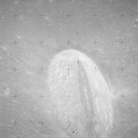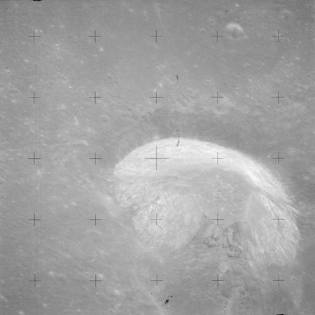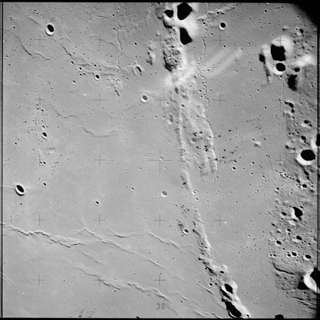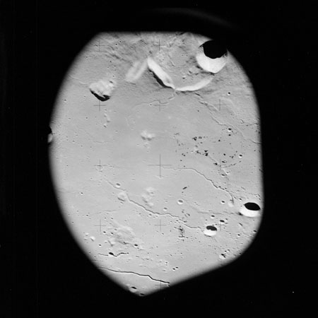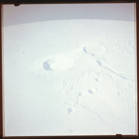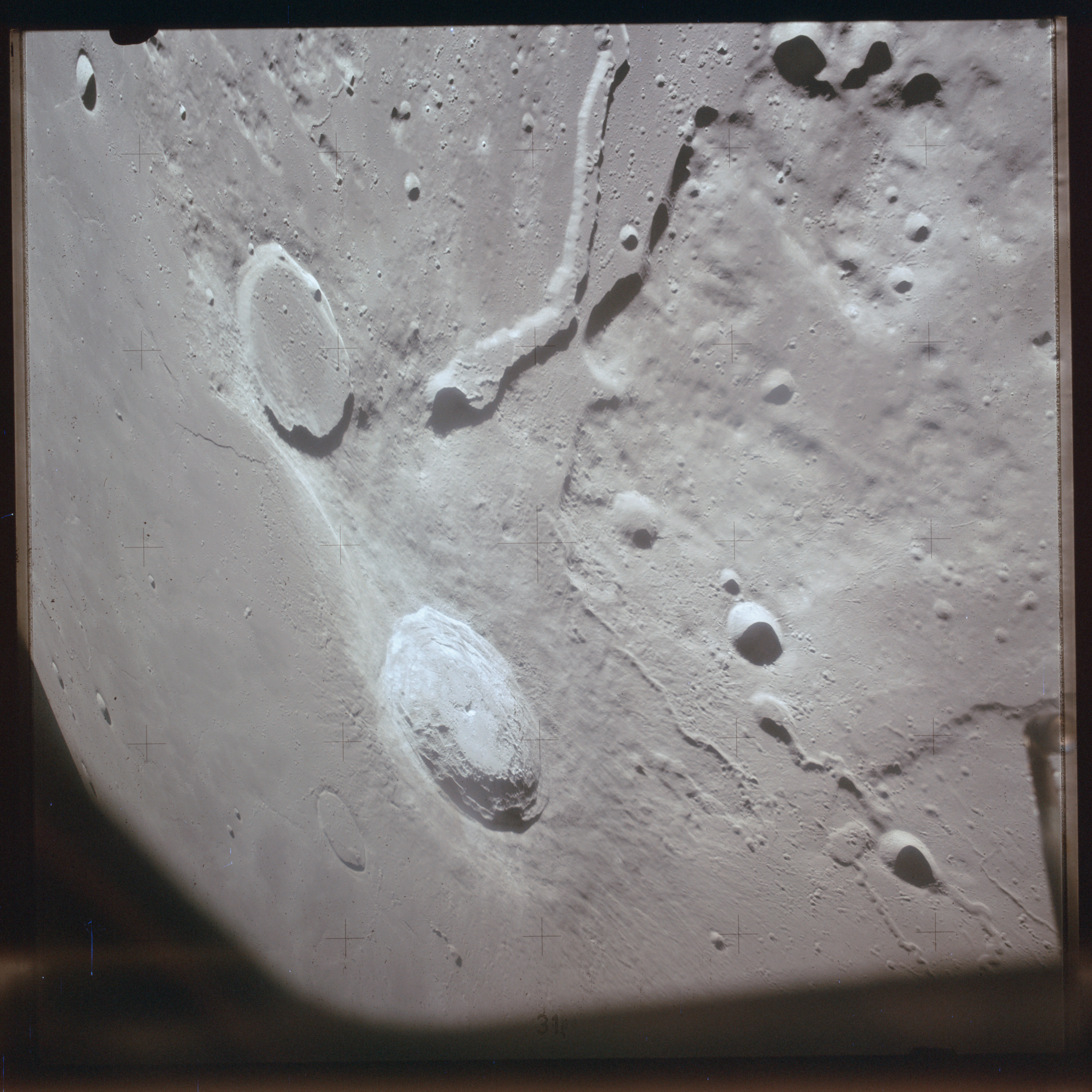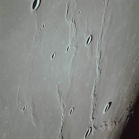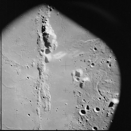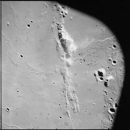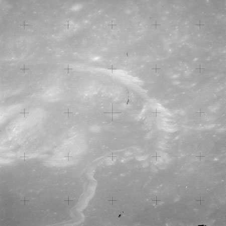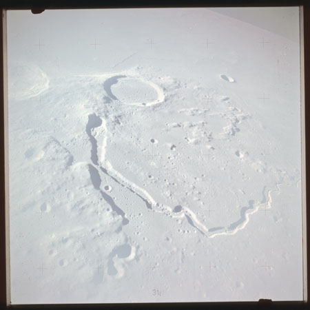 The crater to the right of the rille-producing pair is Toscanelli. The remaining ten frames on magazine PP for this pass follow slightly to the west of Toscanelli across the northern edge of the Aristarchus Plateau to Montes Agricola, finally settling on its northern end.