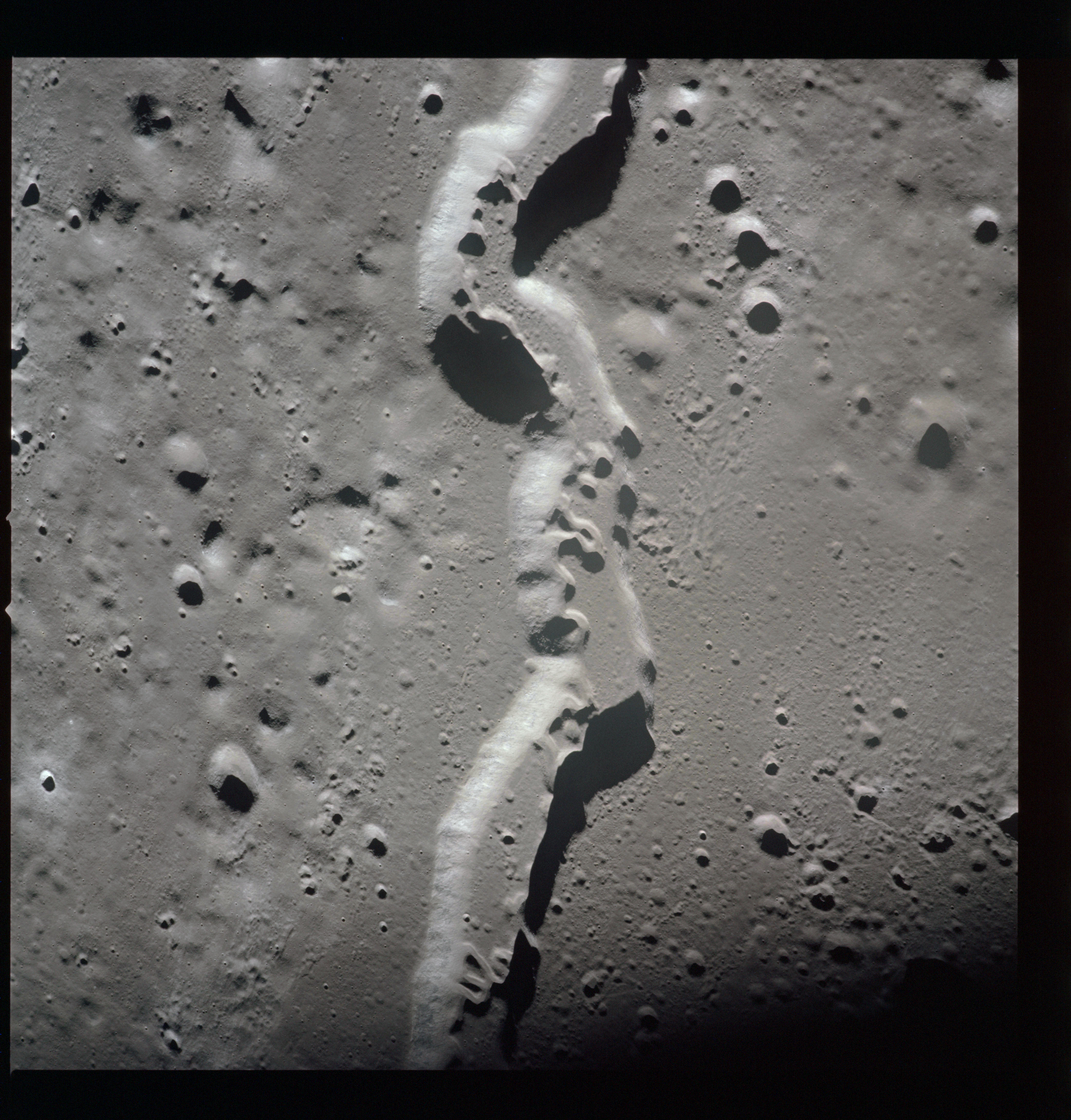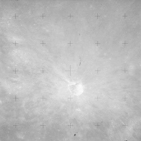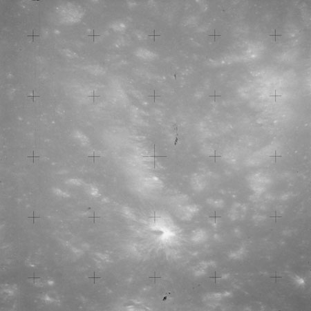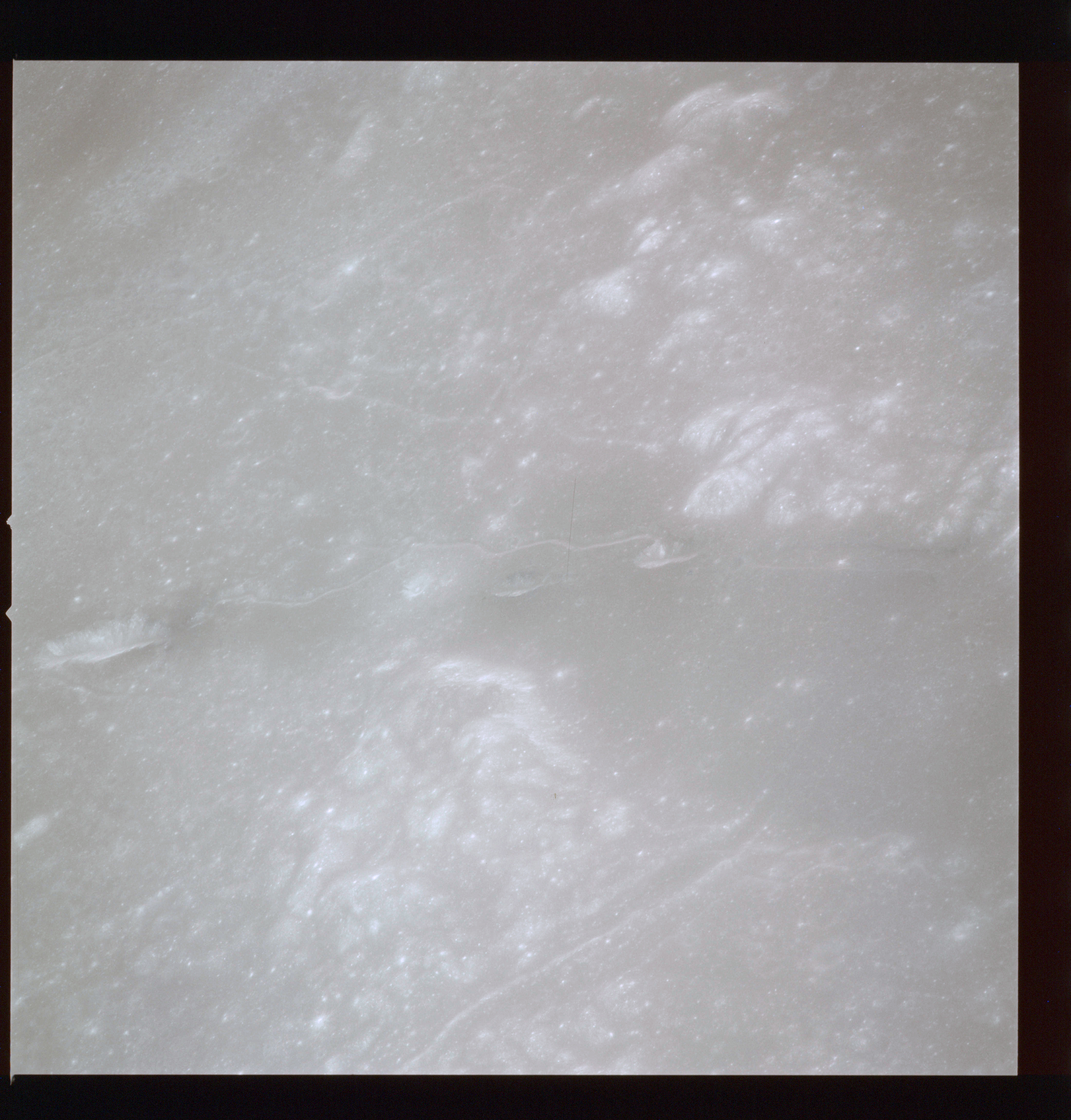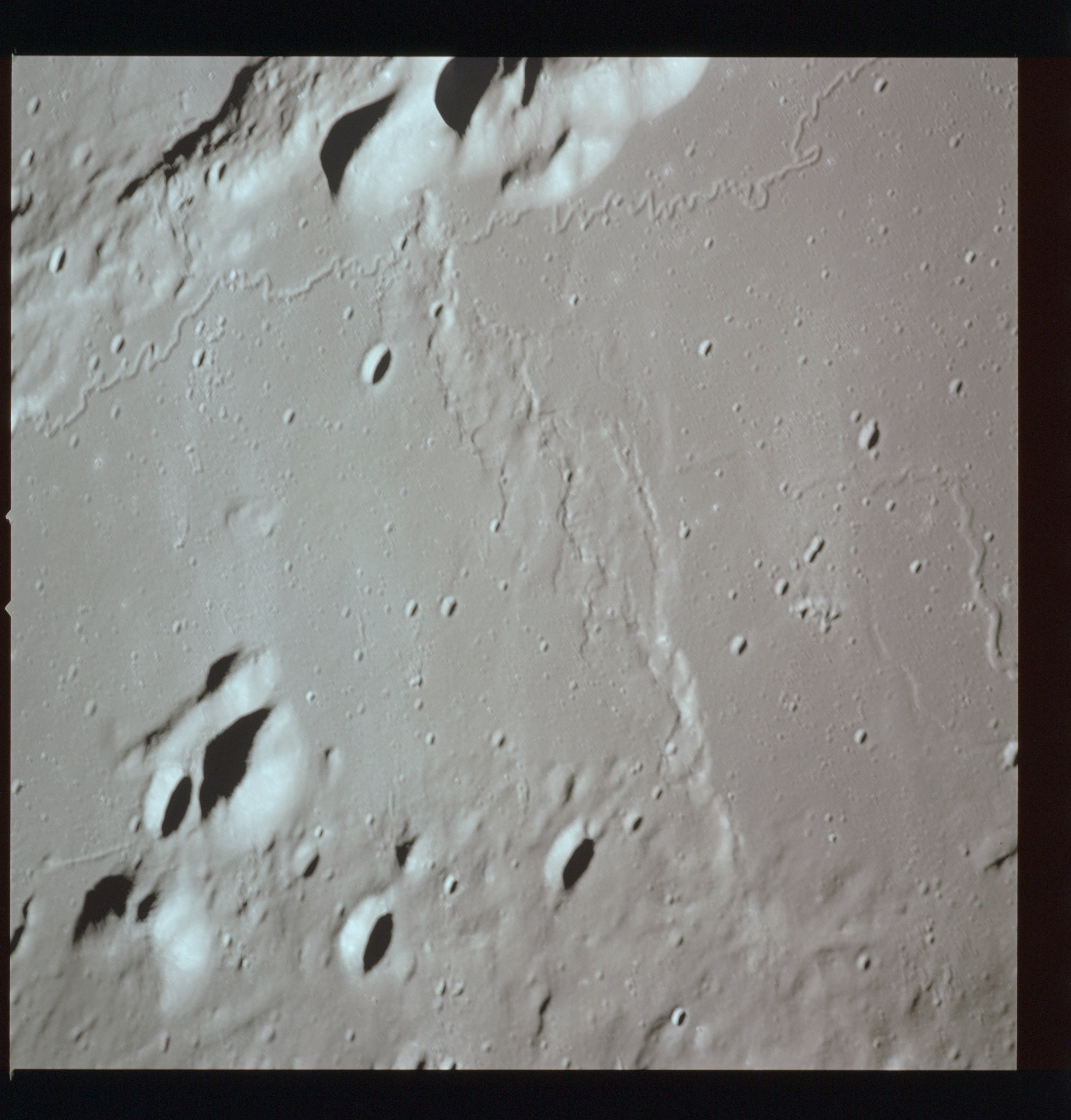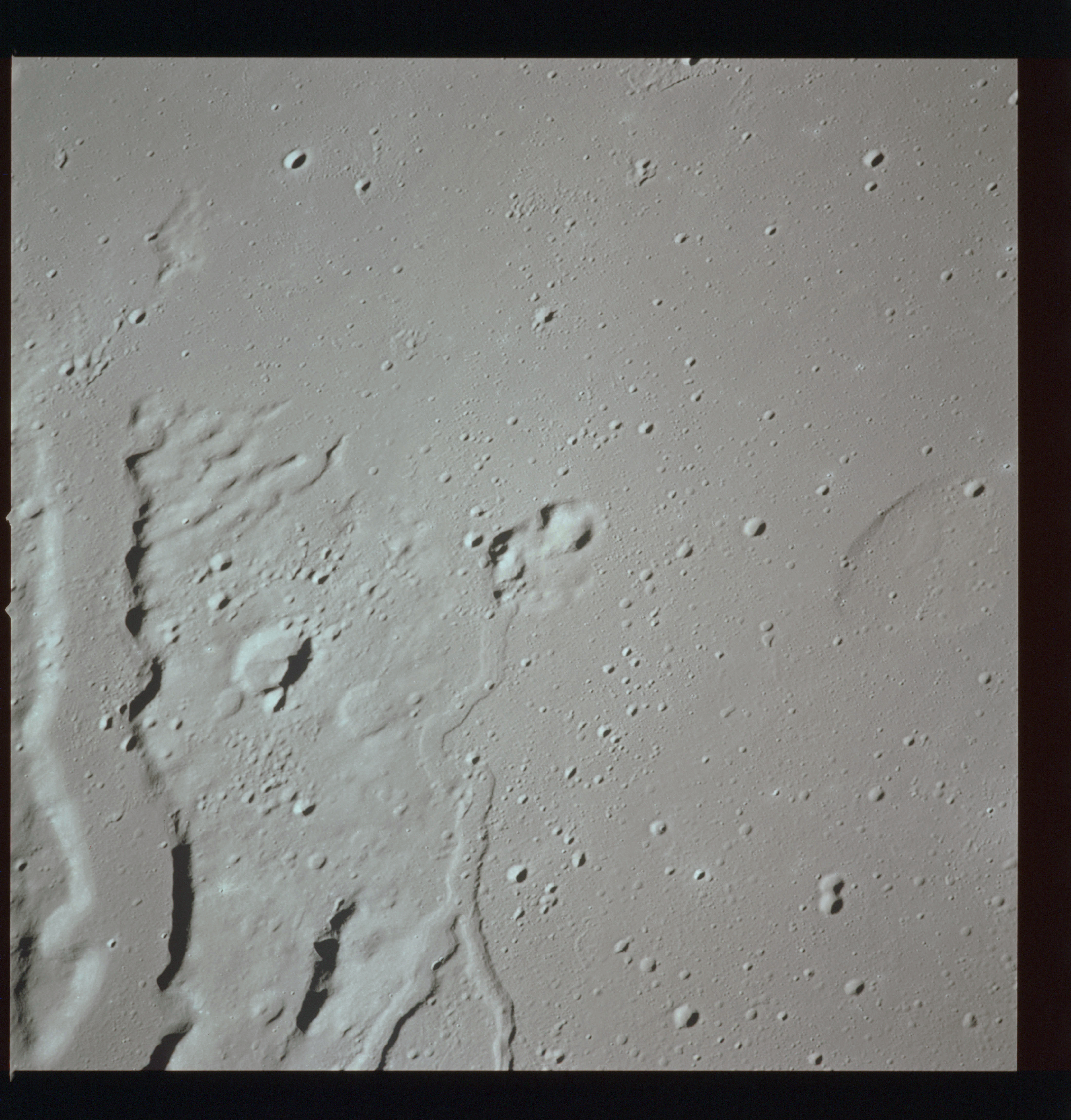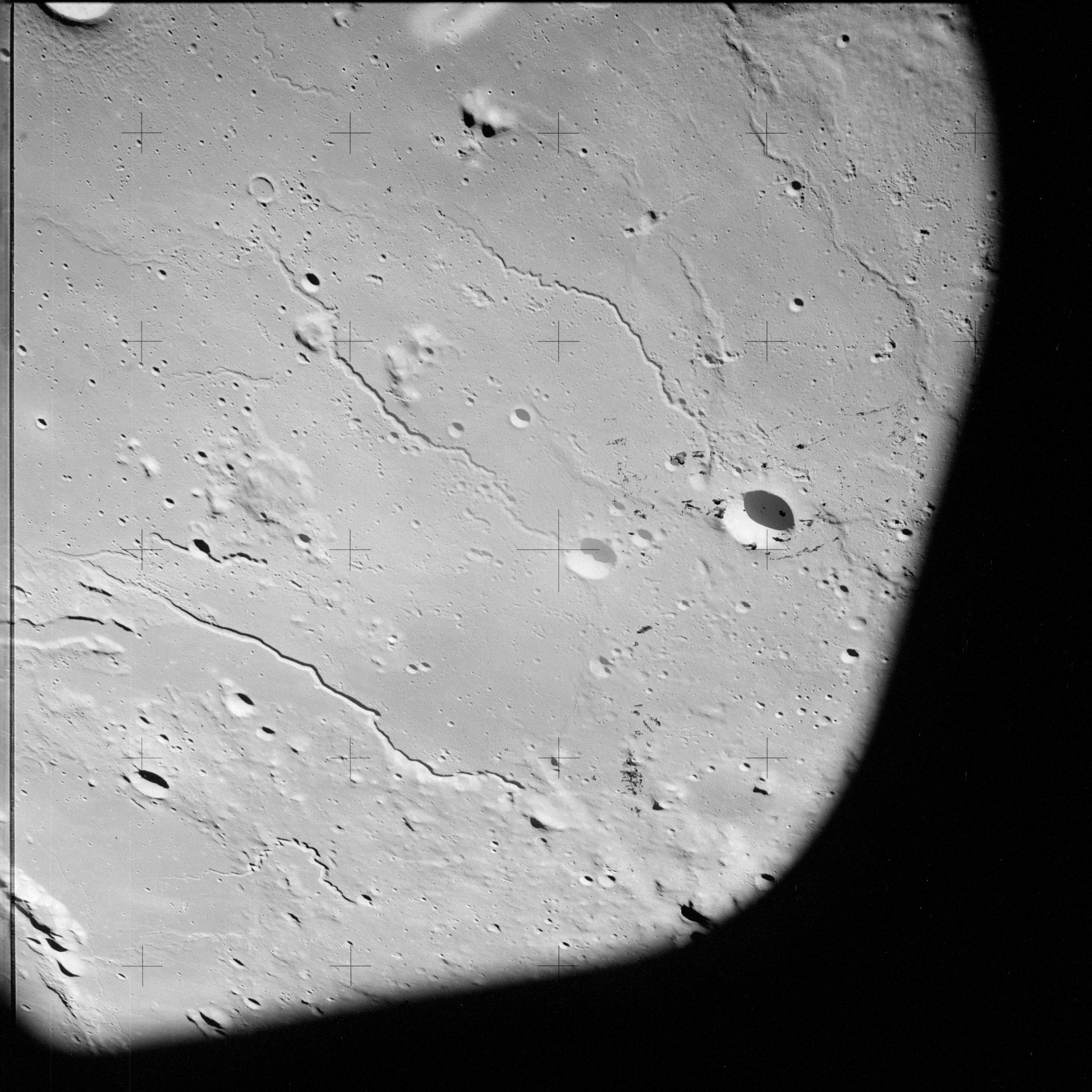 The crater to the right of the rille-producing pair is Toscanelli. The remaining ten frames on magazine PP for this pass follow slightly to the west of Toscanelli across the northern edge of the Aristarchus Plateau to Montes Agricola, finally settling on its northern end.