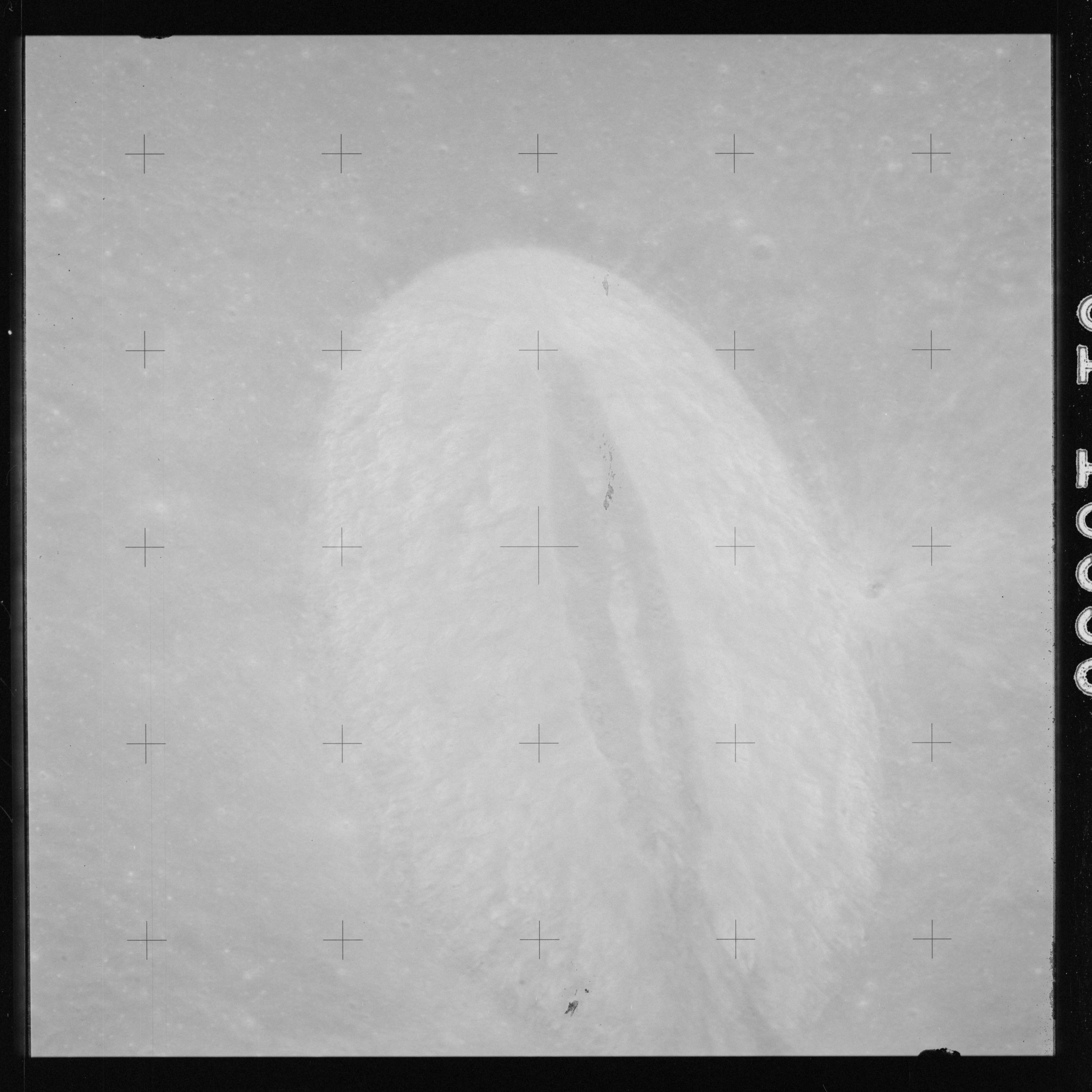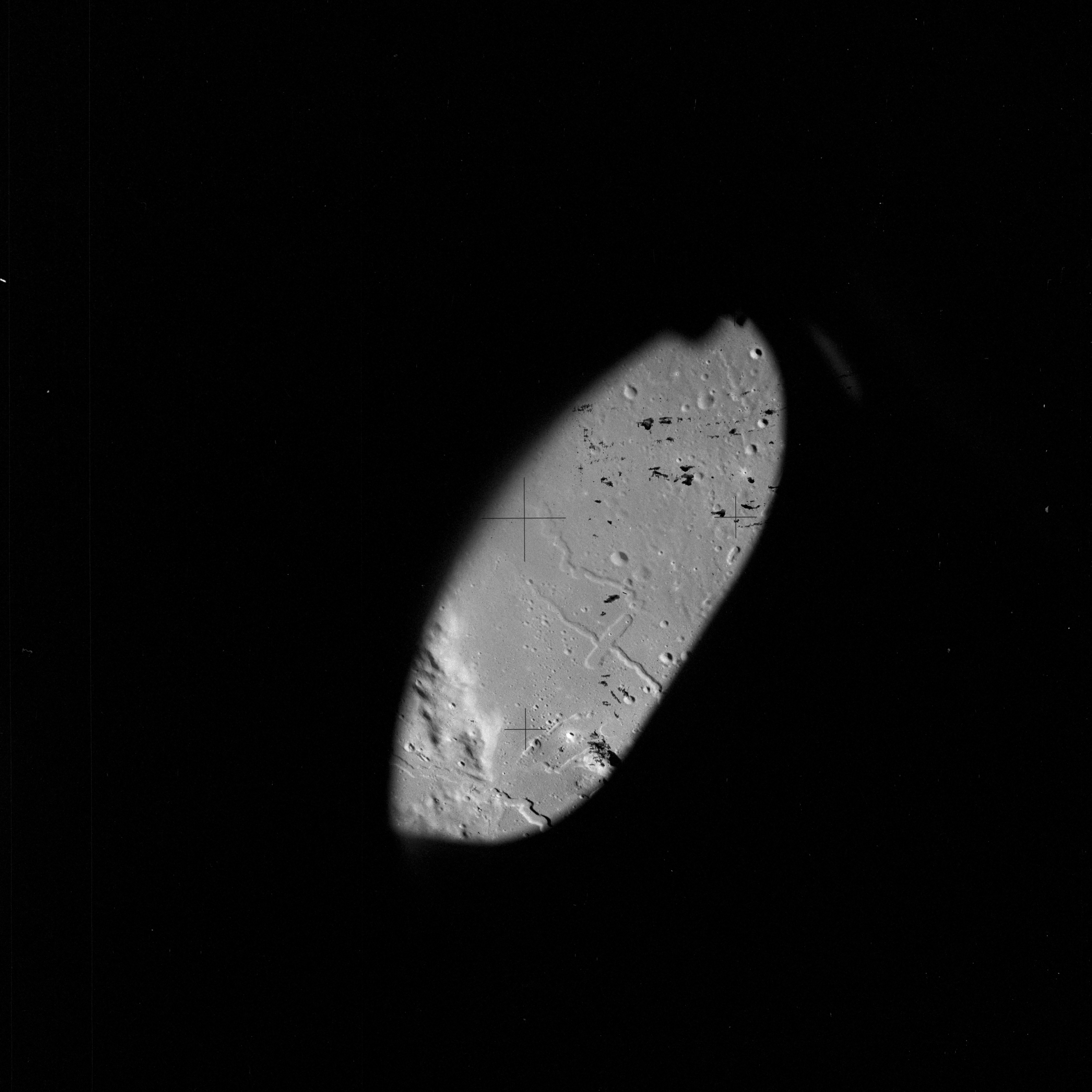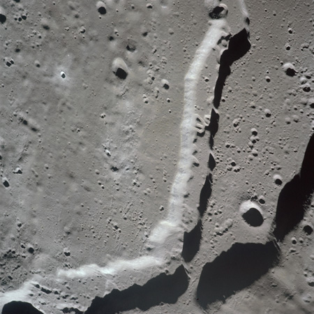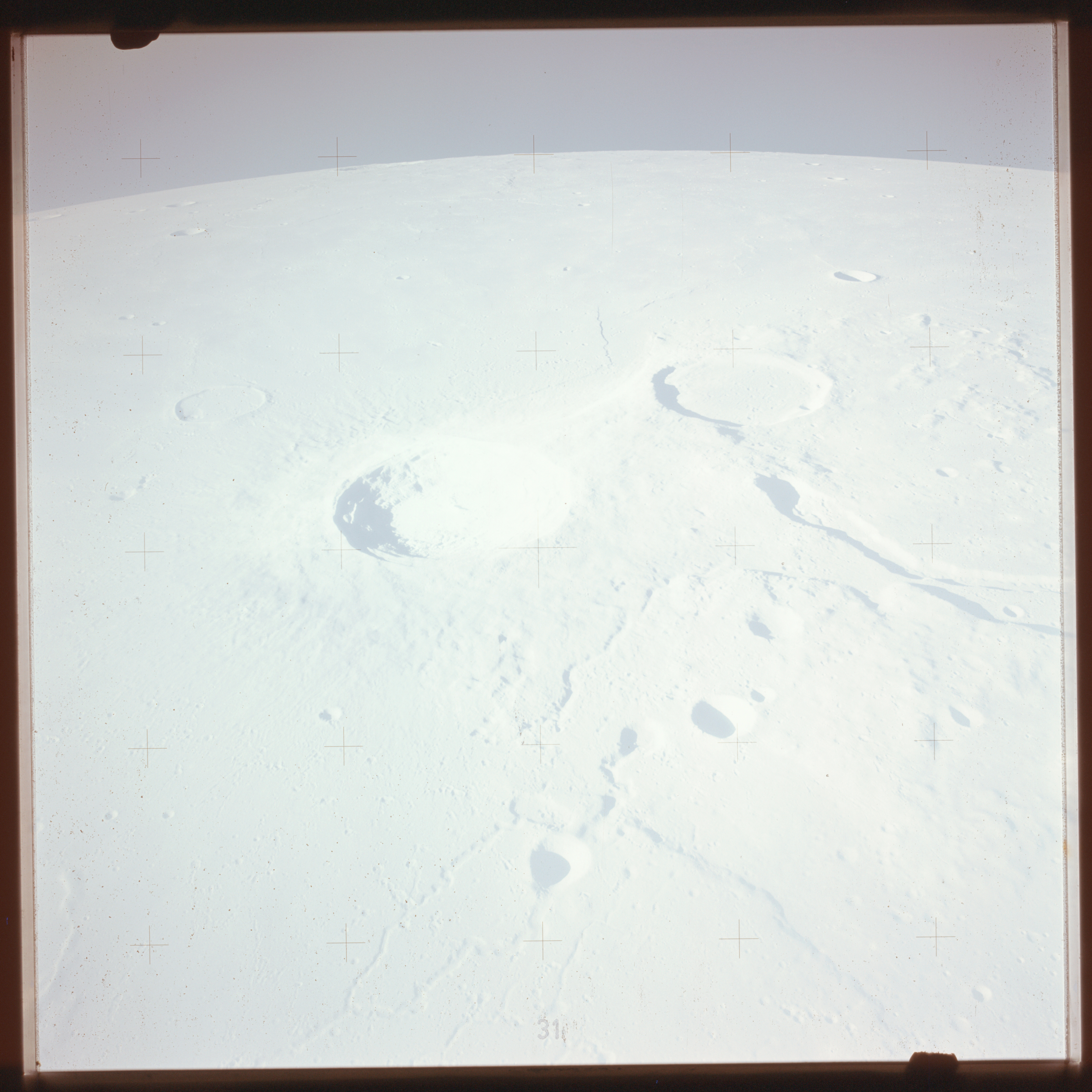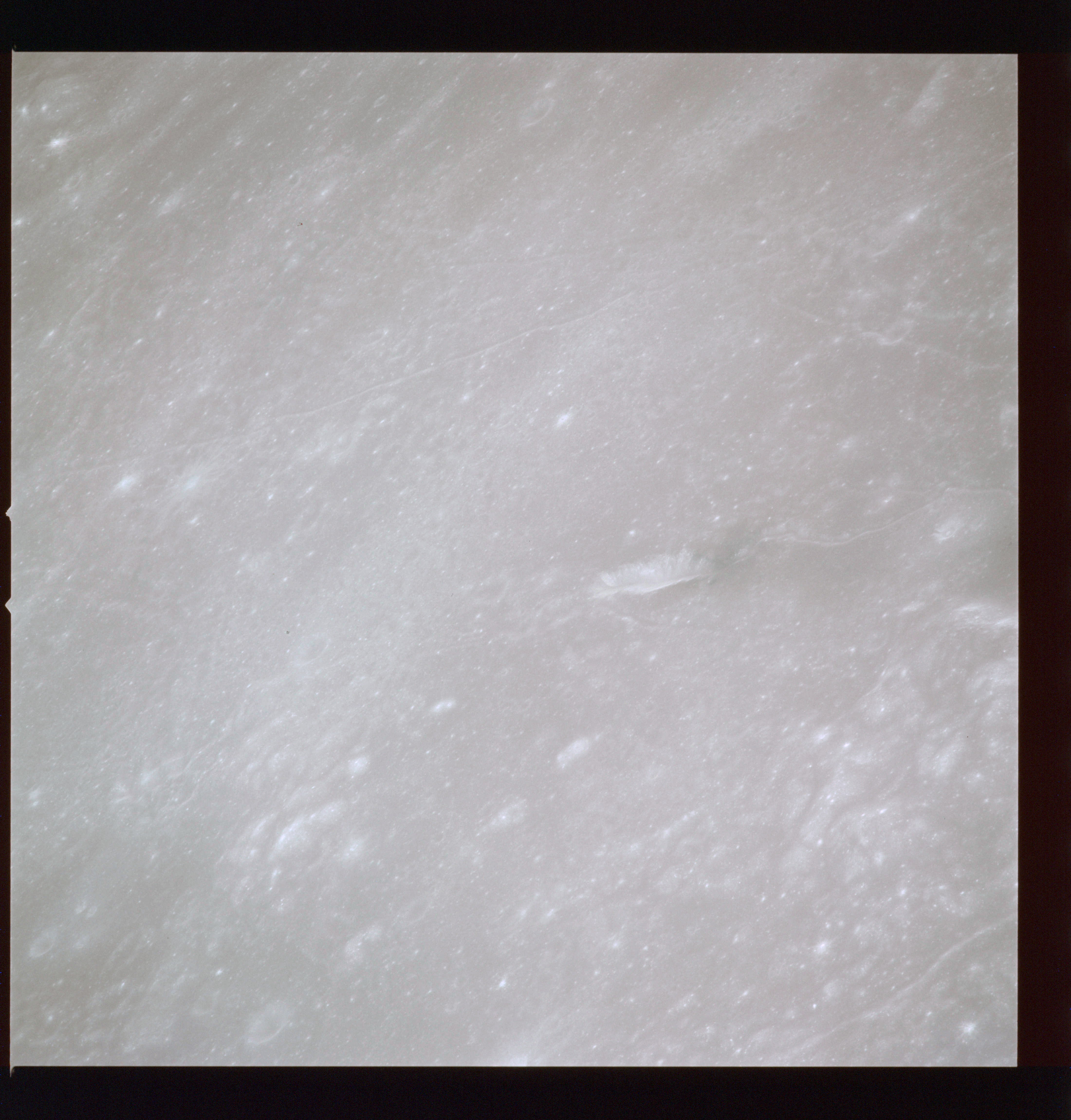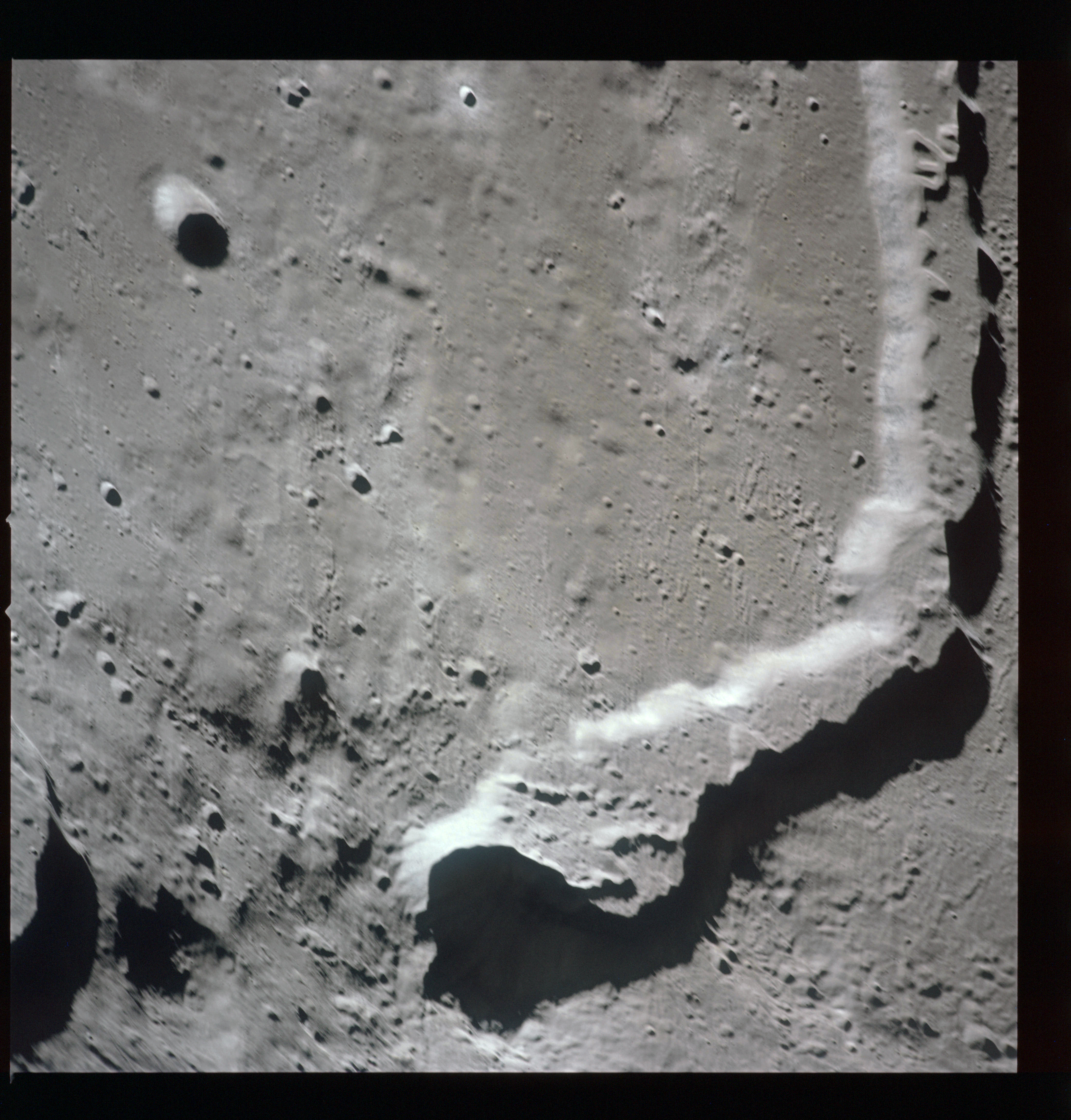 The crater to the right of the rille-producing pair is Toscanelli. The remaining ten frames on magazine PP for this pass follow slightly to the west of Toscanelli across the northern edge of the Aristarchus Plateau to Montes Agricola, finally settling on its northern end.