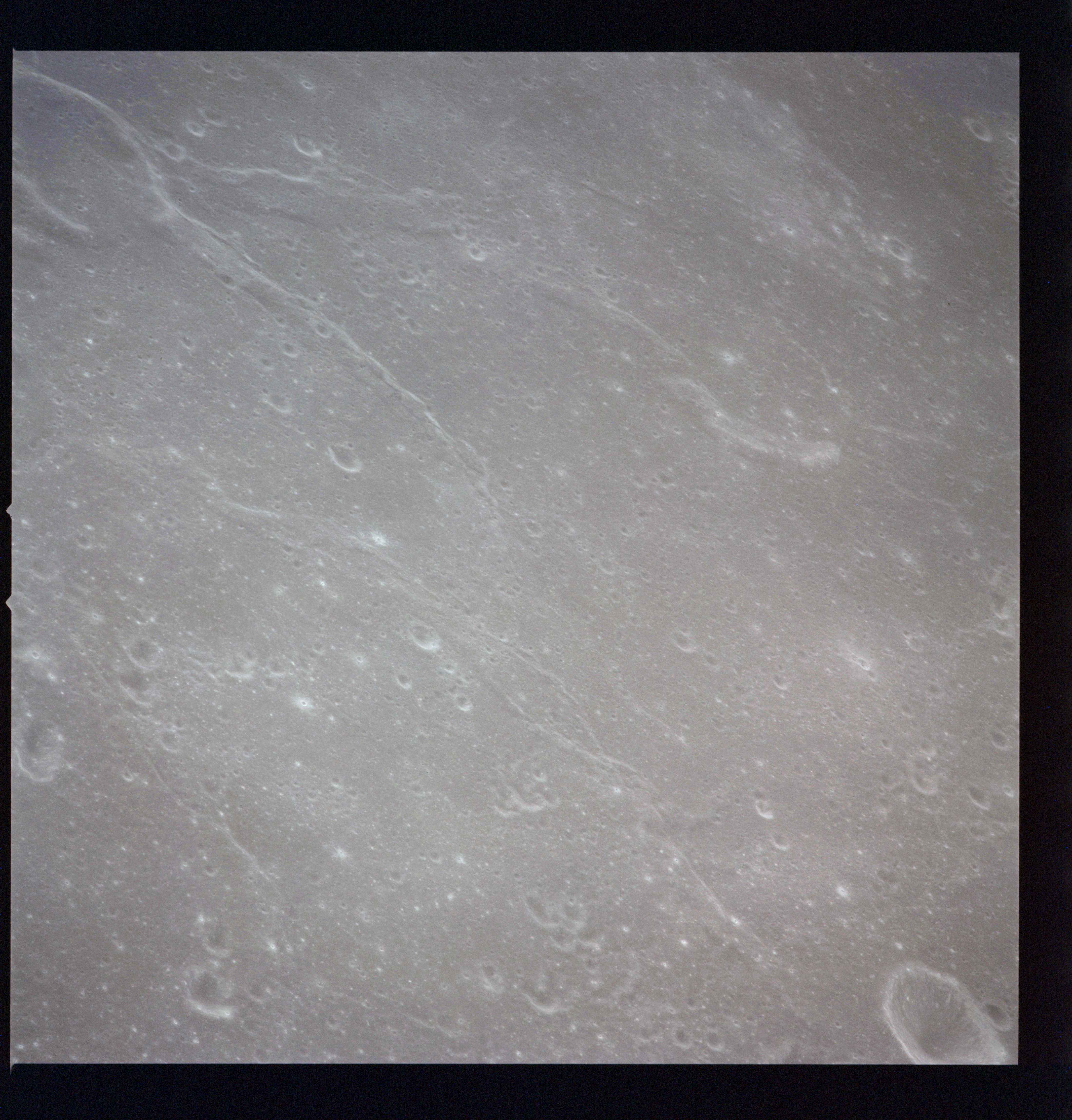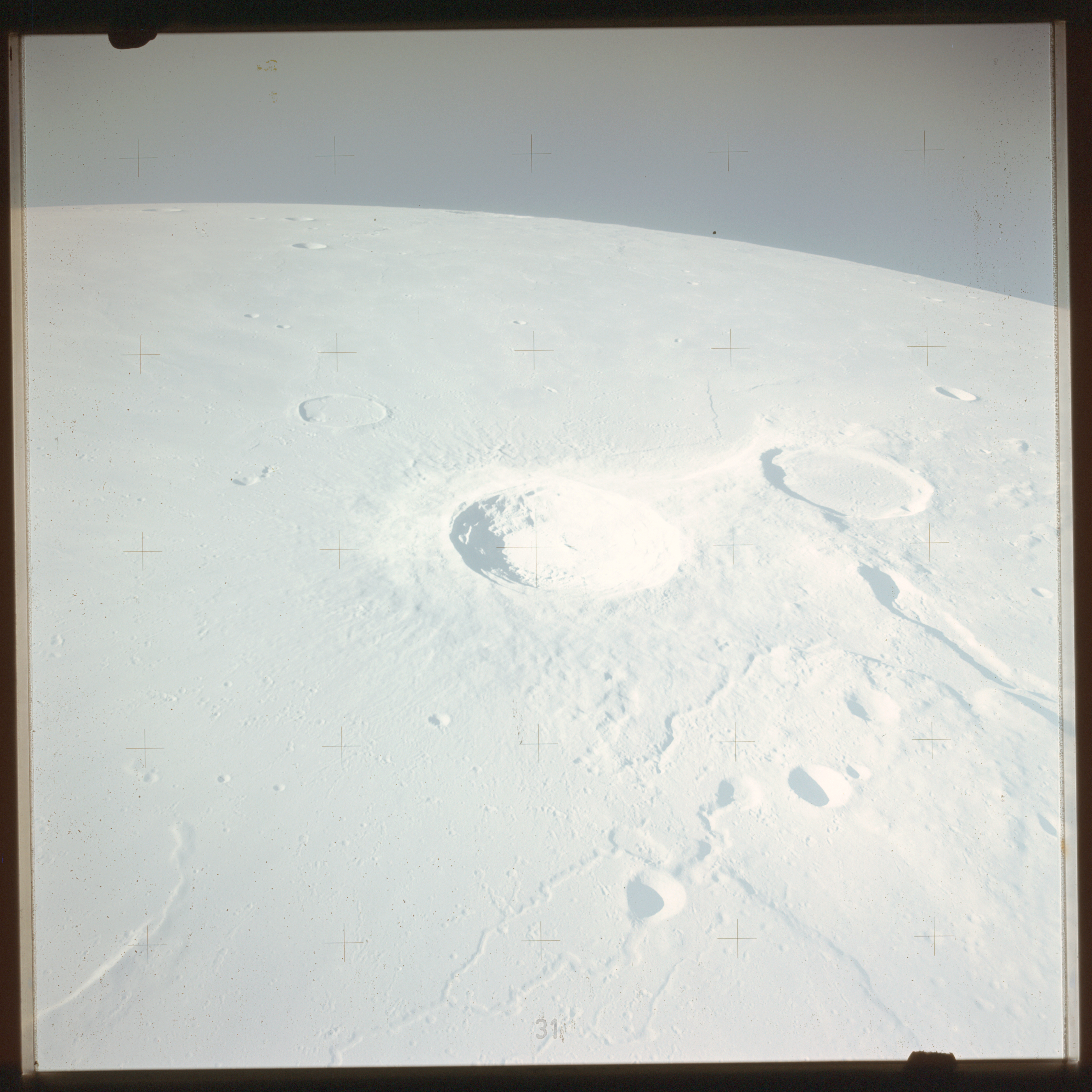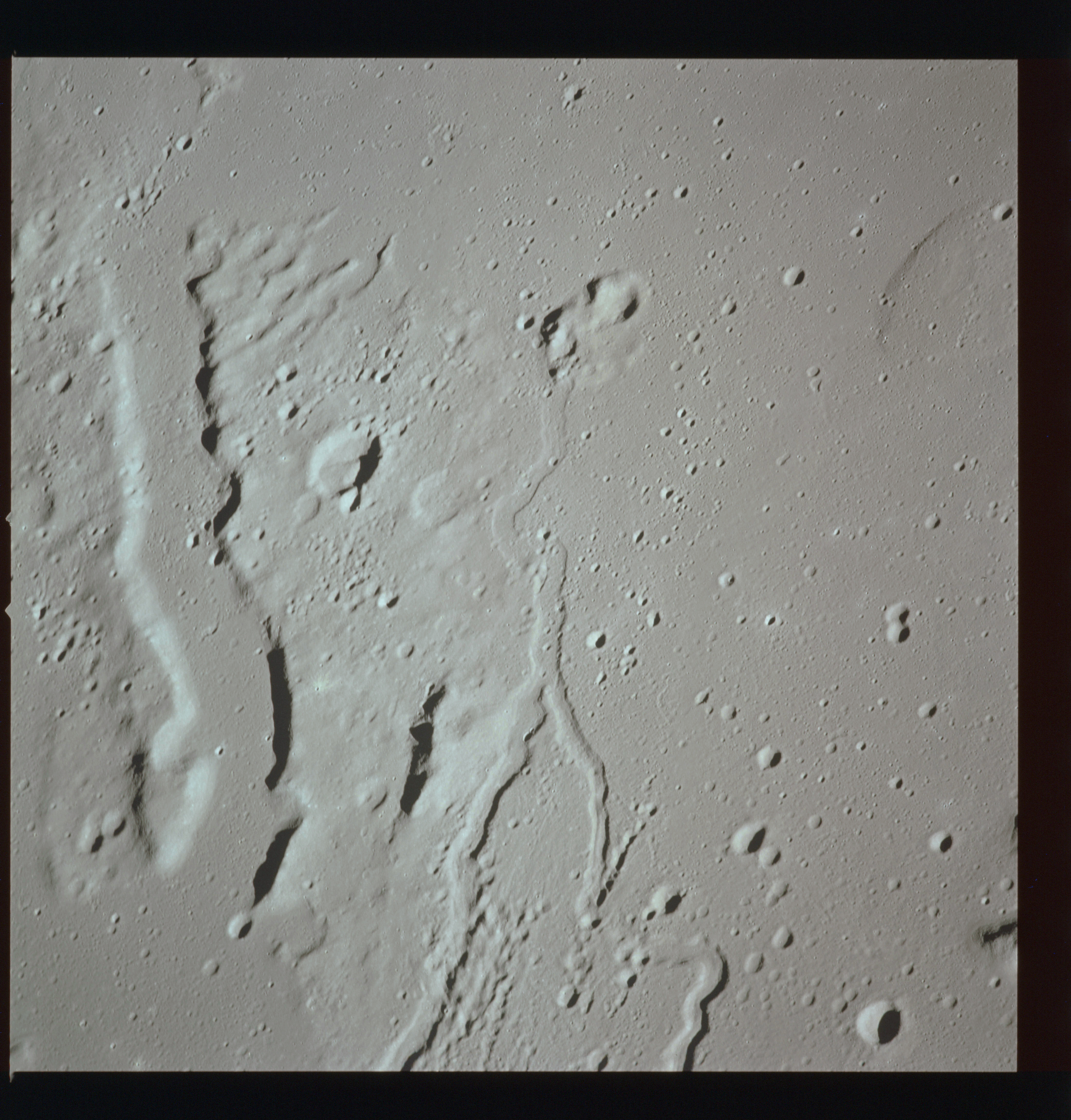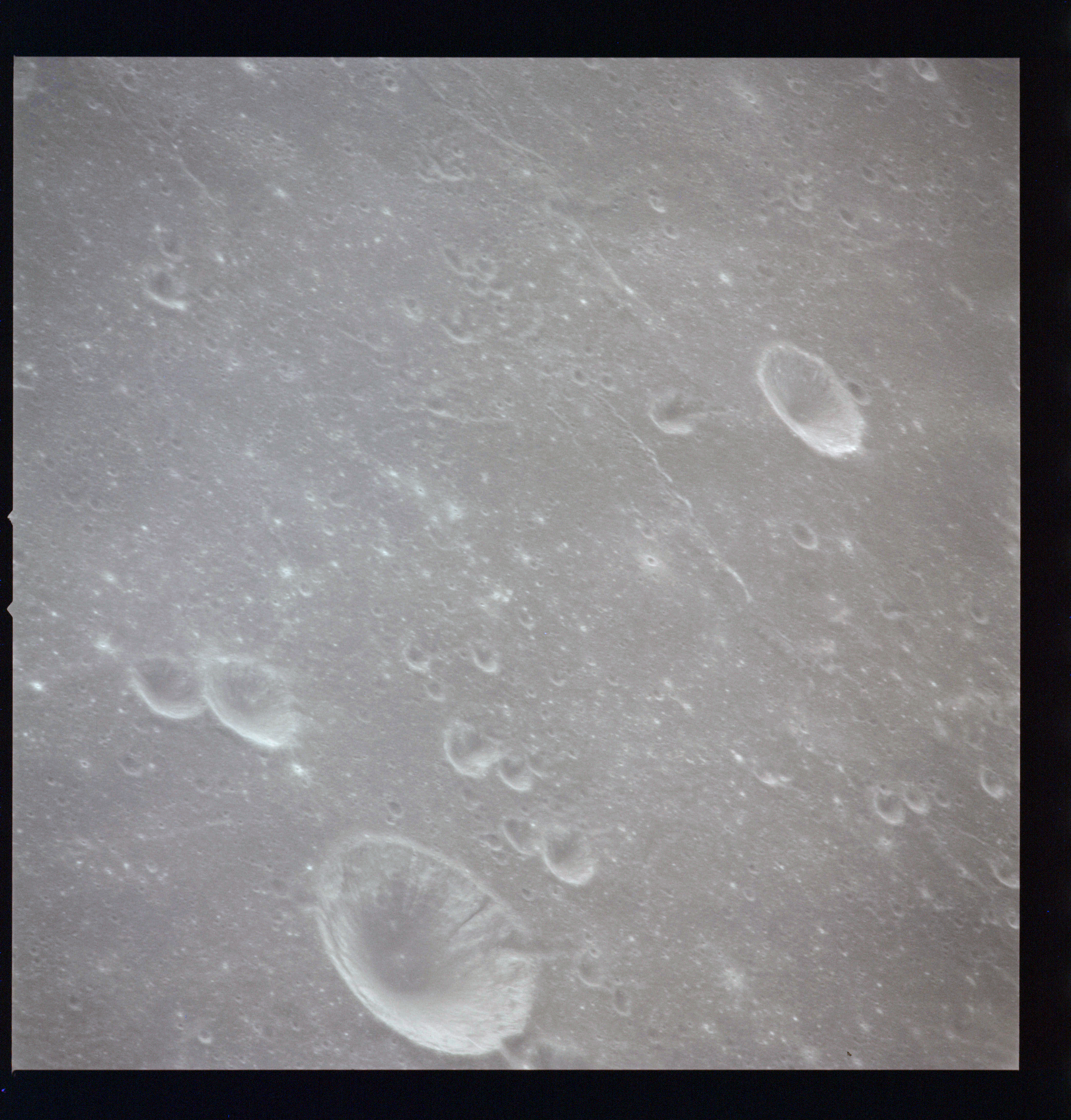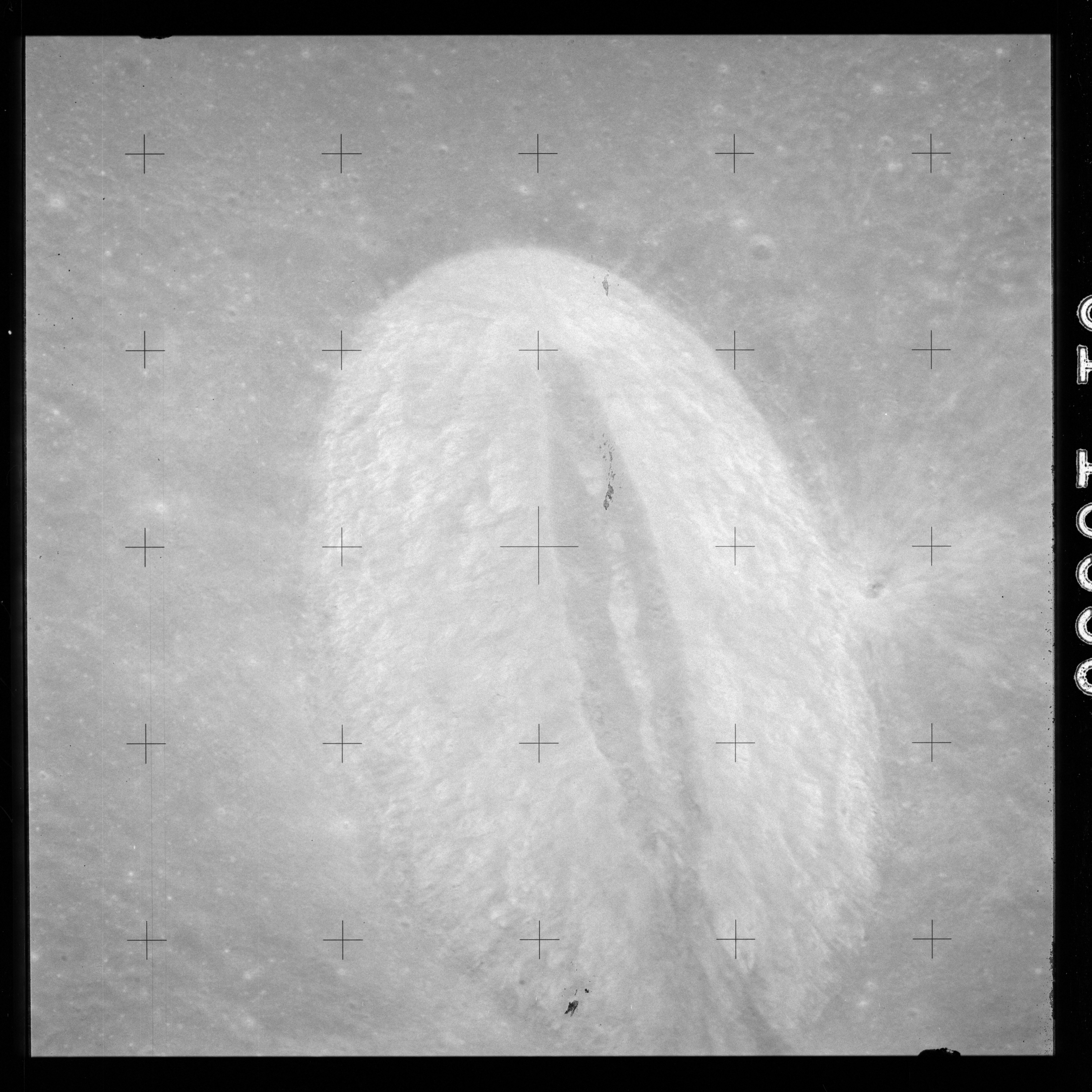 The crater to the right of the rille-producing pair is Toscanelli. The remaining ten frames on magazine PP for this pass follow slightly to the west of Toscanelli across the northern edge of the Aristarchus Plateau to Montes Agricola, finally settling on its northern end.