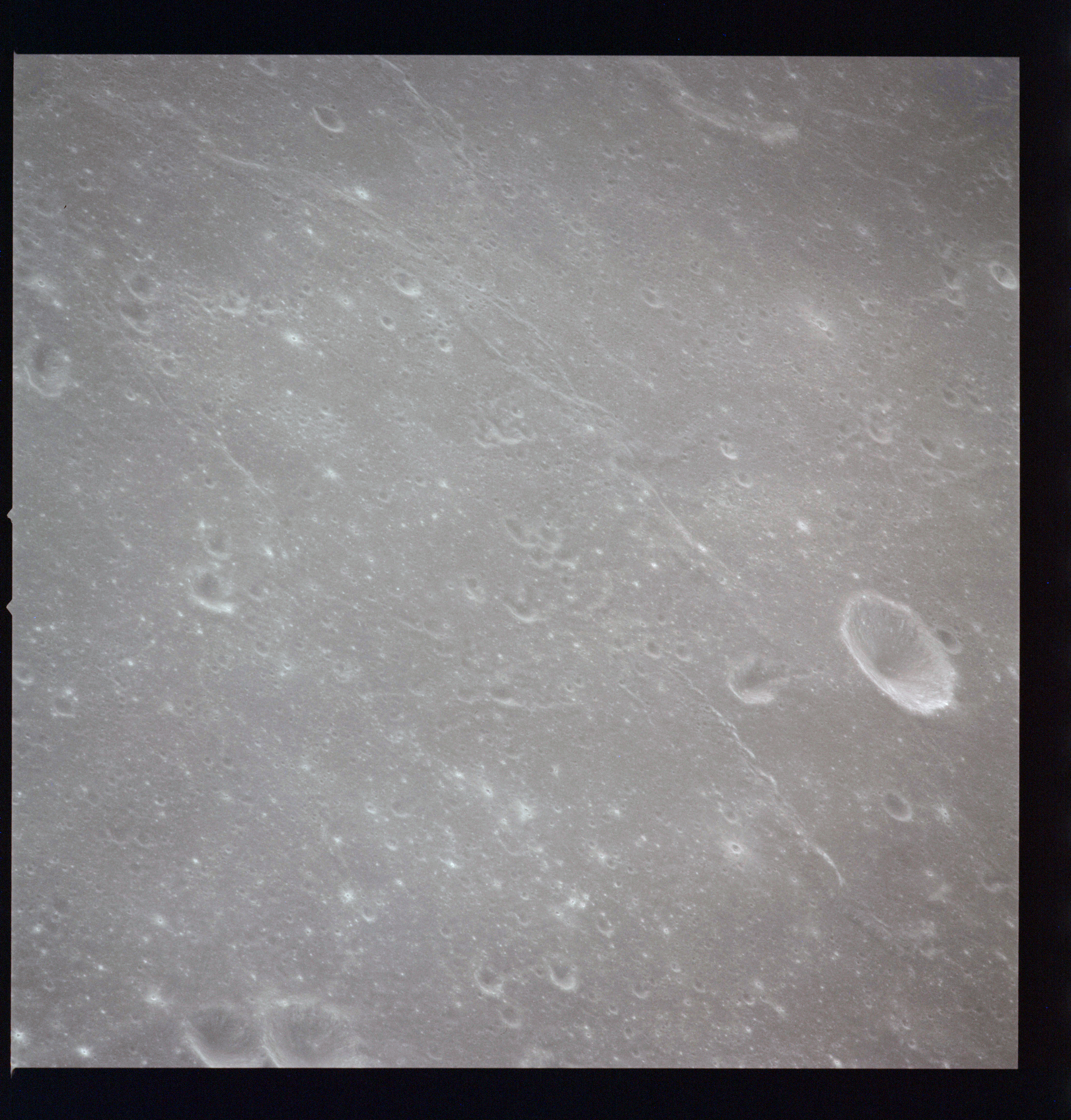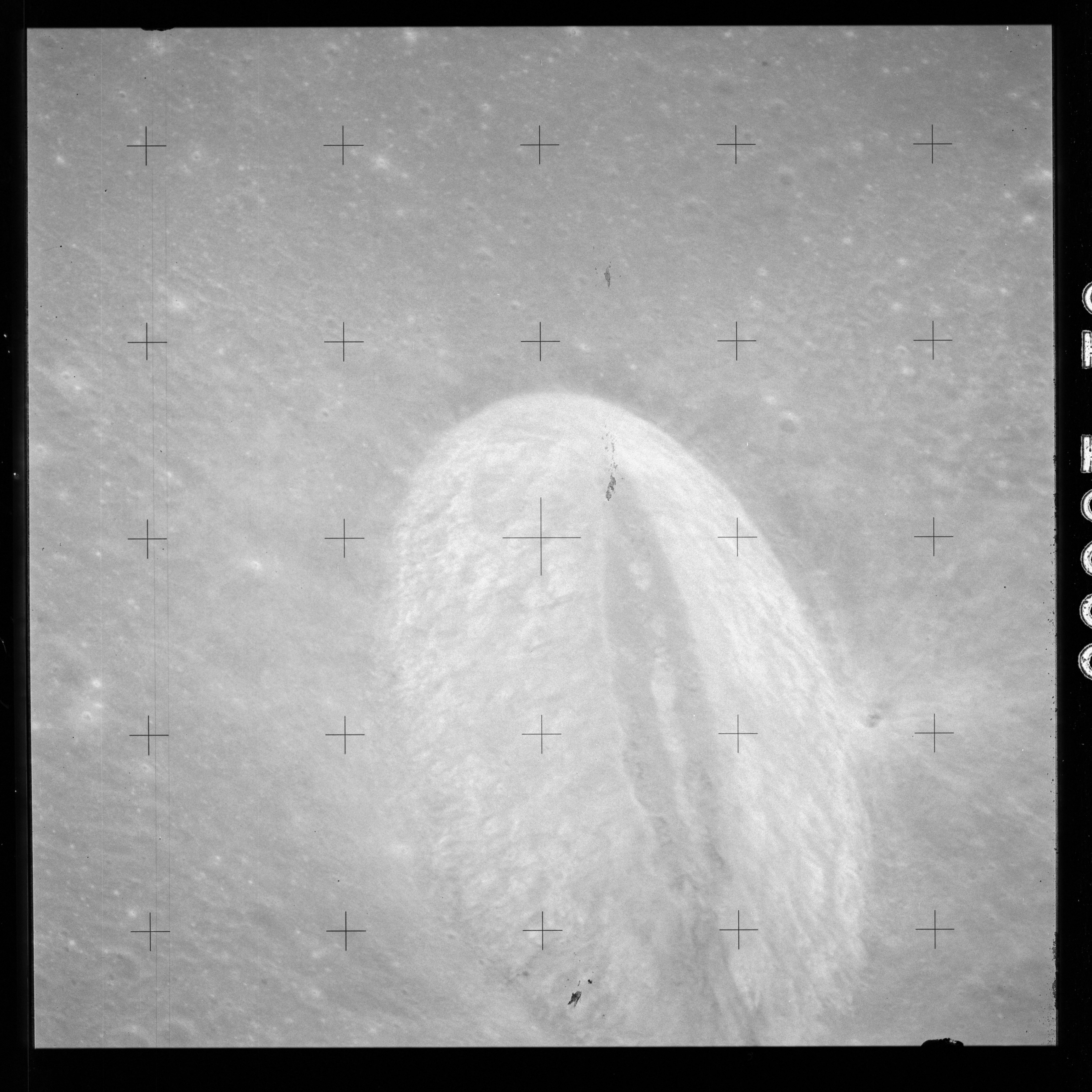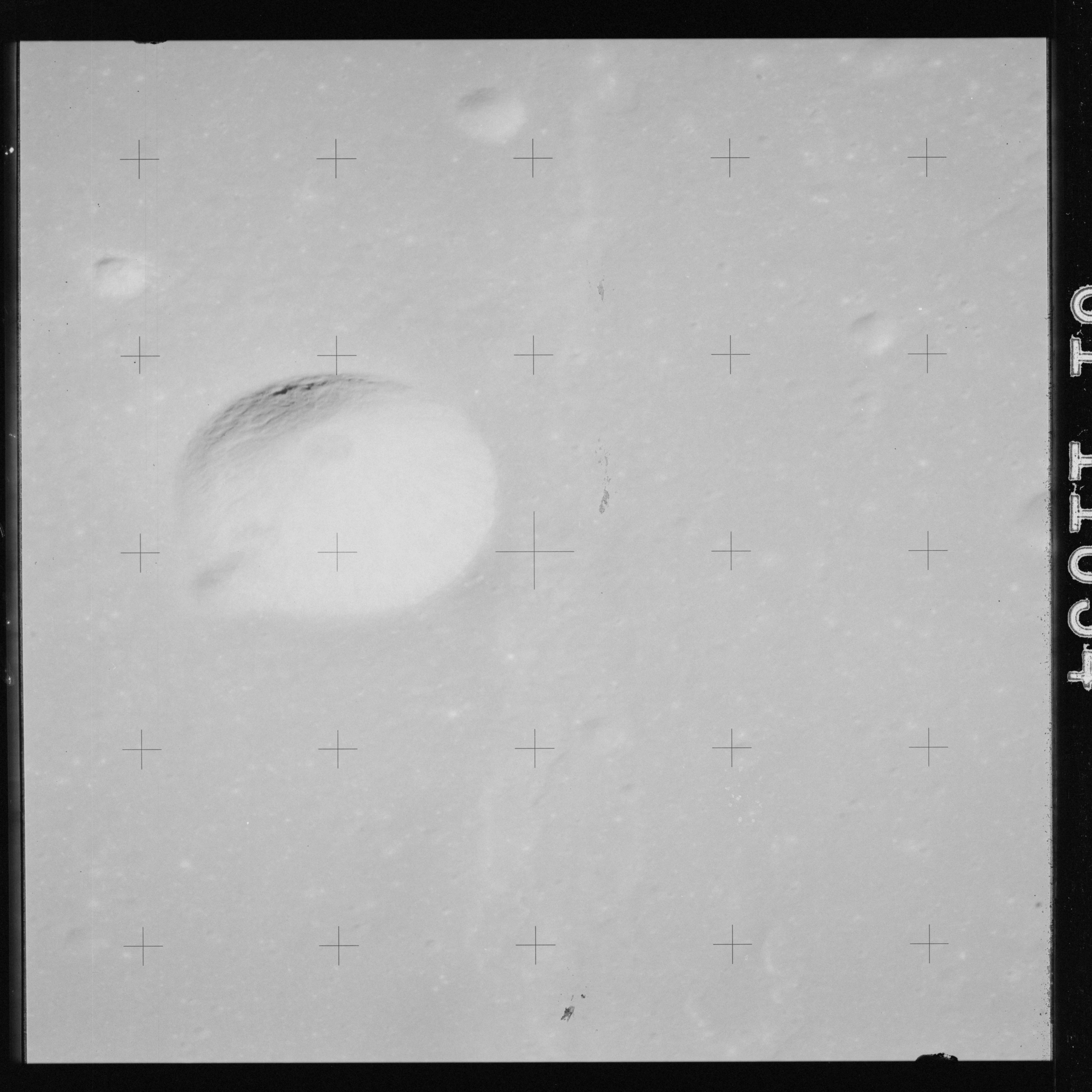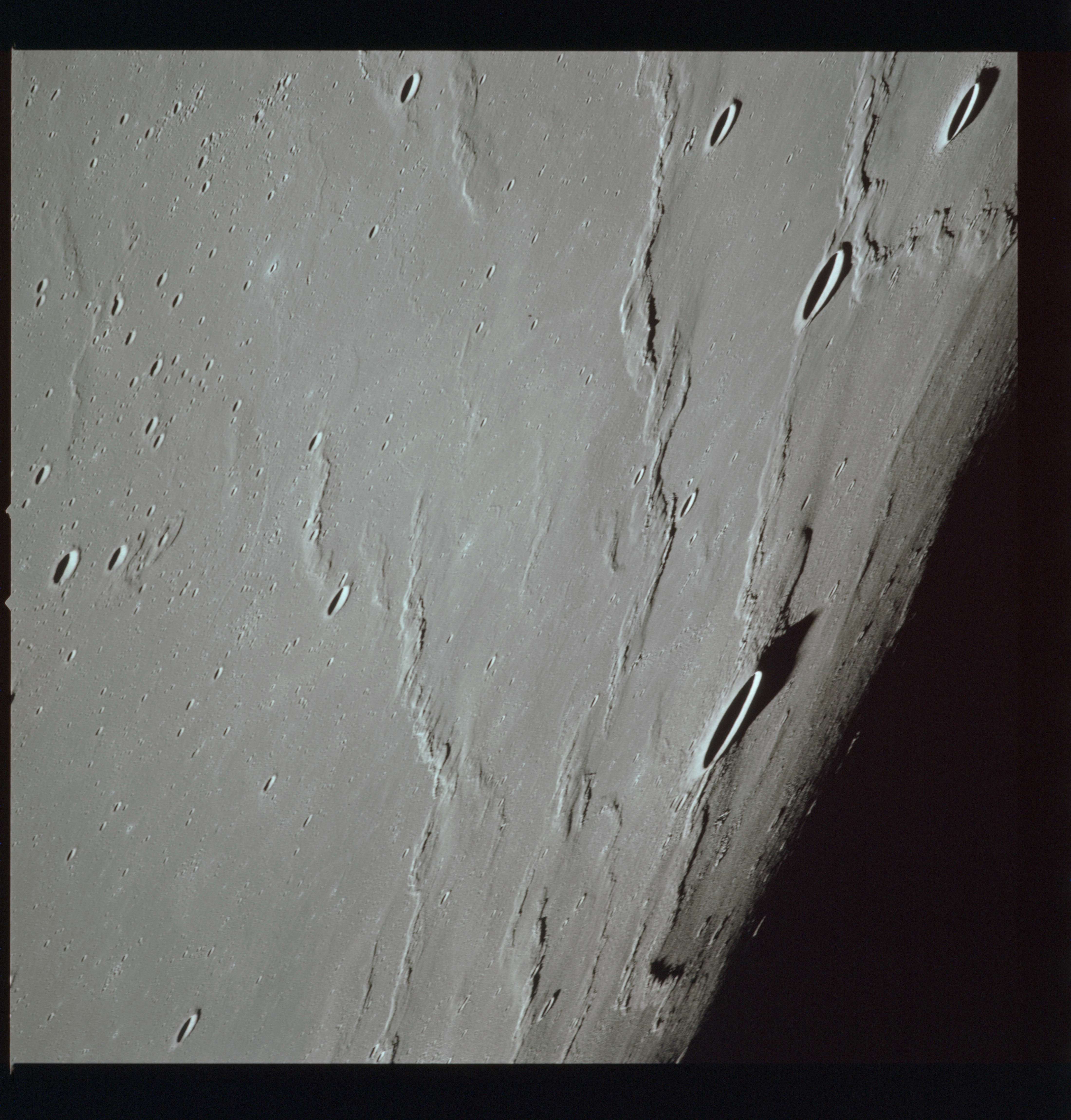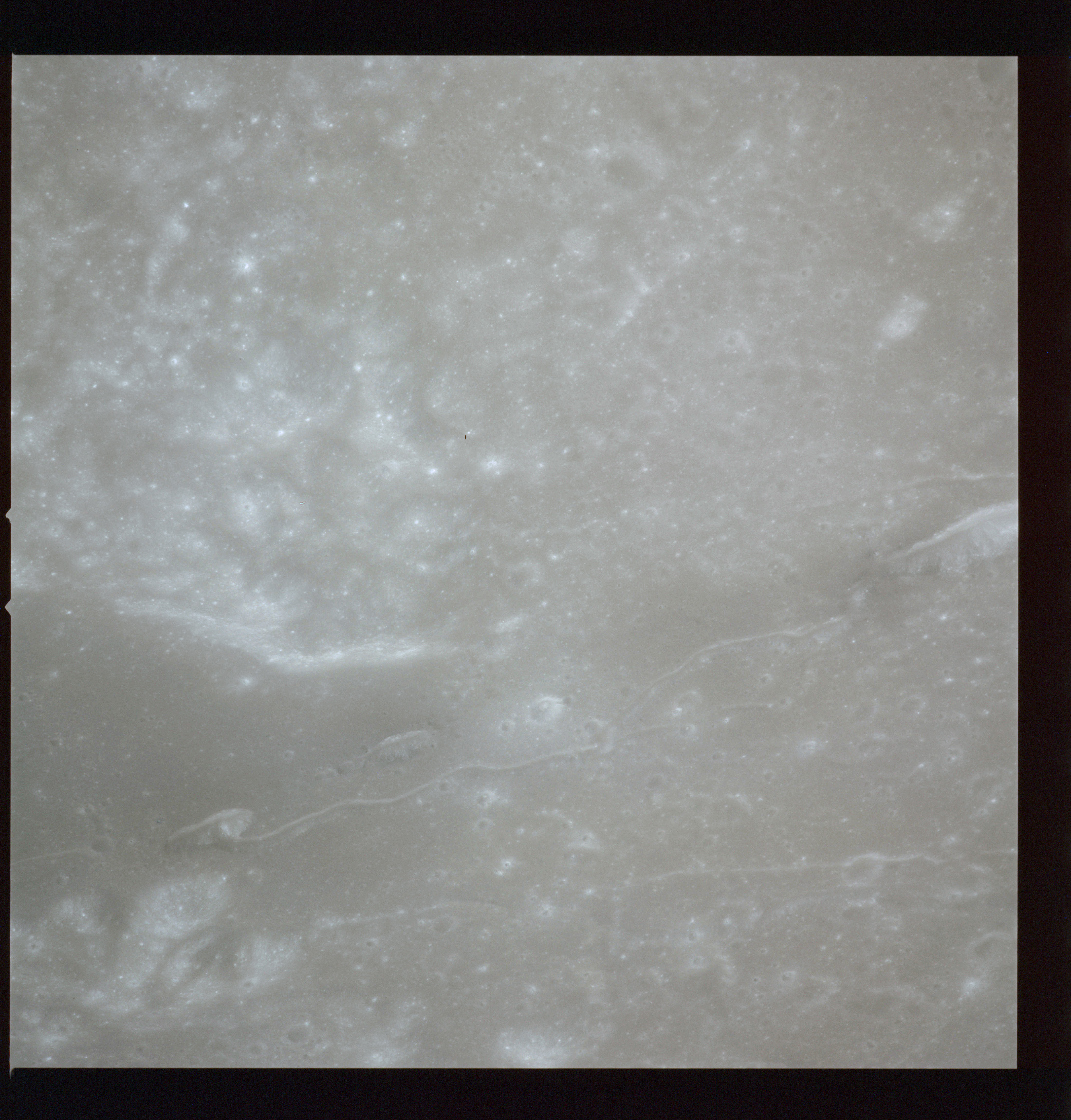 The crater to the right of the rille-producing pair is Toscanelli. The remaining ten frames on magazine PP for this pass follow slightly to the west of Toscanelli across the northern edge of the Aristarchus Plateau to Montes Agricola, finally settling on its northern end.