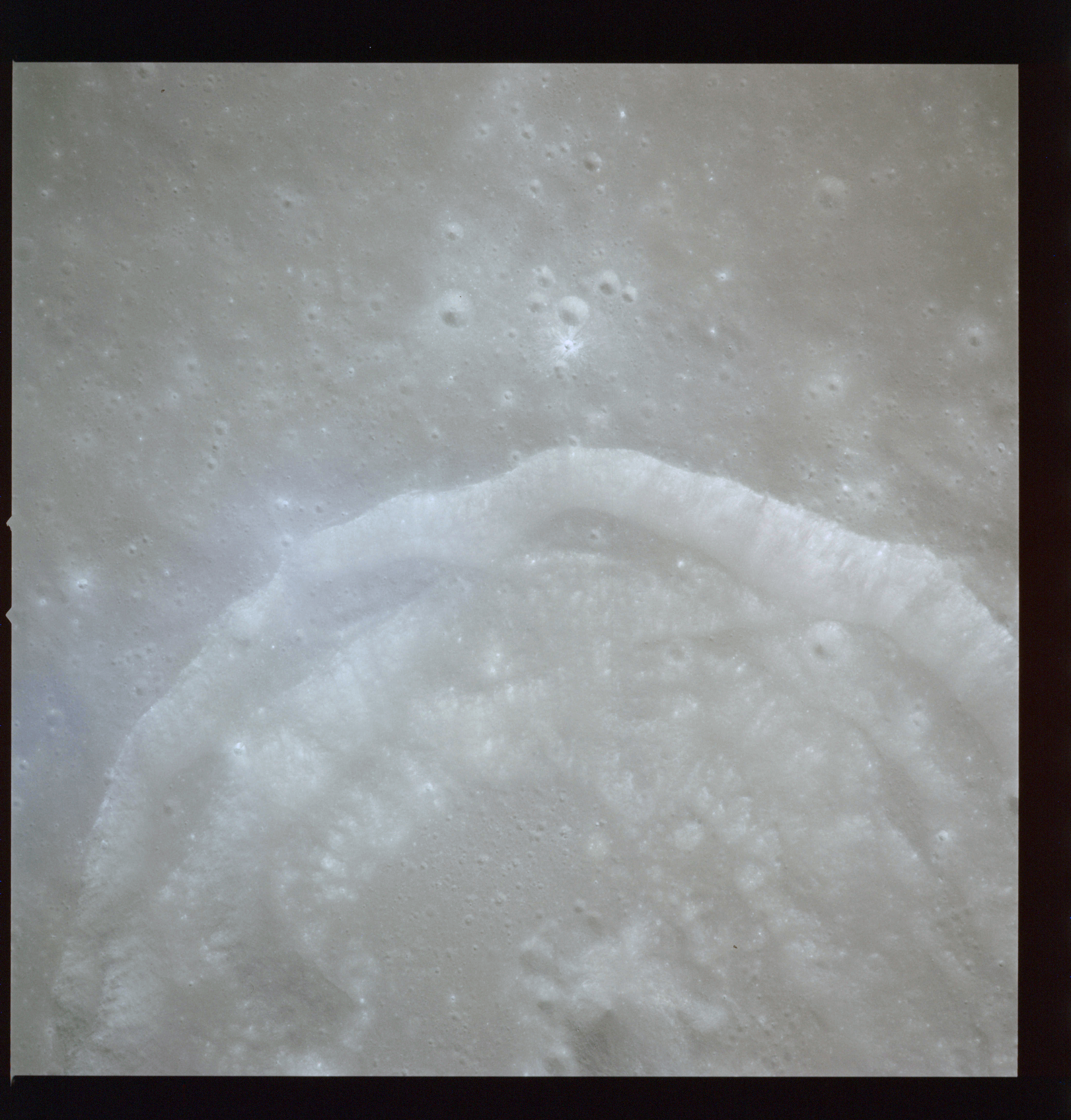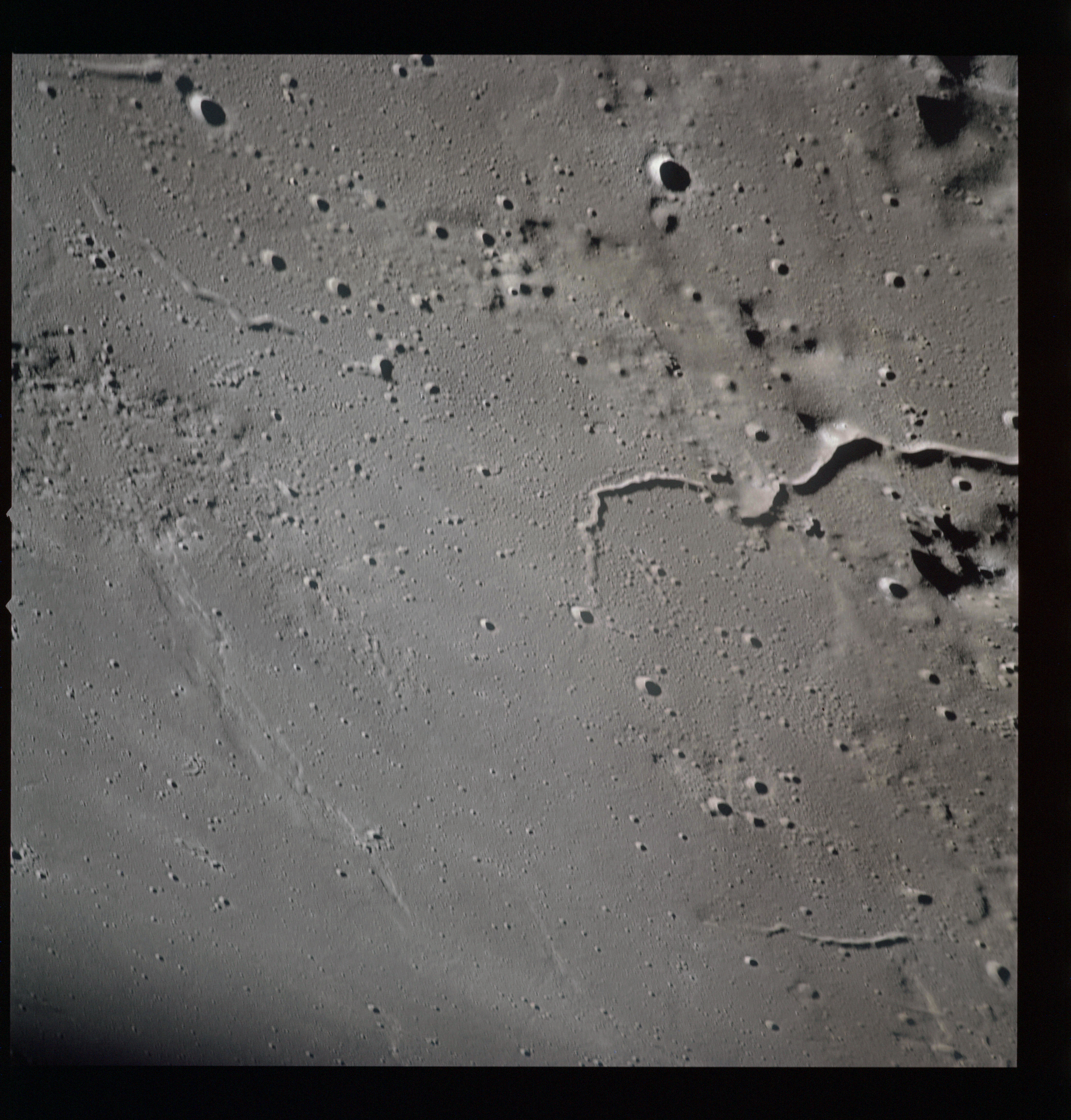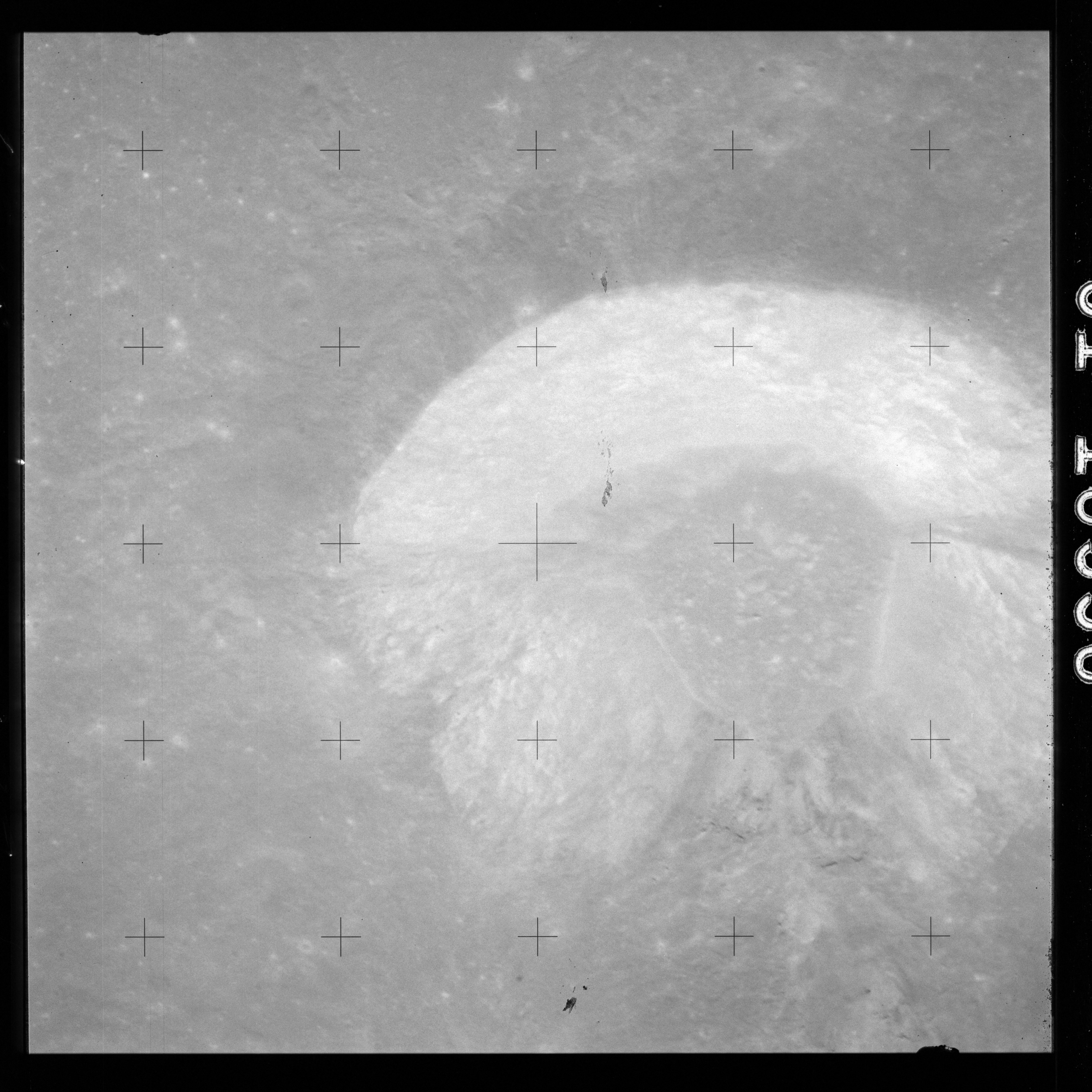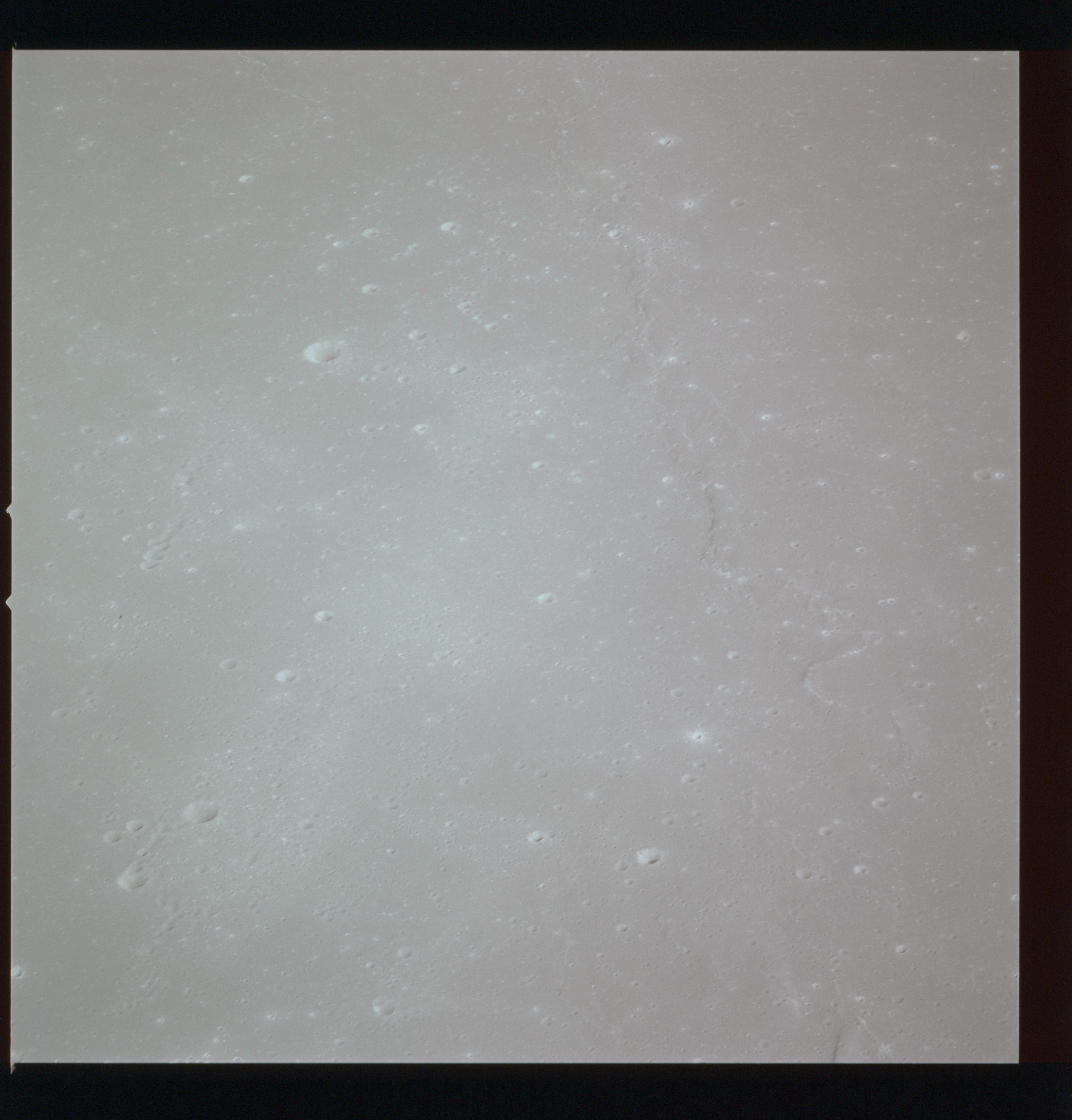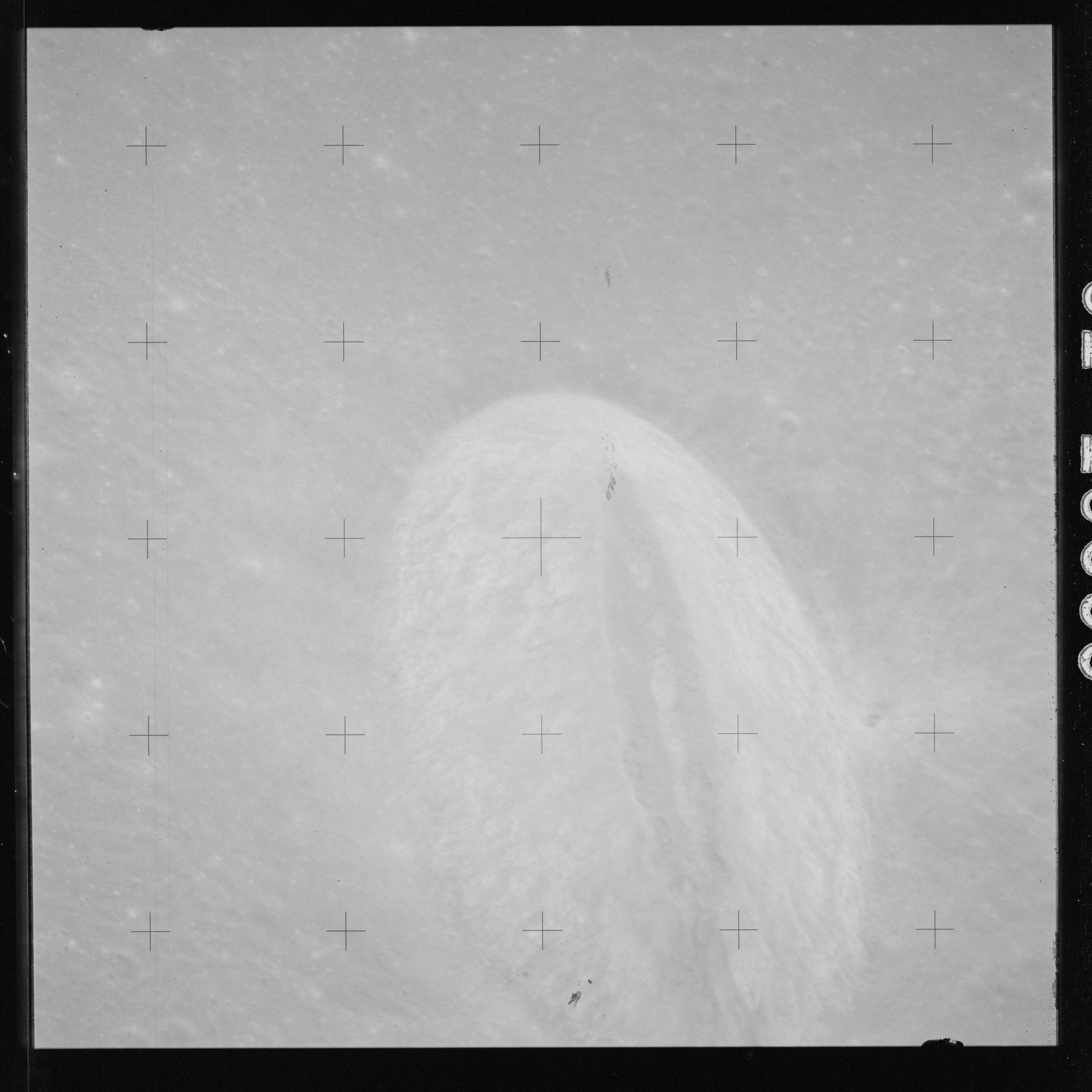 The crater to the right of the rille-producing pair is Toscanelli. The remaining ten frames on magazine PP for this pass follow slightly to the west of Toscanelli across the northern edge of the Aristarchus Plateau to Montes Agricola, finally settling on its northern end.
