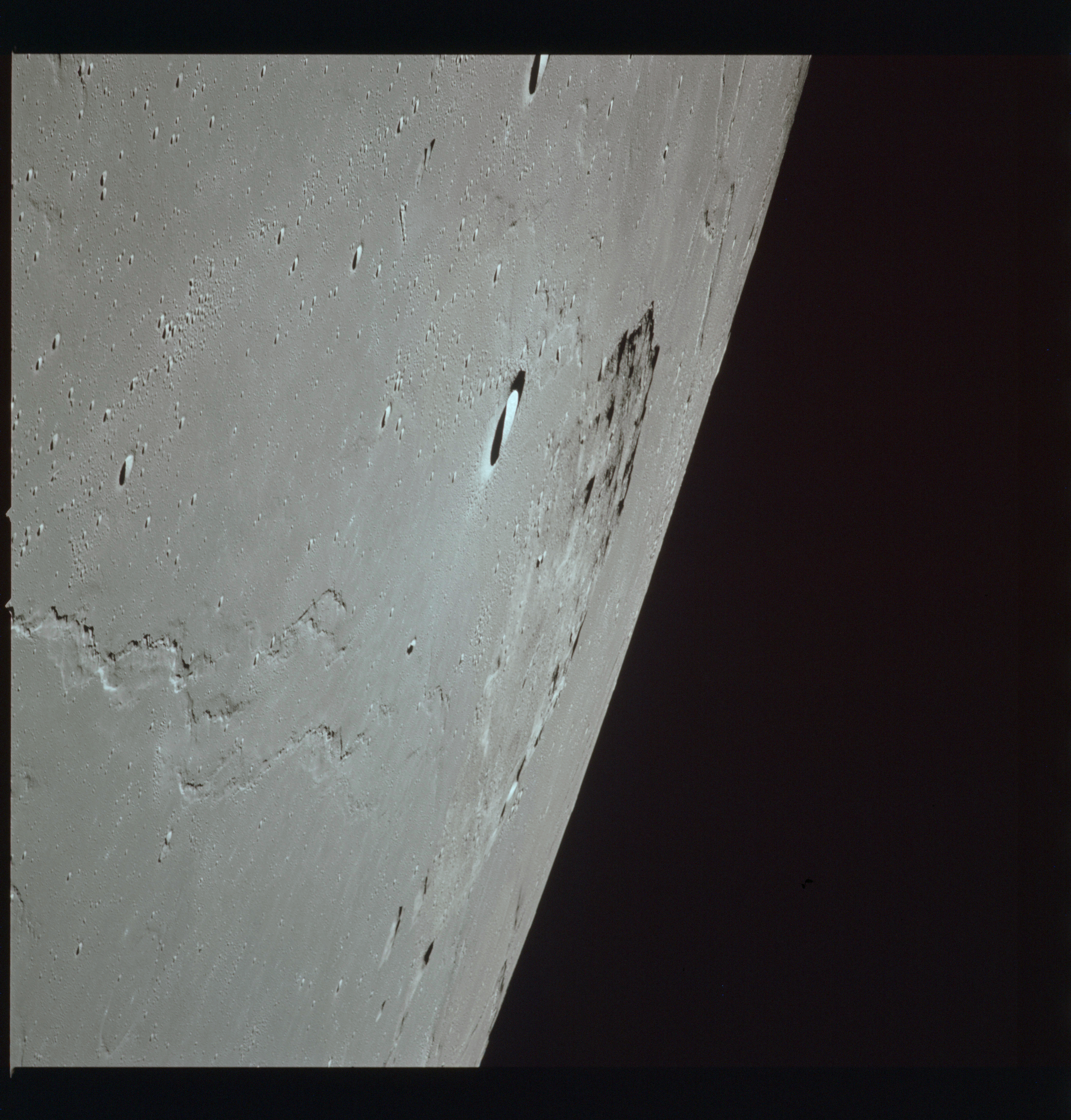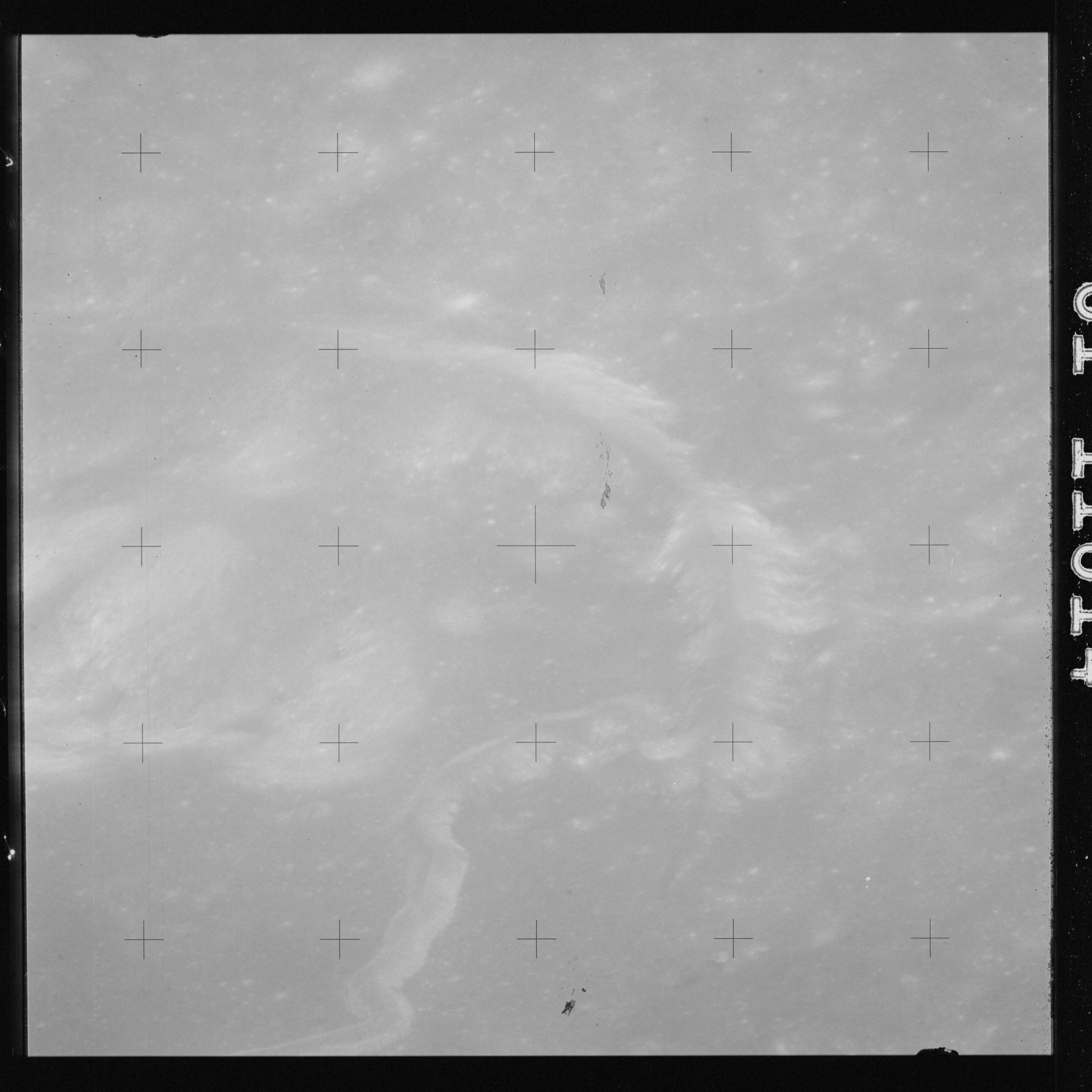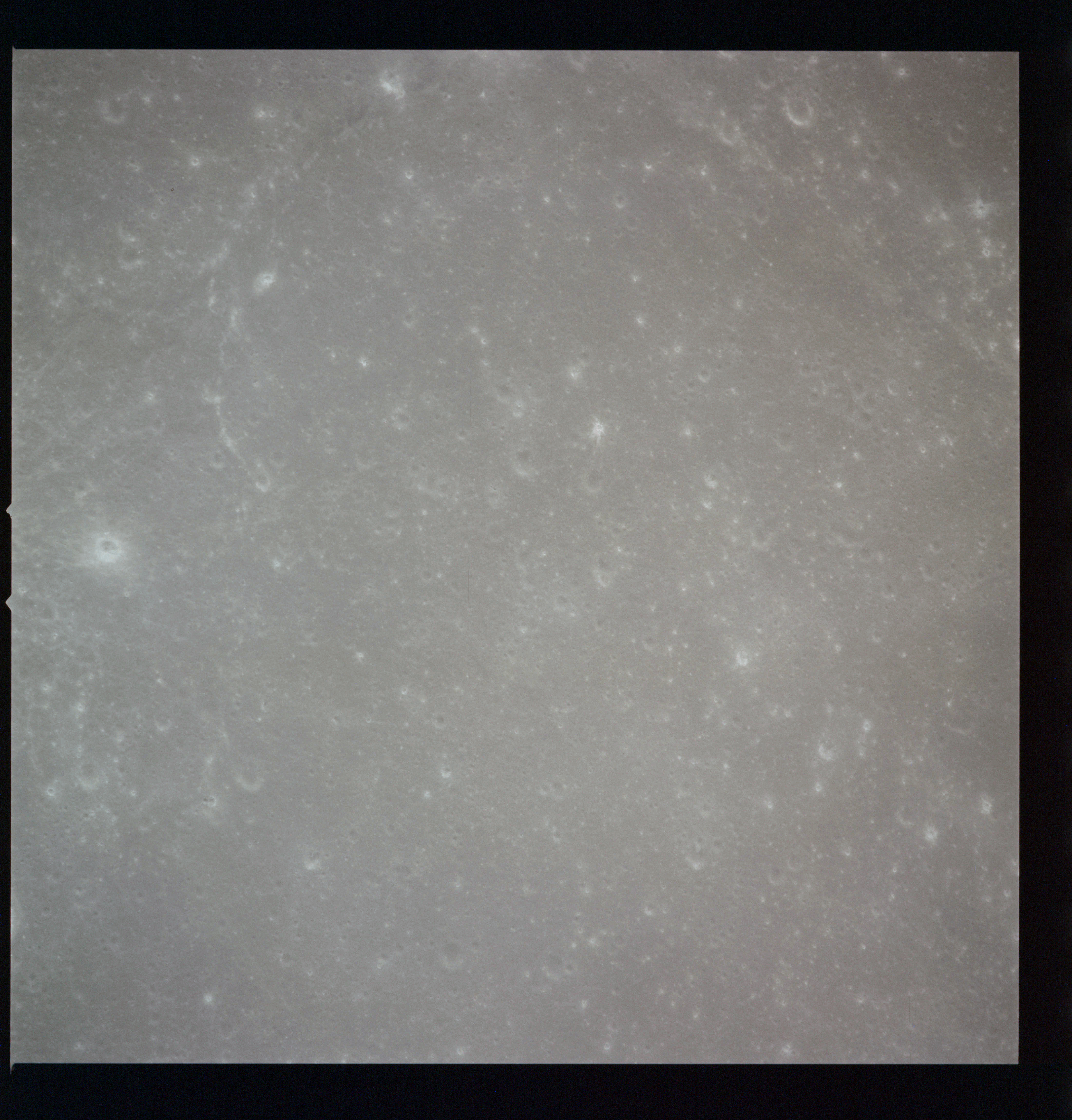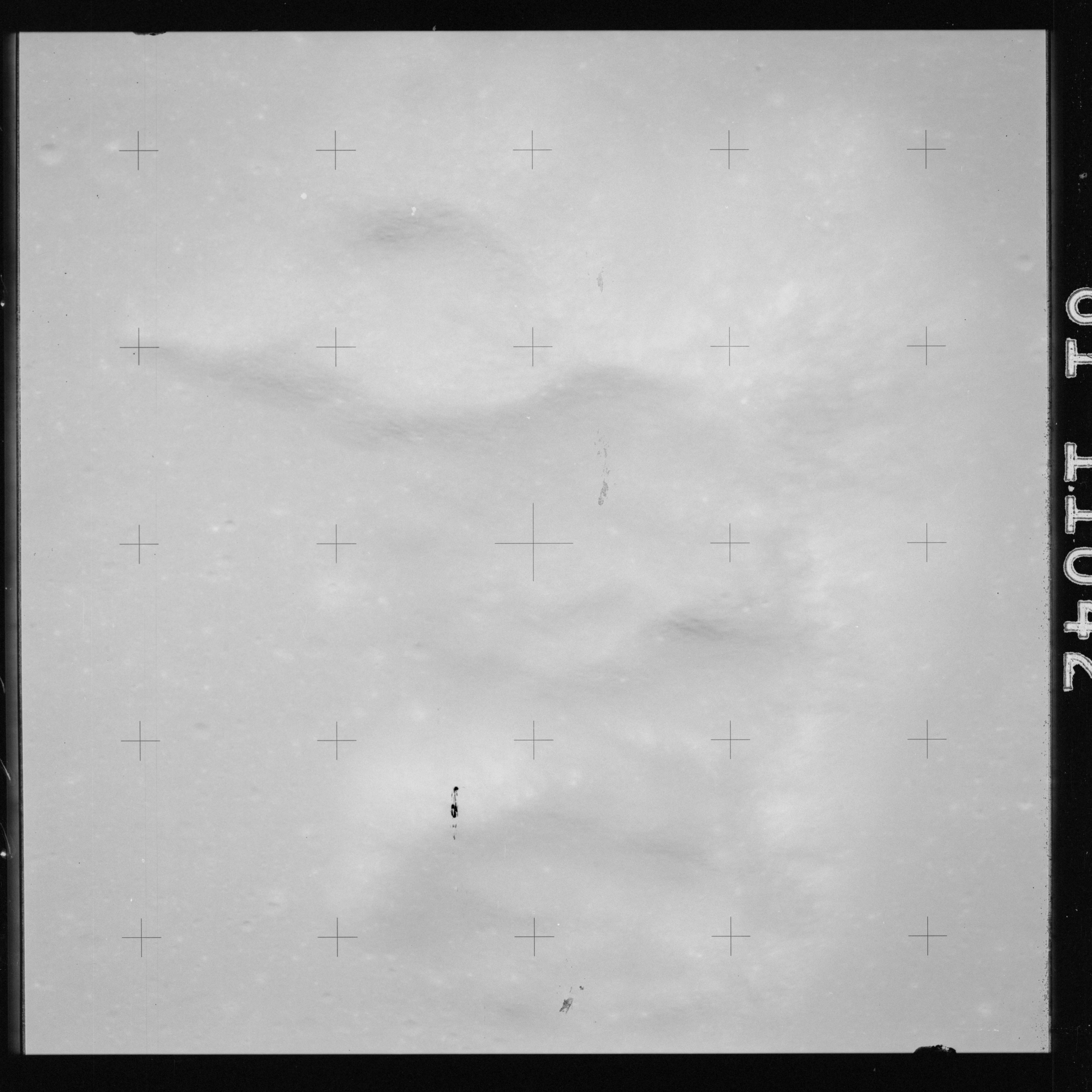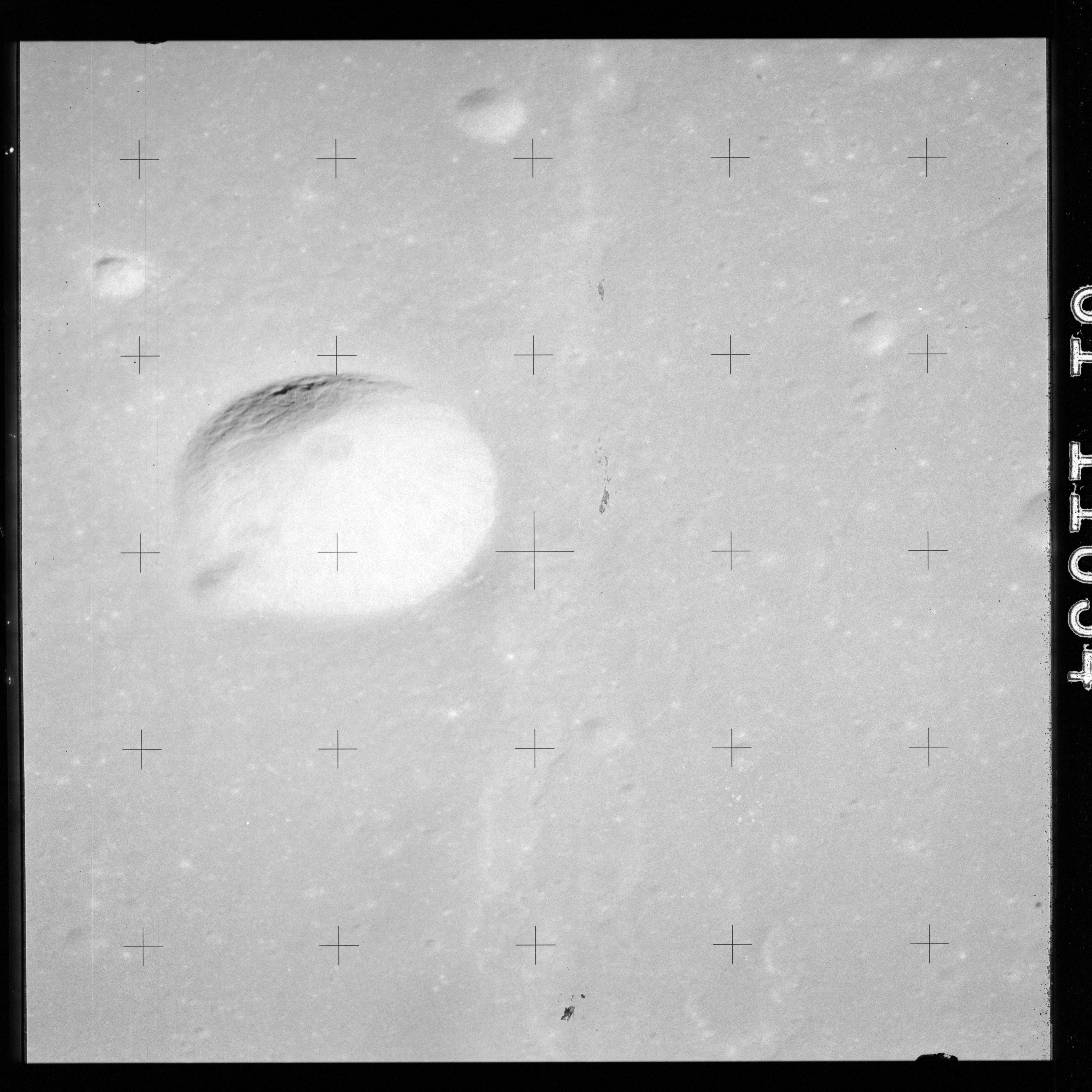The crater to the right of the rille-producing pair is Toscanelli. The remaining ten frames on magazine PP for this pass follow slightly to the west of Toscanelli across the northern edge of the Aristarchus Plateau to Montes Agricola, finally settling on its northern end.