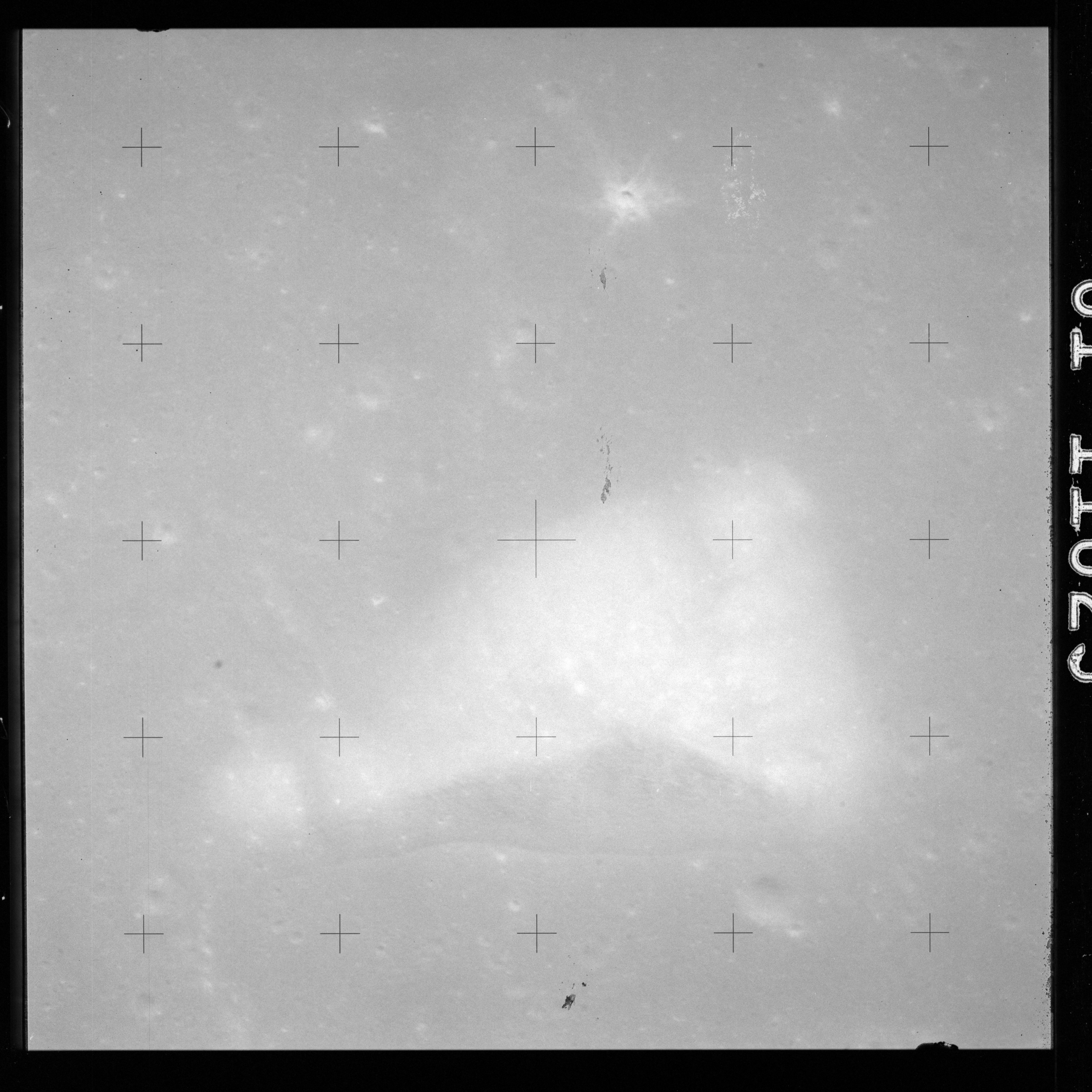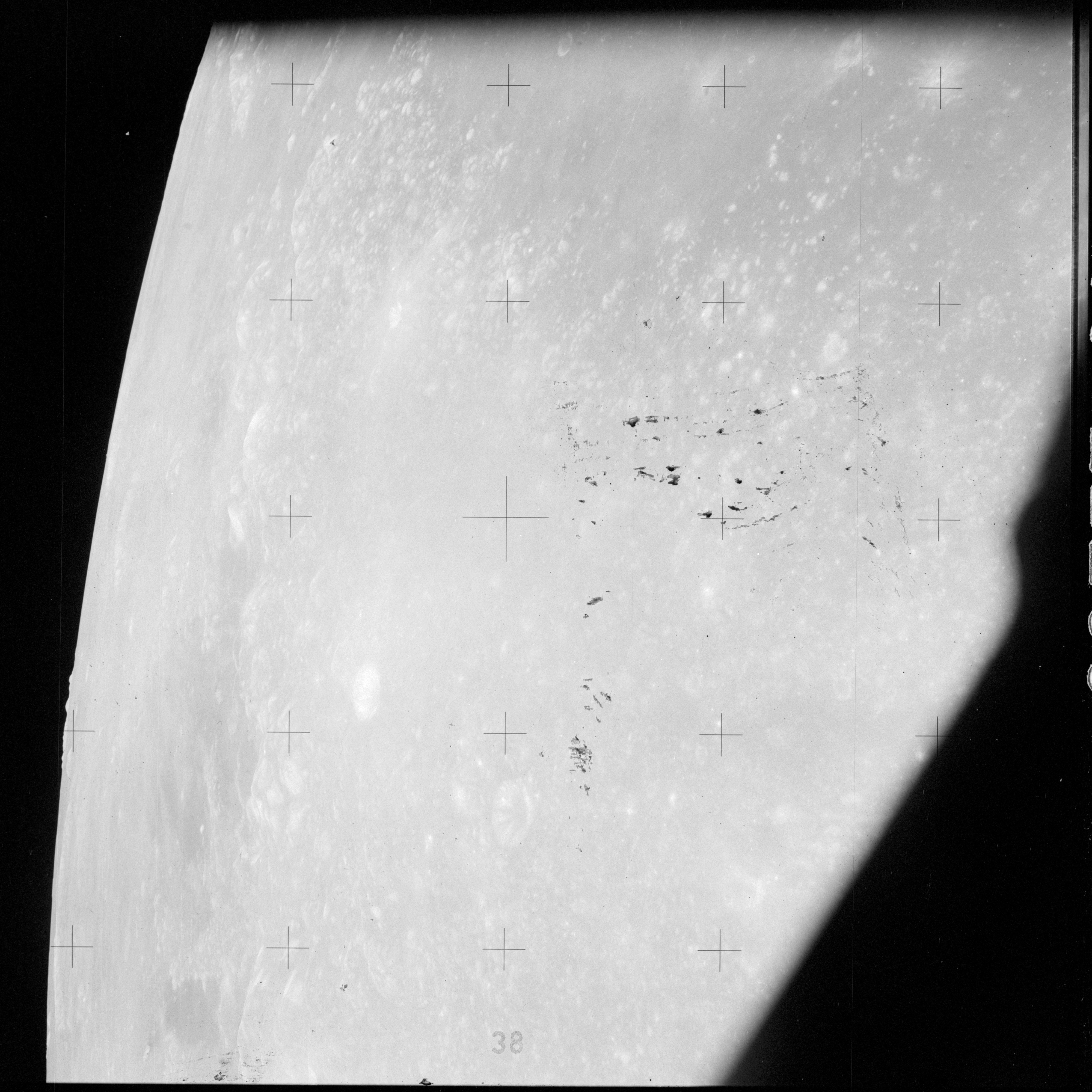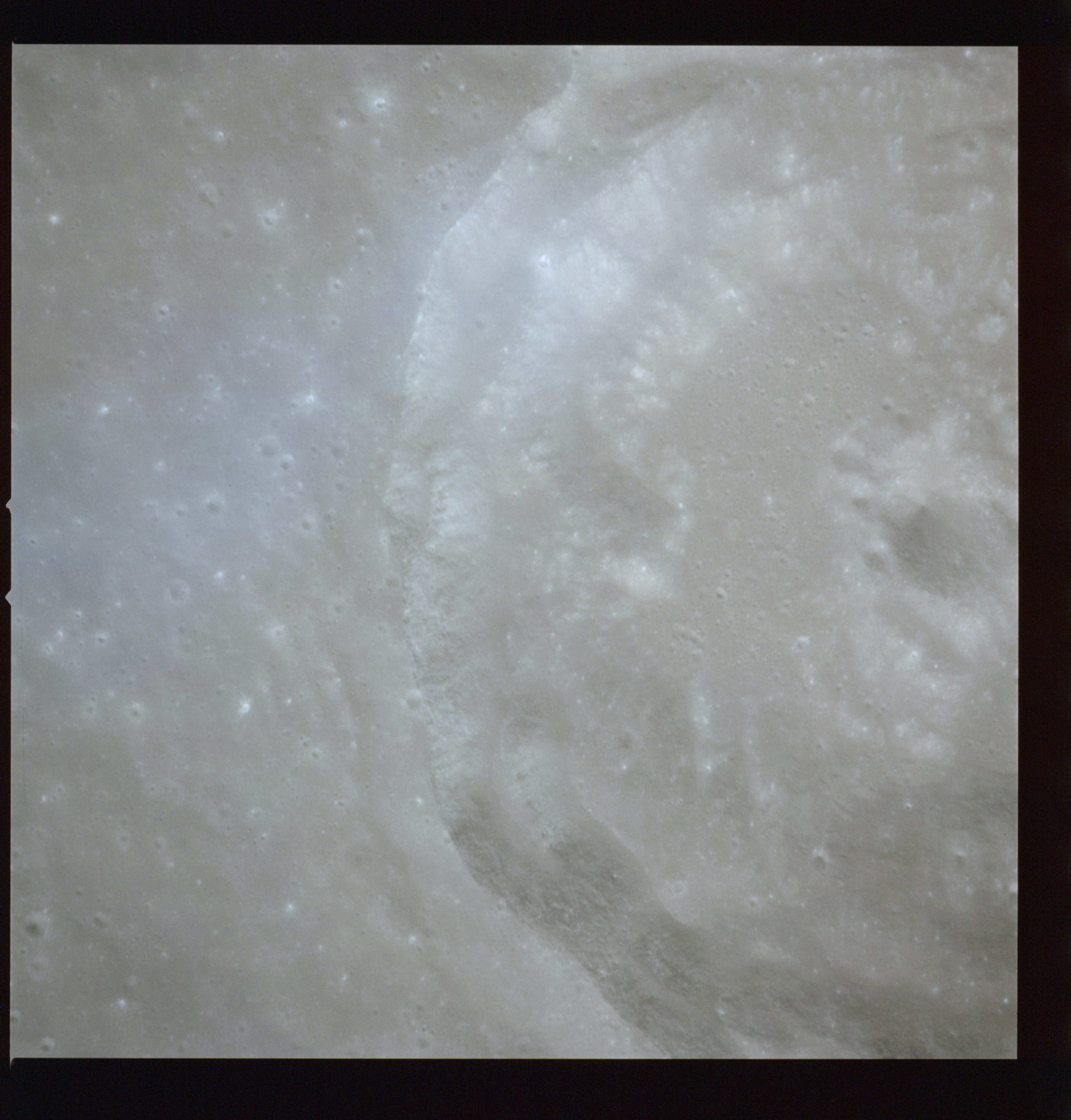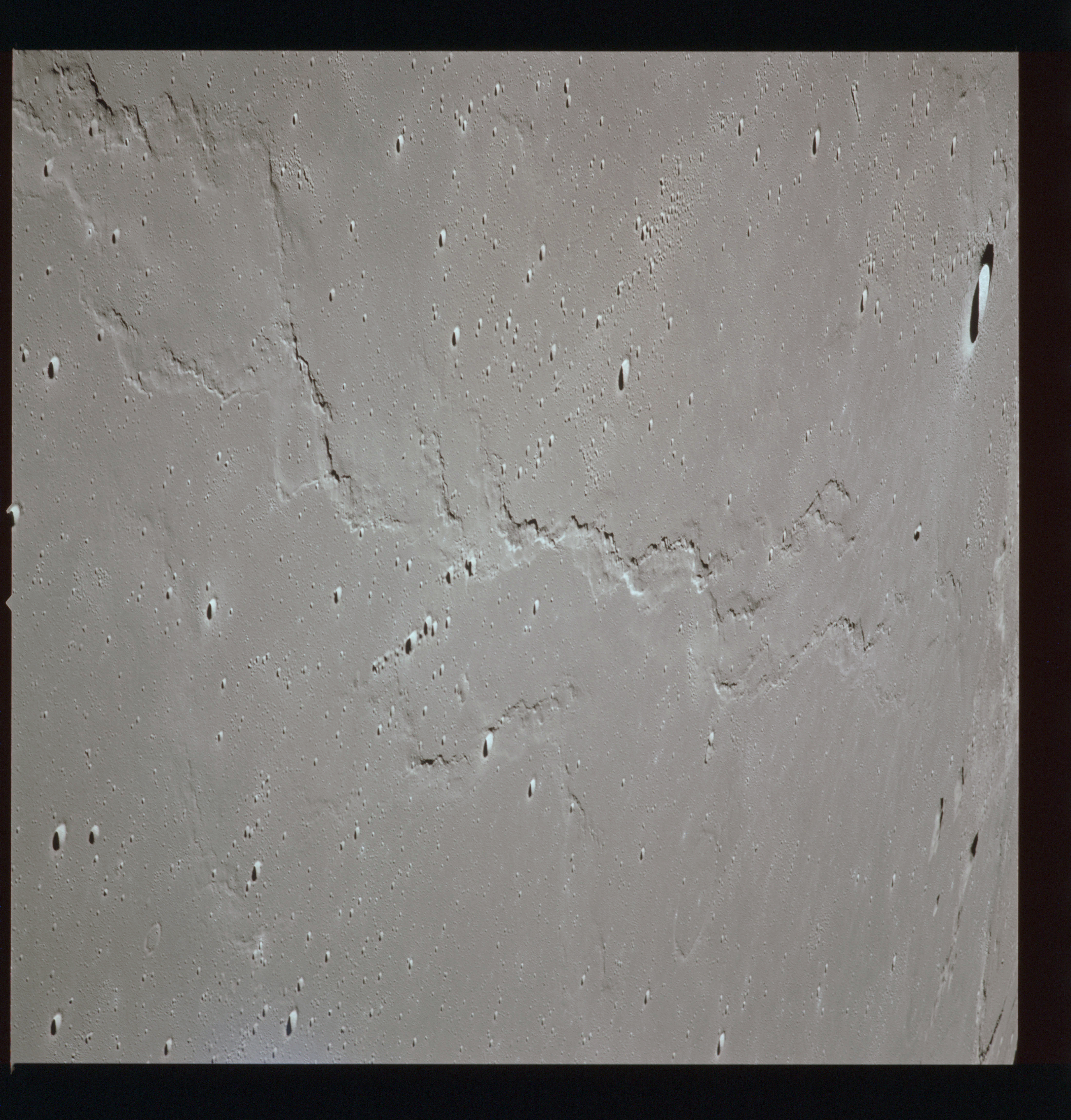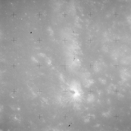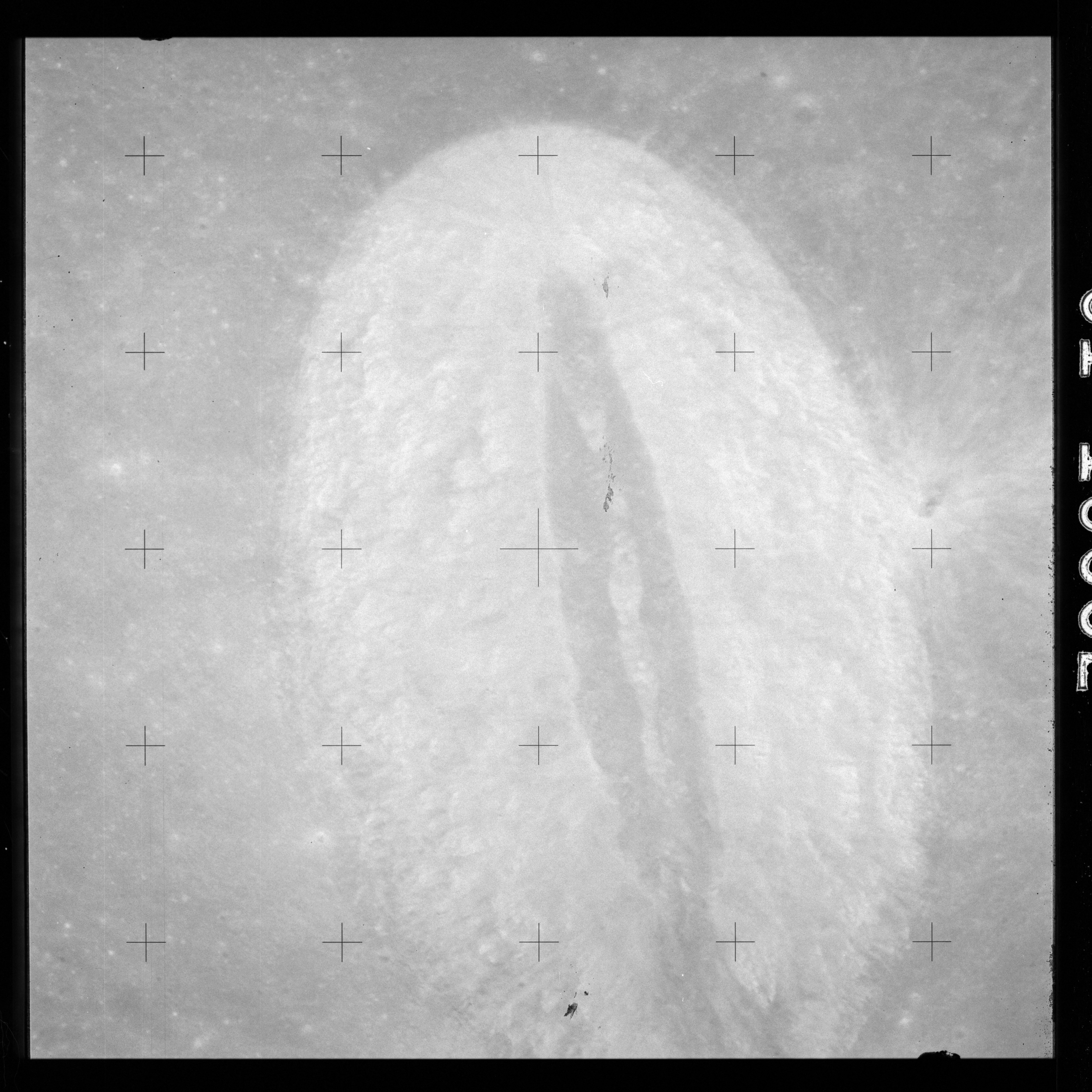 The crater to the right of the rille-producing pair is Toscanelli. The remaining ten frames on magazine PP for this pass follow slightly to the west of Toscanelli across the northern edge of the Aristarchus Plateau to Montes Agricola, finally settling on its northern end.