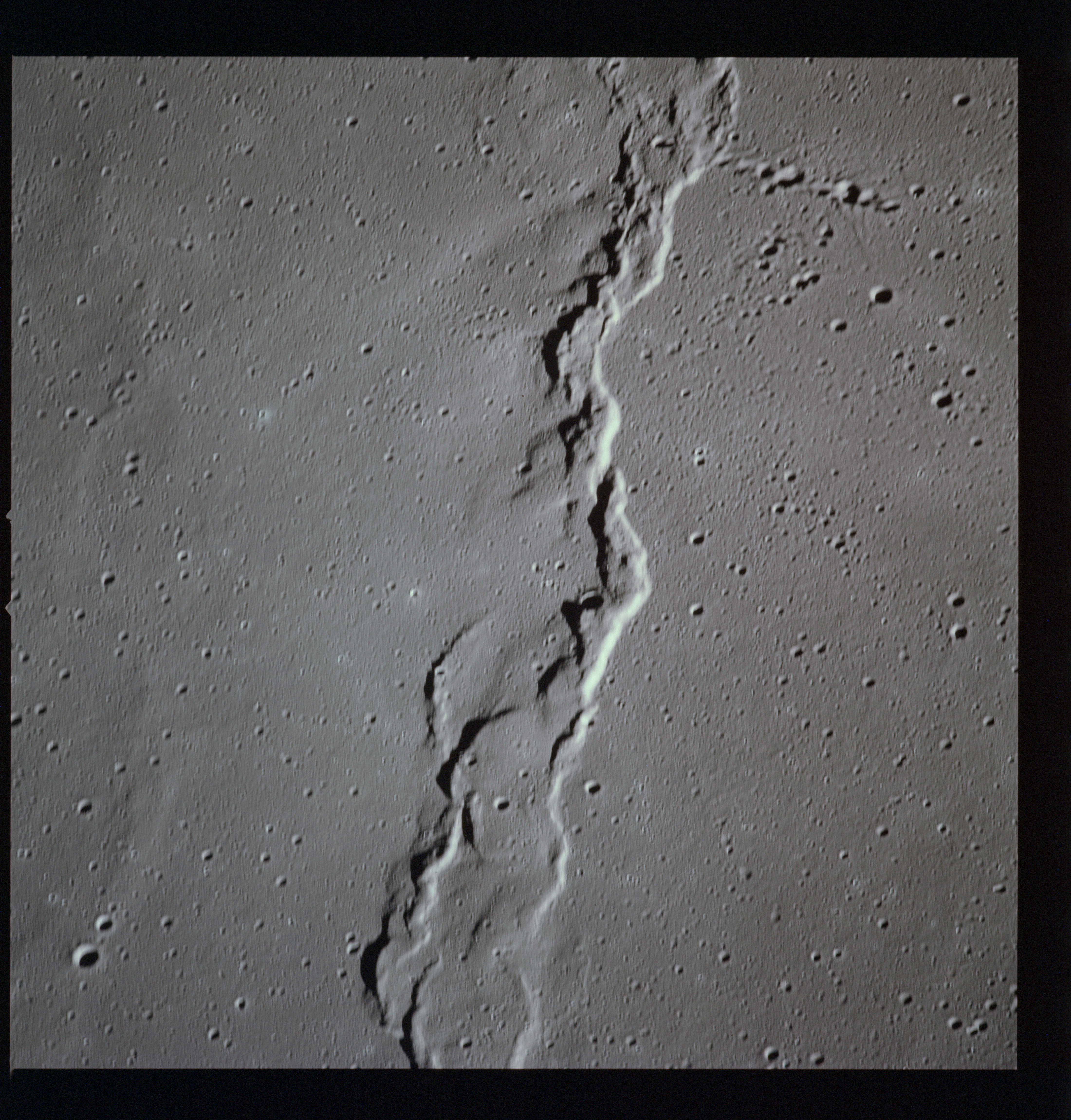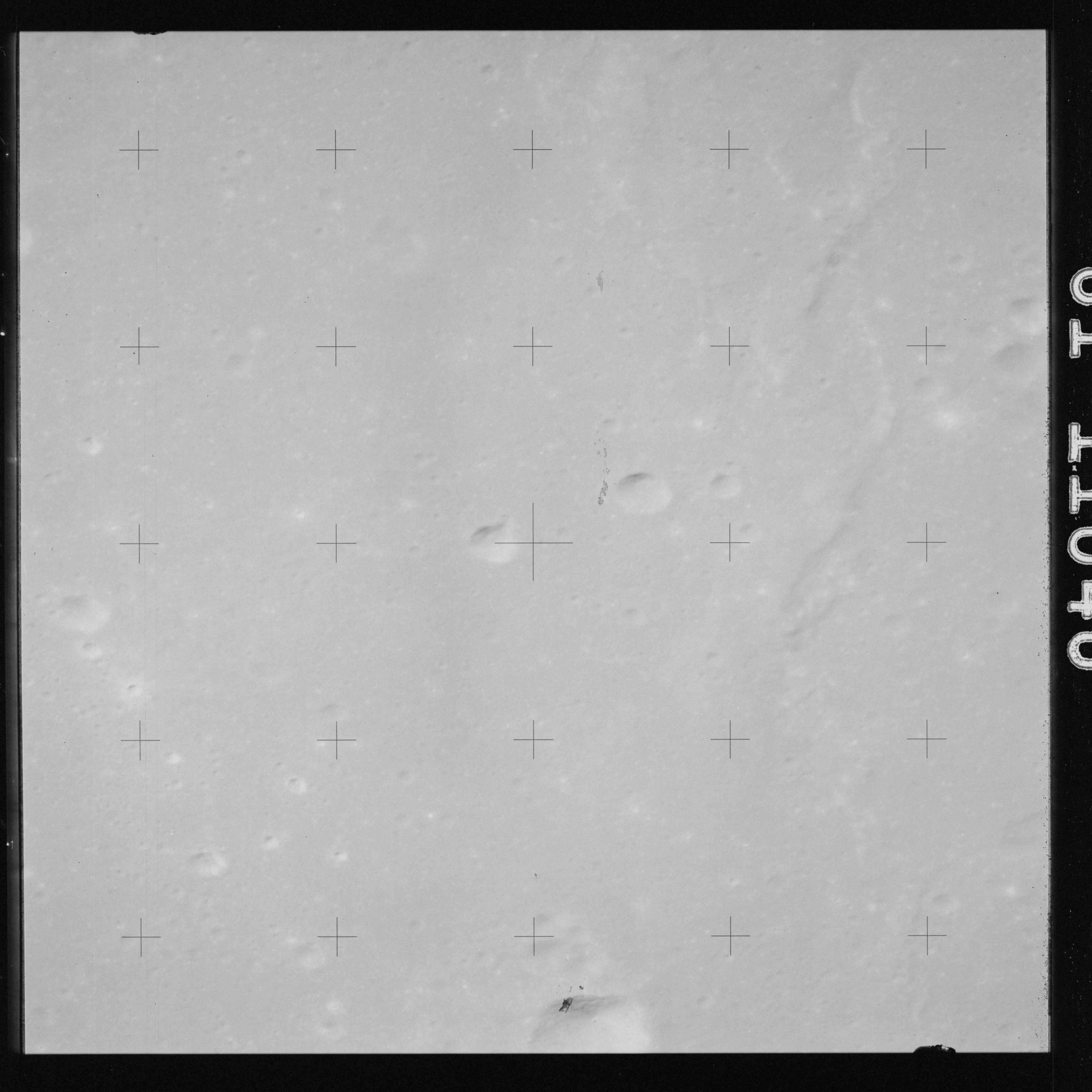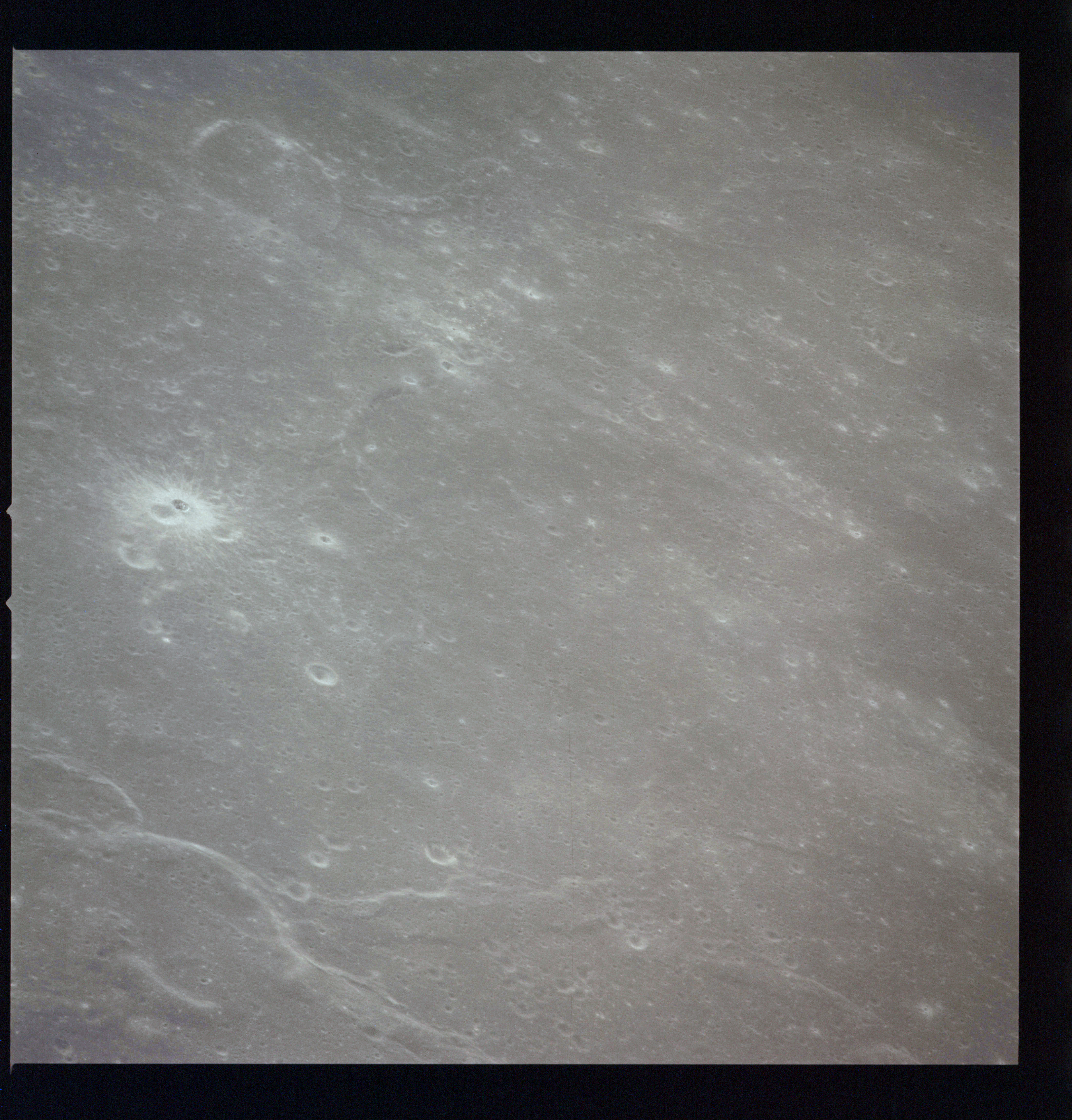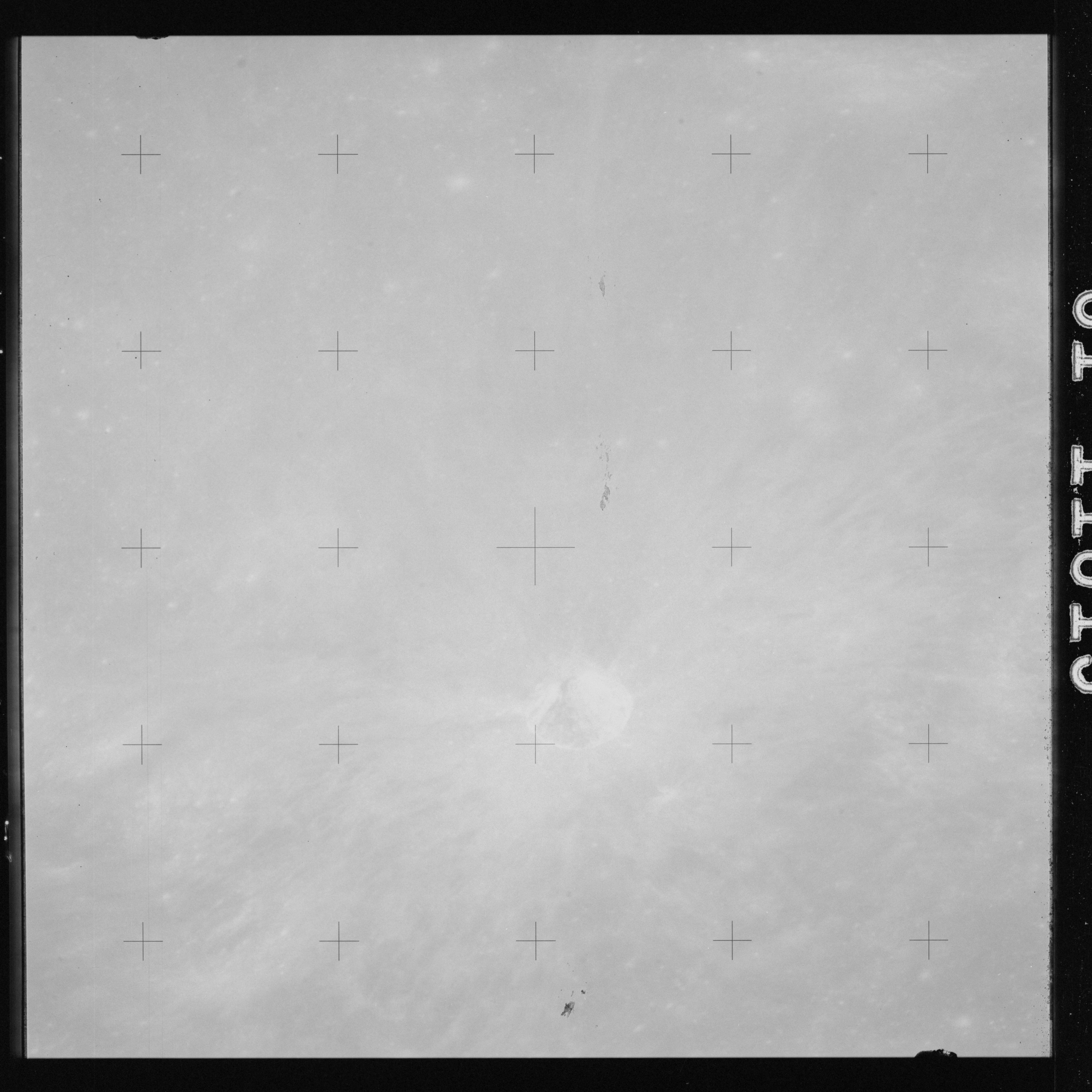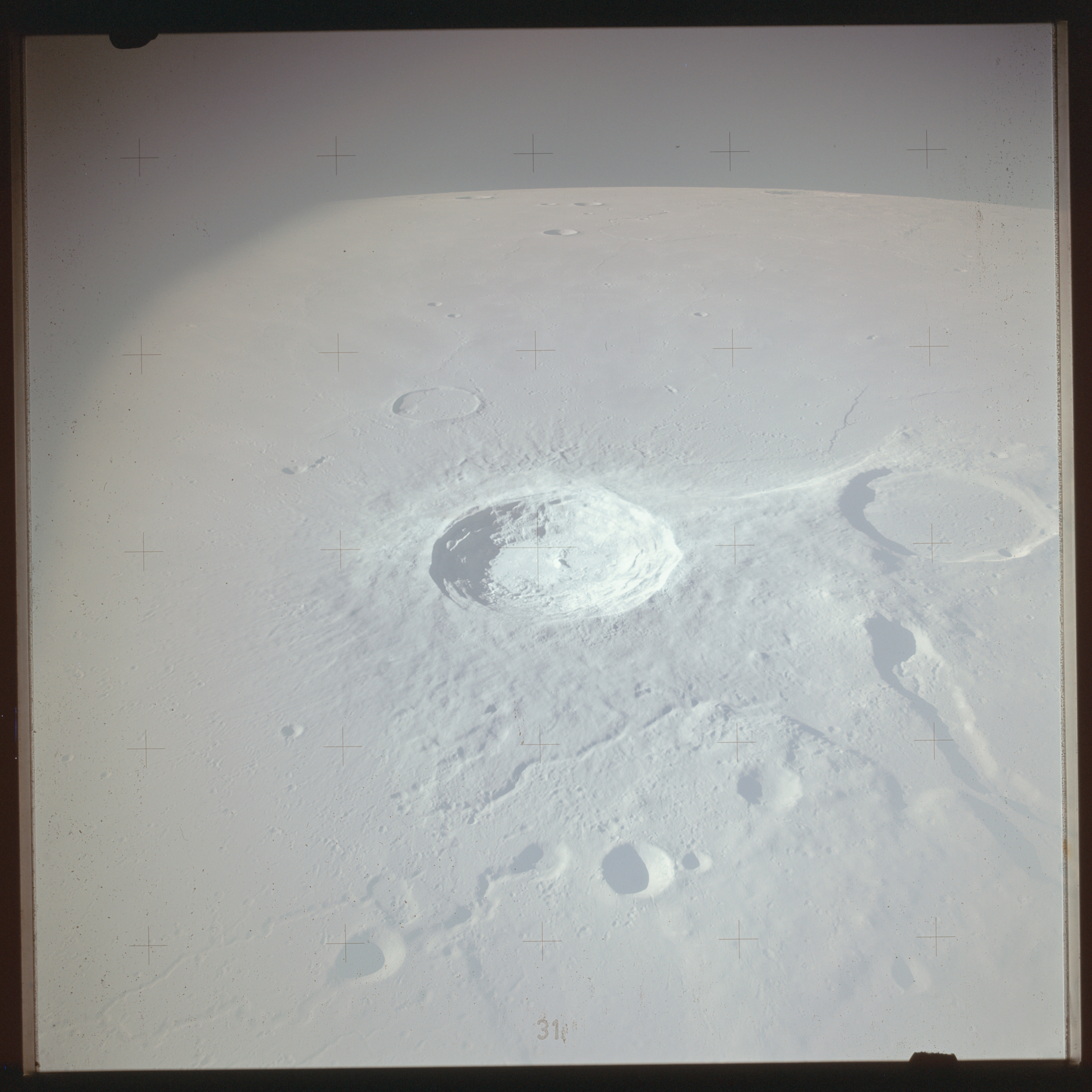 The crater to the right of the rille-producing pair is Toscanelli. The remaining ten frames on magazine PP for this pass follow slightly to the west of Toscanelli across the northern edge of the Aristarchus Plateau to Montes Agricola, finally settling on its northern end.