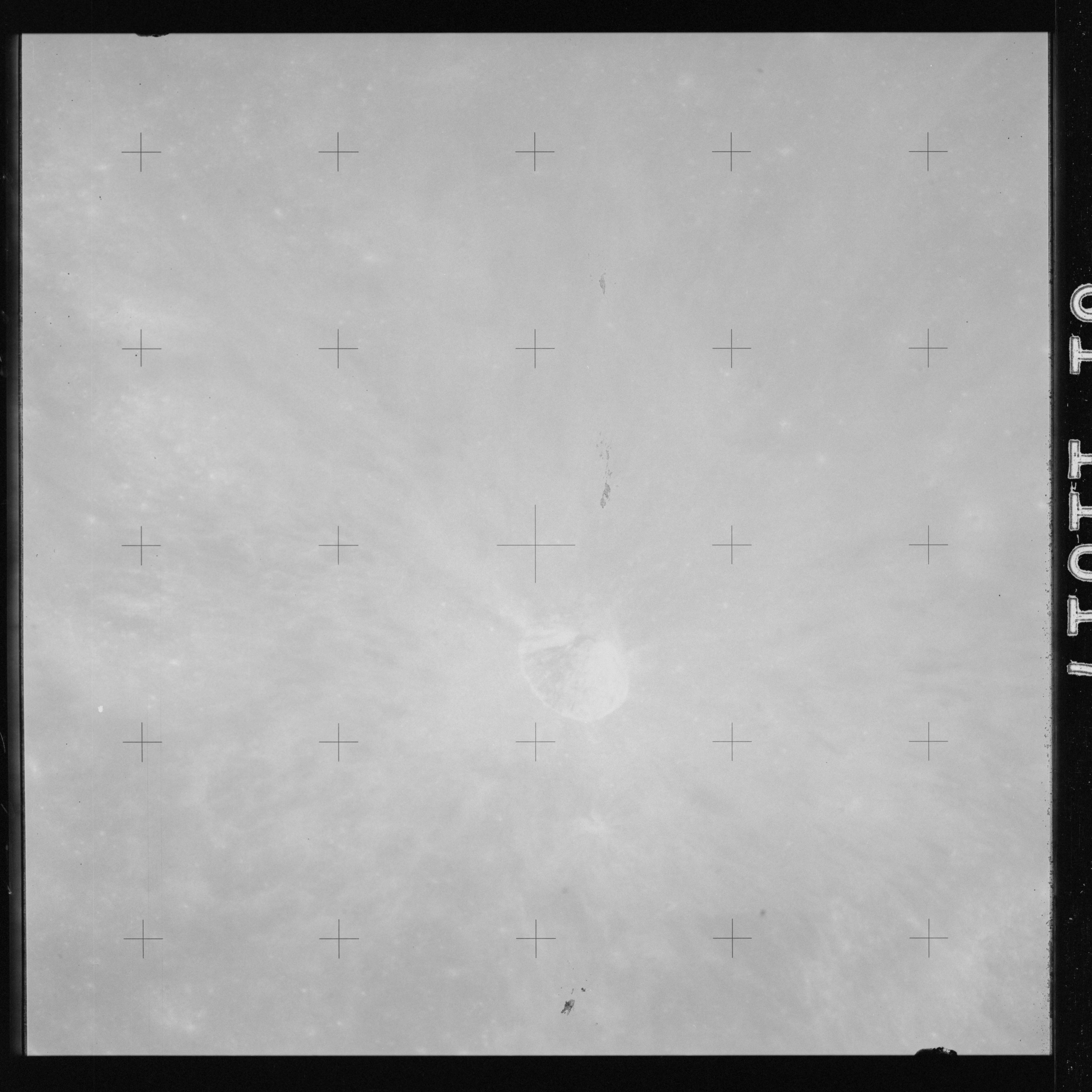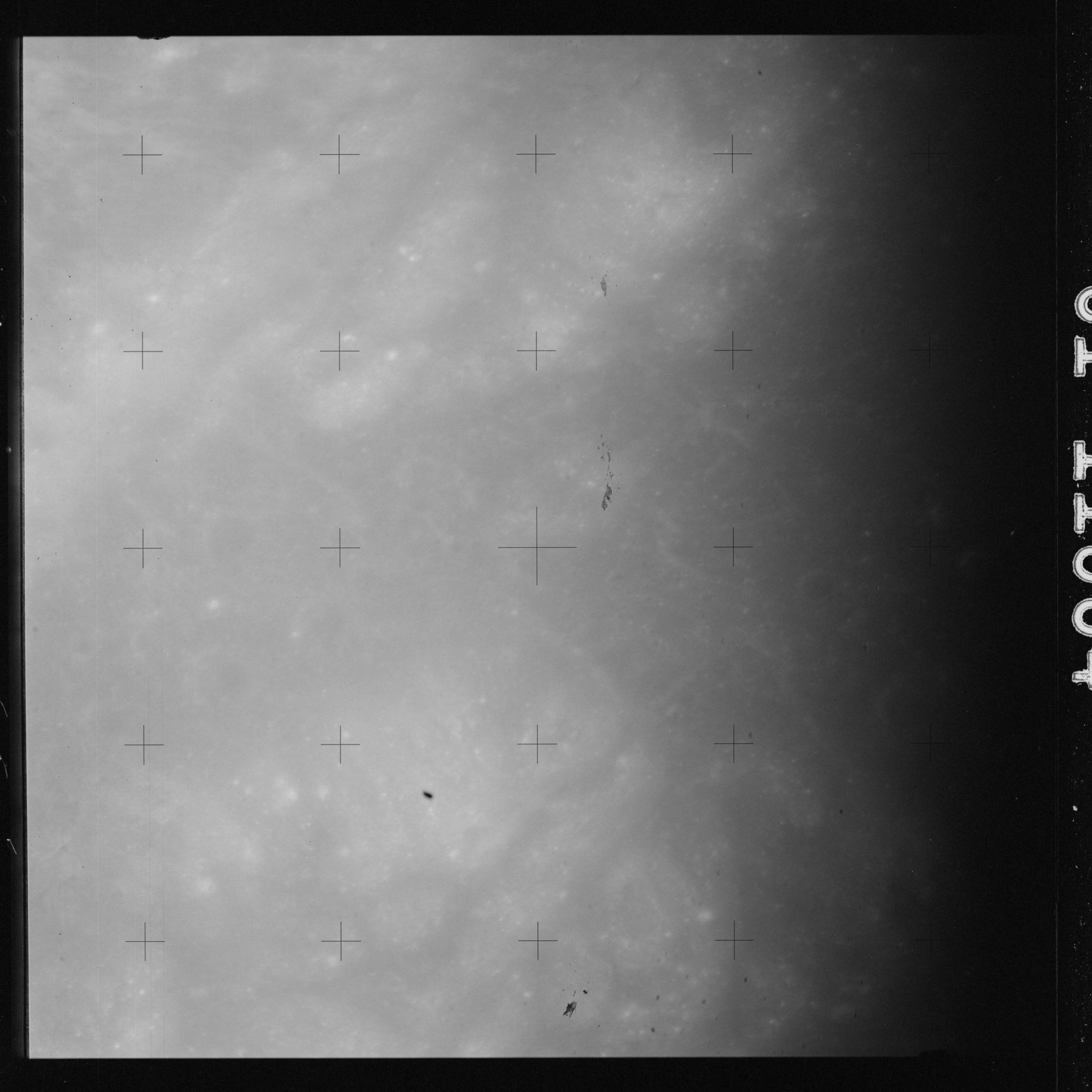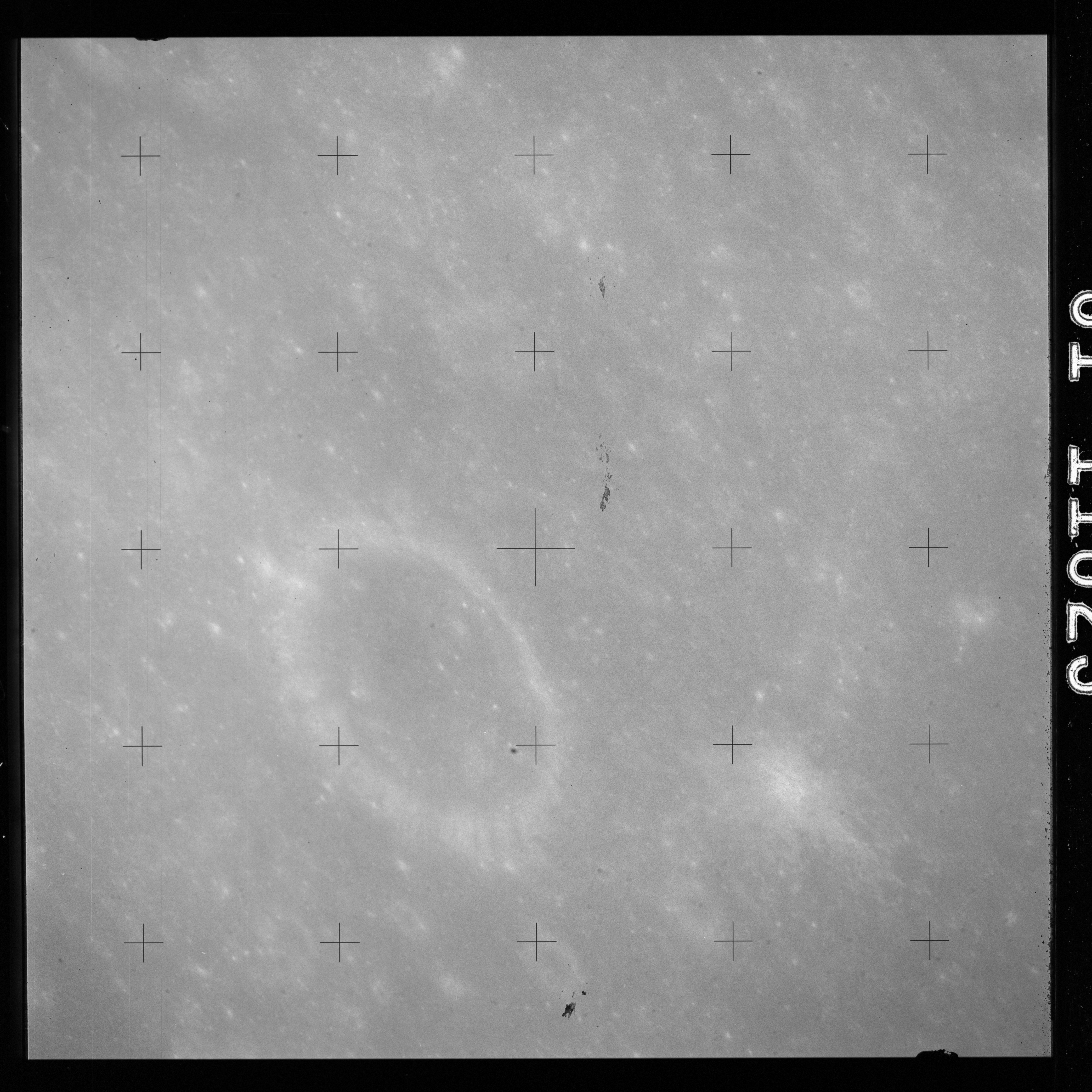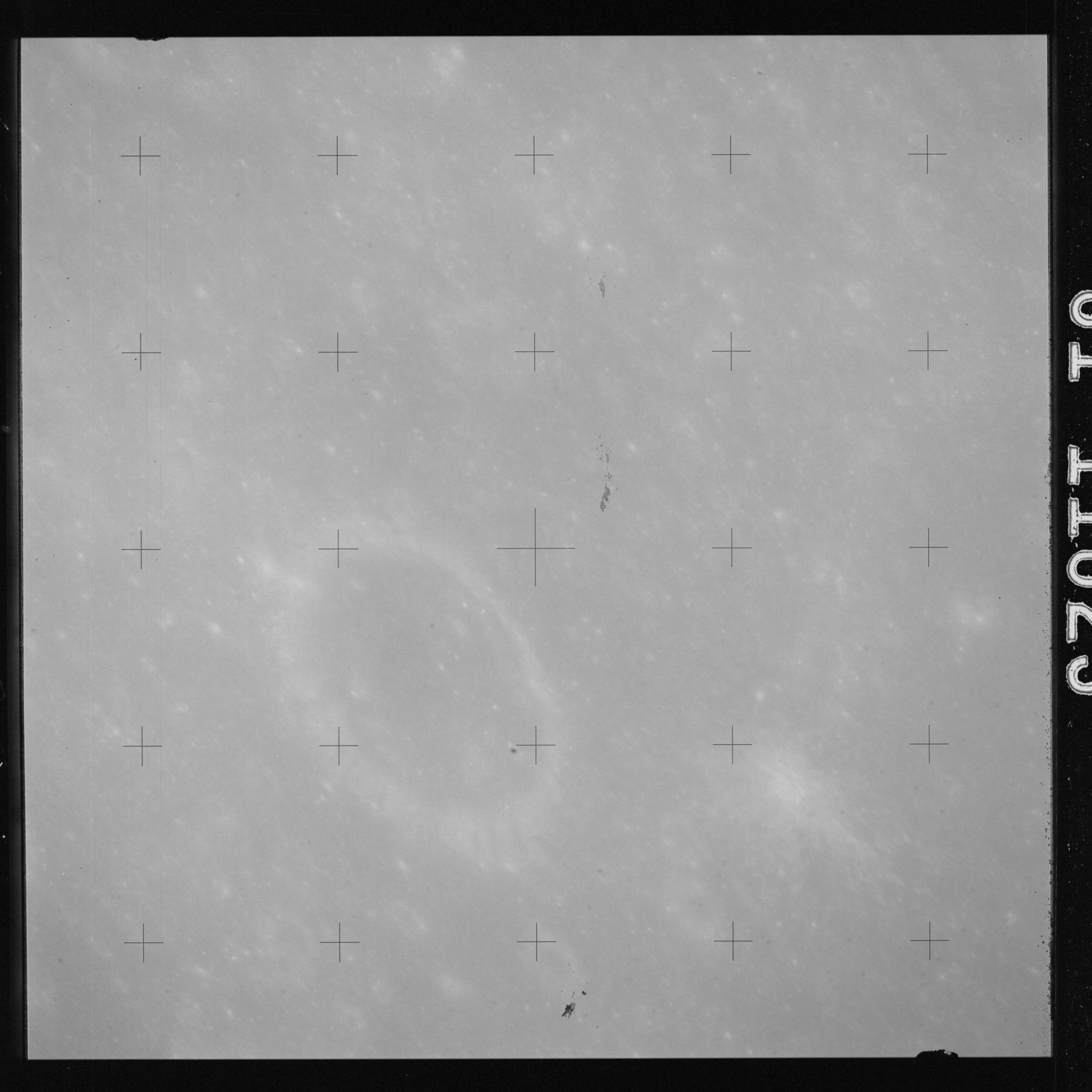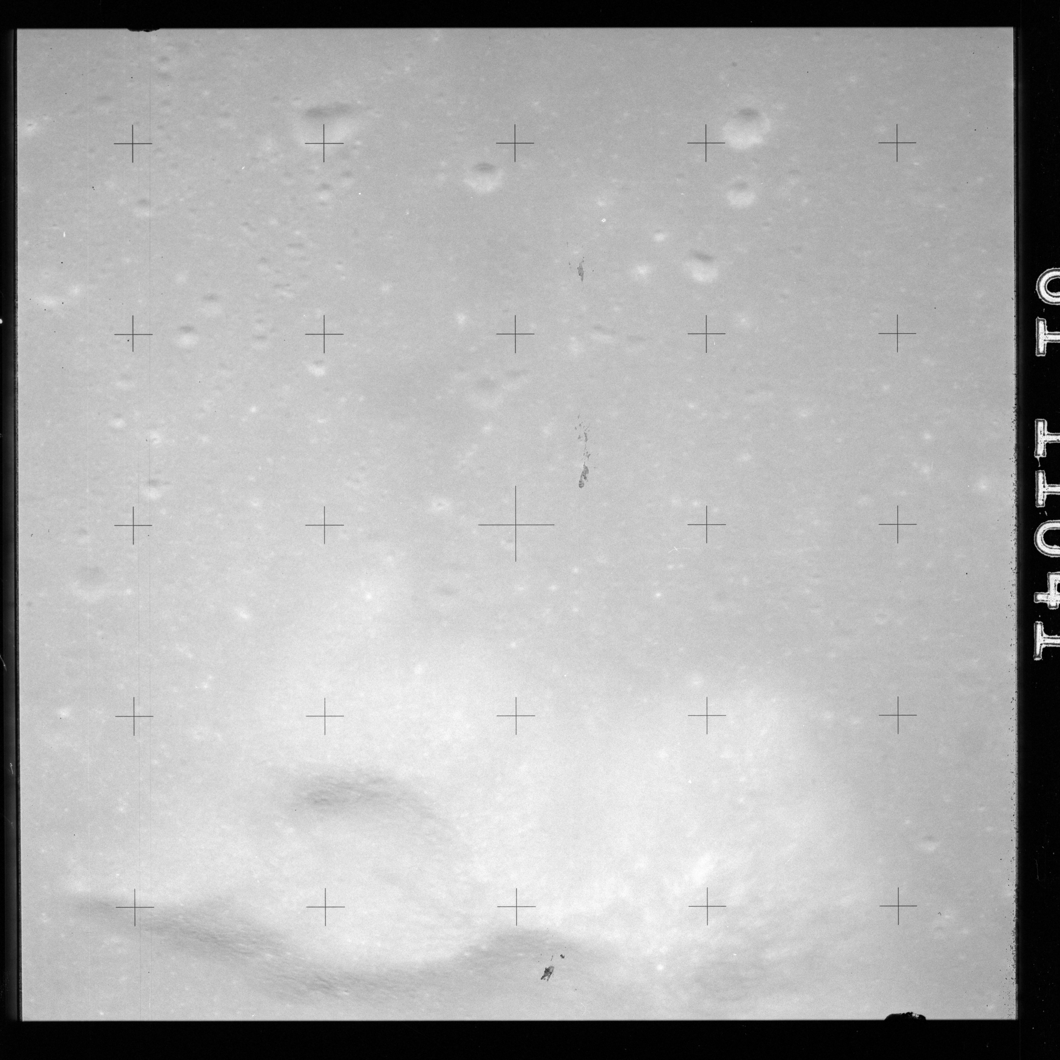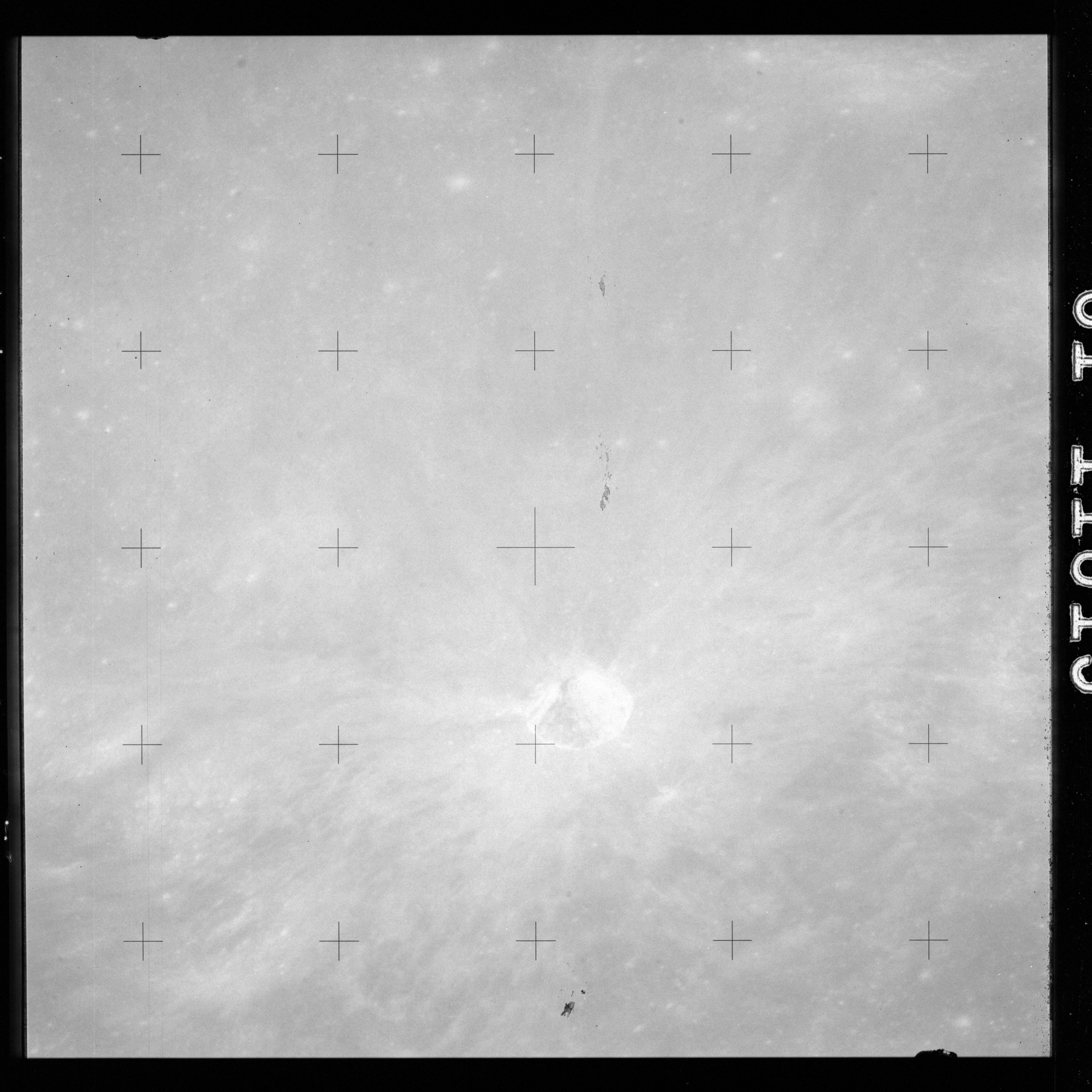 The crater to the right of the rille-producing pair is Toscanelli. The remaining ten frames on magazine PP for this pass follow slightly to the west of Toscanelli across the northern edge of the Aristarchus Plateau to Montes Agricola, finally settling on its northern end.