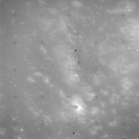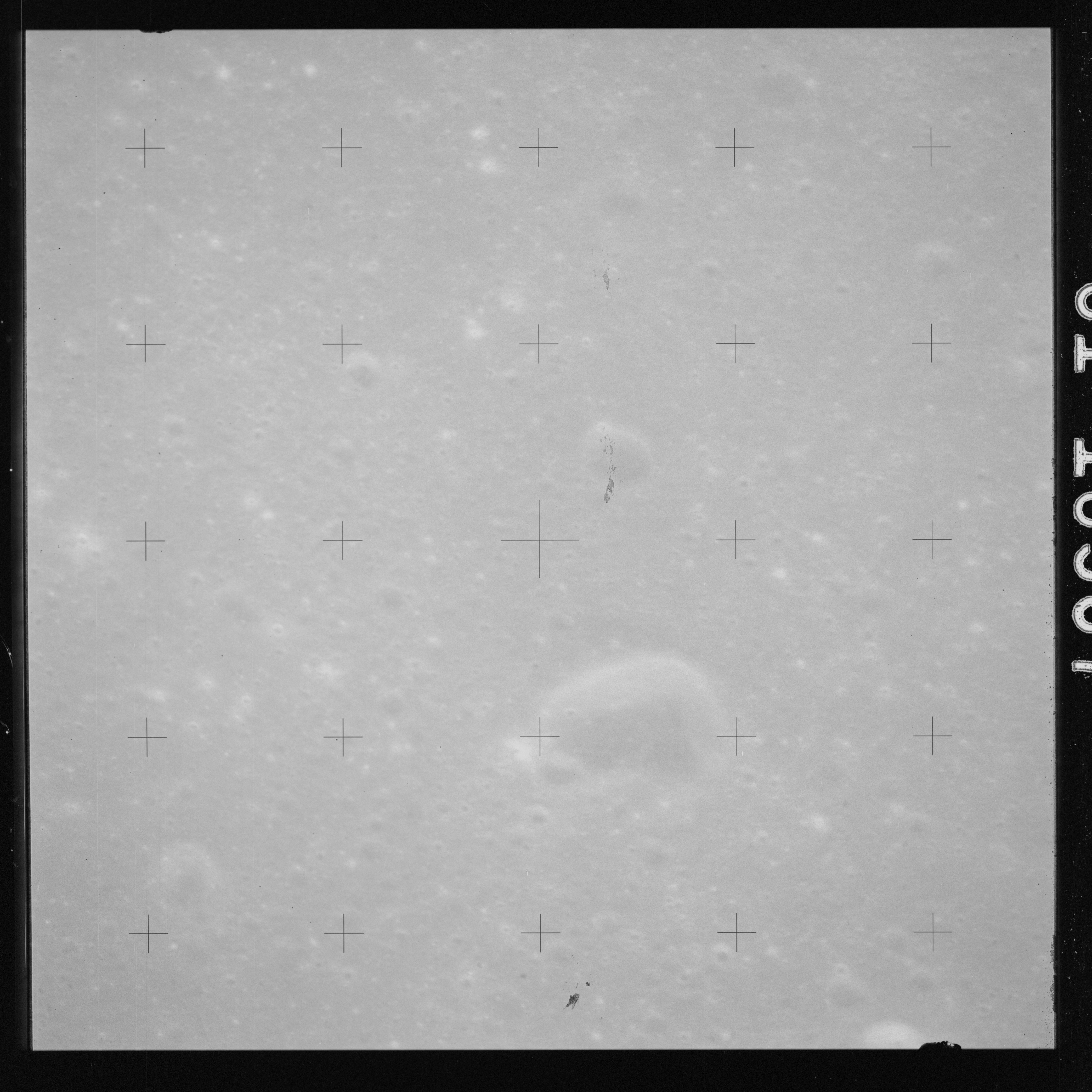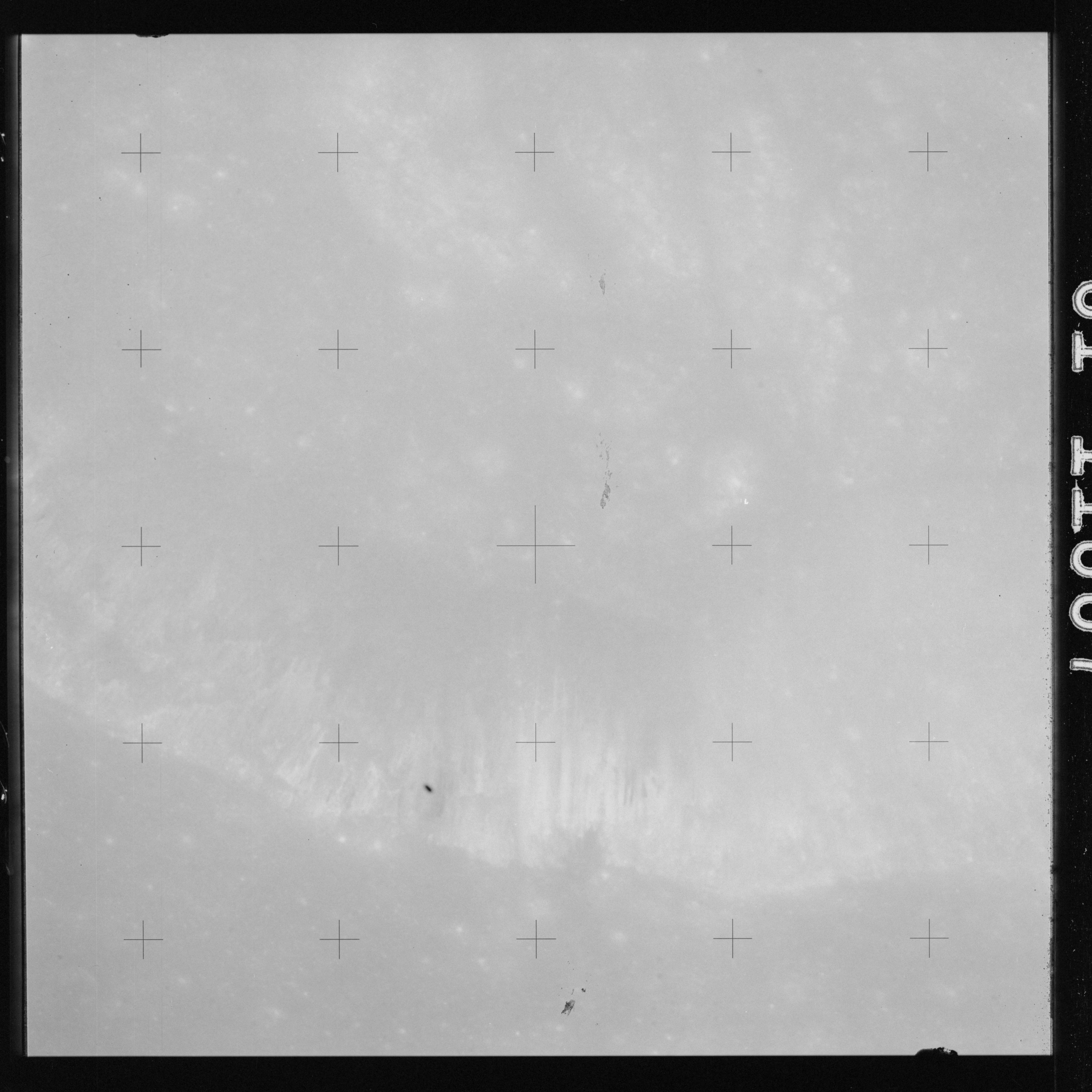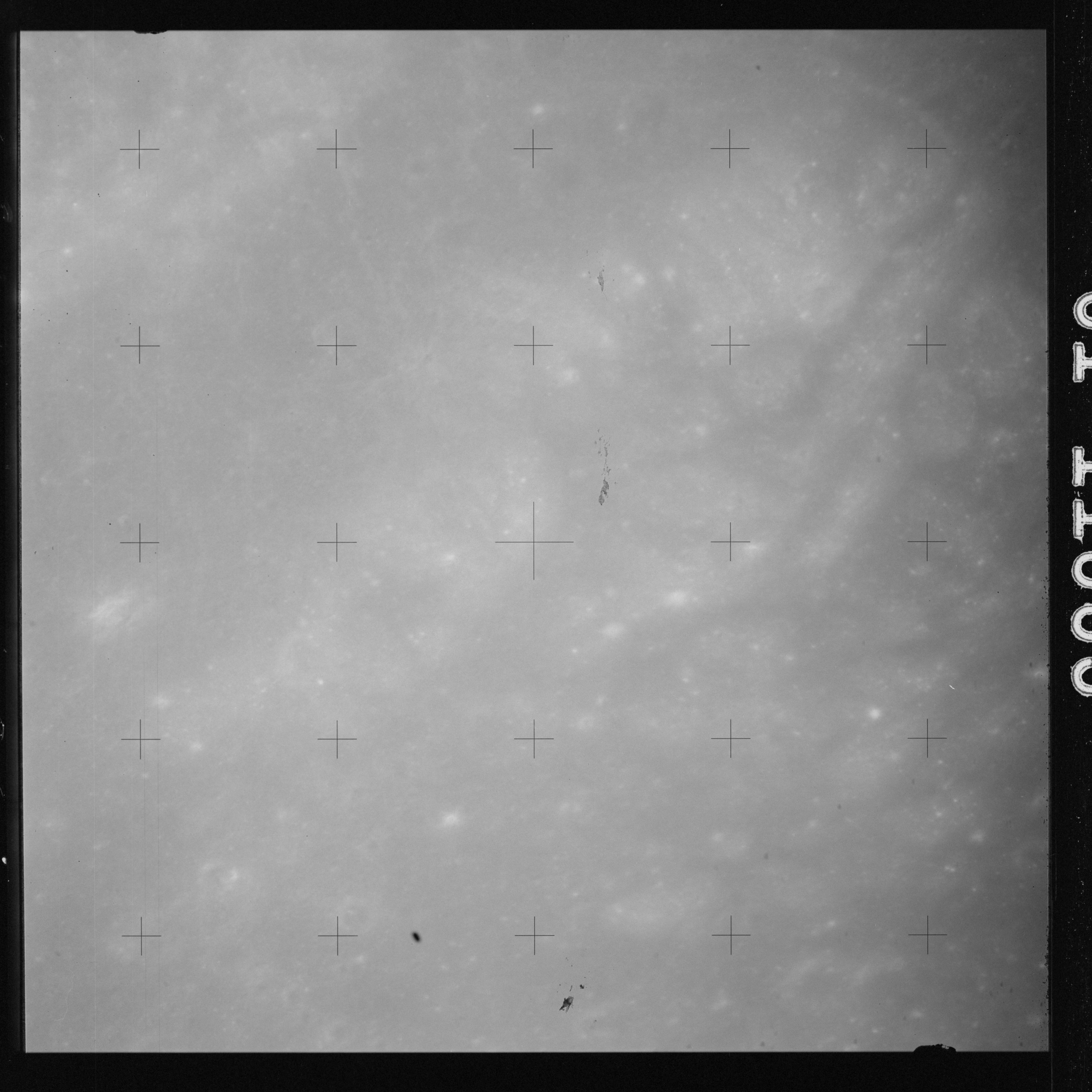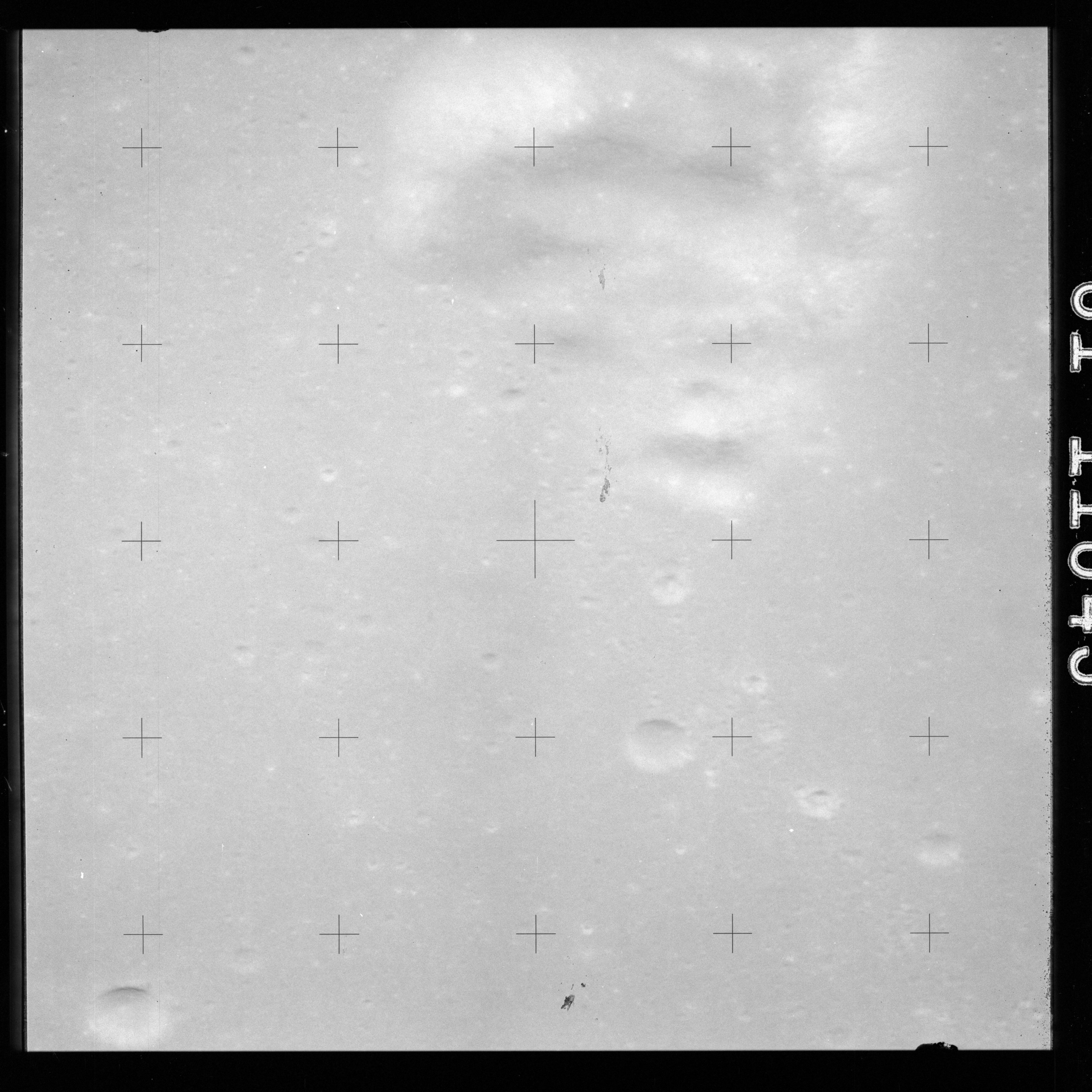 The crater to the right of the rille-producing pair is Toscanelli. The remaining ten frames on magazine PP for this pass follow slightly to the west of Toscanelli across the northern edge of the Aristarchus Plateau to Montes Agricola, finally settling on its northern end.