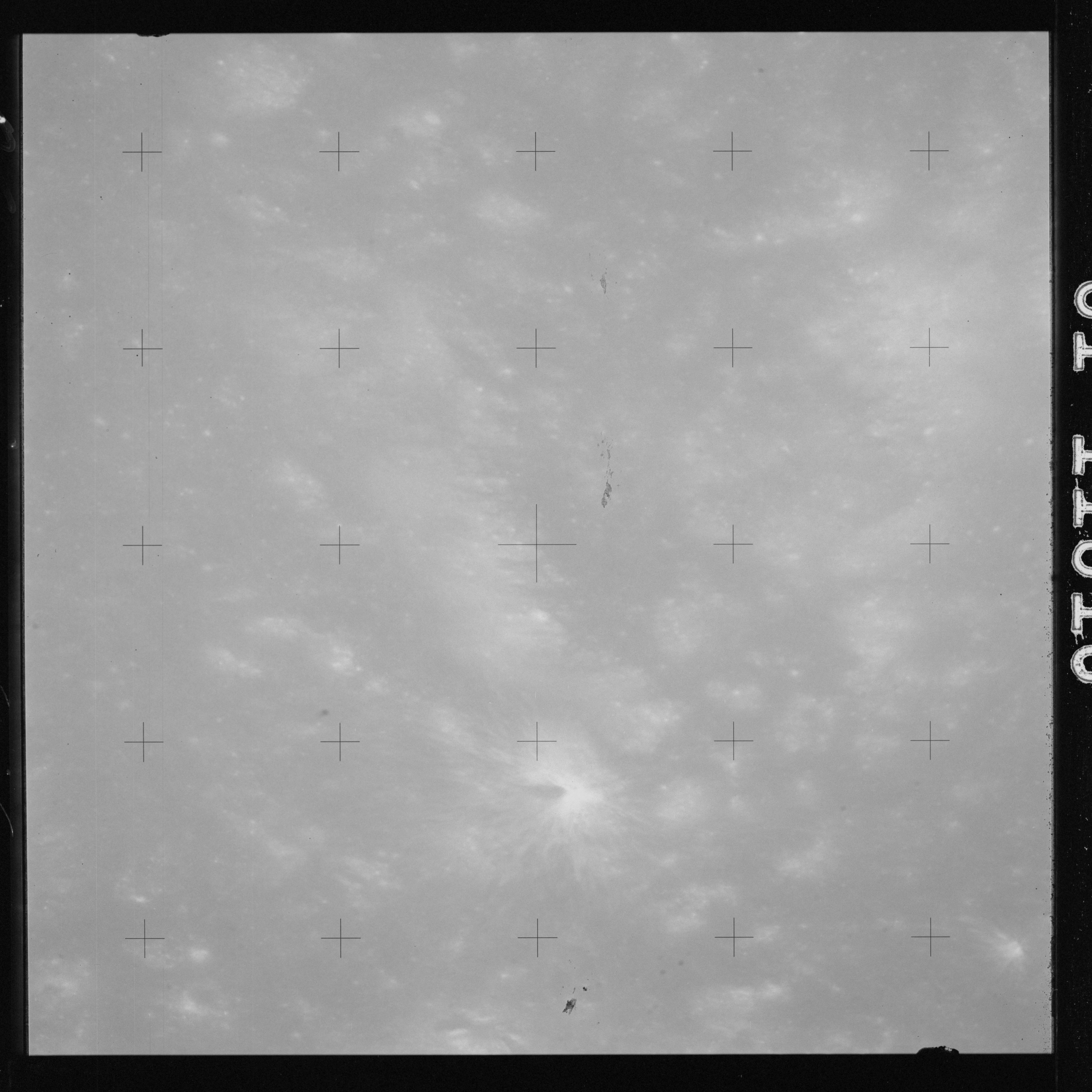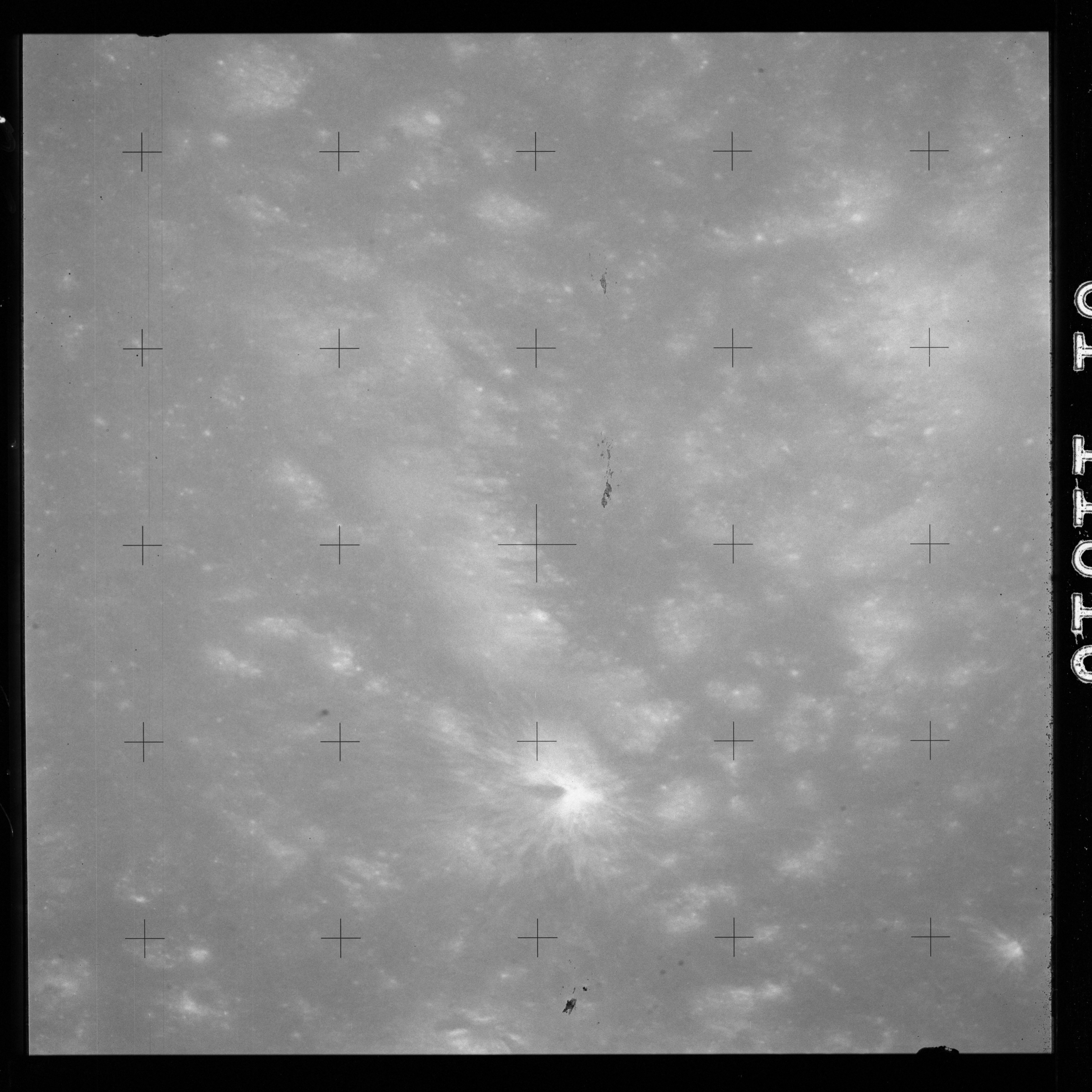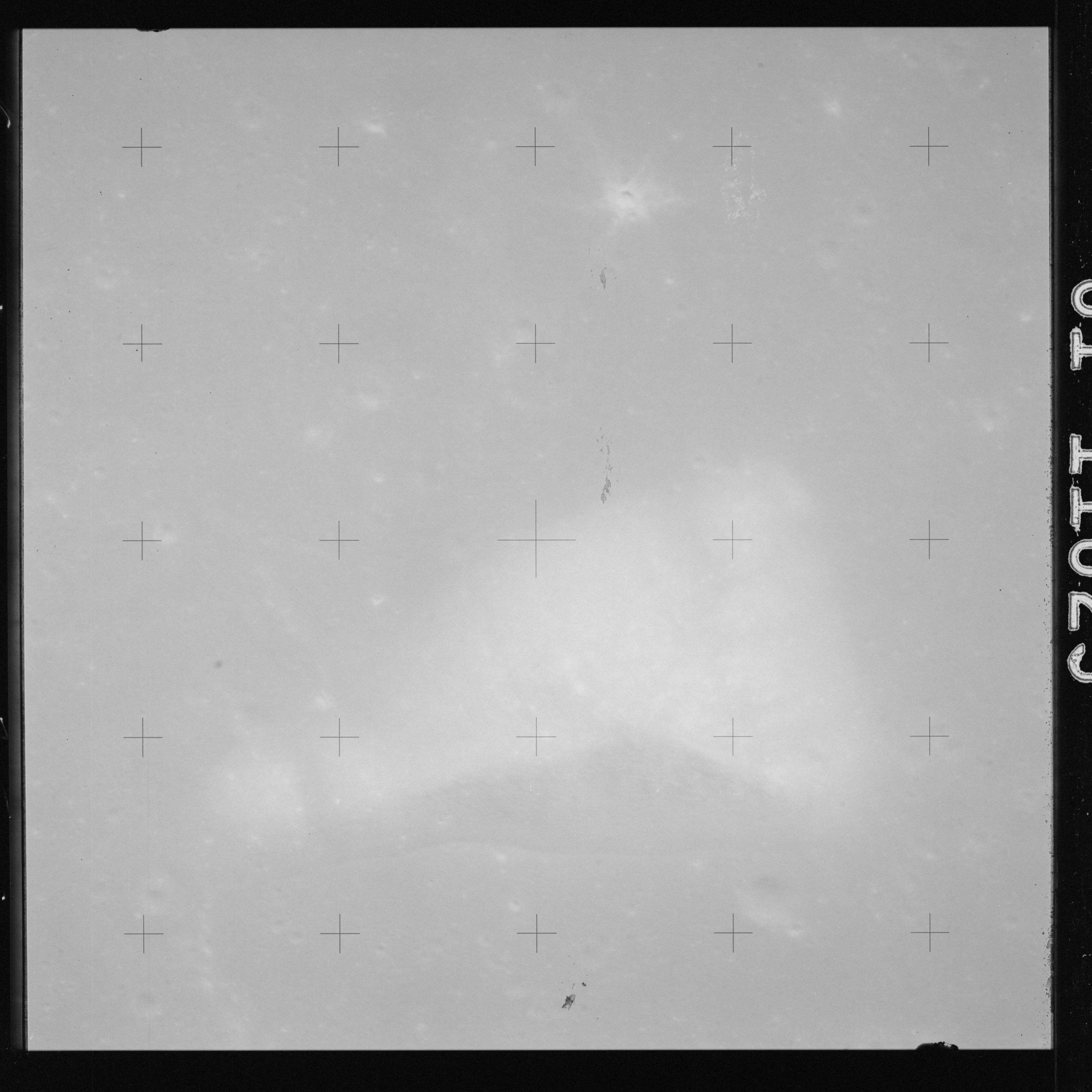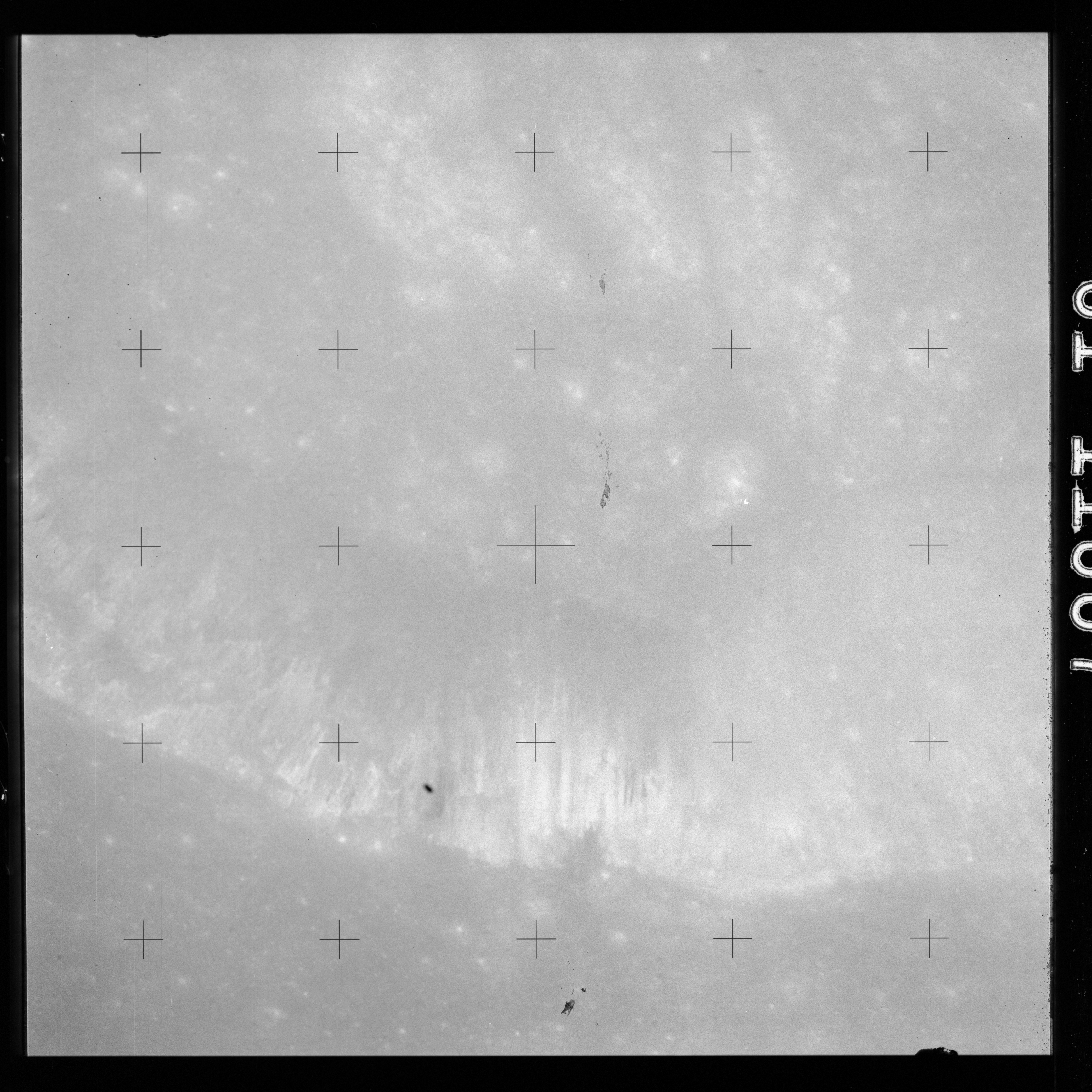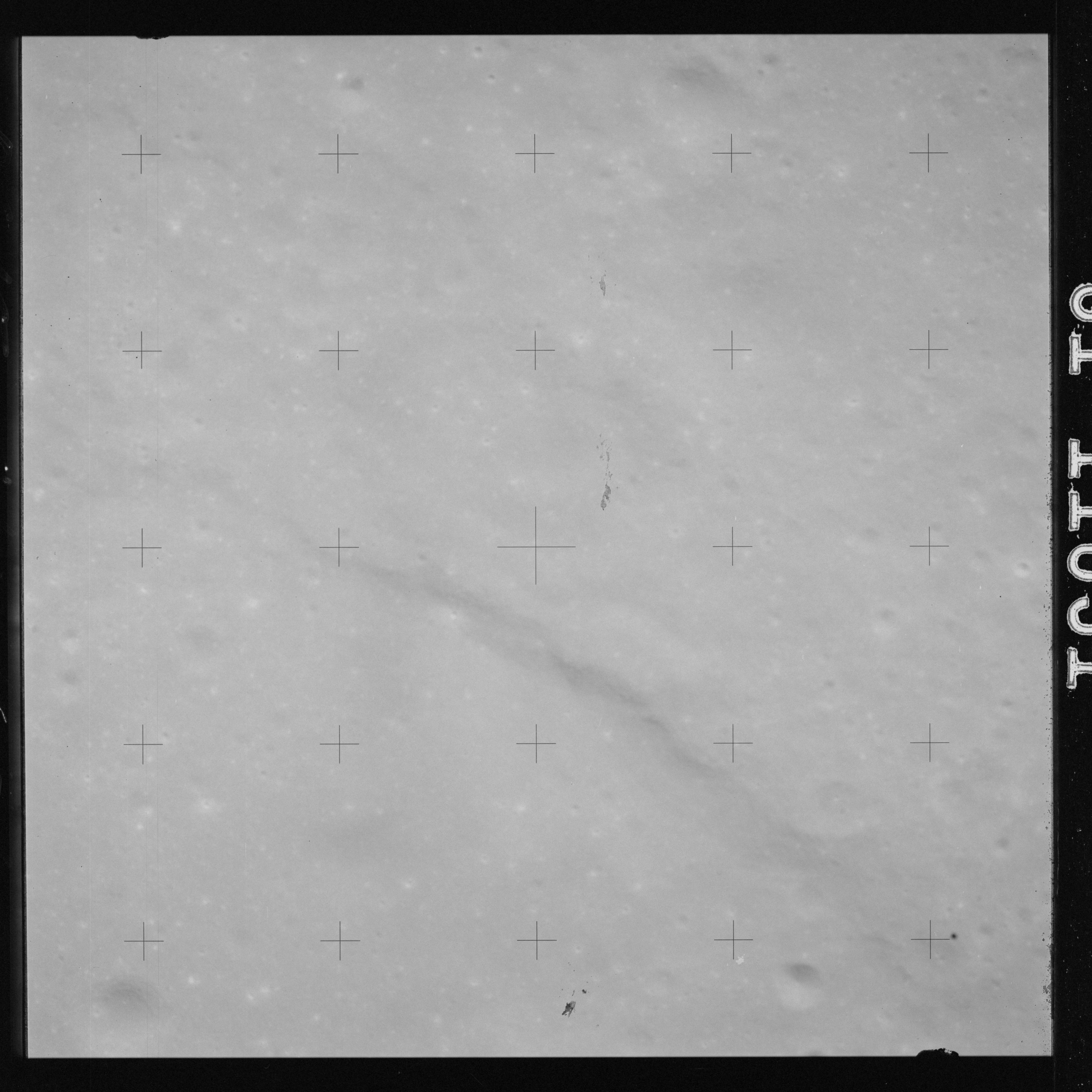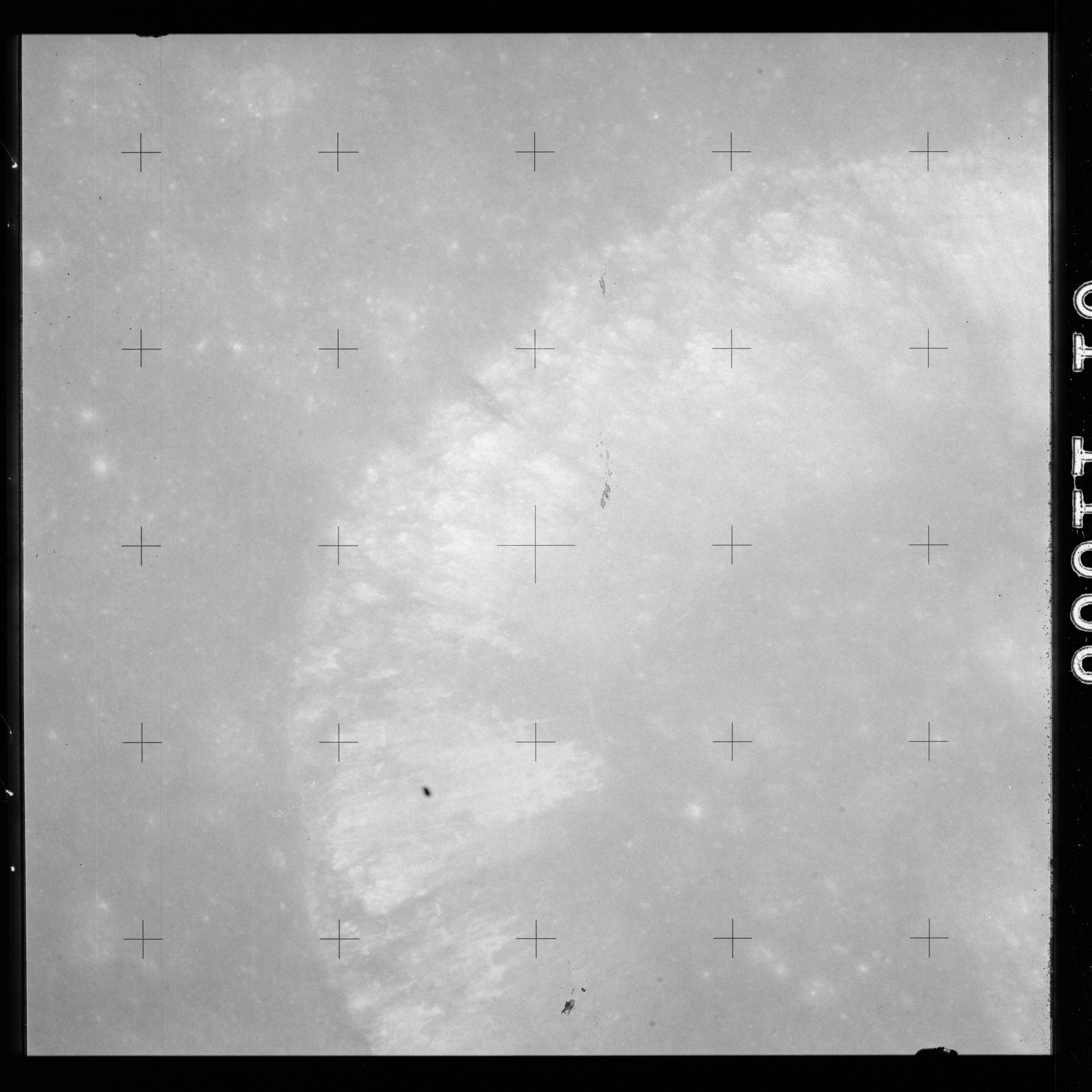 The crater to the right of the rille-producing pair is Toscanelli. The remaining ten frames on magazine PP for this pass follow slightly to the west of Toscanelli across the northern edge of the Aristarchus Plateau to Montes Agricola, finally settling on its northern end.