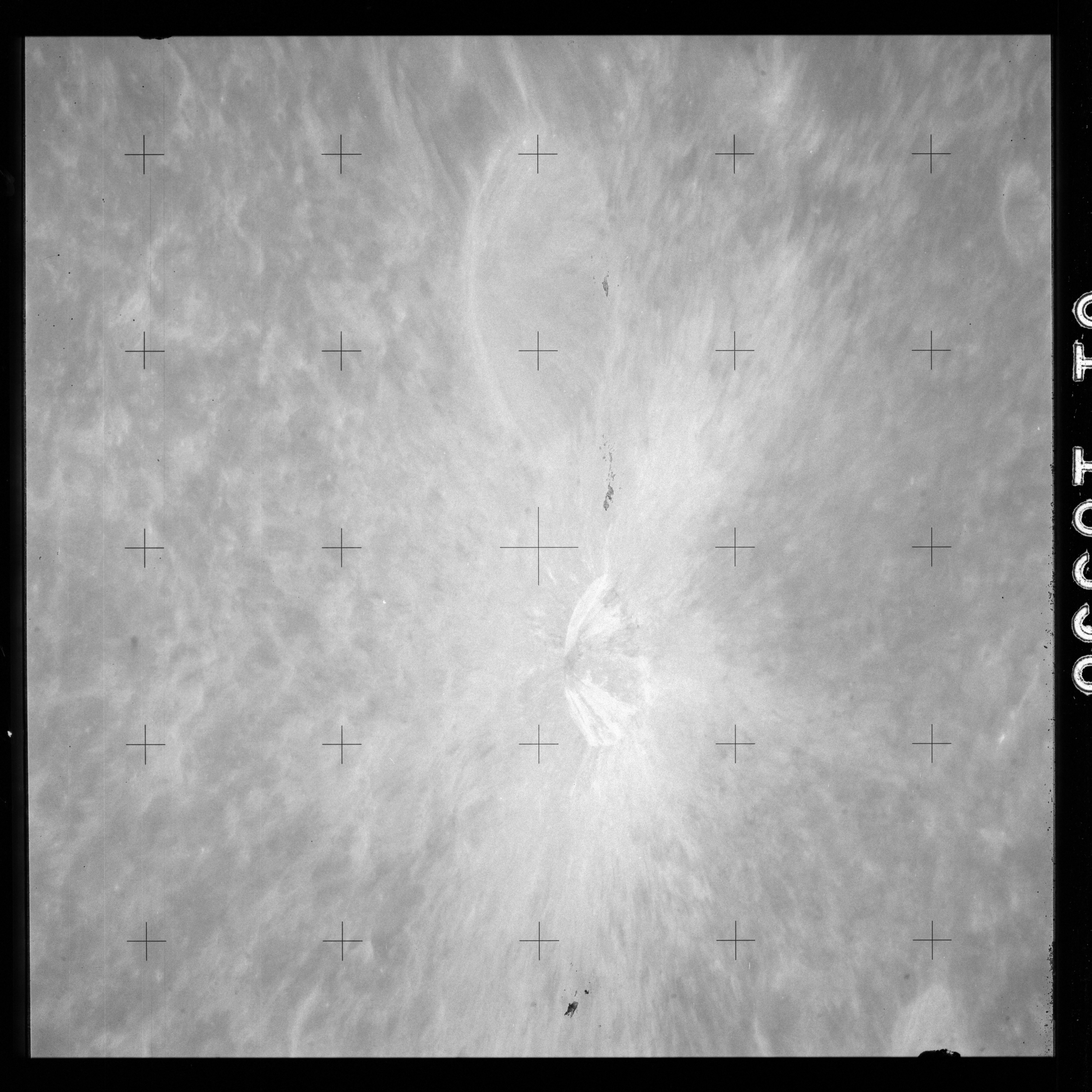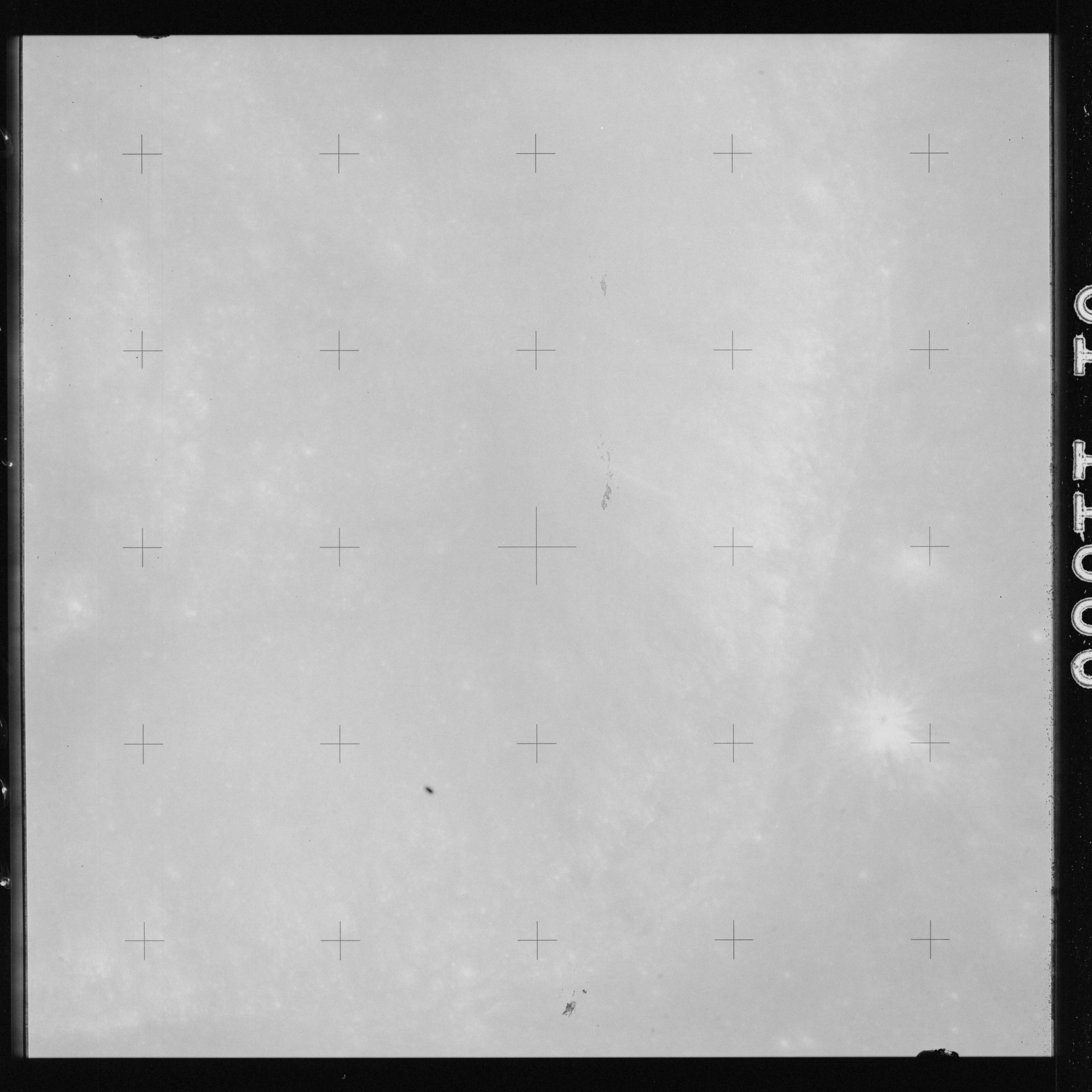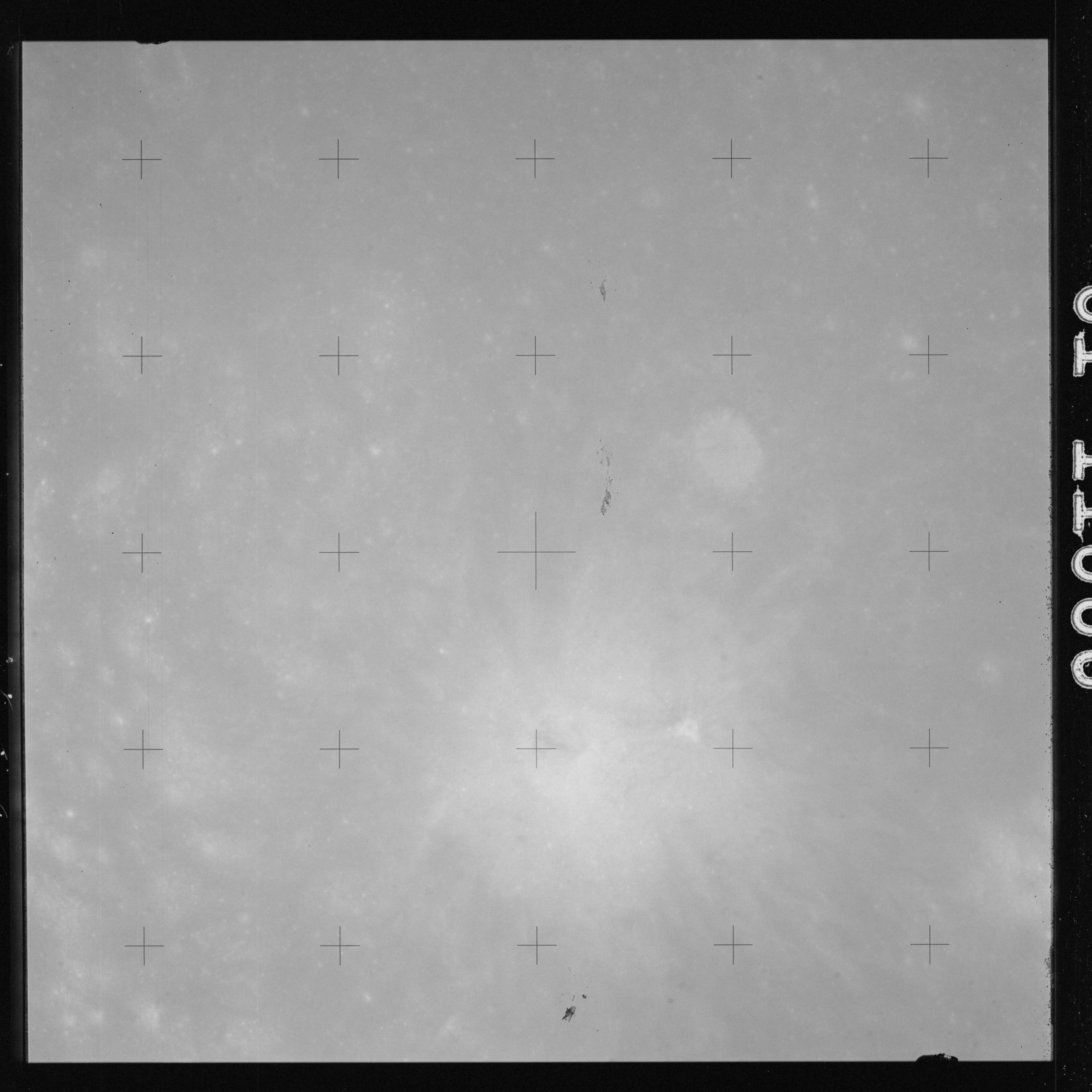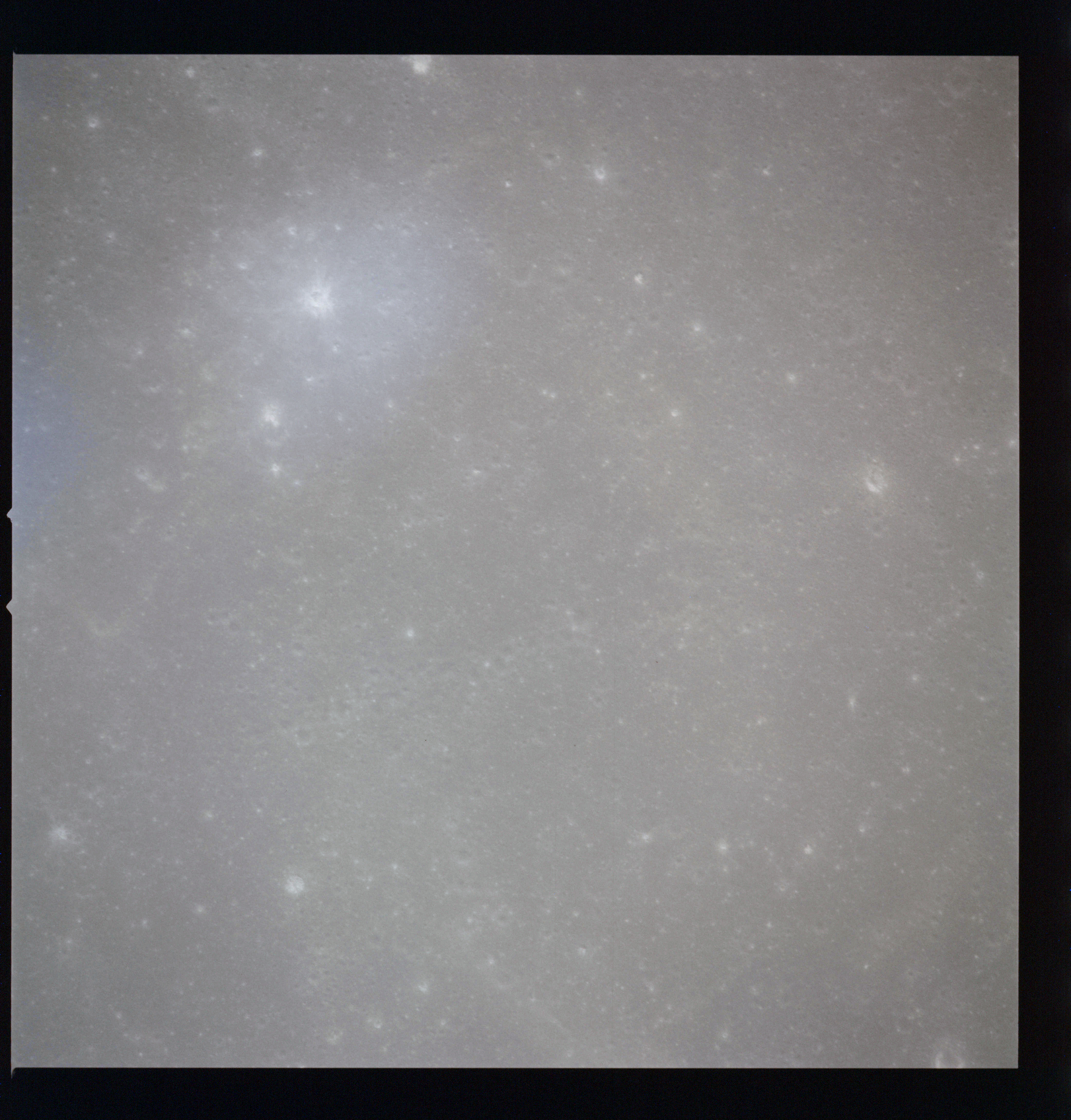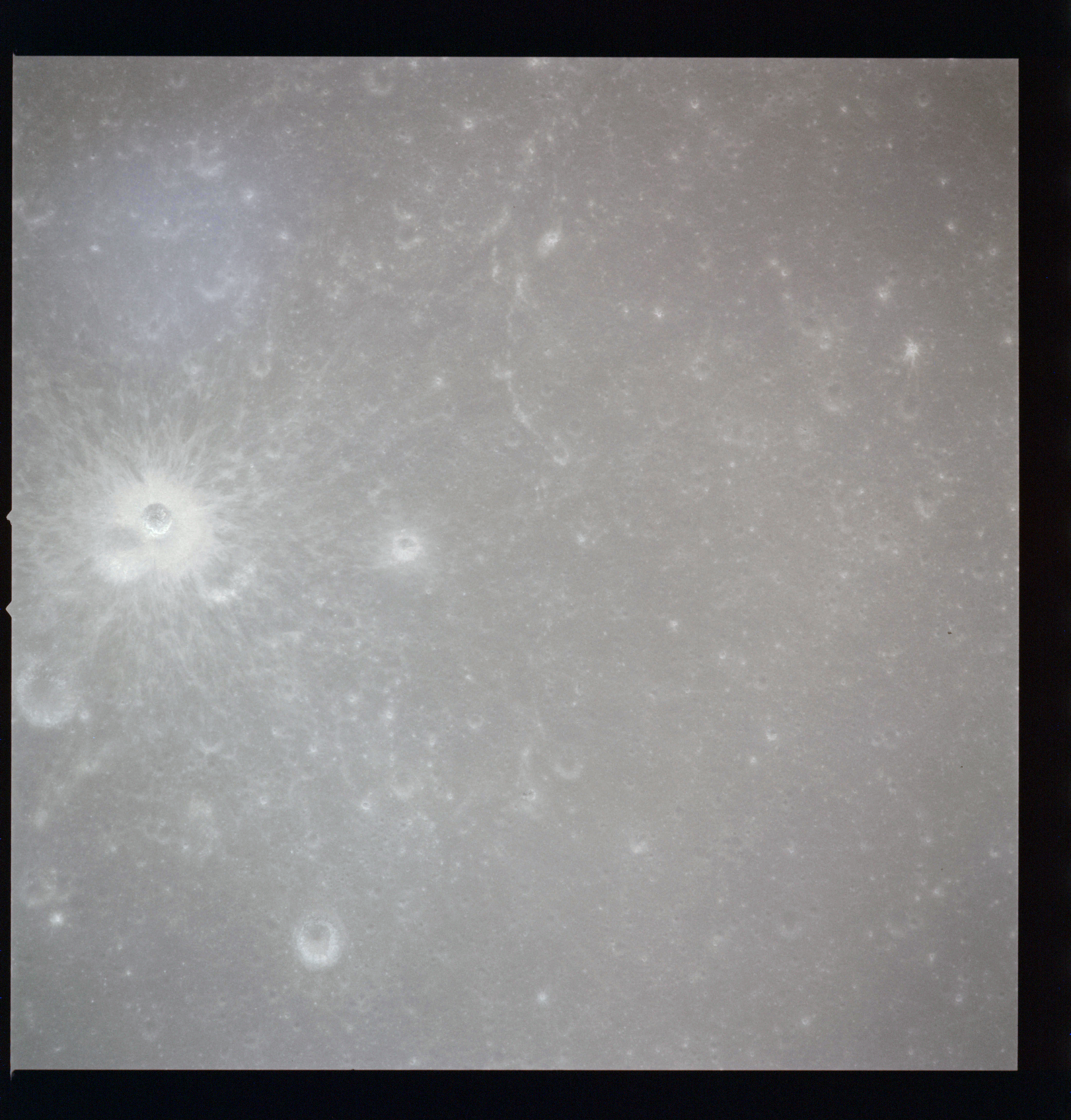 The crater to the right of the rille-producing pair is Toscanelli. The remaining ten frames on magazine PP for this pass follow slightly to the west of Toscanelli across the northern edge of the Aristarchus Plateau to Montes Agricola, finally settling on its northern end.