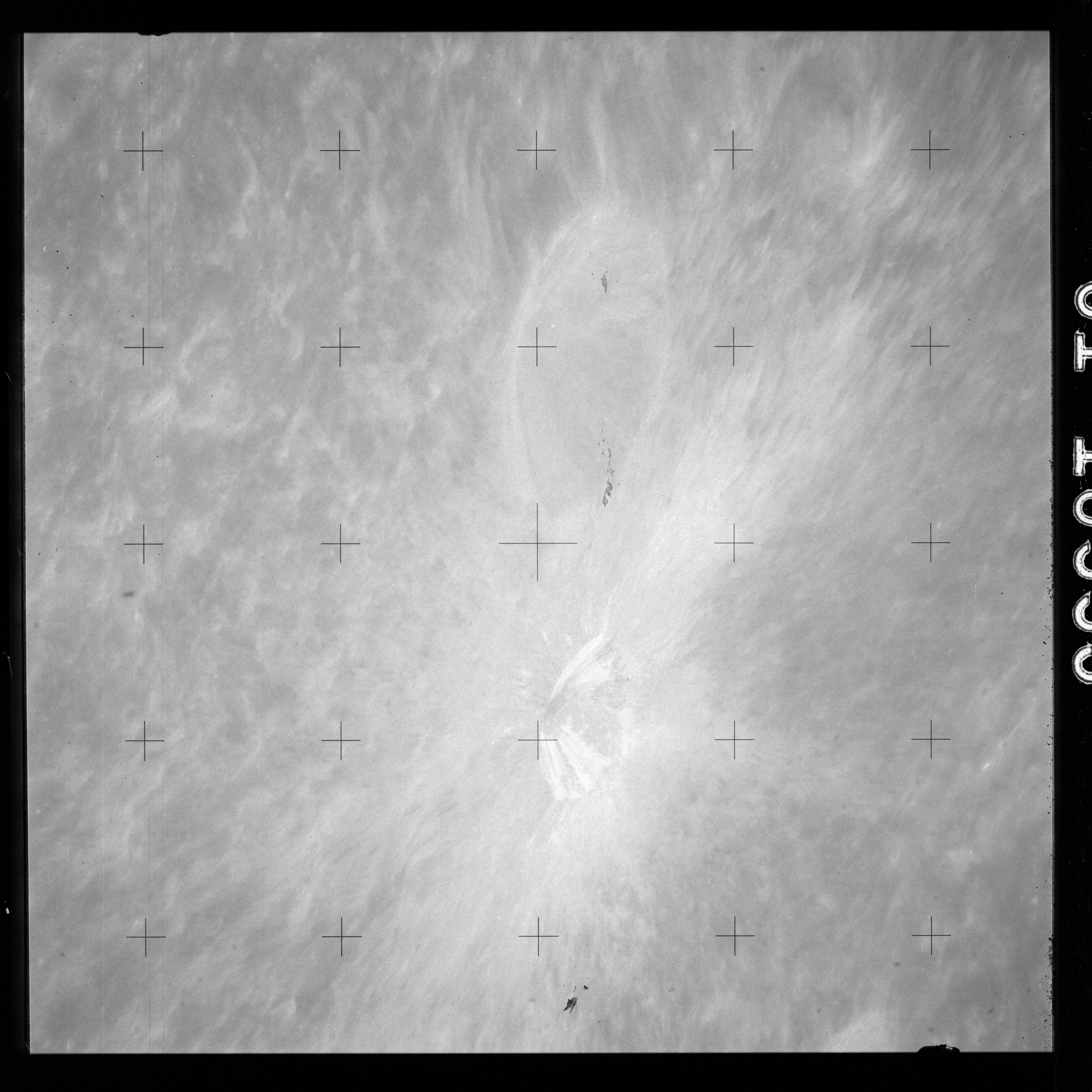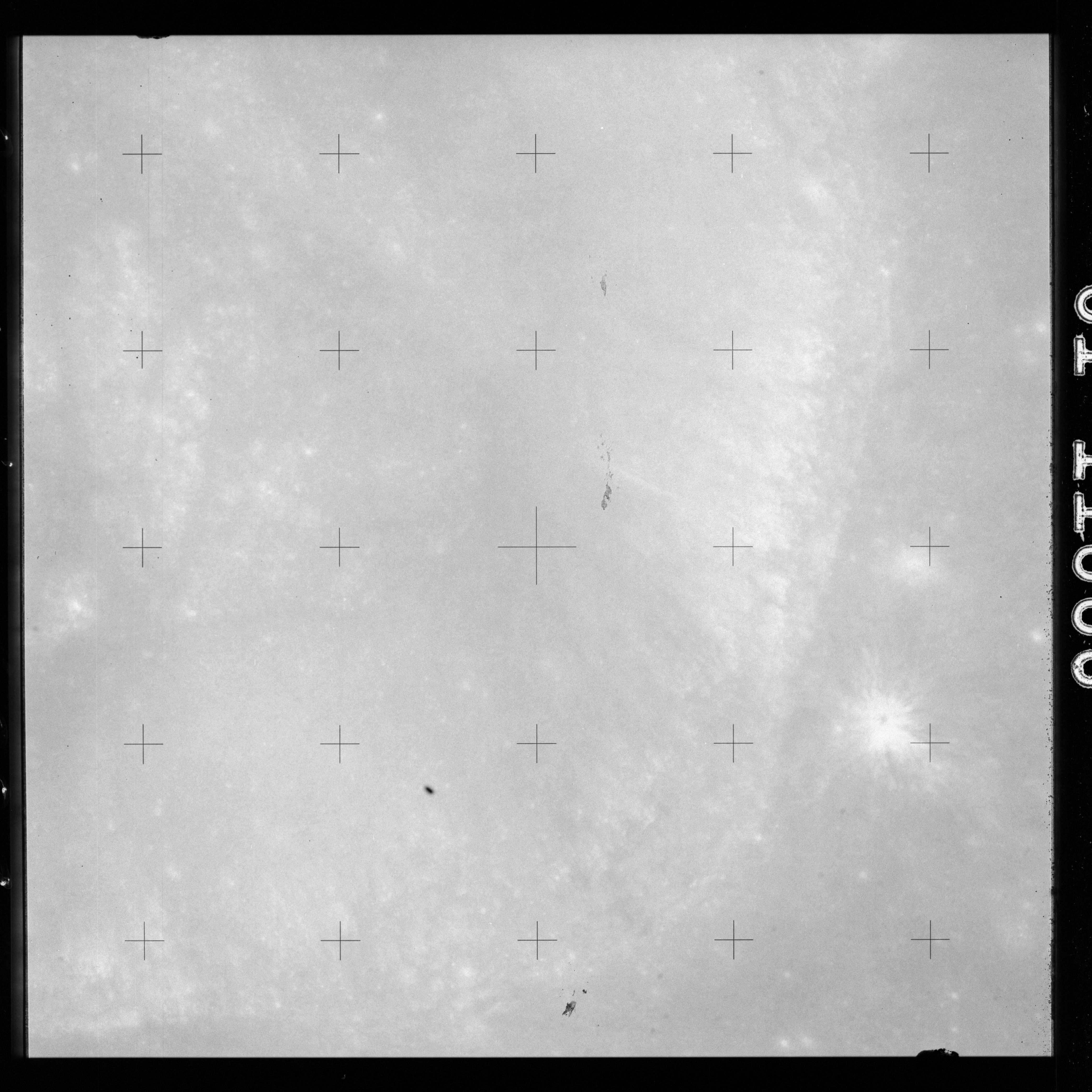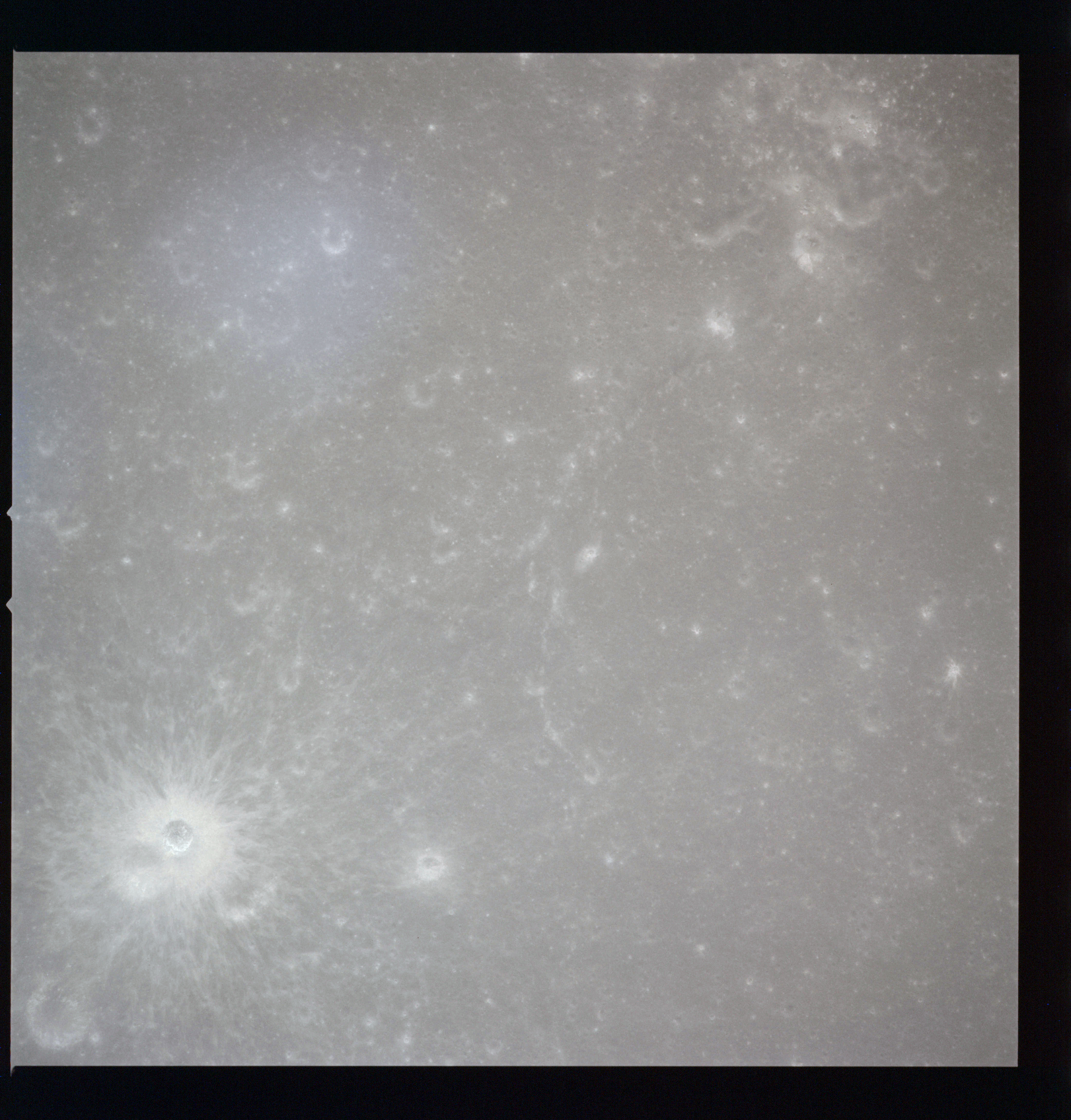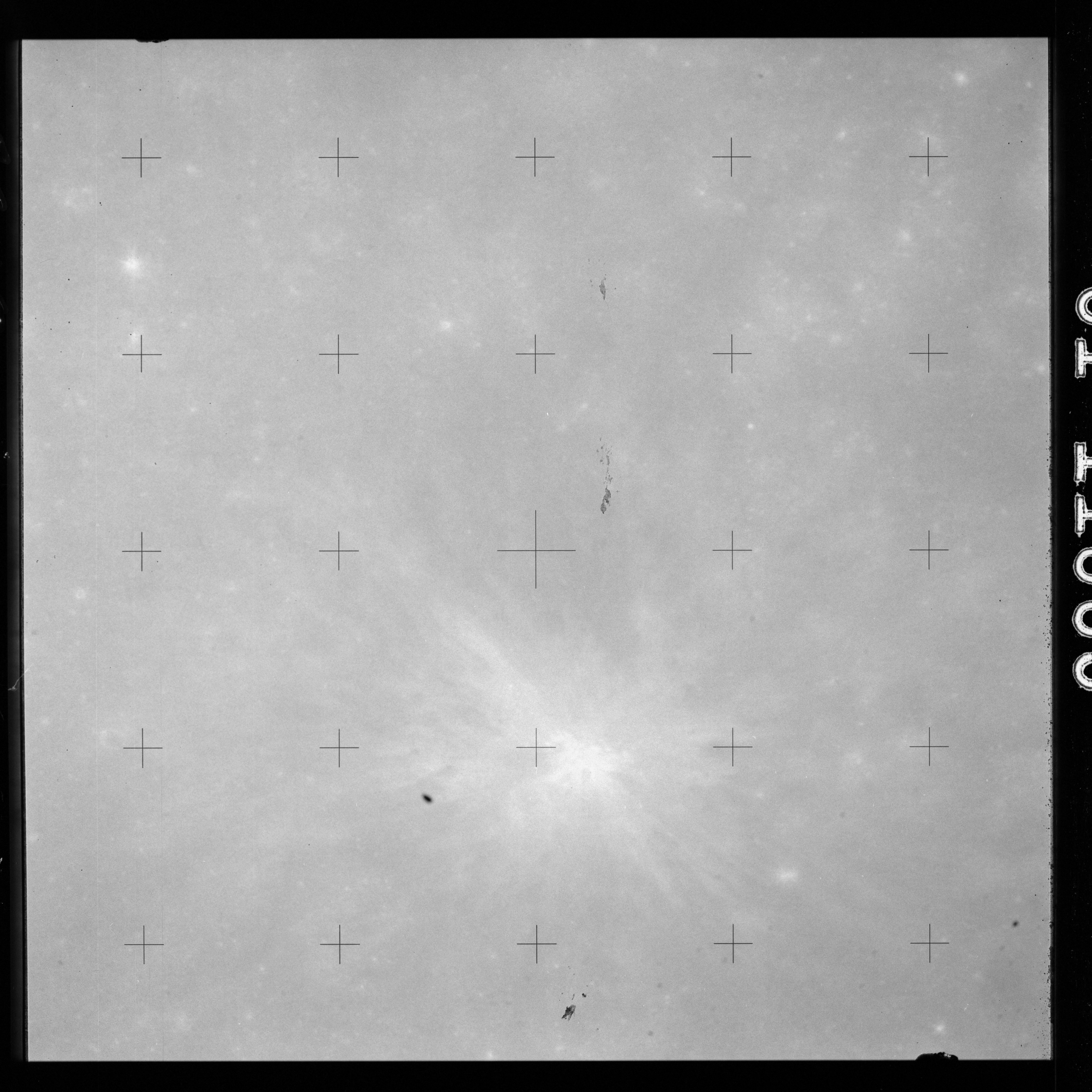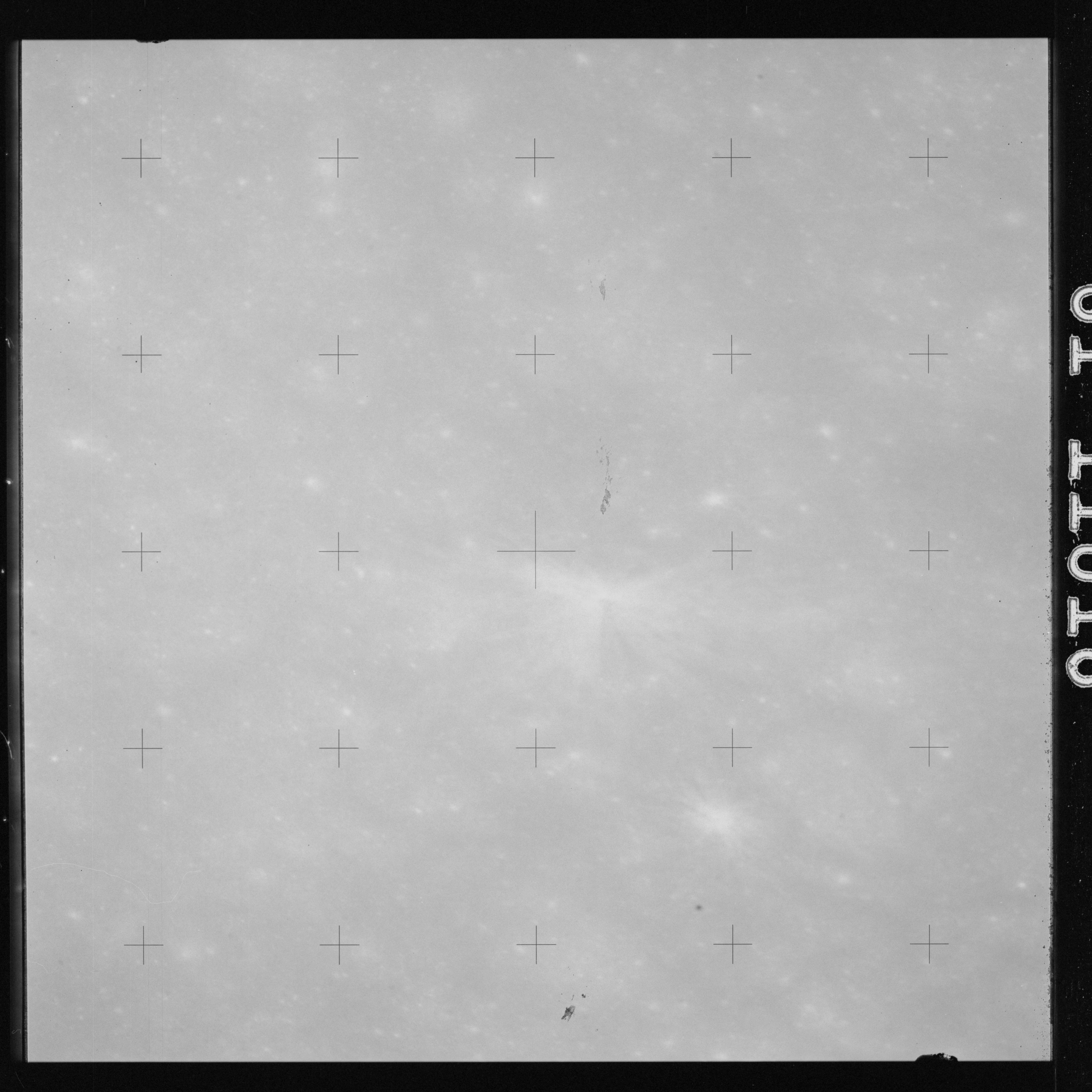 The crater to the right of the rille-producing pair is Toscanelli. The remaining ten frames on magazine PP for this pass follow slightly to the west of Toscanelli across the northern edge of the Aristarchus Plateau to Montes Agricola, finally settling on its northern end.