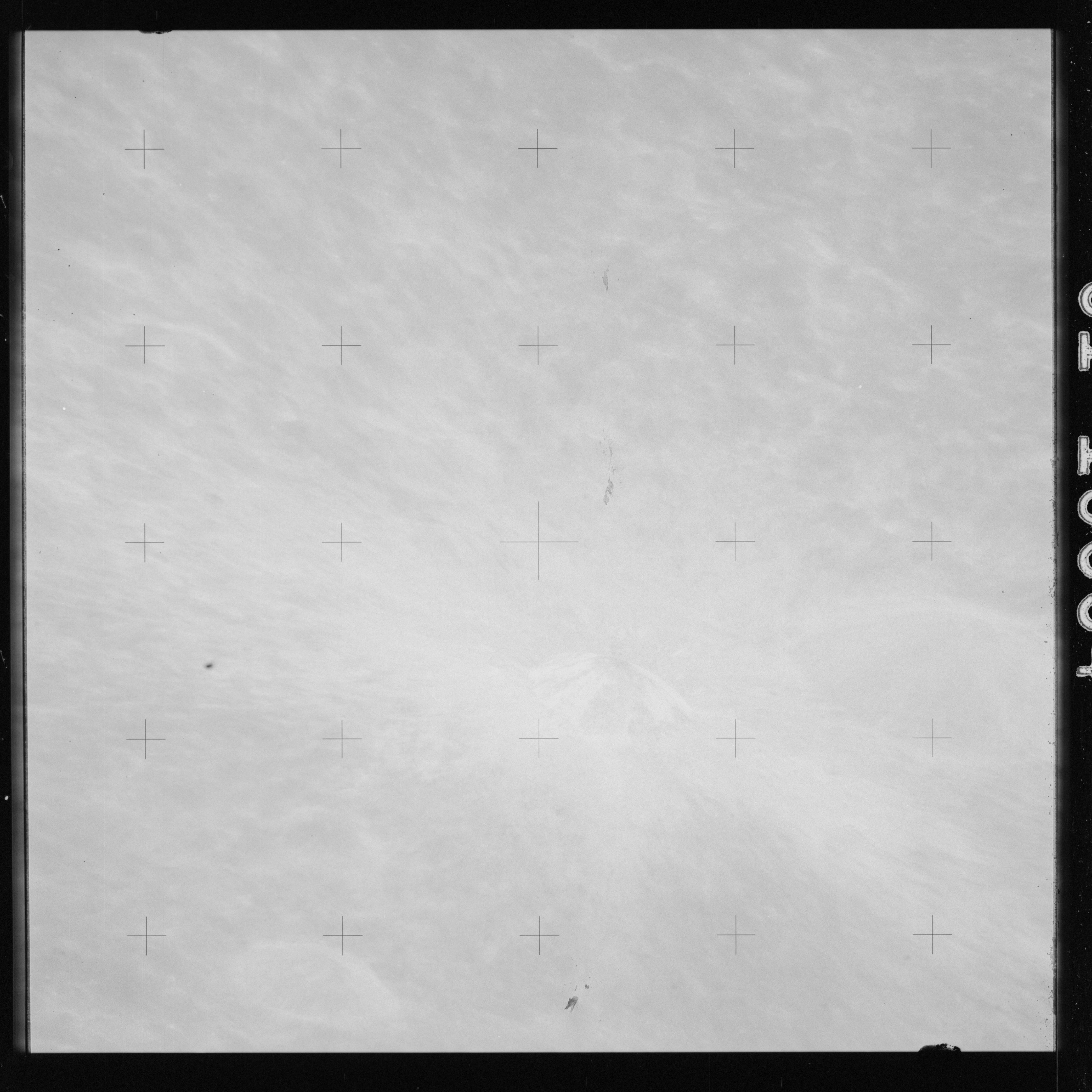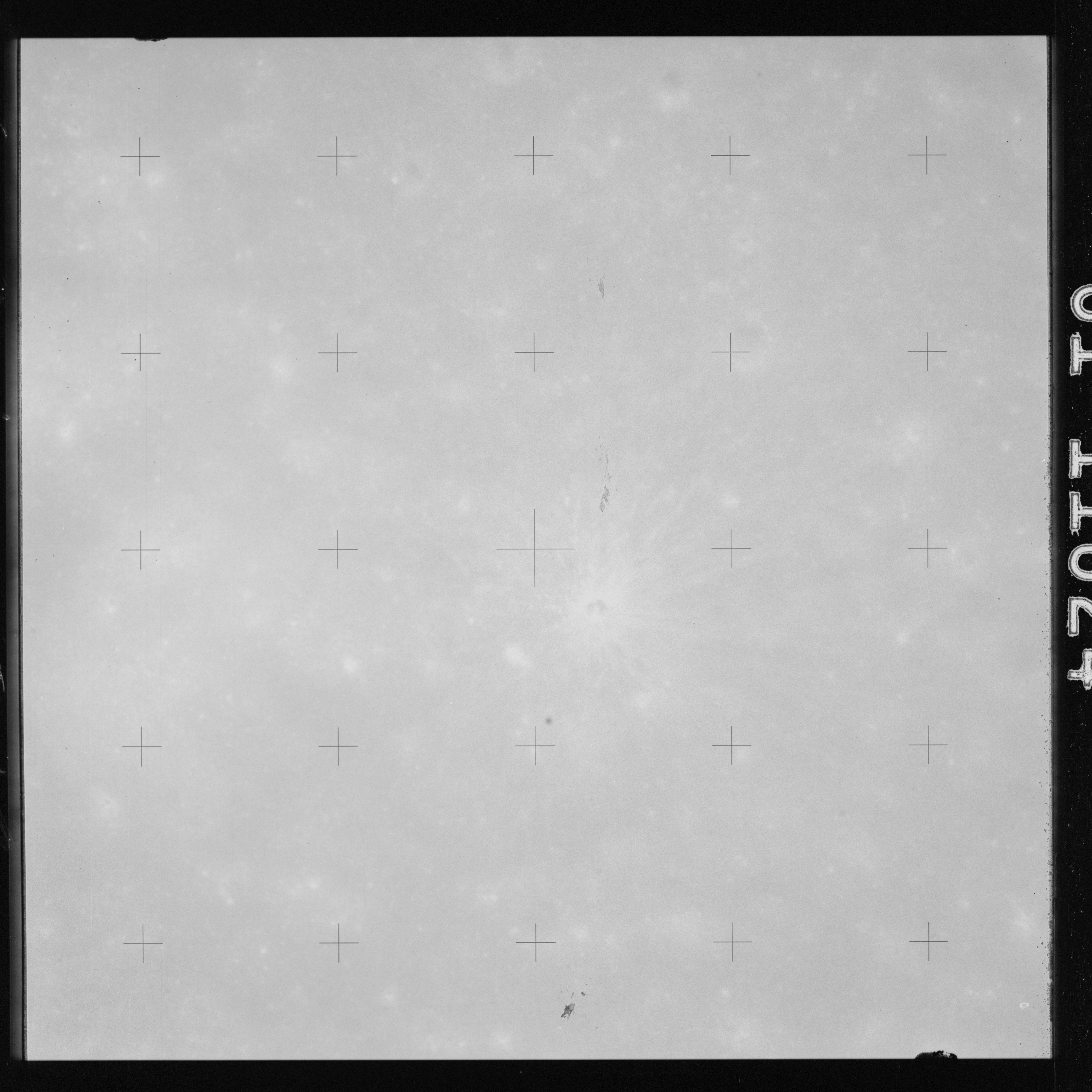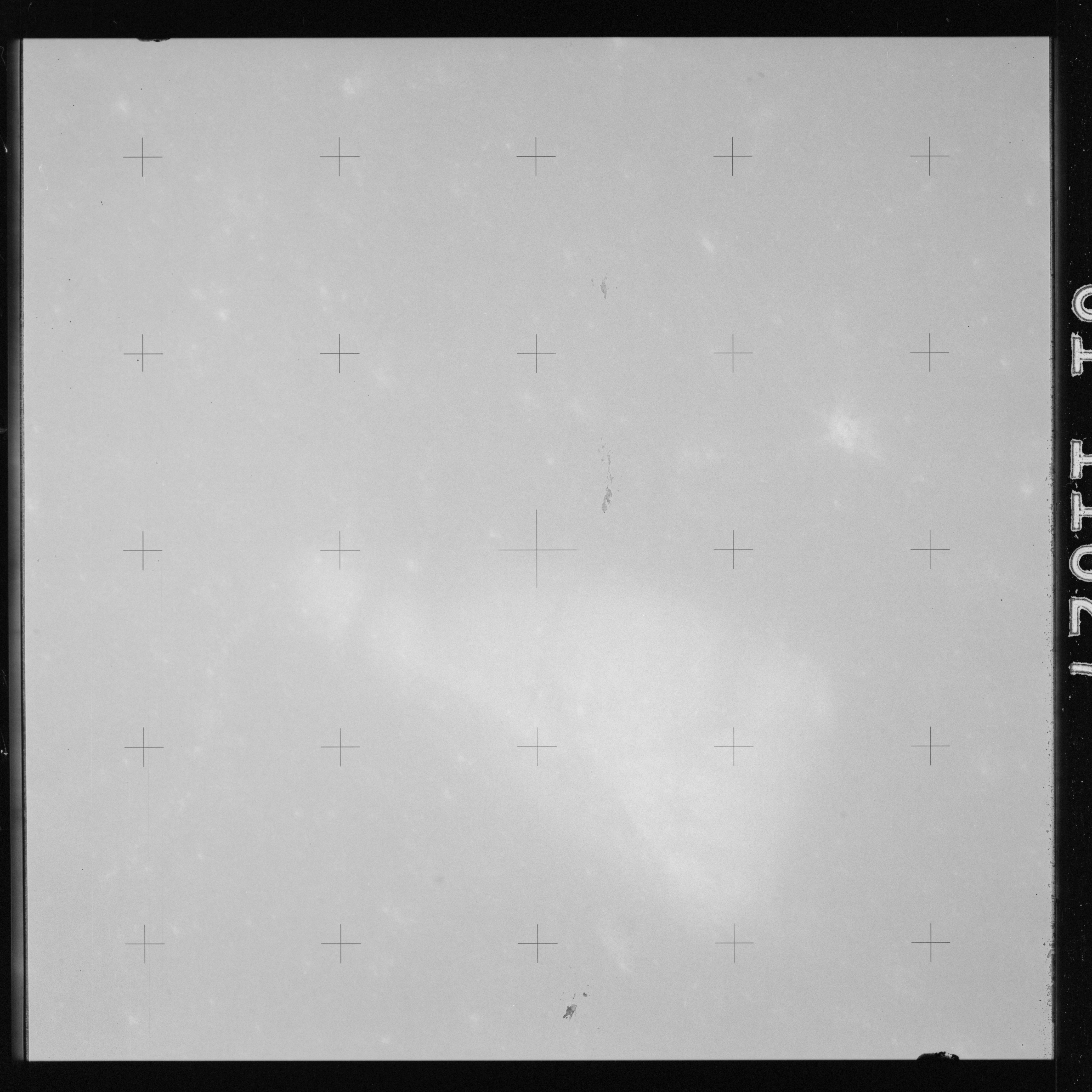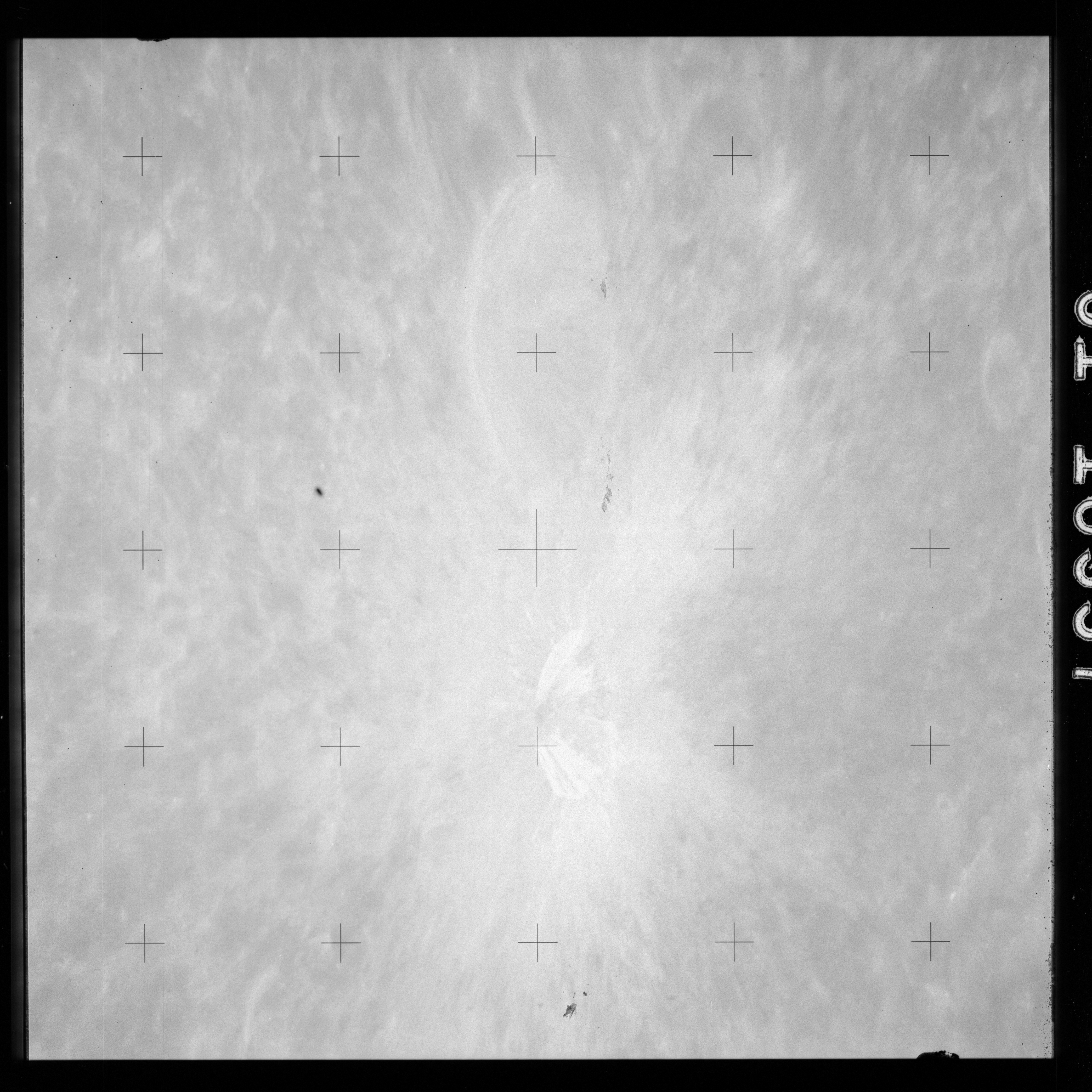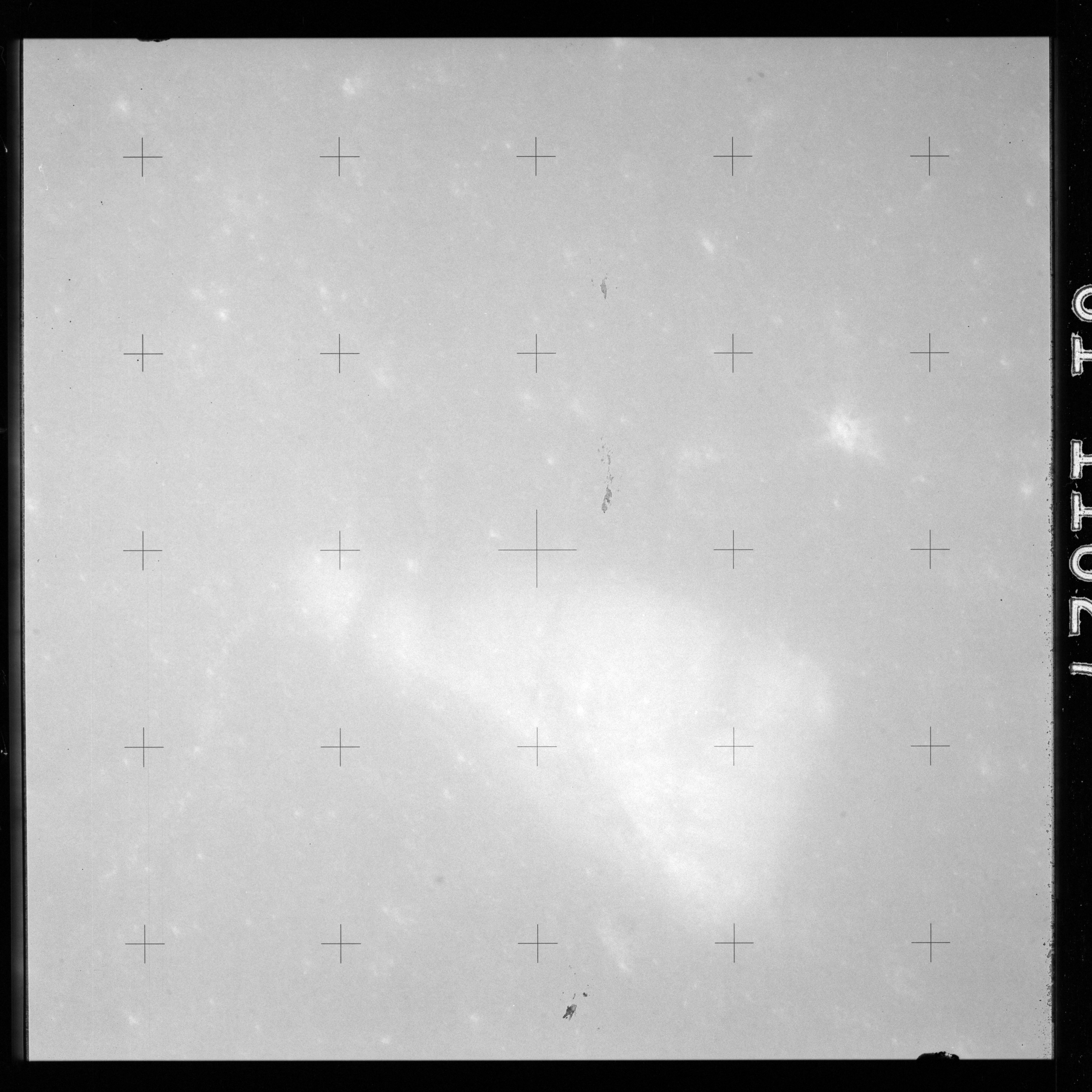 The crater to the right of the rille-producing pair is Toscanelli. The remaining ten frames on magazine PP for this pass follow slightly to the west of Toscanelli across the northern edge of the Aristarchus Plateau to Montes Agricola, finally settling on its northern end.