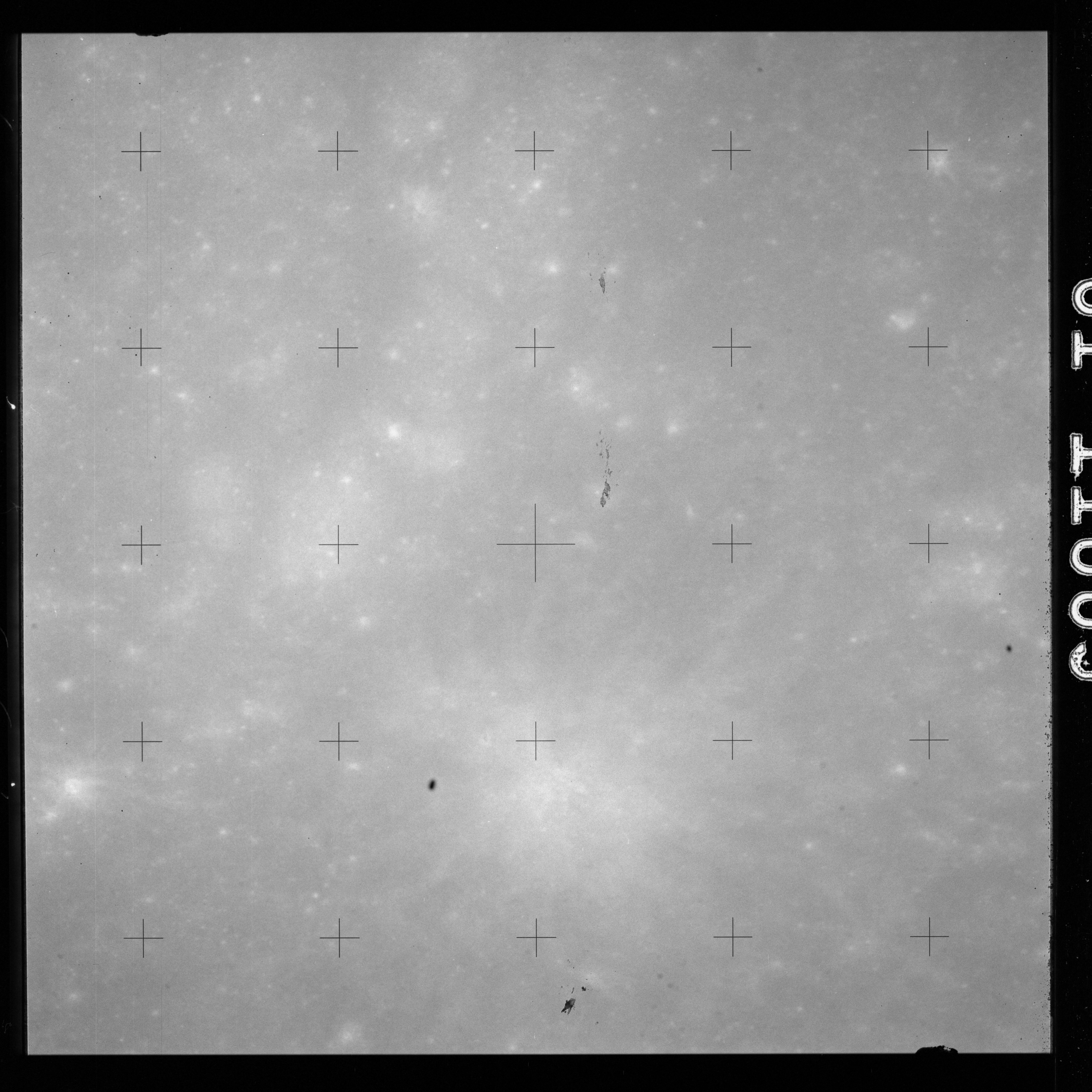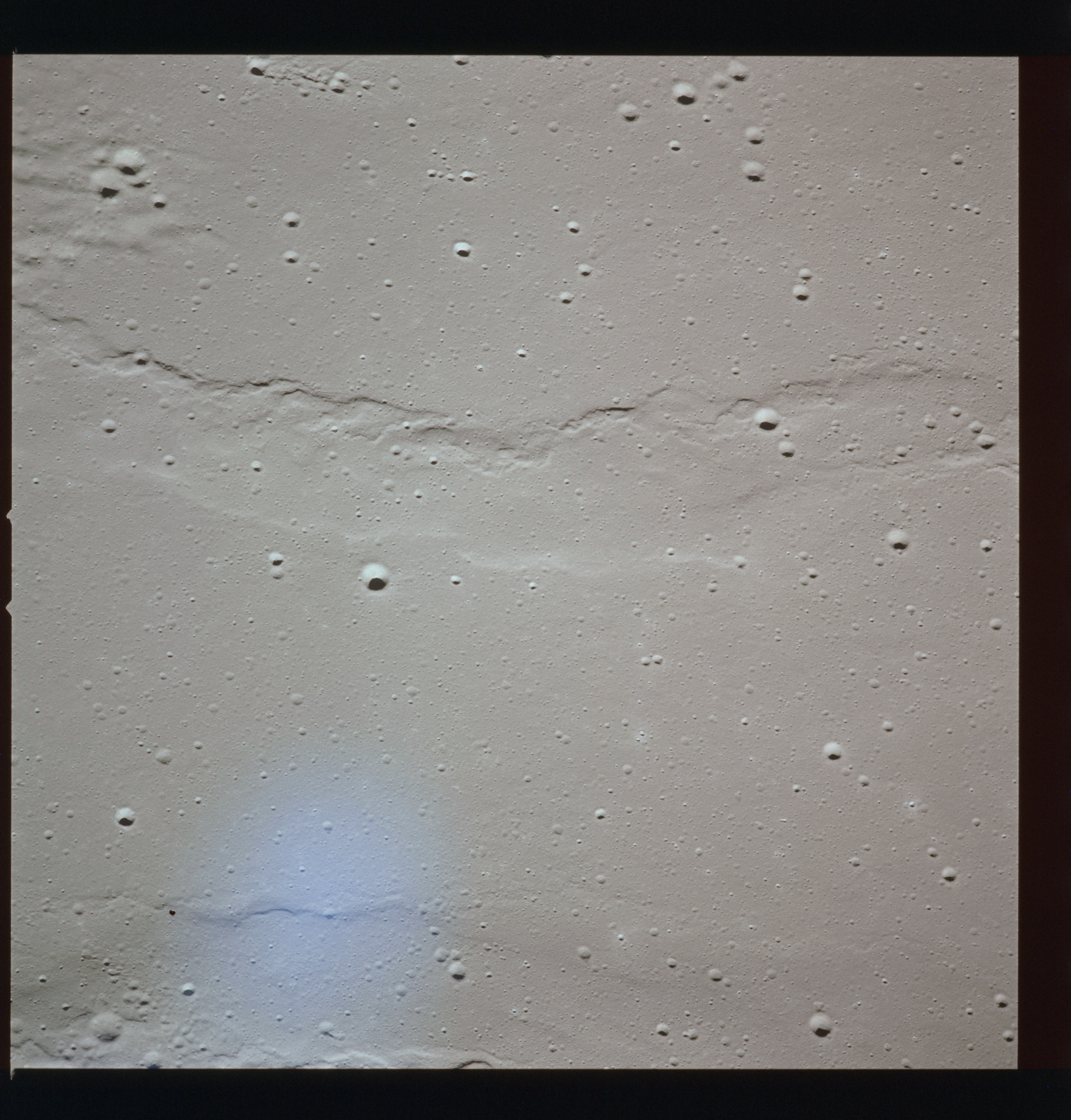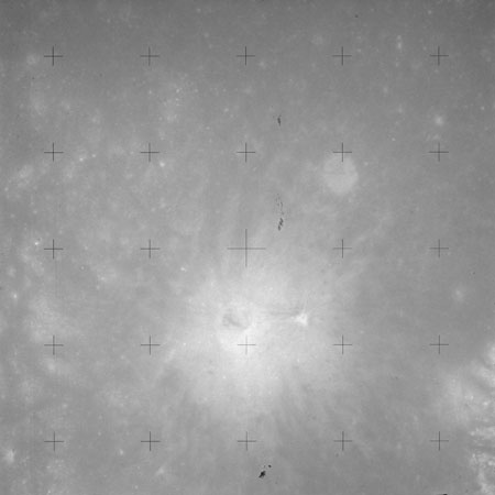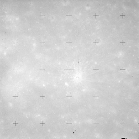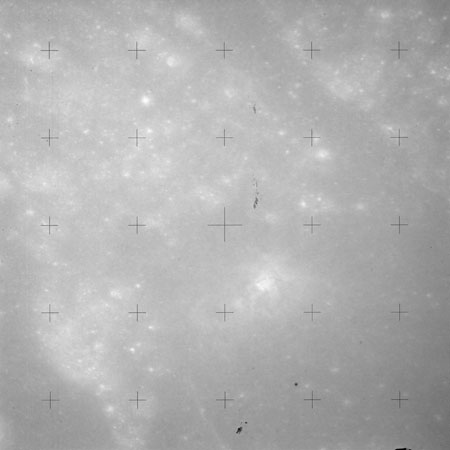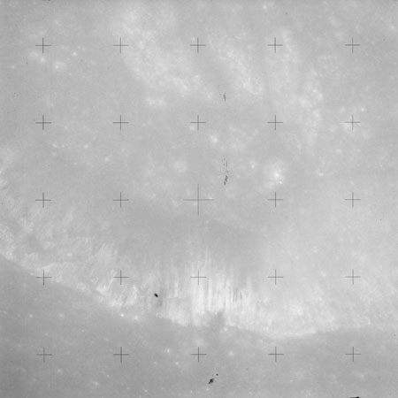 Using colour film in magazine PP and its wide-angle lens, AS15-90-12299 begins a sequence of four images which allow the spacecraft's motion to track the camera across the western Mare Imbrium. The contamination on the Réseau plate of this camera is very apparent.