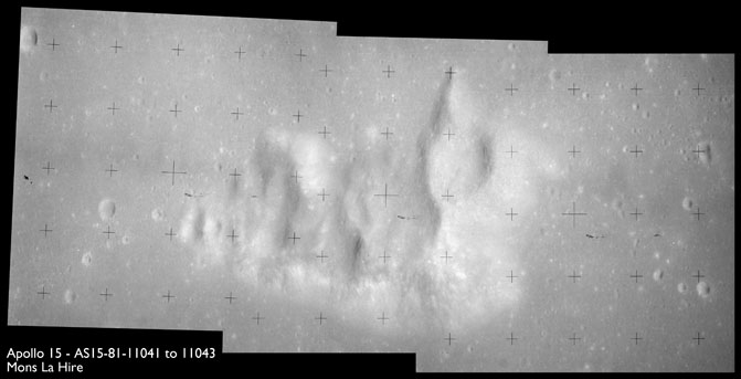 Mons La Hire is shown in images AS15-81-11041 to 11043. In the oblique sunlight Al first saw them by, he was struck by the crater-like depressions along its northern flank which gave him a sense that he was looking at the remains of a volcano.