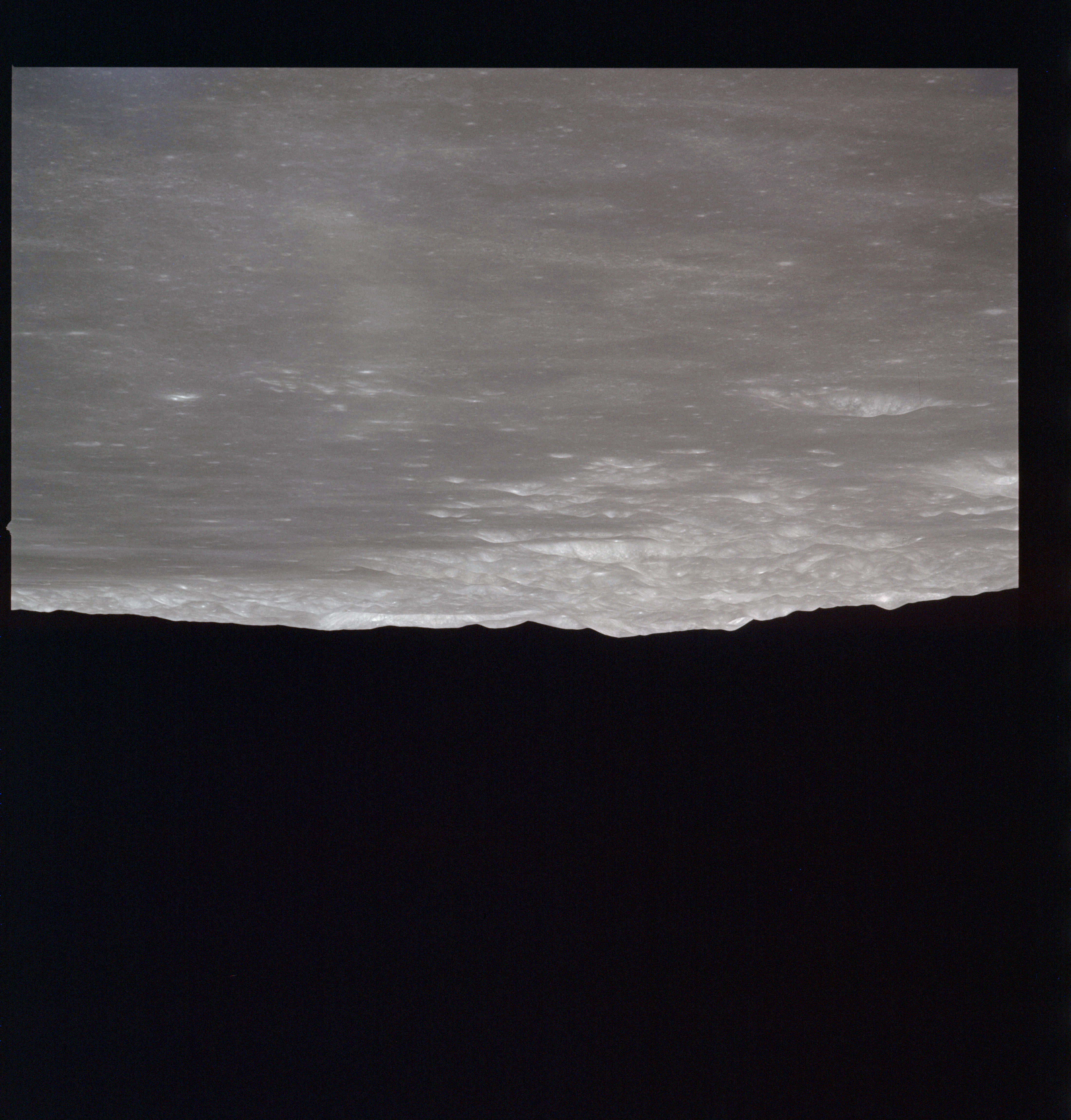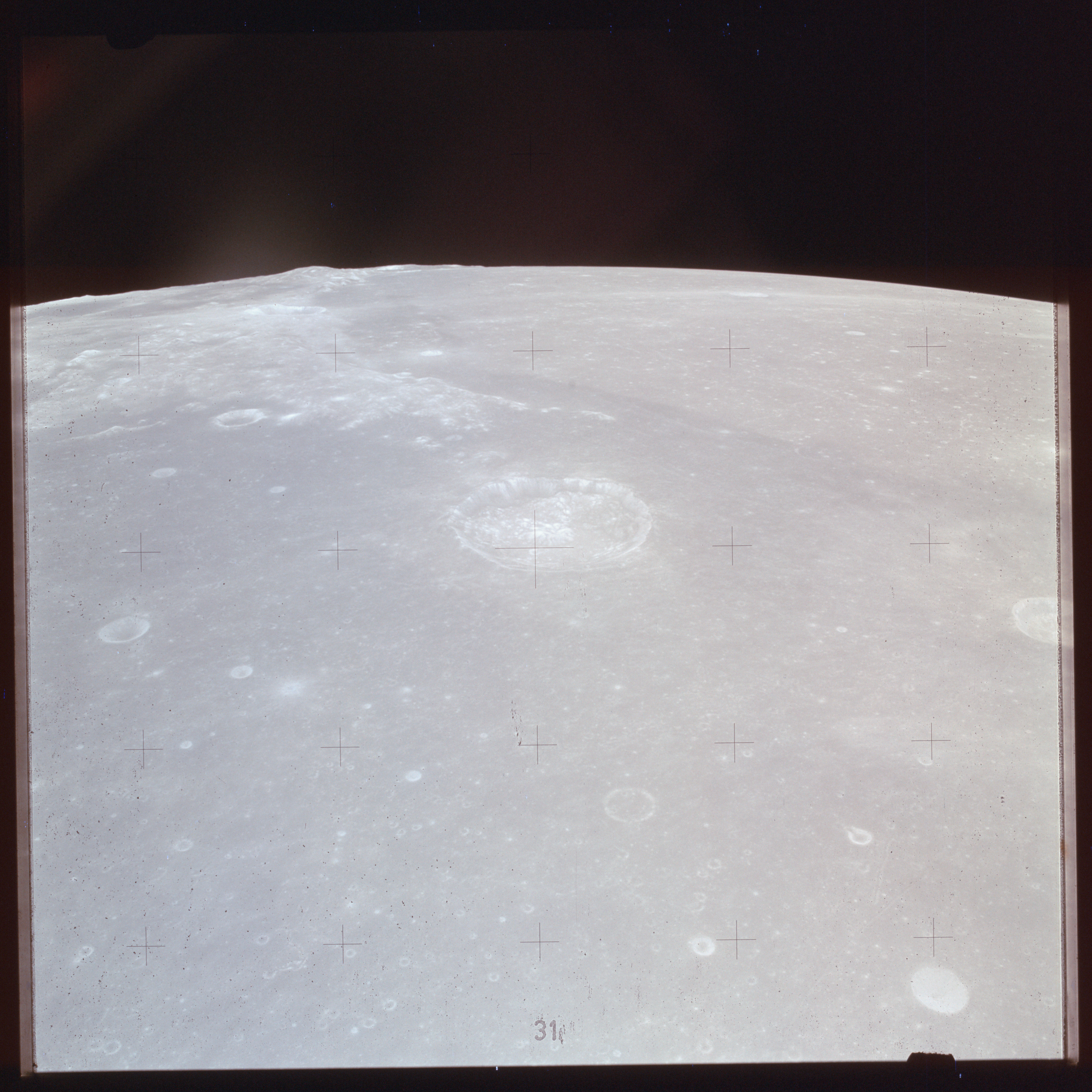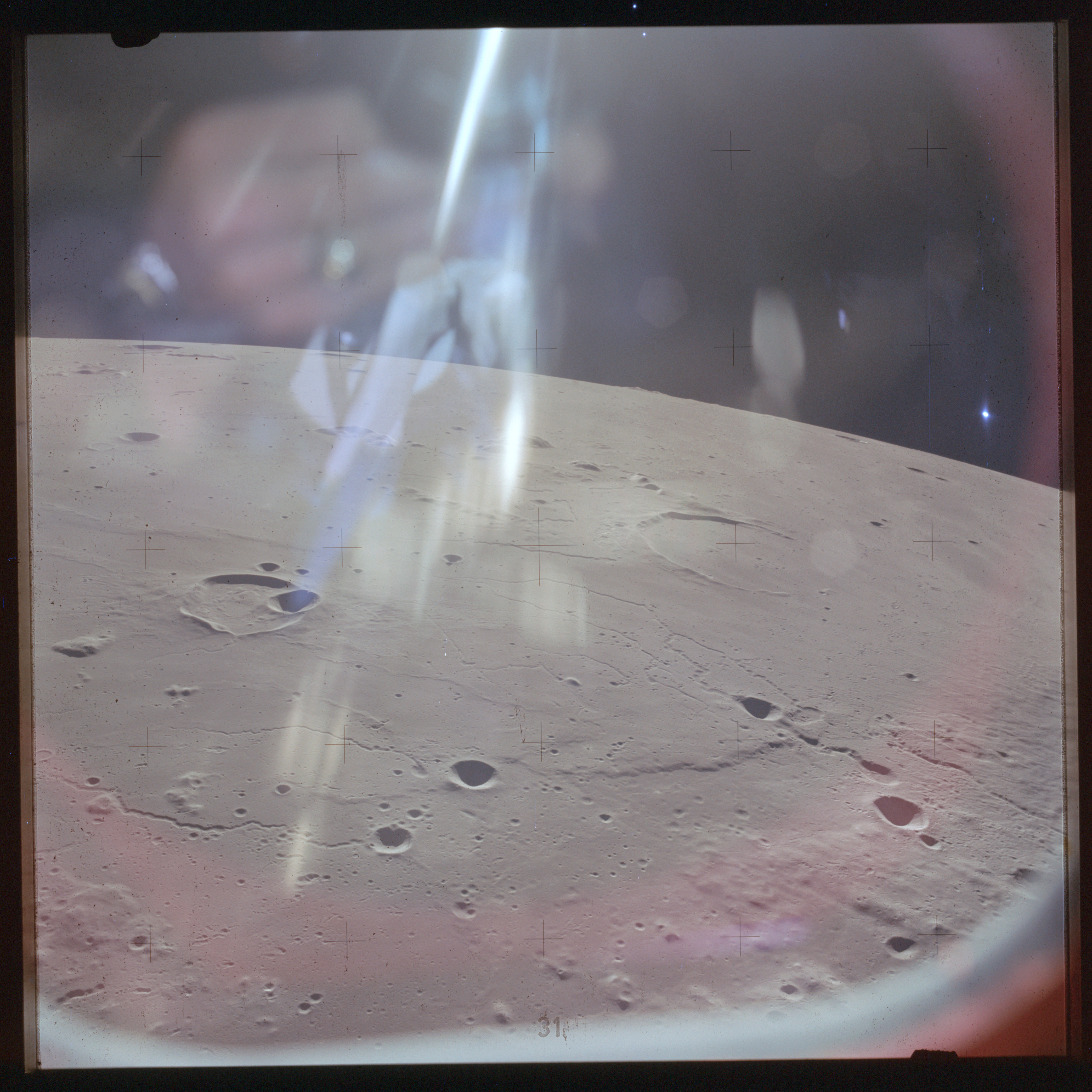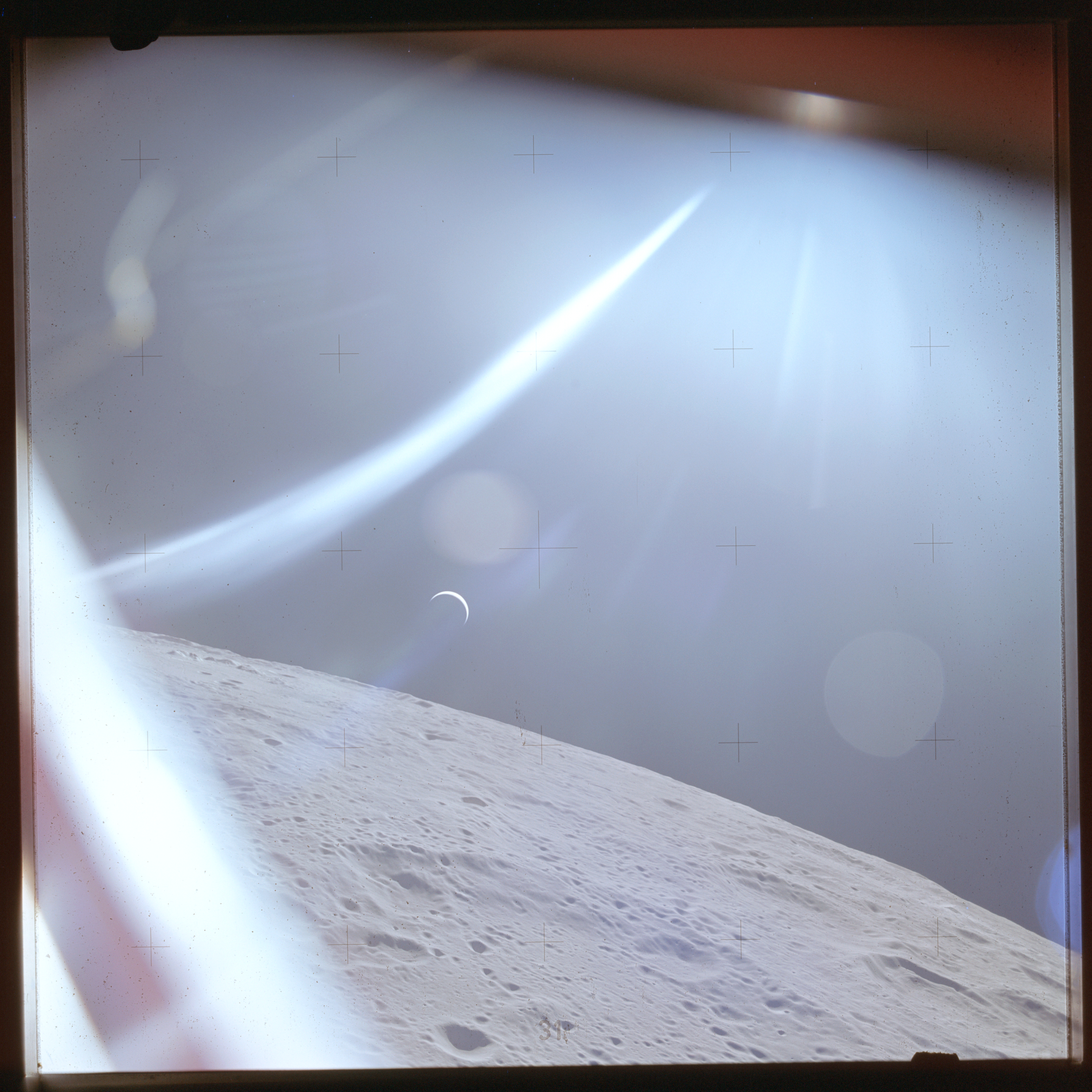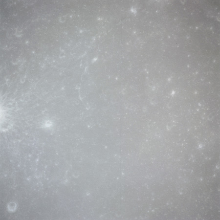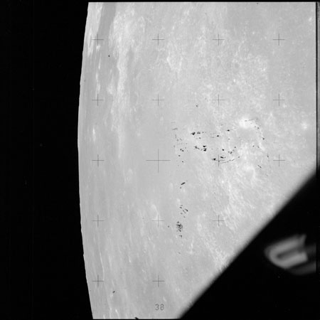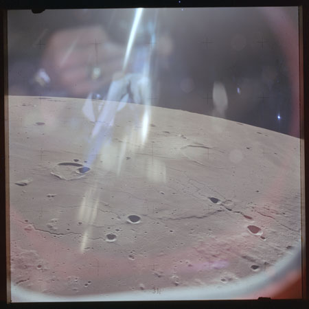The next image on magazine PP is an image framed in the window of the main hatch that was used in the astonishing book, 'Full Moon' by Michael Light, who has kindly donated this version to the Journal, this being number 28 in his collection. Light has processed his version heavily to increase its contrast, remove the Réseau plate dirt and remove the reflections of the cabin lights in the window.
