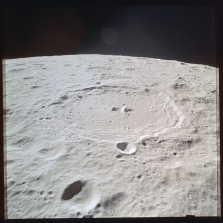 AS15-88-11997 to 11999 are further images of Earthrise which are somewhat afflicted by sunlight scattering in the window and lens. In the latter, Curie's western rim is in the foreground, the Schorr/Gibbs-A pair are at the extreme right and Gibbs lies beyond.