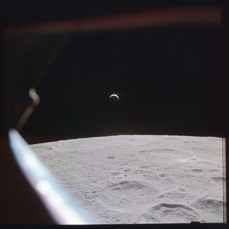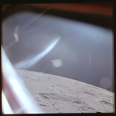 Just as the Moon appears nearly full from Earth, so the home planet reciprocates by displaying a striking crescent to the crew.