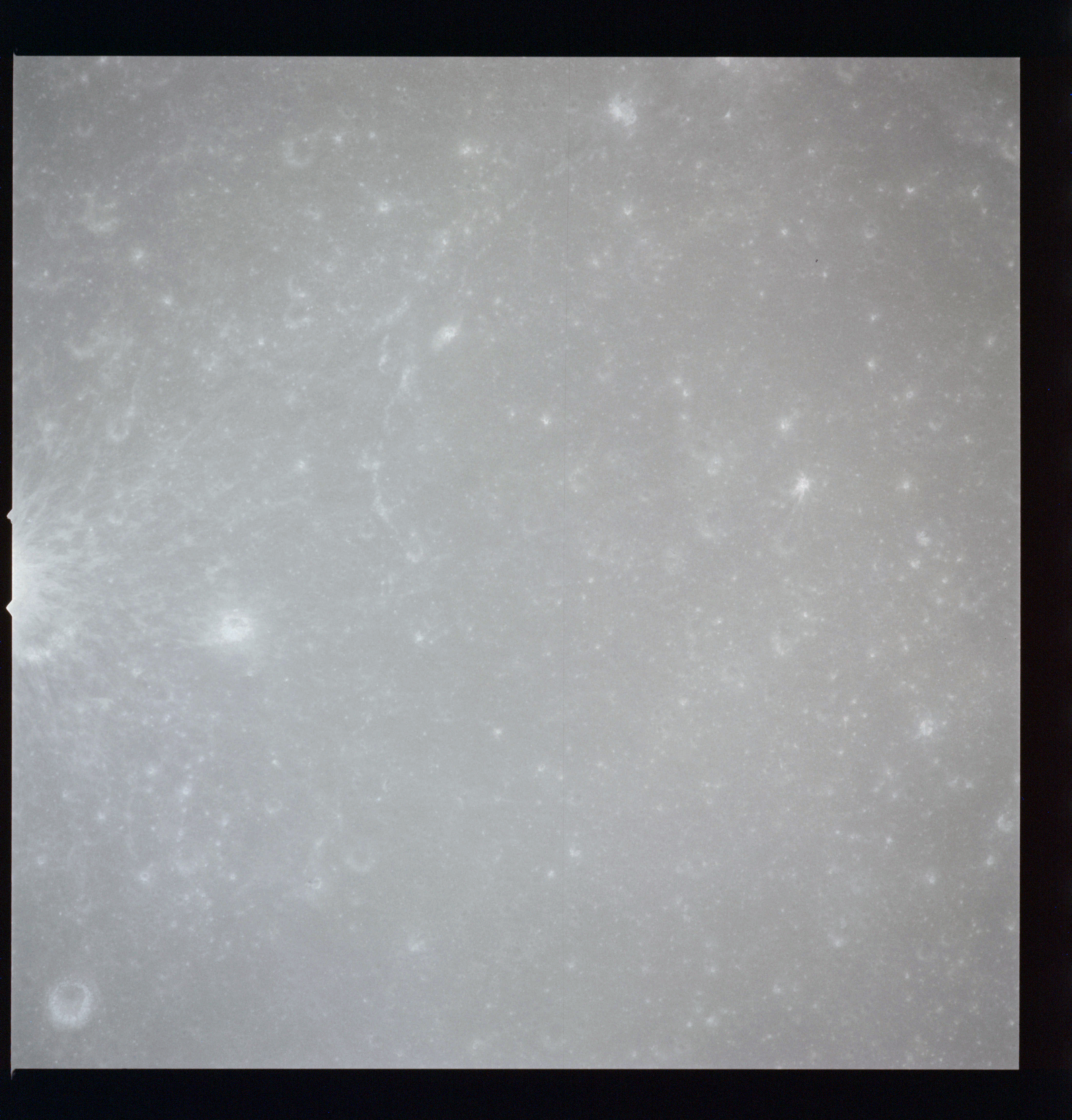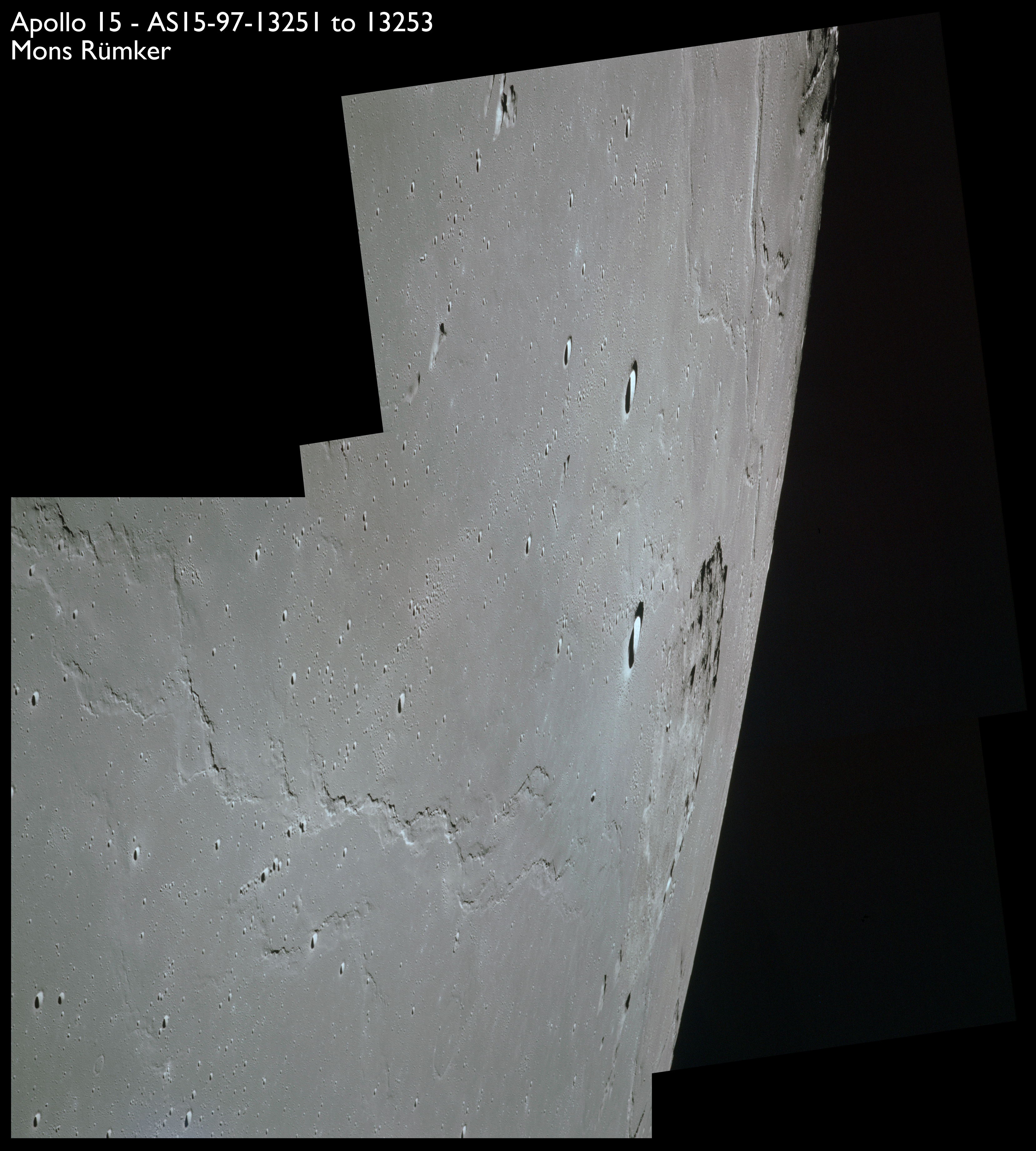 The photography now looks northwest across Oceanus Procellarum. Of much interest to lunar geologists before Apollo were the "special features", odd landforms that were outside the ordinary when looking at the Moon. Only later would the collective mind of science realise that much of the important story of the Moon can be deduced by looking at the big picture - the maria, basins and terra - and the impacts that modelled them. Mons Rümker, seen among the next three frames, AS15-97-13251 to 13253, is an example of a special feature. It is a collection of low volcanic domes in the northern regions of Oceanus Procellarum named after a German astronomer Karl Ludwig Christian Rümker, 1788-1862.